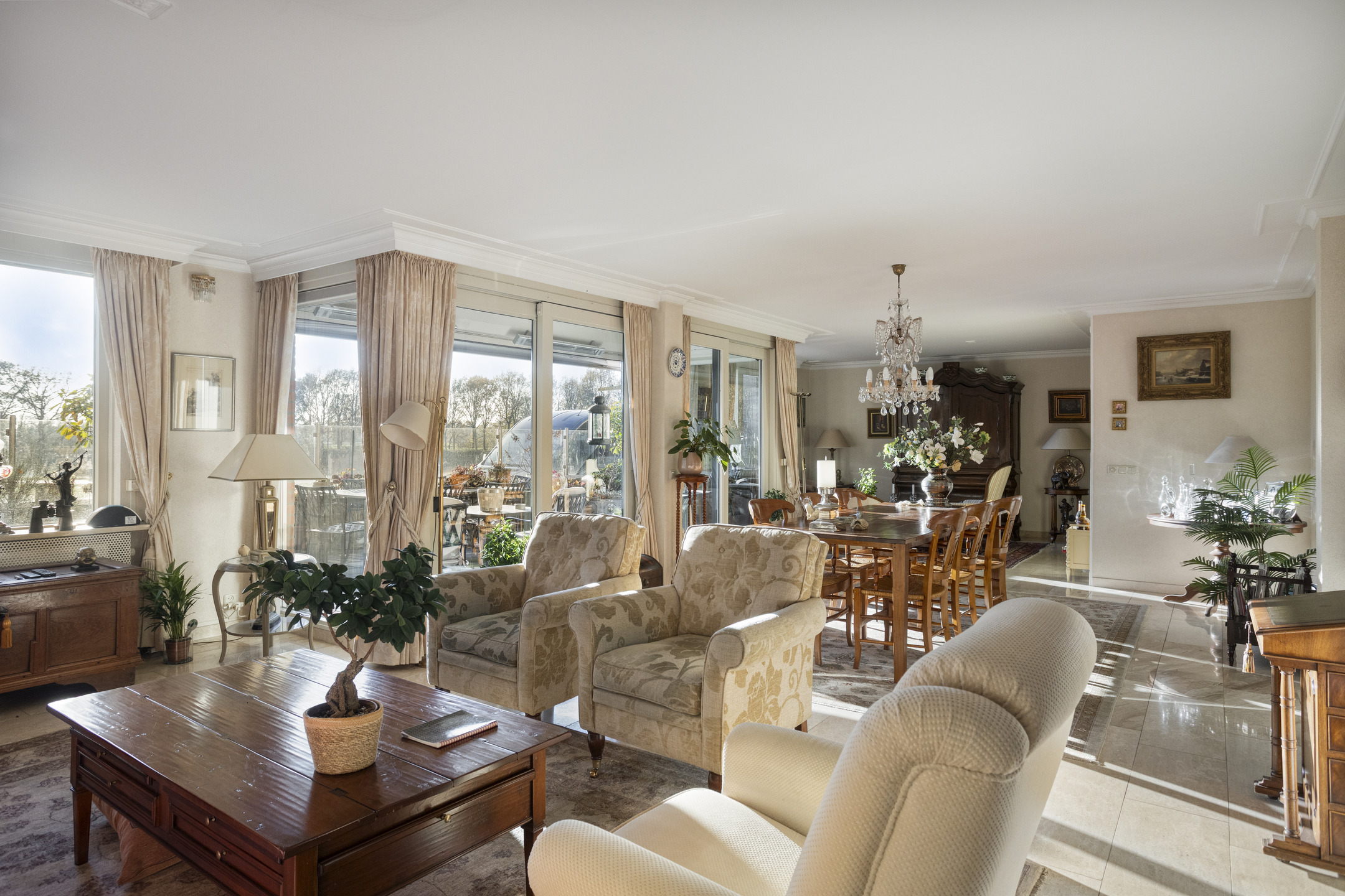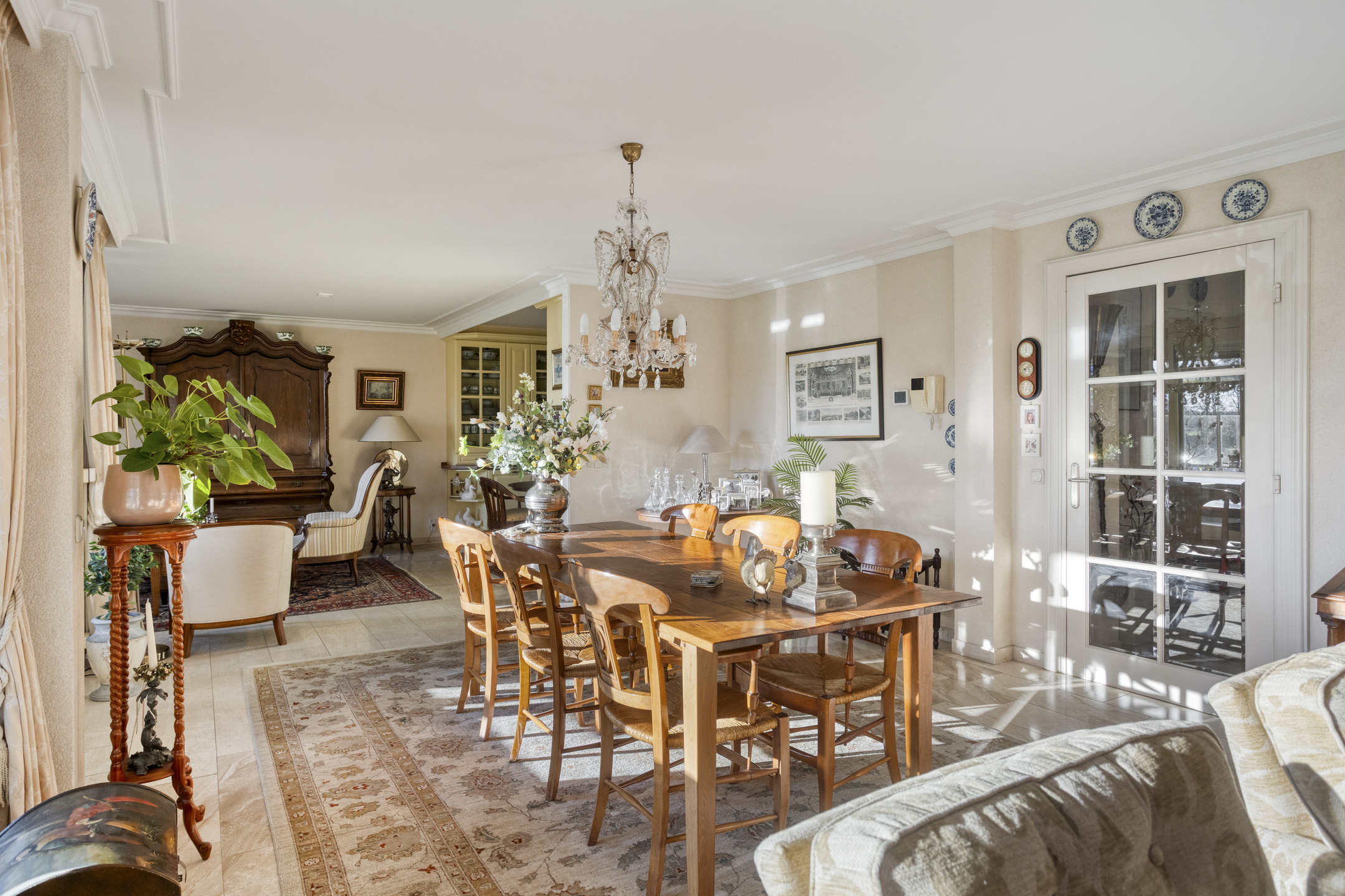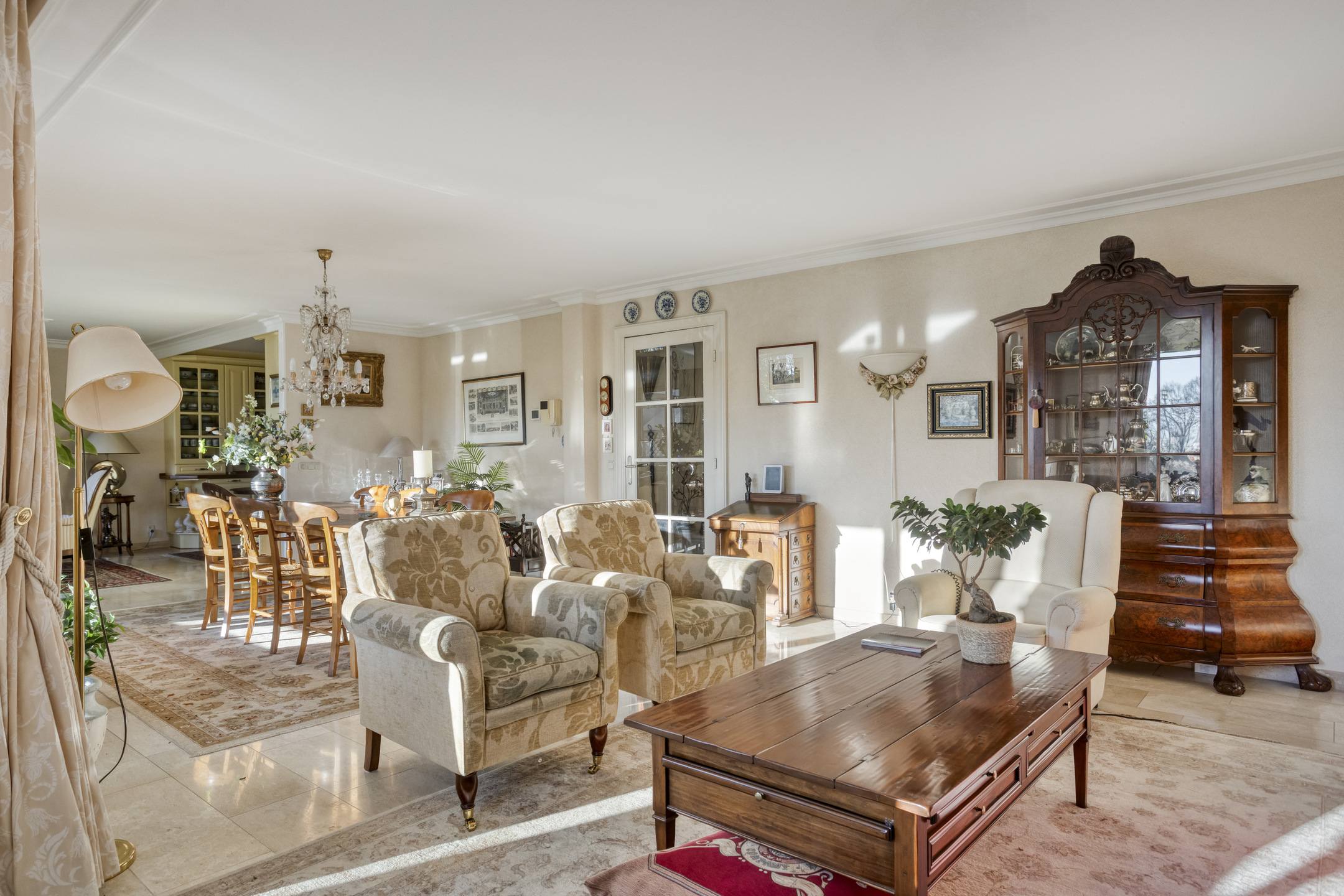 De woonkamer is maar liefst 12,30 meter breed en staat via twee brede schuifpuien in directe verbinding met het even brede terras. De fijne travertin tegelvloer en sierlijke plafondafwerking geven de ruimte een stijlvolle en rustige sfeer.
