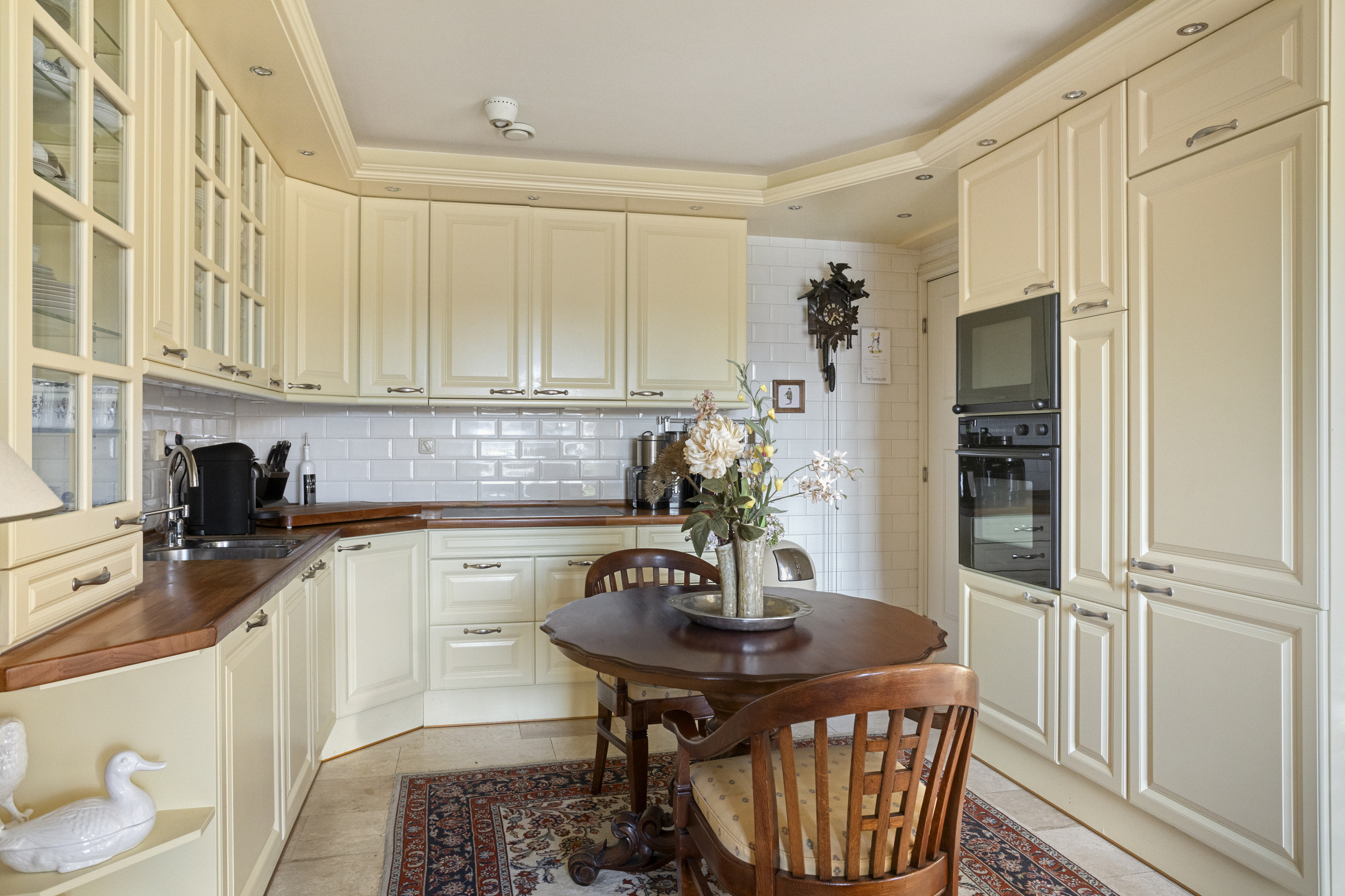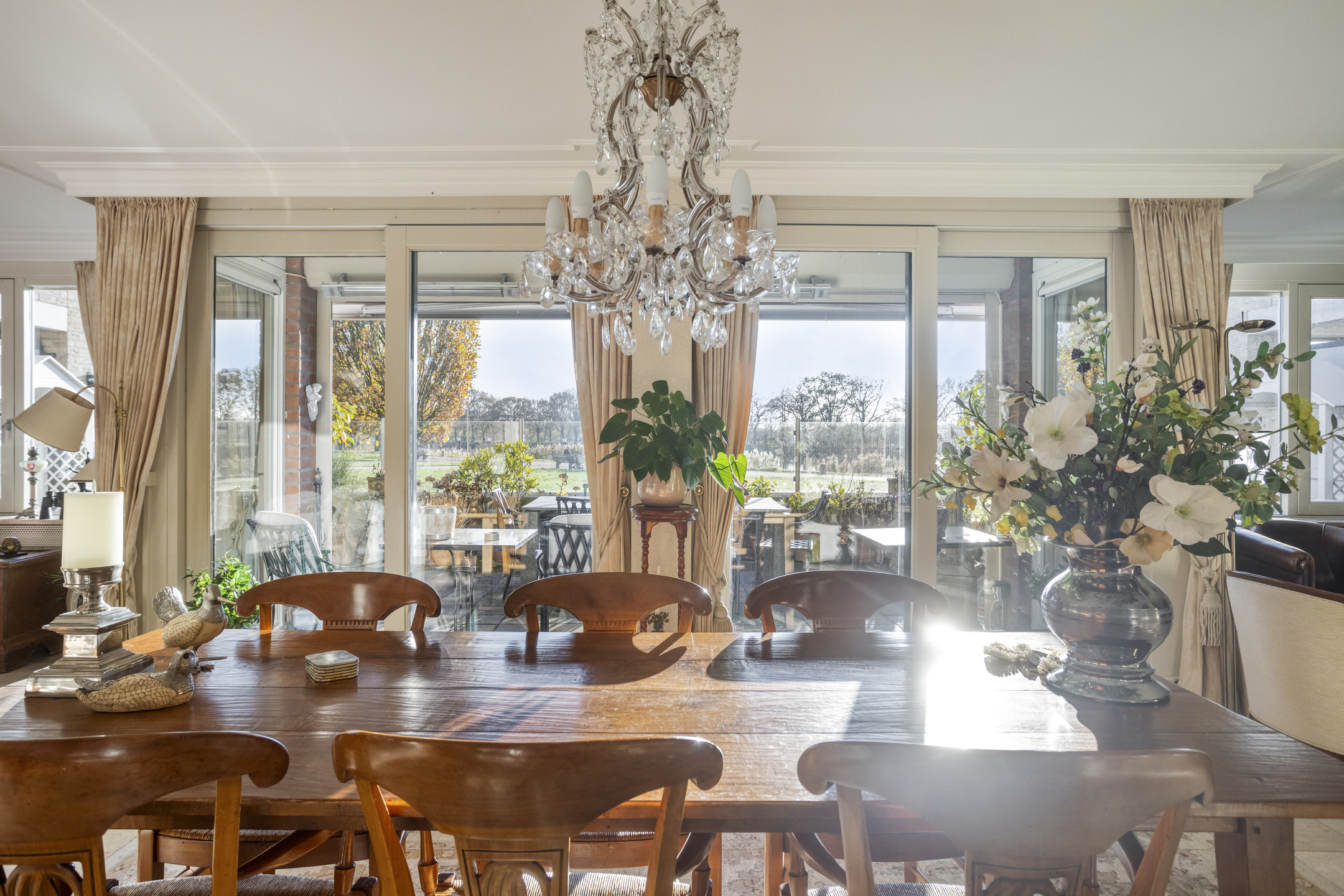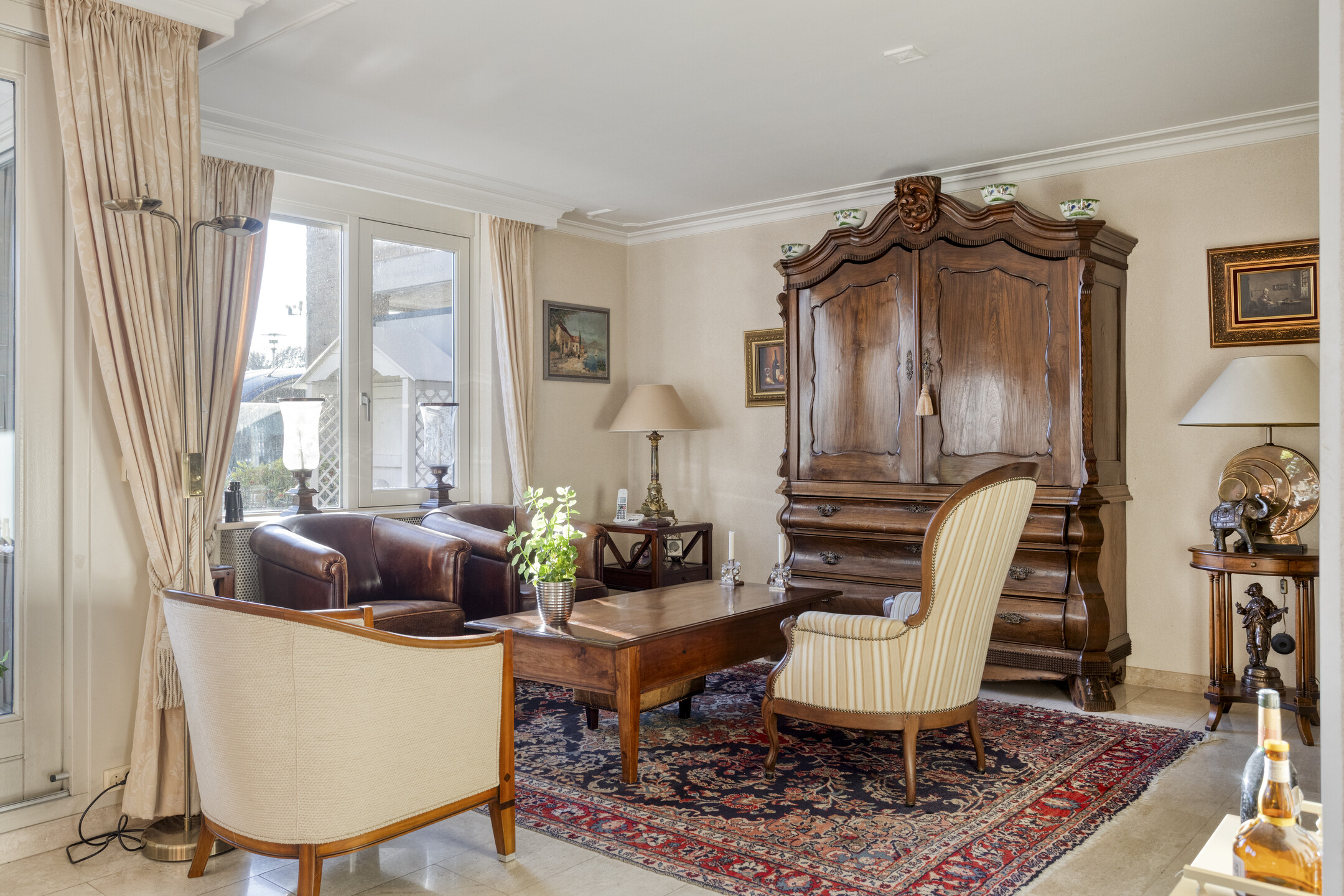 De woonkamer is maar liefst 12,30 meter breed en staat via twee brede schuifpuien in directe verbinding met het even brede terras. De fijne travertin tegelvloer en sierlijke plafondafwerking geven de ruimte een stijlvolle en rustige sfeer.