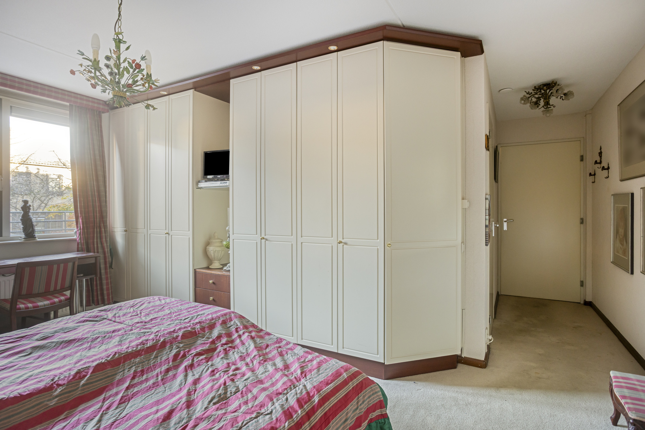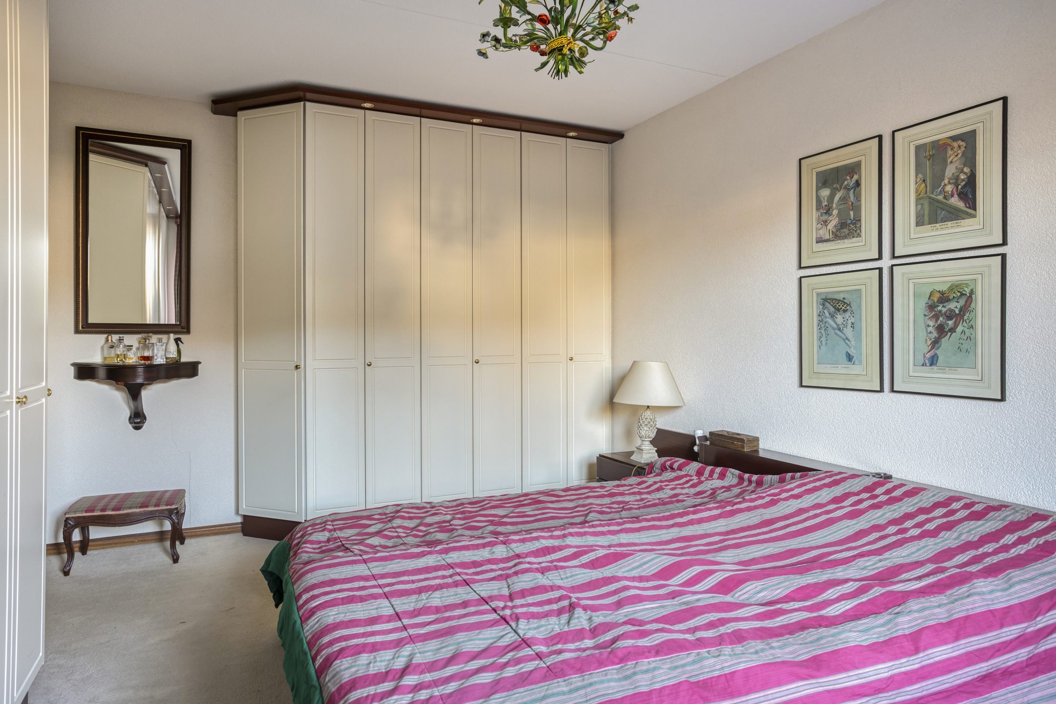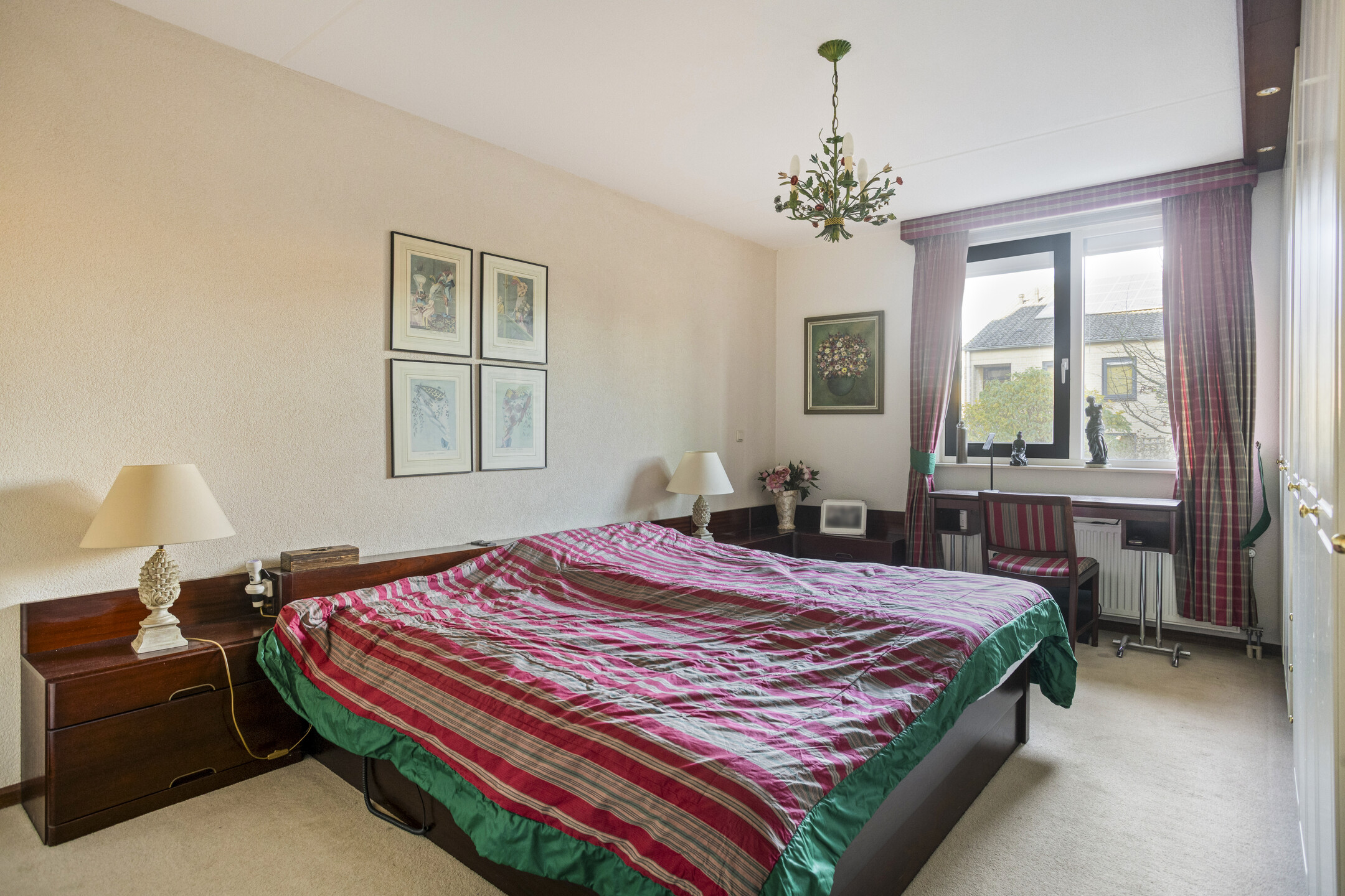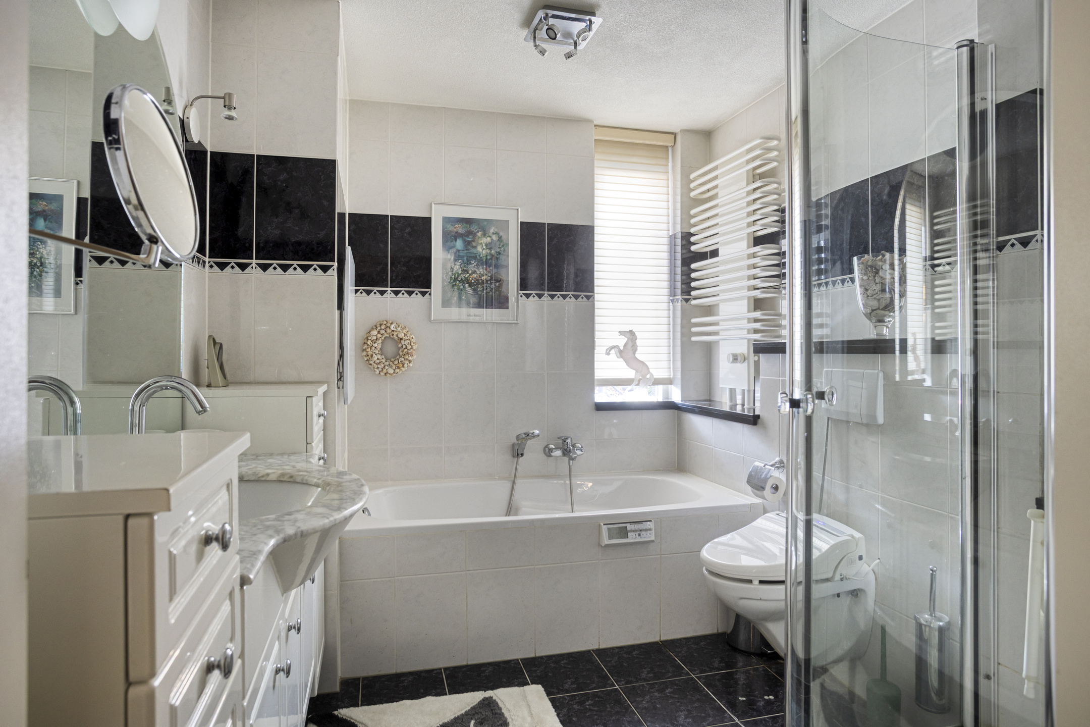 Aan de andere zijde bevindt zich de royale hoofdslaapkamer met vaste kast en rolluiken. Direct naast deze kamer ligt de luxe badkamer met ligbad, wastafel met meubel, halfronde douche en toilet.