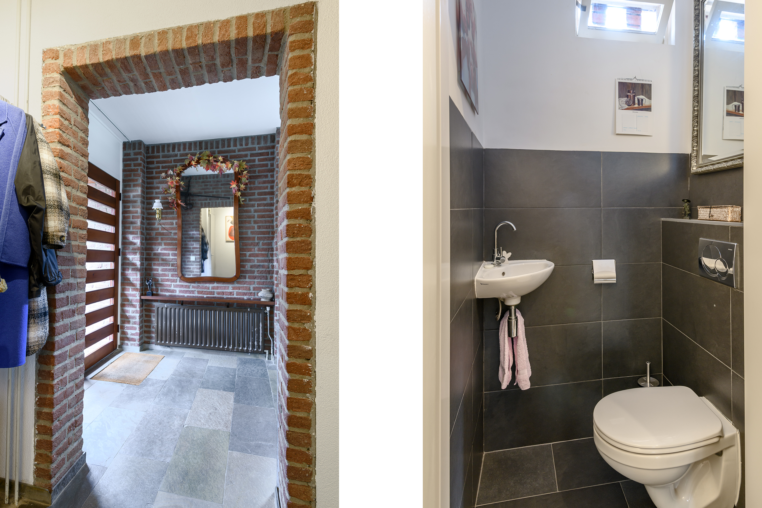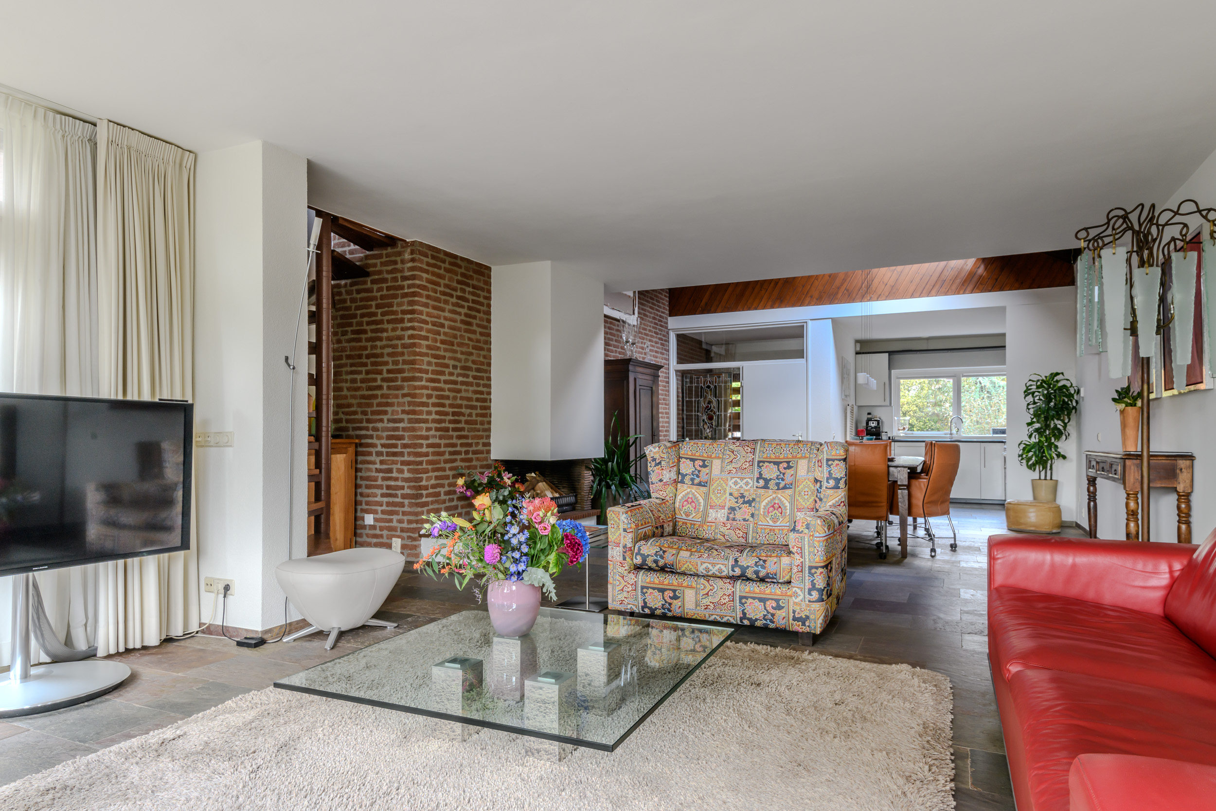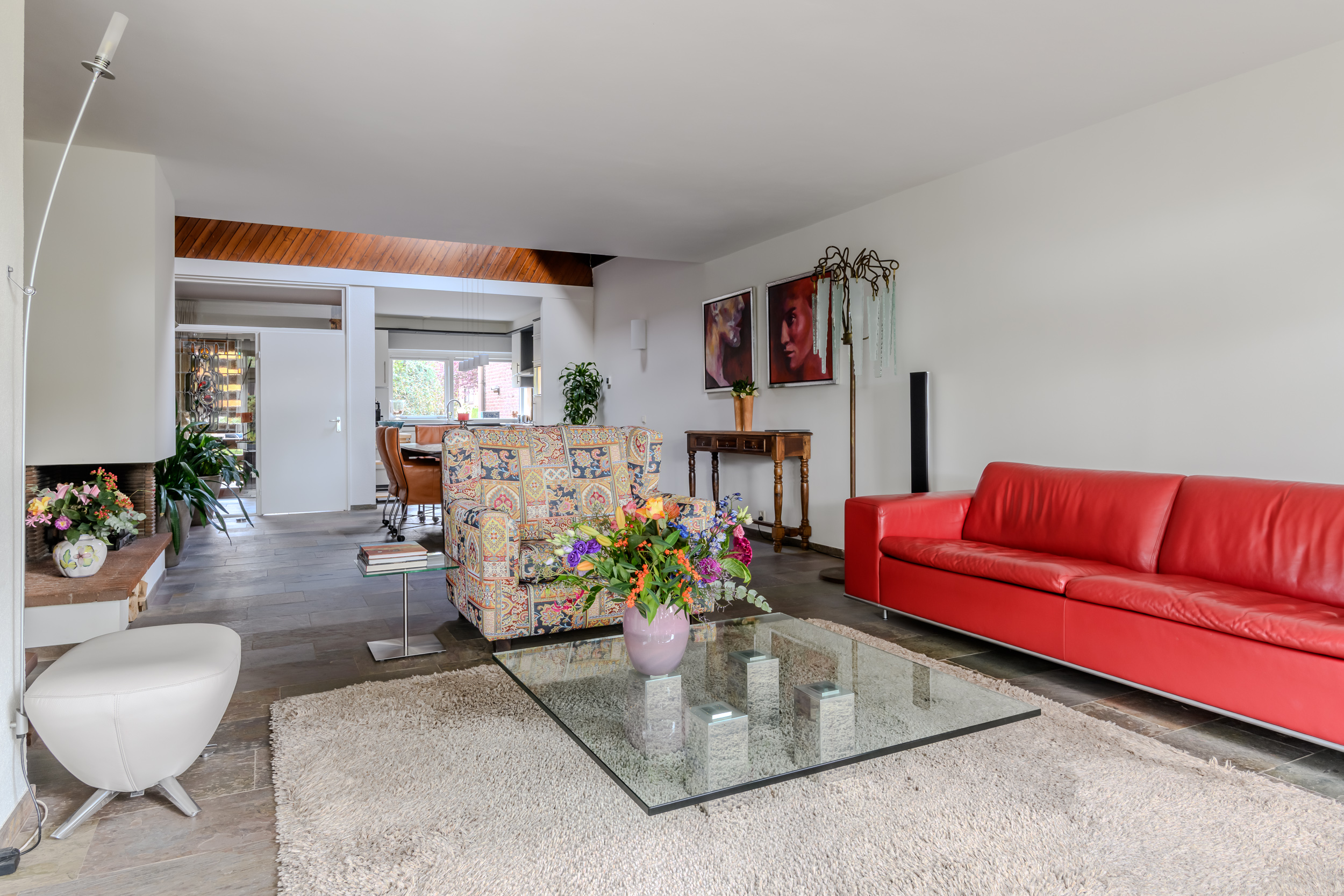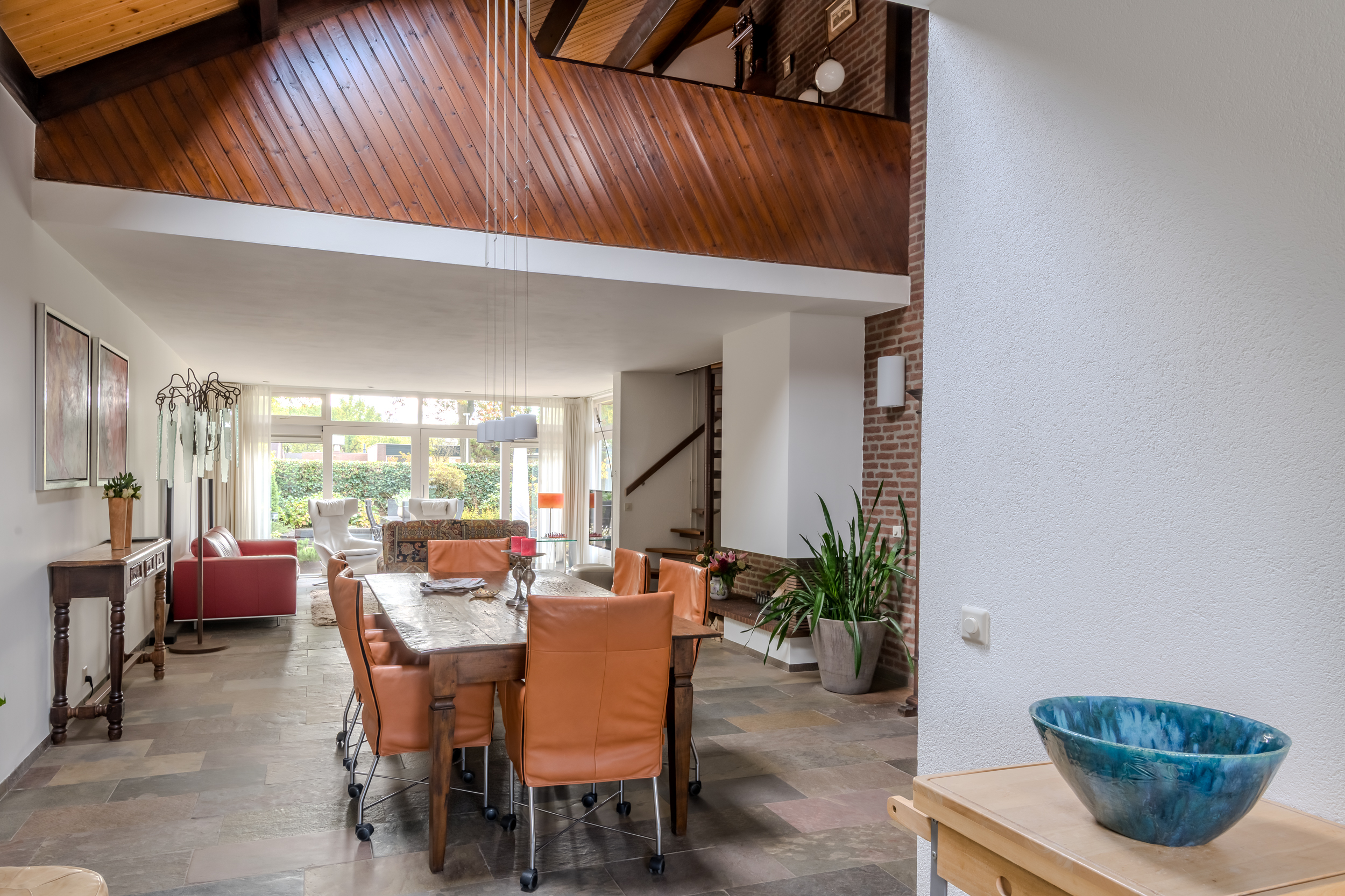 Ruime entree met glazen deur naar de living. De woonkamer is een echte blikvanger met zijn Indiase leistenen vloer met vloerverwarming, hoge plafonds, en een sfeervolle open haard. De ruime uitbouw zorgt voor veel licht. Door de twee schuifdeuren is er een naadloze overgang naar de zonnige, zuidgerichte tuin — een heerlijke plek met volop privacy en geen directe achterburen.