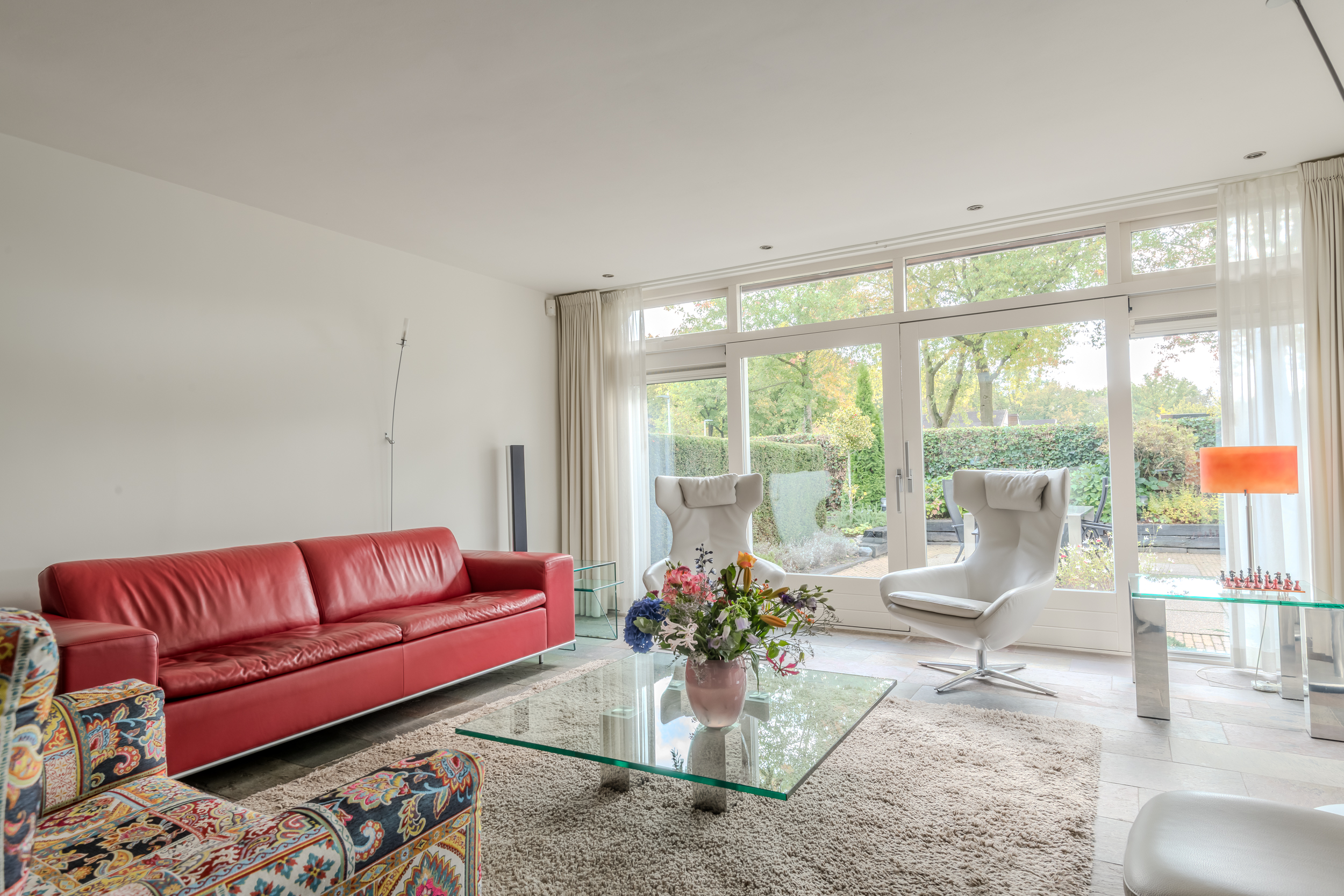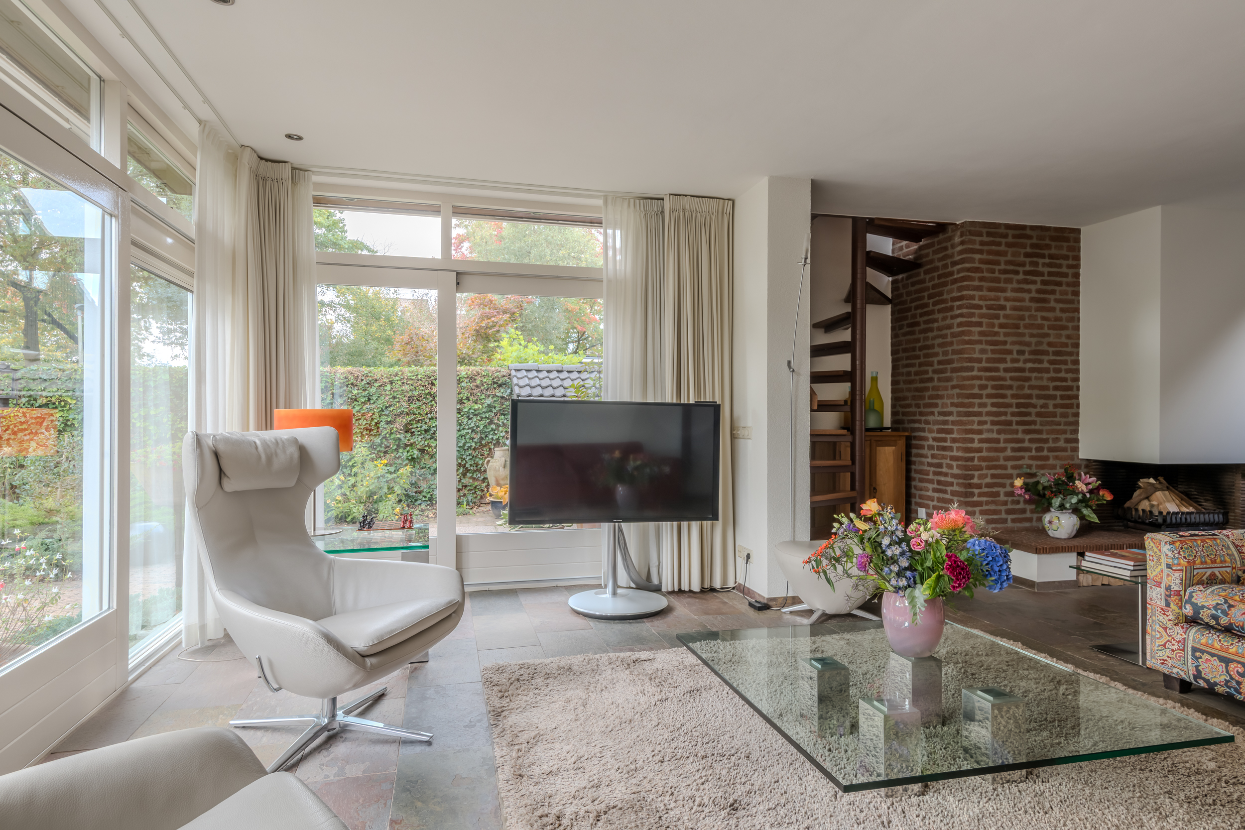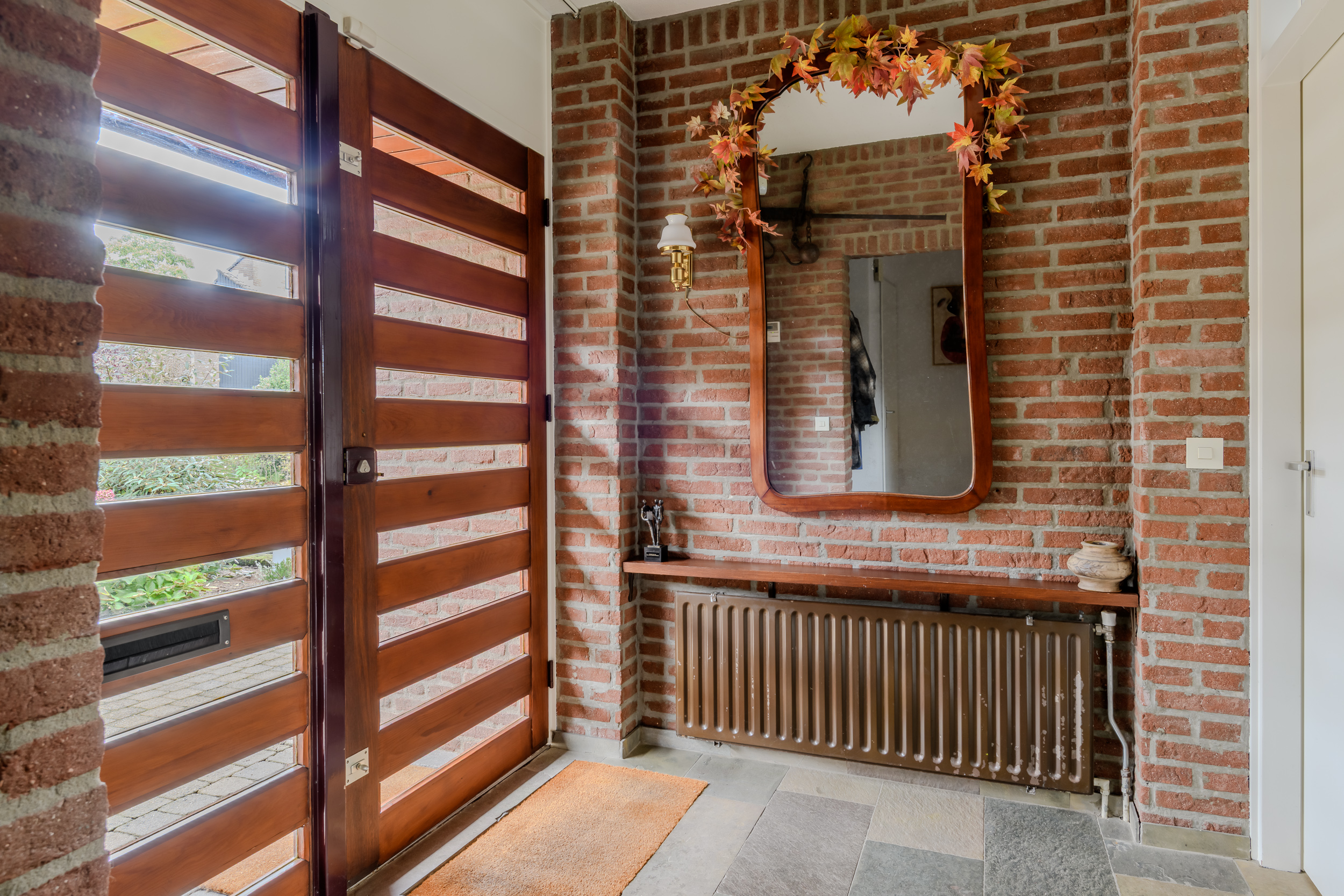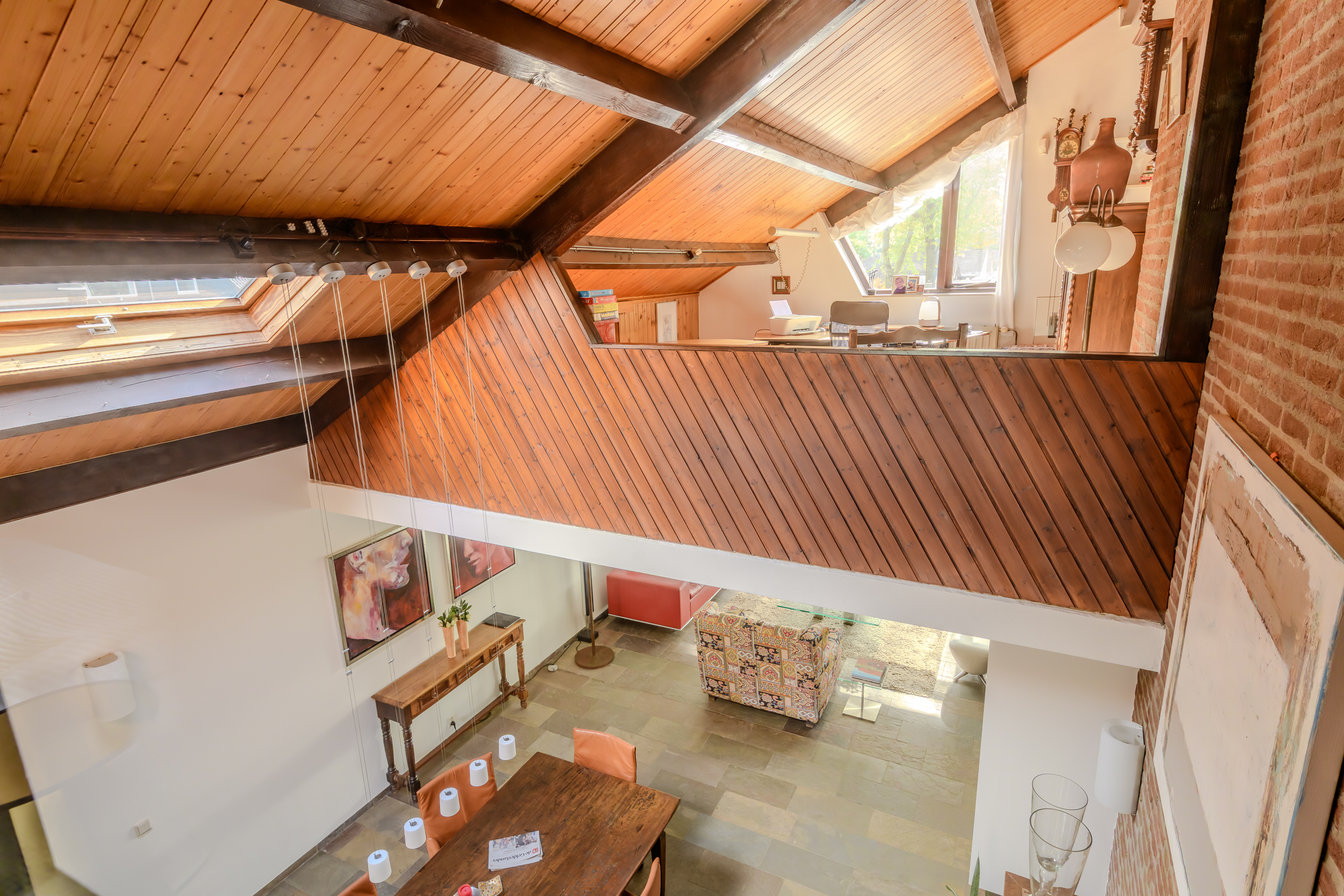 Ruime entree met glazen deur naar de living. De woonkamer is een echte blikvanger met zijn Indiase leistenen vloer met vloerverwarming, hoge plafonds, en een sfeervolle open haard. De ruime uitbouw zorgt voor veel licht. Door de twee schuifdeuren is er een naadloze overgang naar de zonnige, zuidgerichte tuin — een heerlijke plek met volop privacy en geen directe achterburen.