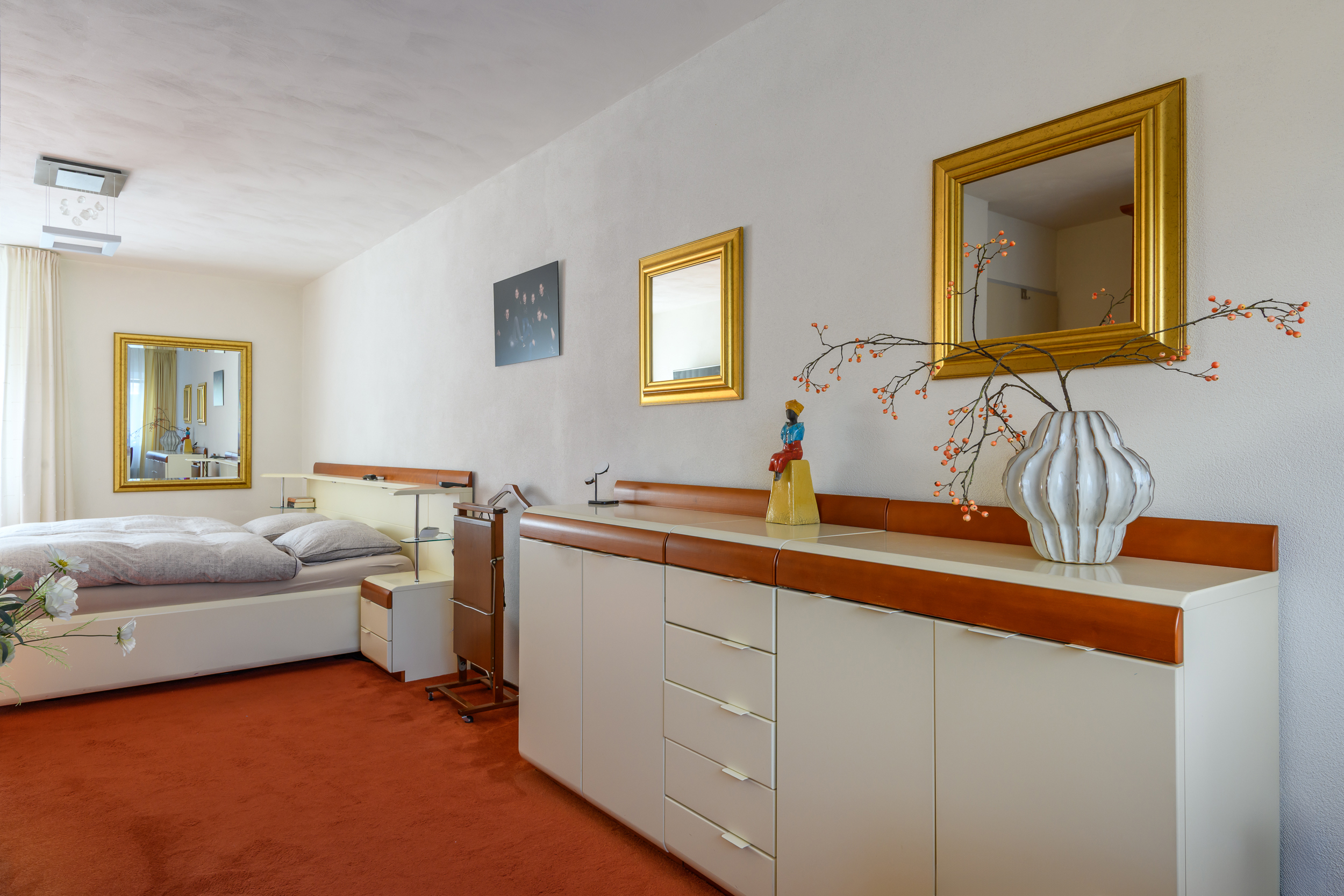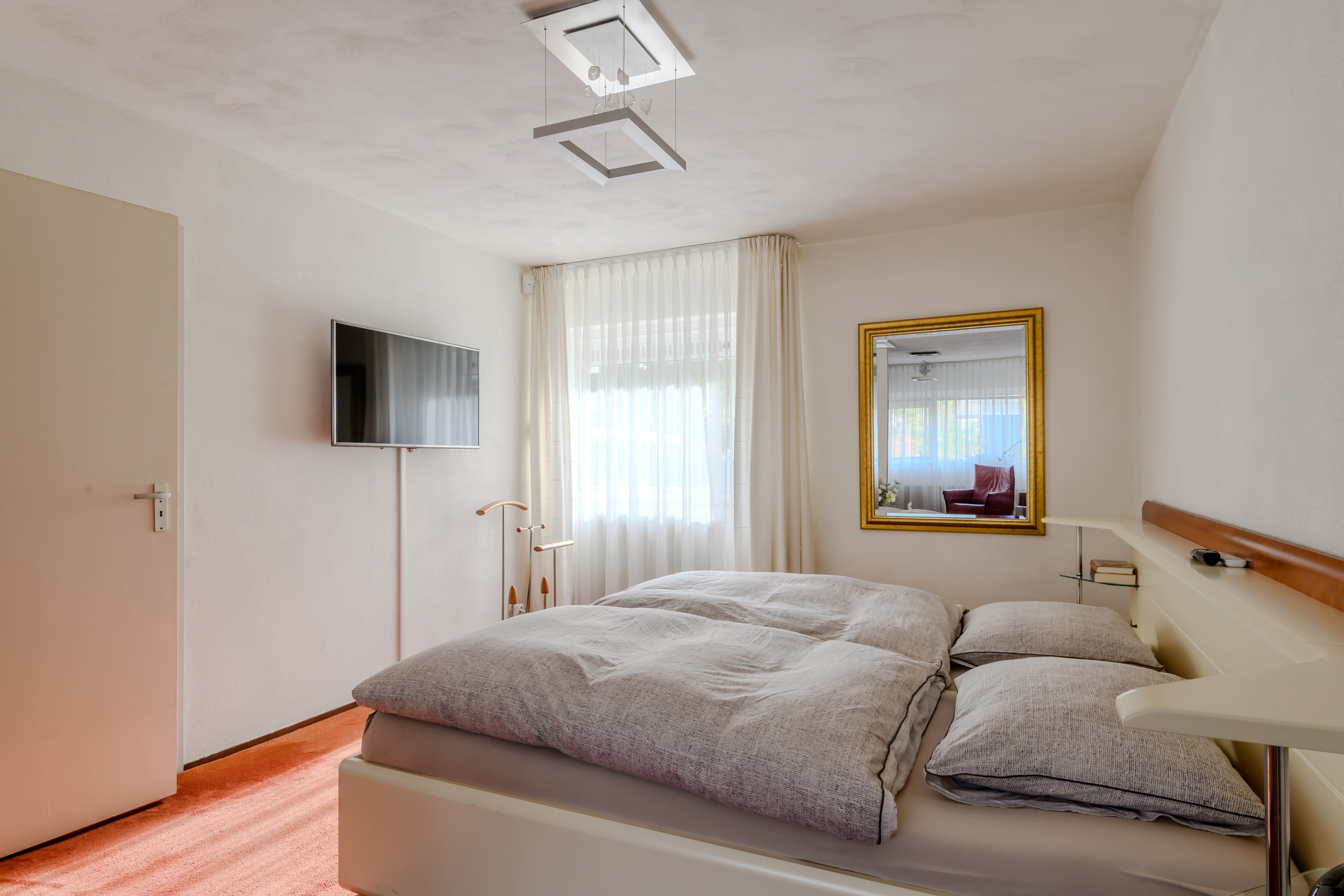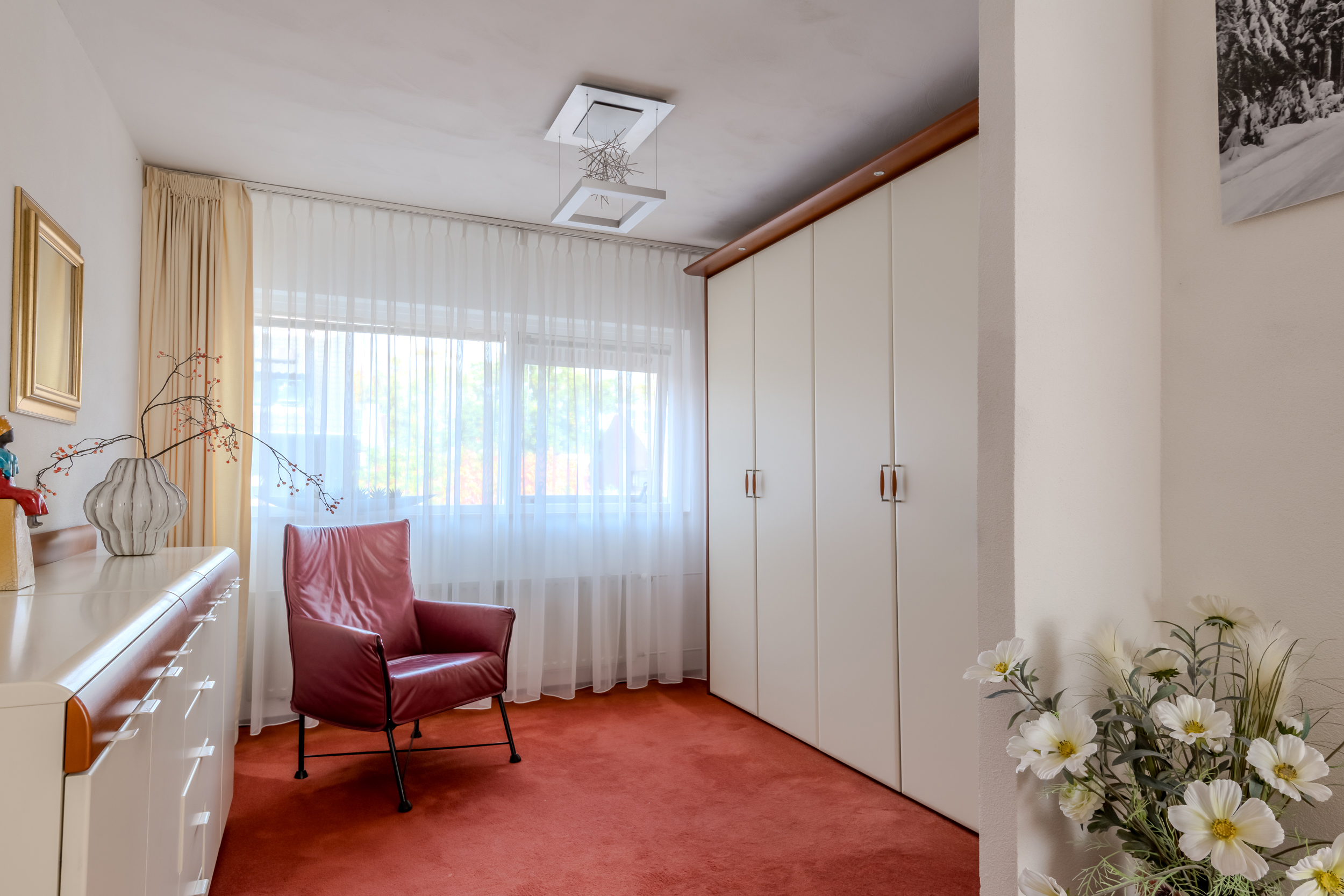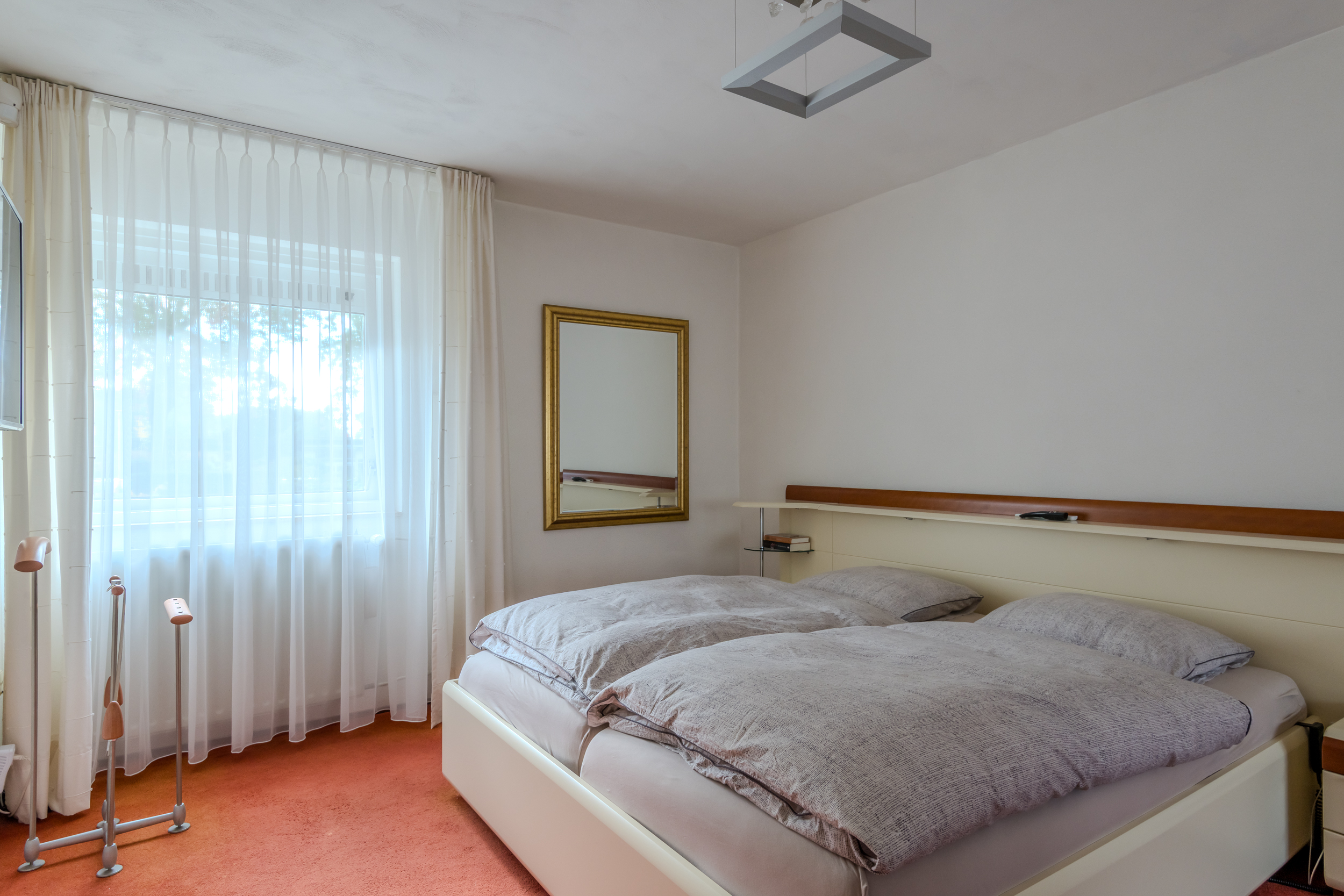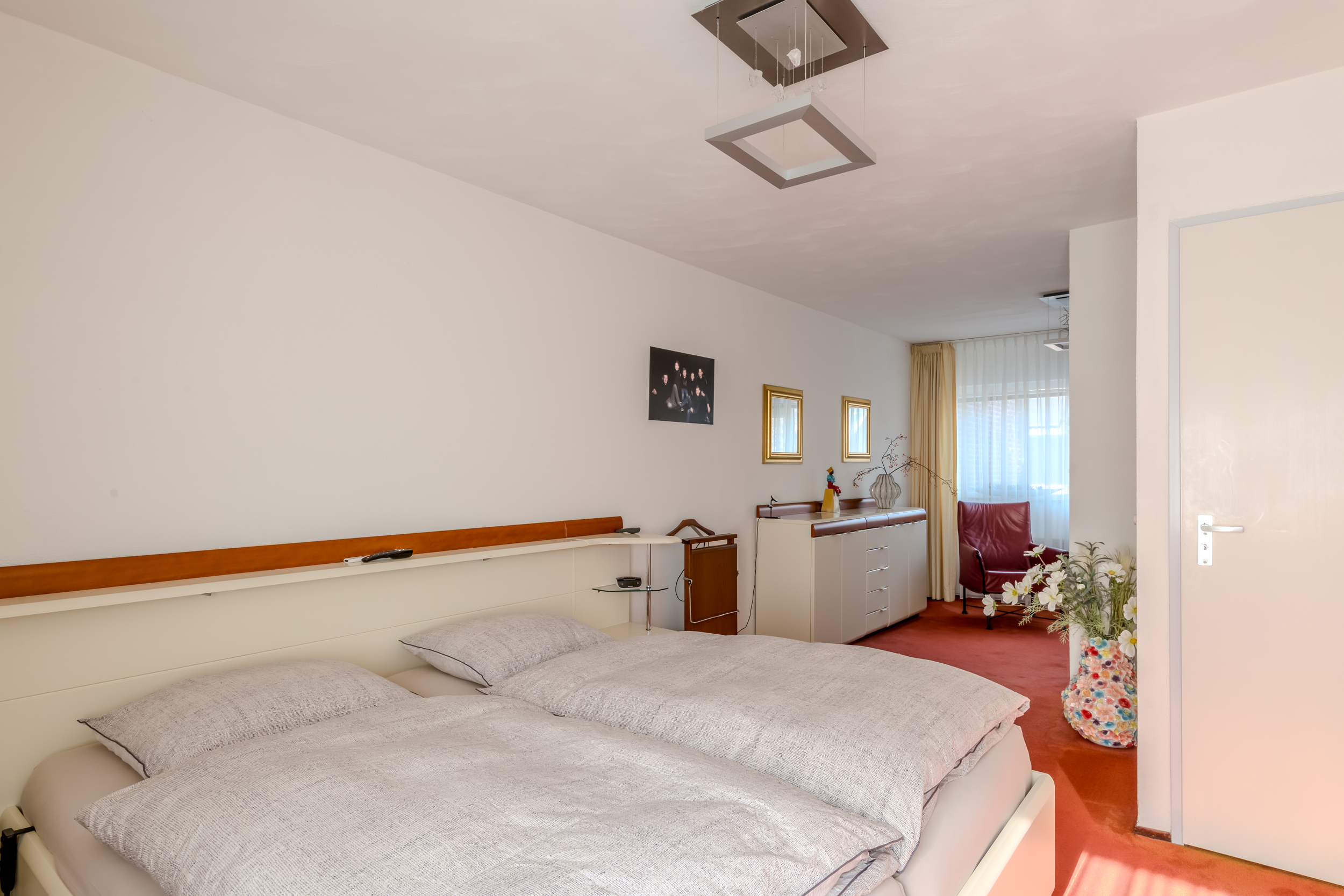 De ouderslaapkamer die bijzonder ruim is doordat hier twee kamers zijn samengevoegd. Aangrenzend is de mooie badkamer uit 2005 met halfronde douche, toilet en dubbele wastafels.