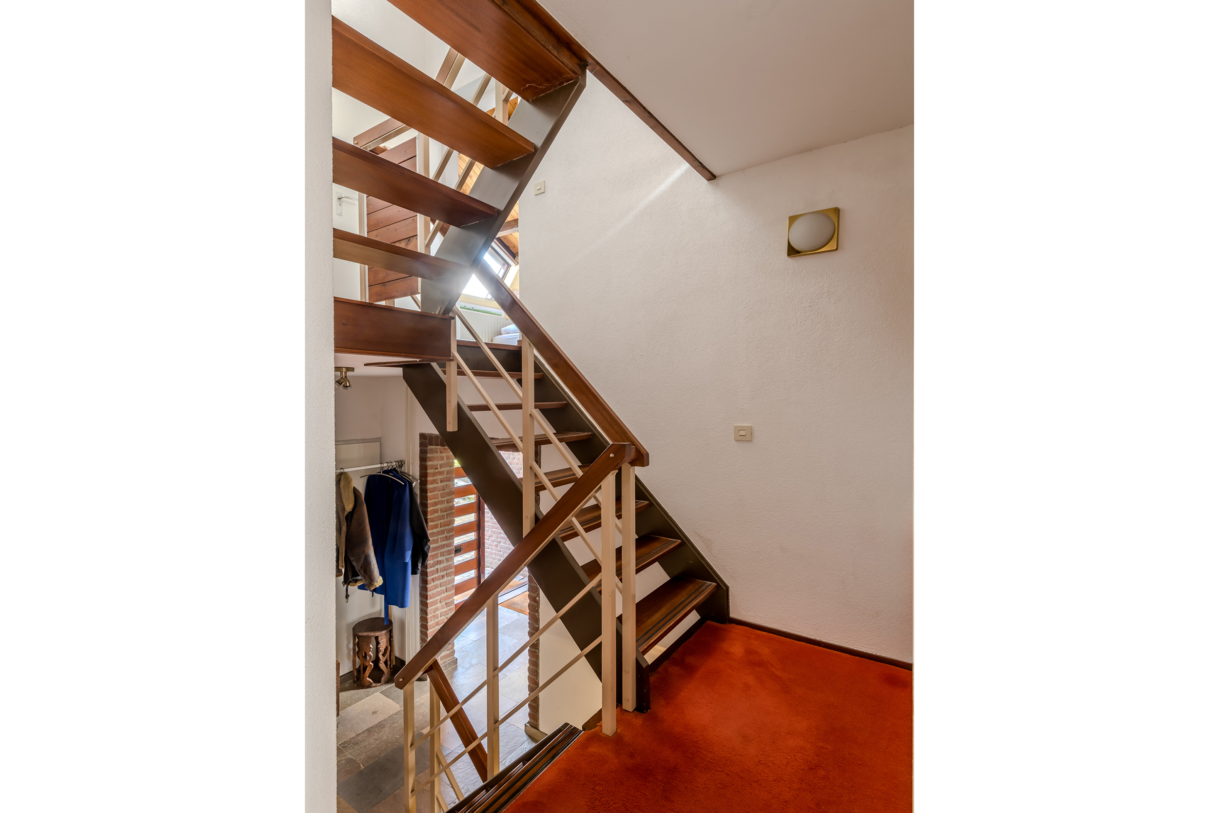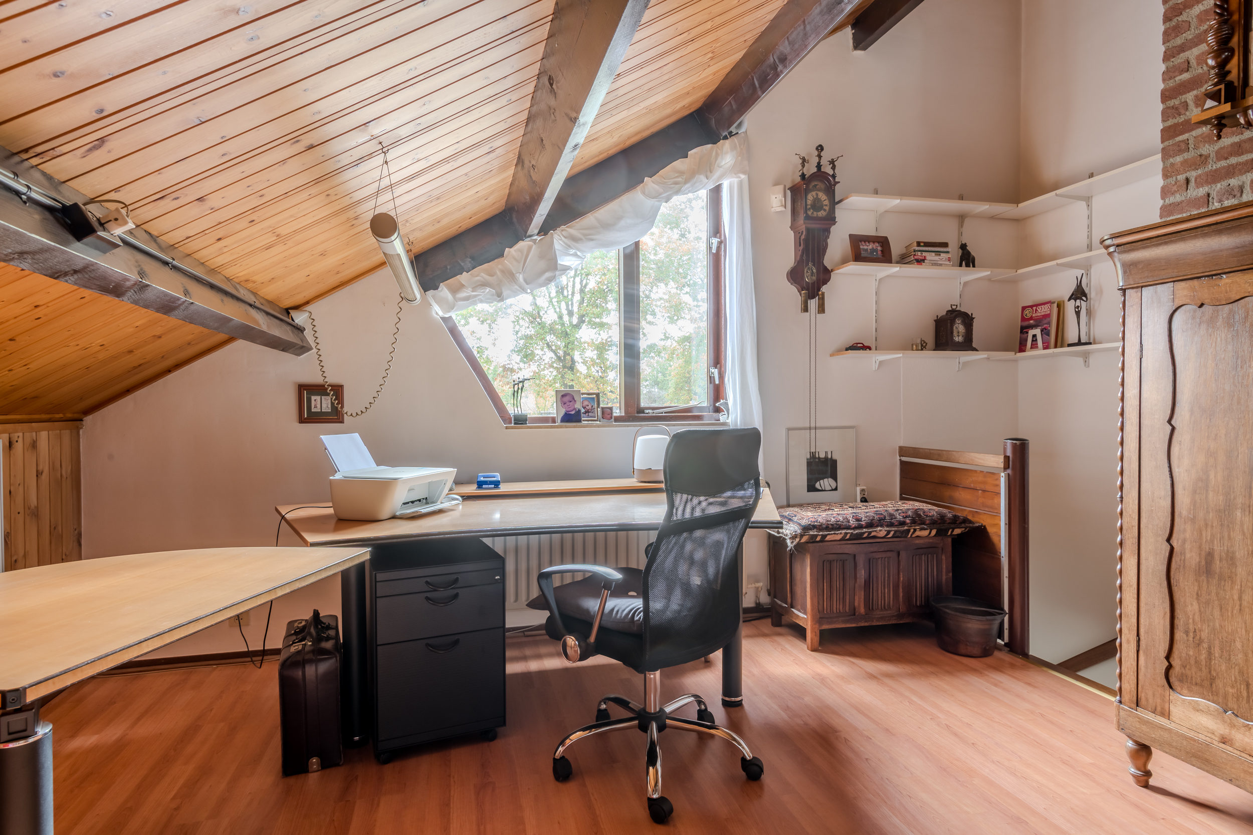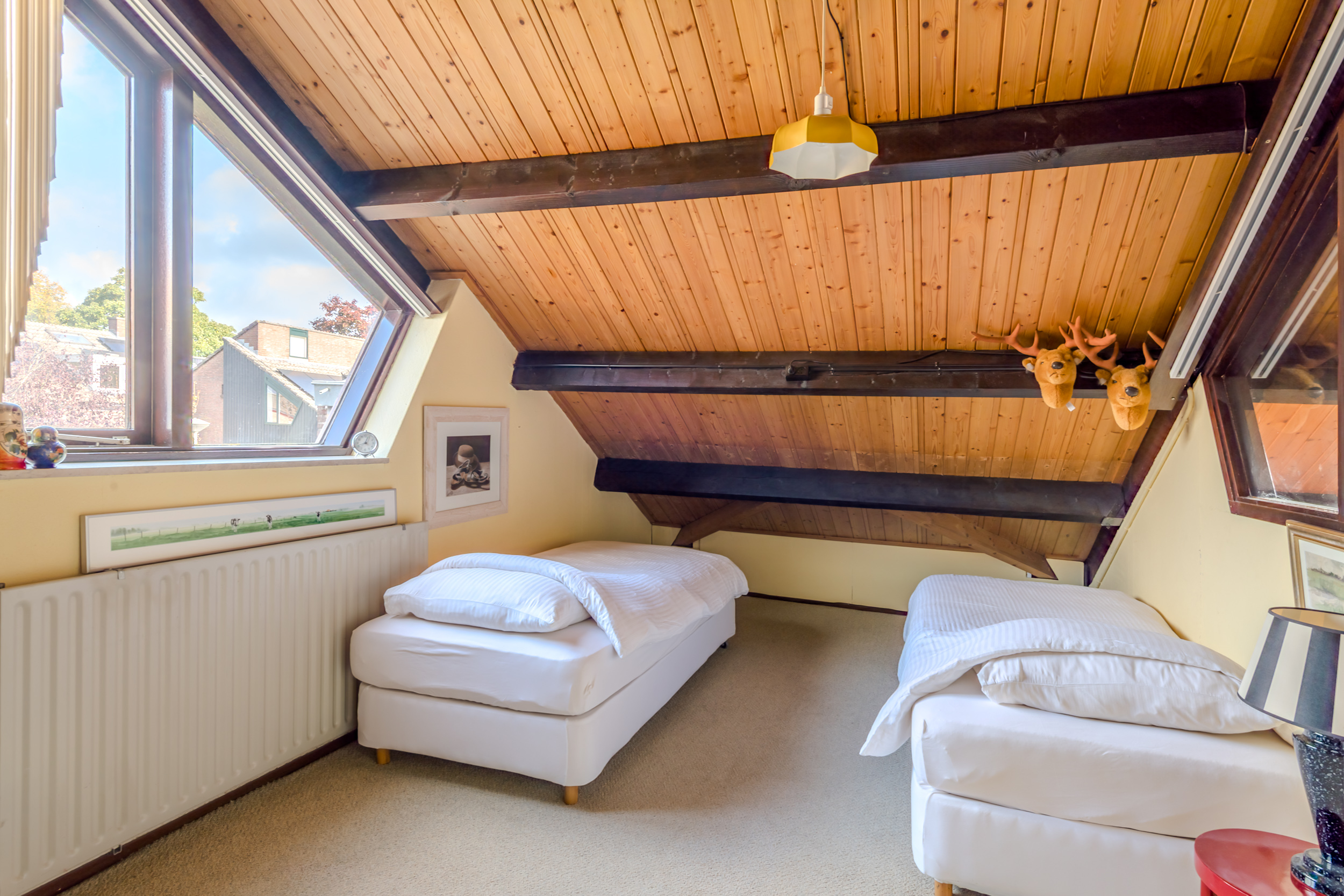 Nog een paar treden hoger is de derde (of vierde) slaapkamer met vaste kast die met een grote dakkapel veel lichtinval heeft: ideaal om, zoals nu, als atelier te gebruiken.