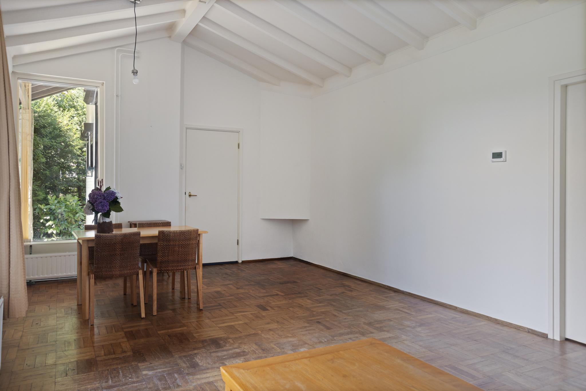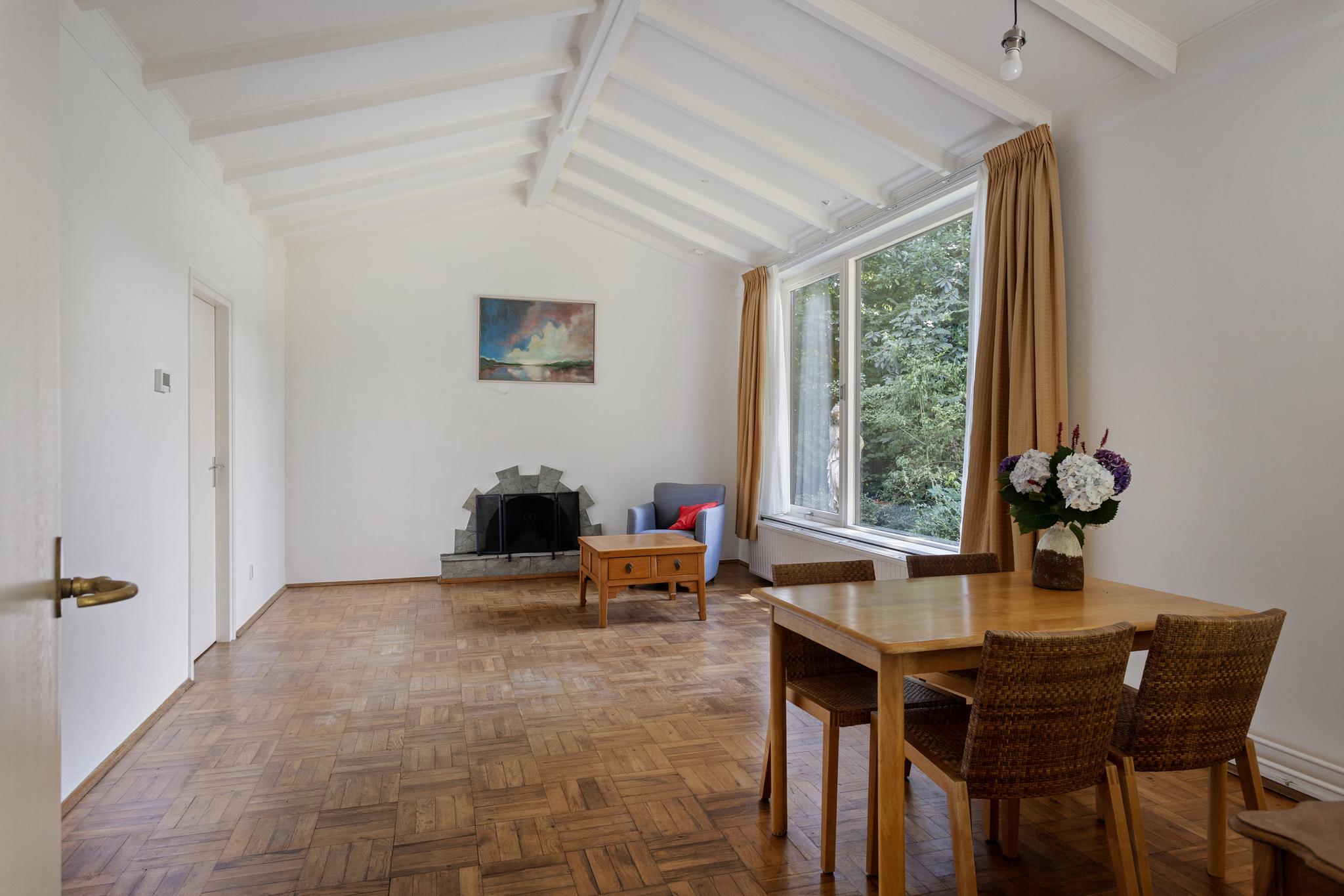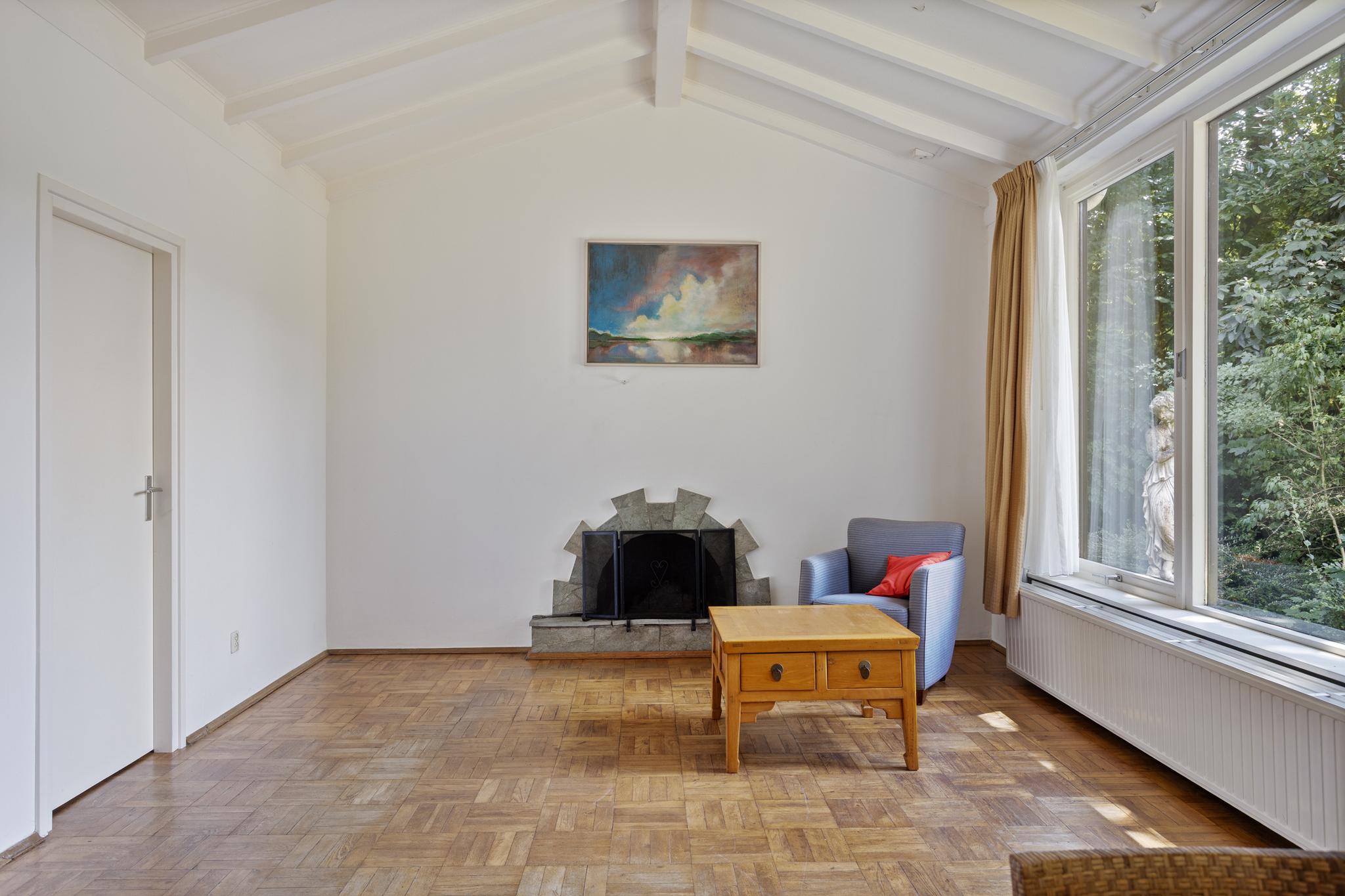 De ruime woonkamer, met mooie parketvloer, heeft veel lichtinval door het grote raam aan de voorzijde en het zijraam. Van de twee open haarden is thans nog één in werking.