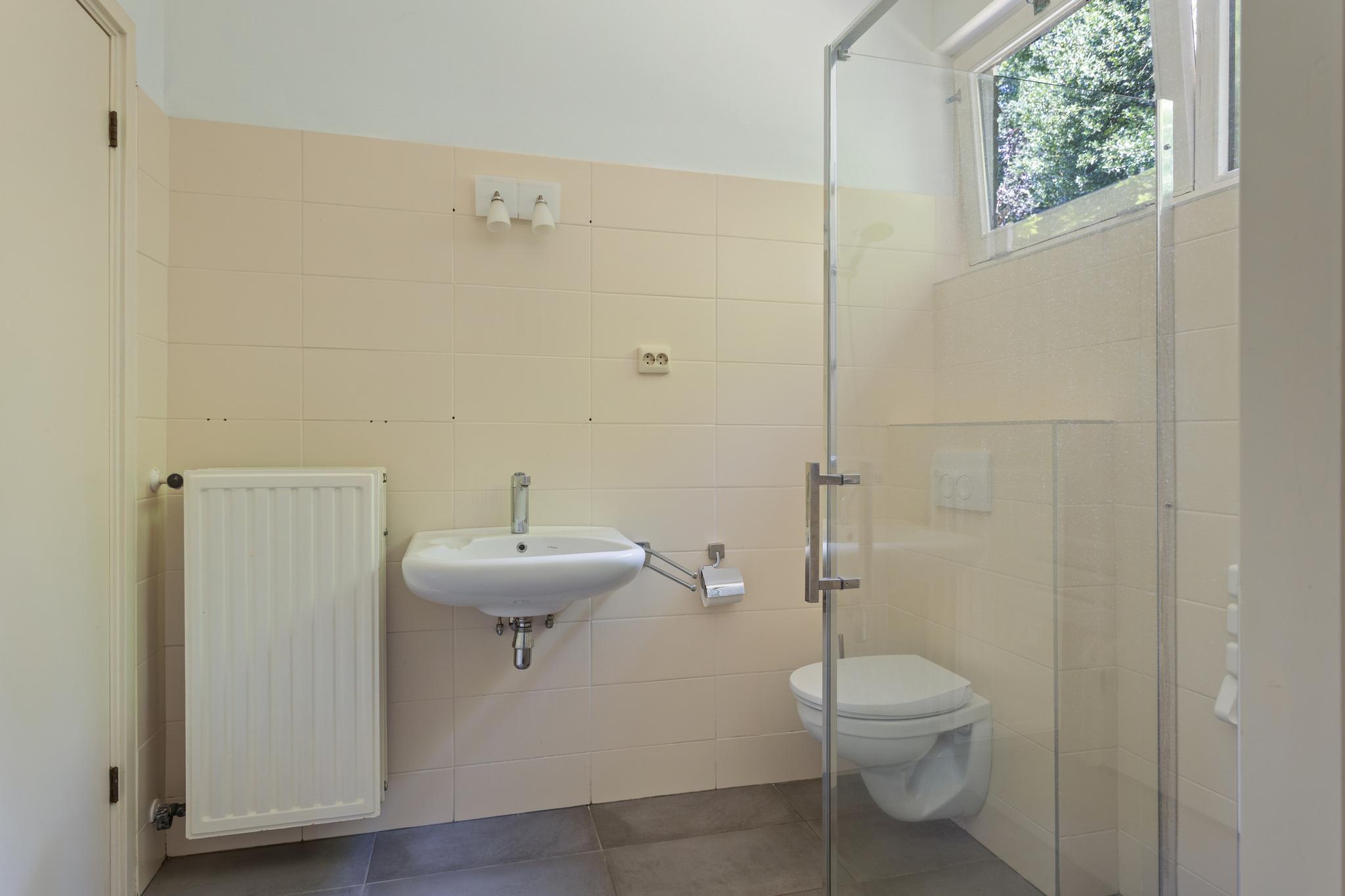 Aangrenzend aan de woonkamer is de grote slaapkamer met vaste kast die weer in verbinding staat met de in 2016 geplaatste badkamer met inloopdouche, vaste wastafel toilet en bergkast. Via de bergkast is de vliering te bereiken.