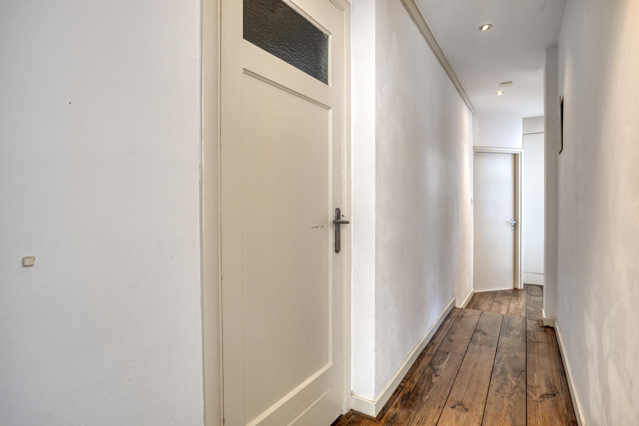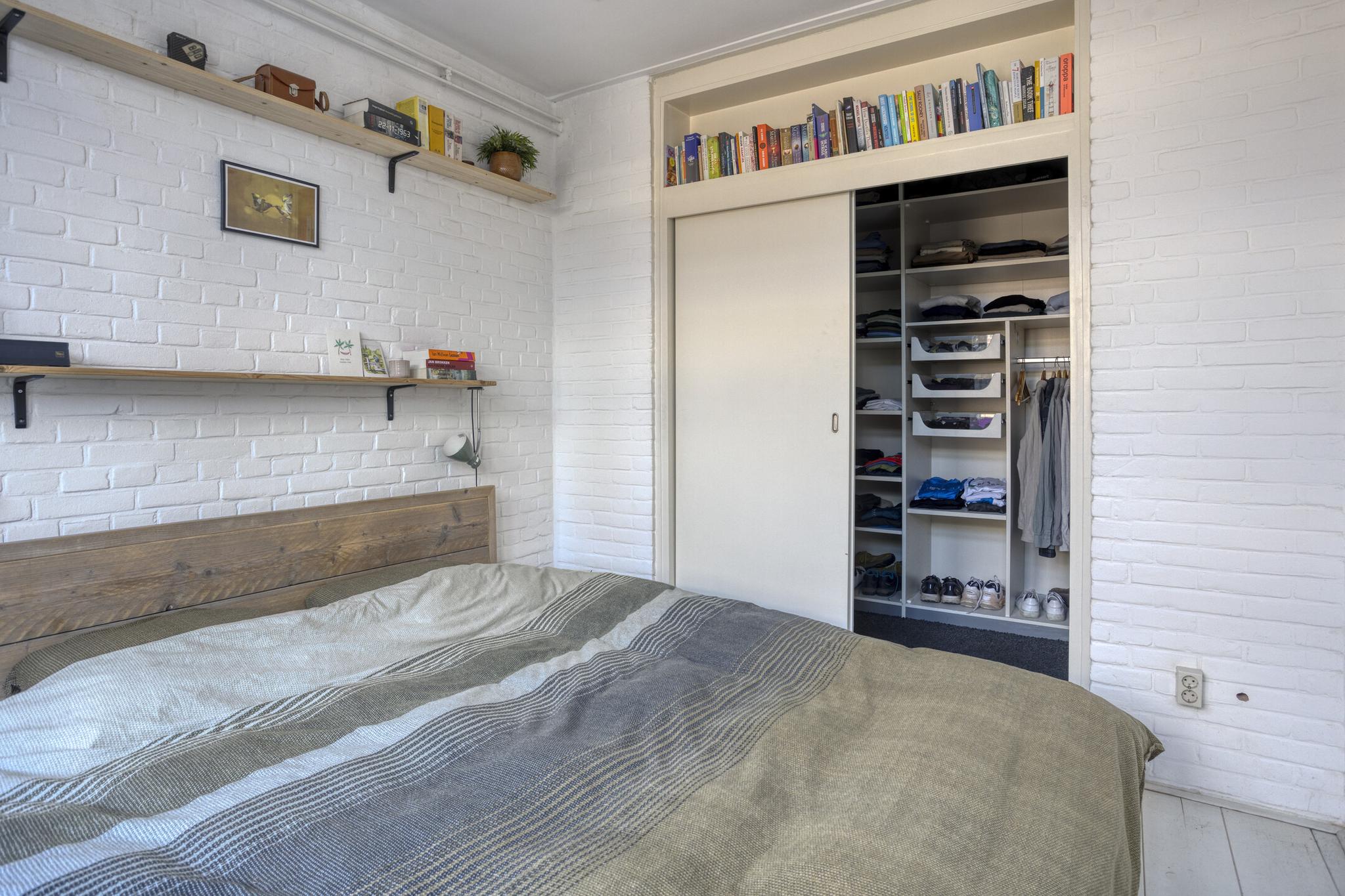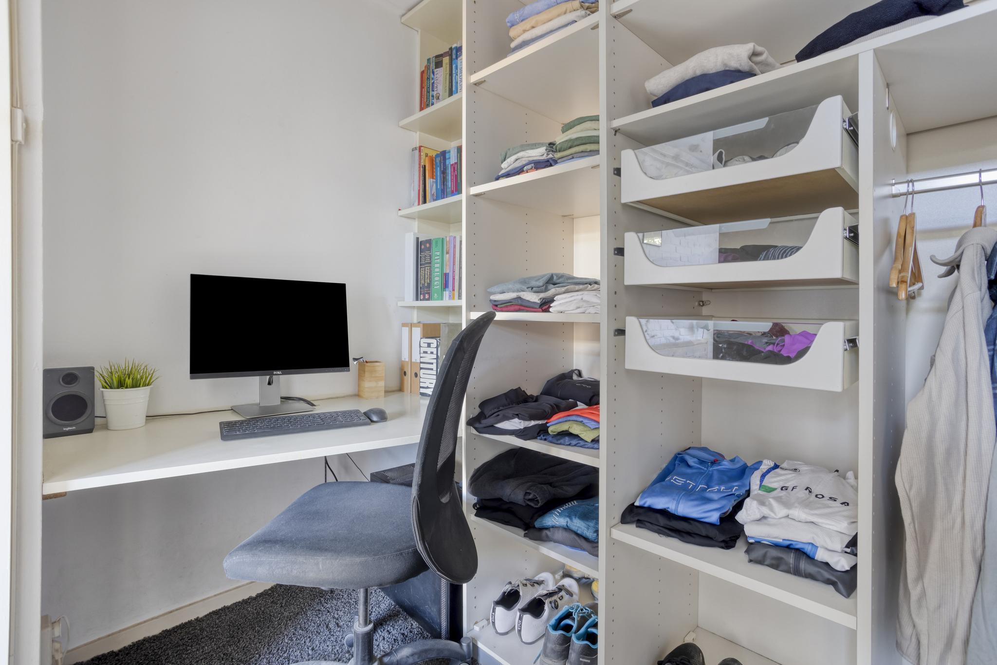 Bij binnenkomst valt meteen de mooie, strakke afwerking van het appartement op! Een mooie lange gang met houten vloer geeft toegang tot de ruime slaapkamer, met ensuite kledingkast/werkkamer.