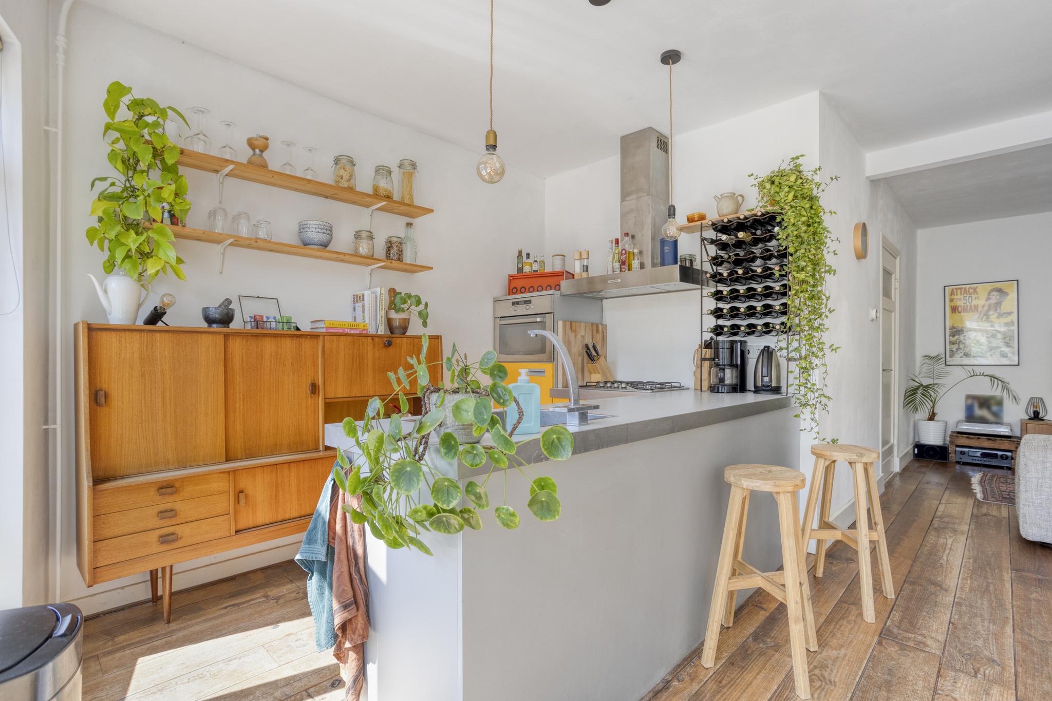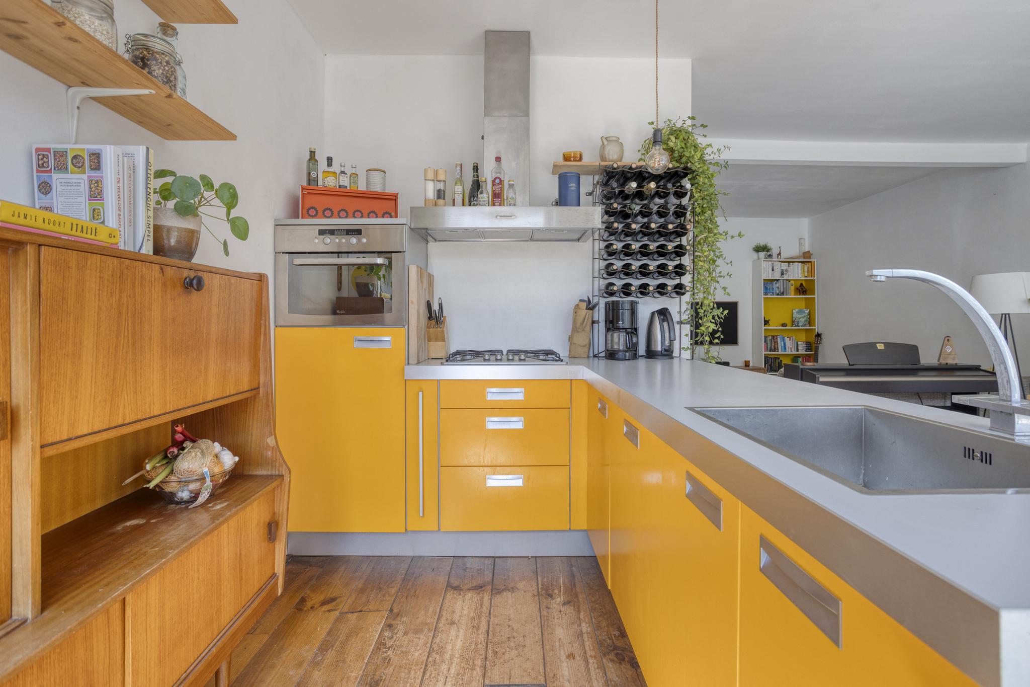 De riante woonkamer is een lichte open ruimte met, net als in de rest van de woning, een prachtige houten vloer. De open keuken uit 2007 heeft een speelse vorm met eetbar, een ruim werkblad, inbouwapparatuur en voldoende kastruimte.