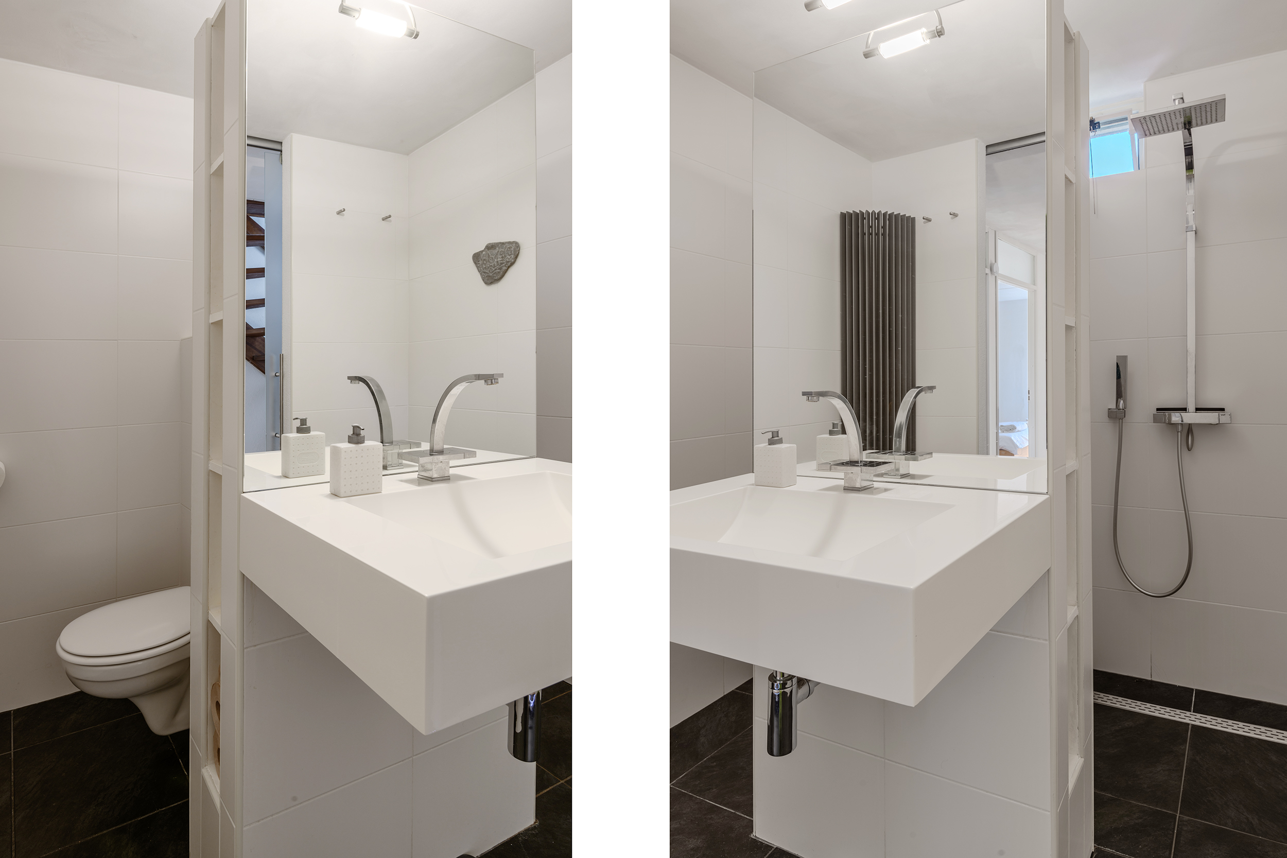 De vernieuwde badkamer is speels ingedeeld waardoor een inloopdouche, een toilet en een vaste wastafel in een meubel goed tot hun recht komen.