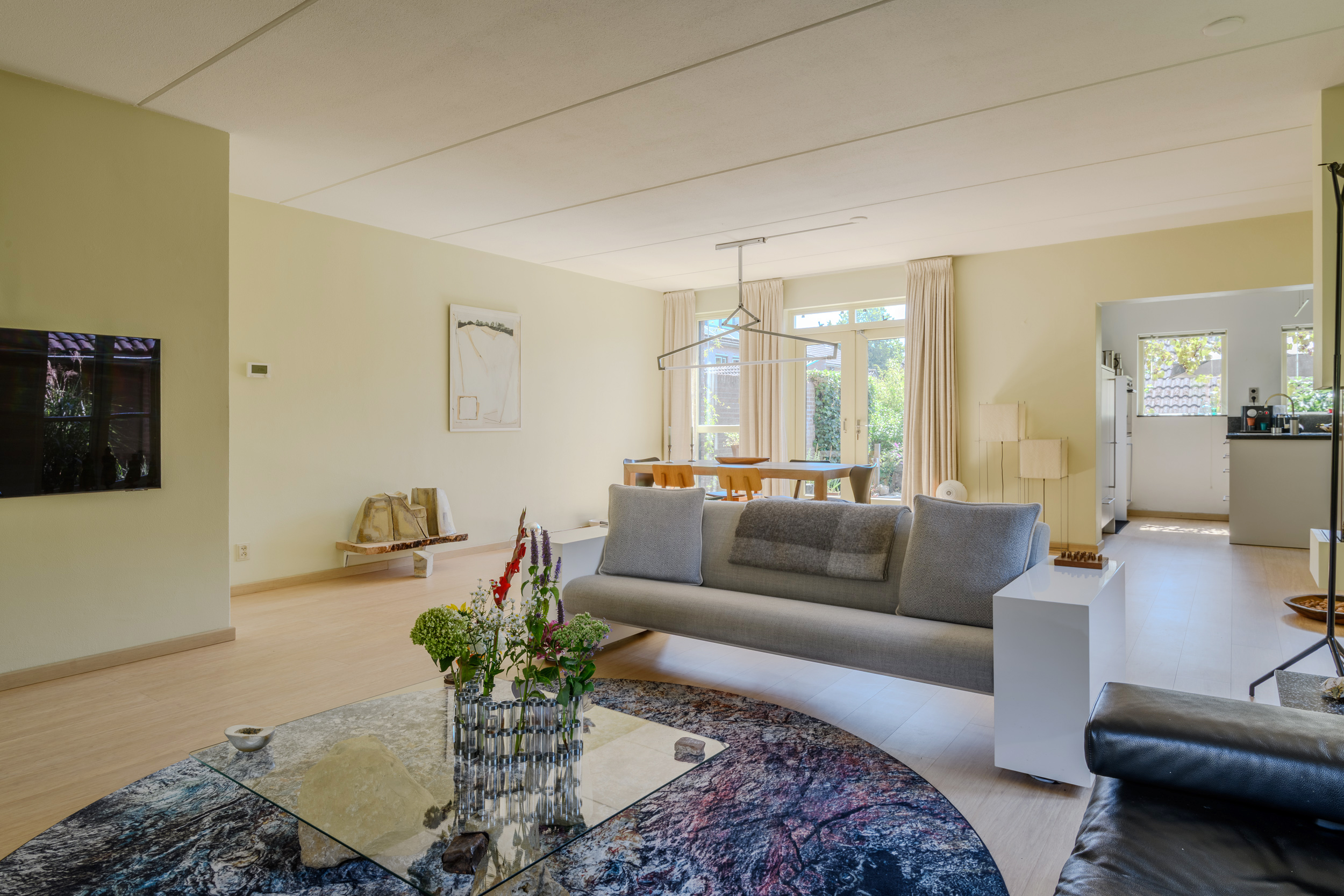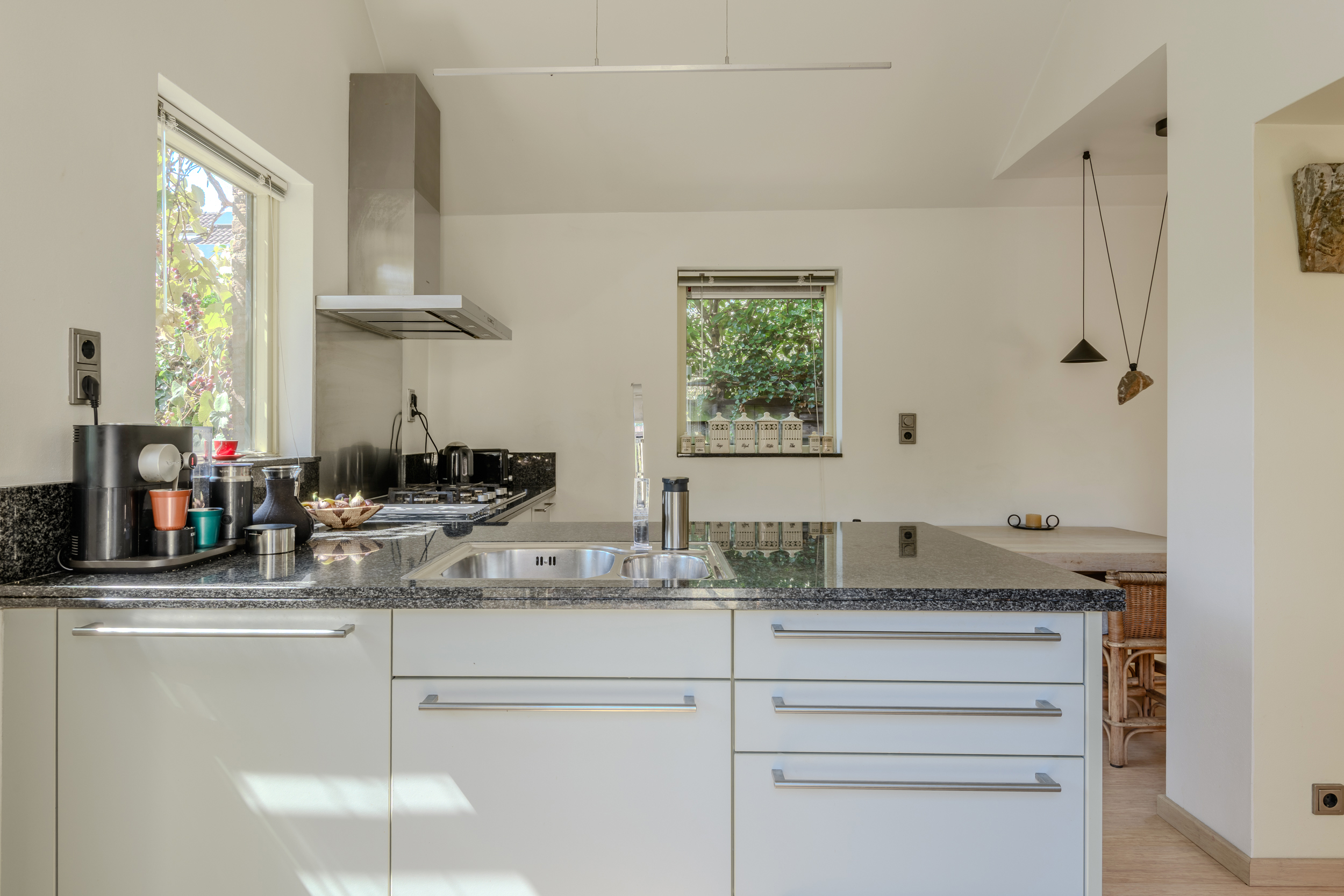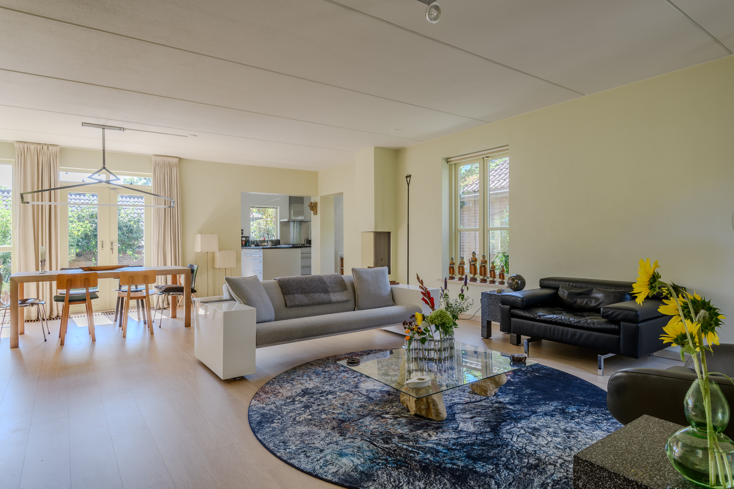 Vanuit de woonkamer is de open keuken zichtbaar: een luxe Bulthaup keuken (circa 2012) met inbouwapparatuur, een granieten blad, een eethoek en een buitendeur.