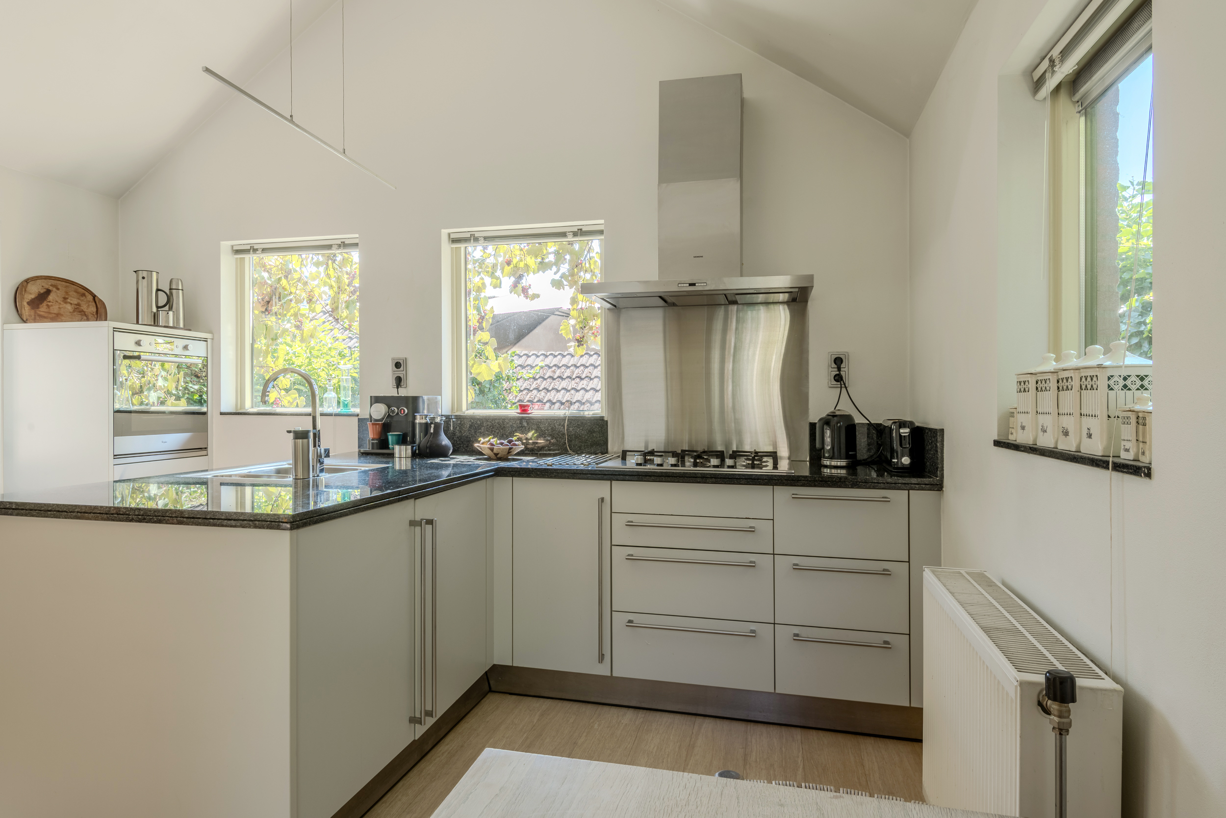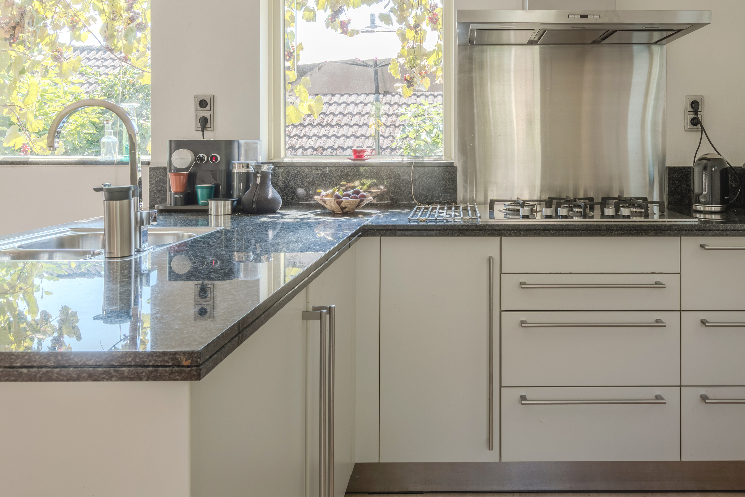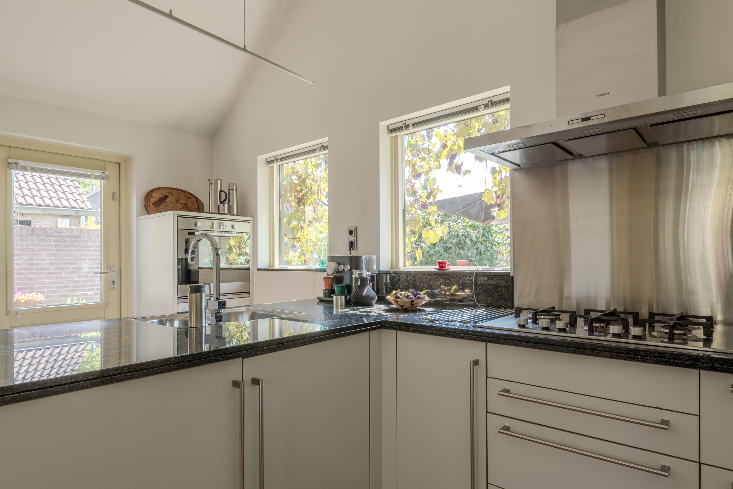 Vanuit de woonkamer is de open keuken zichtbaar: een luxe Bulthaup keuken (circa 2012) met inbouwapparatuur, een granieten blad, een eethoek en een buitendeur.