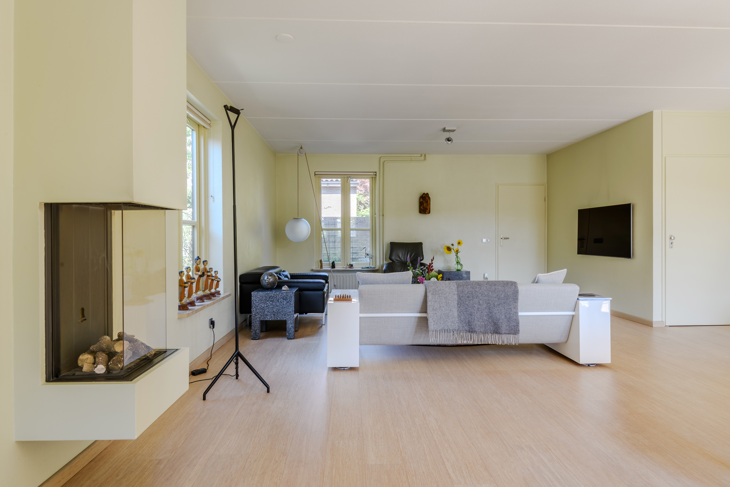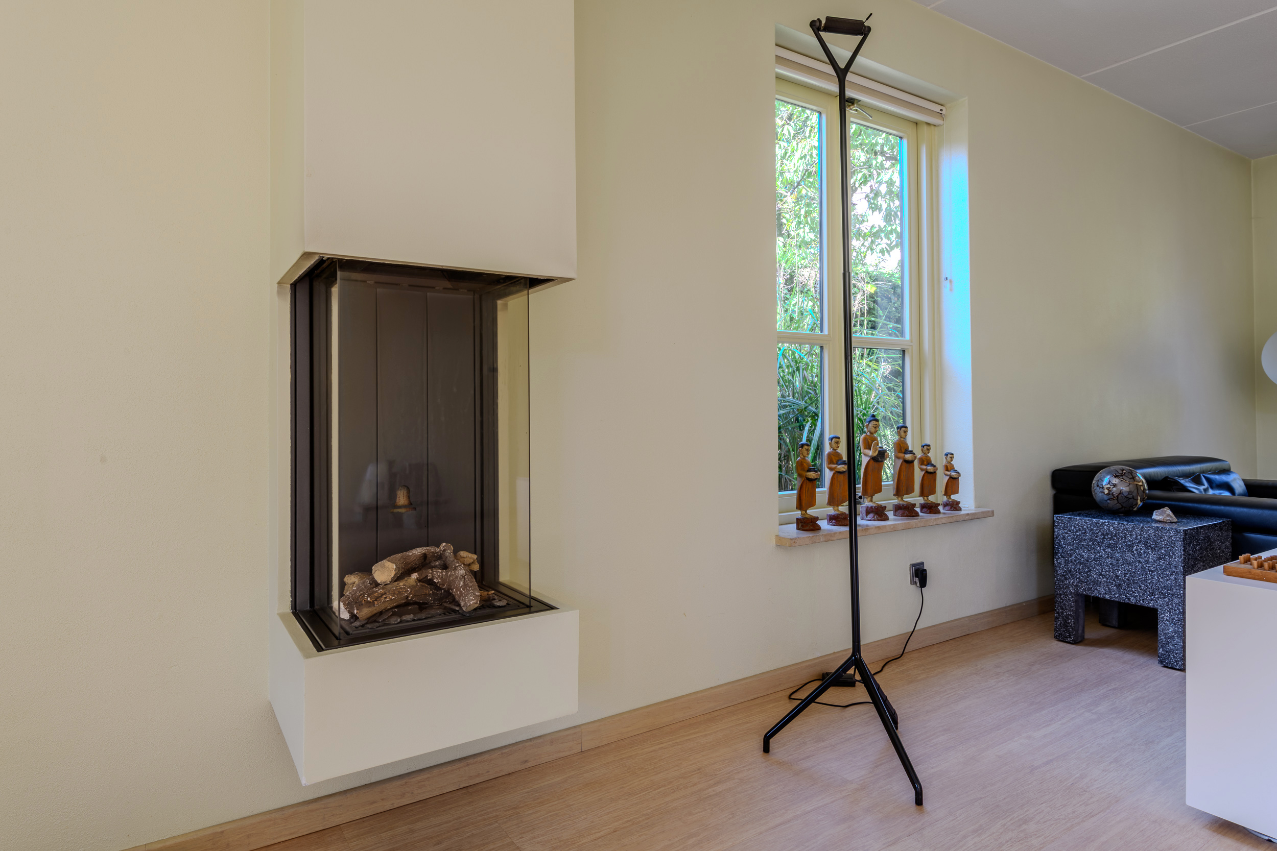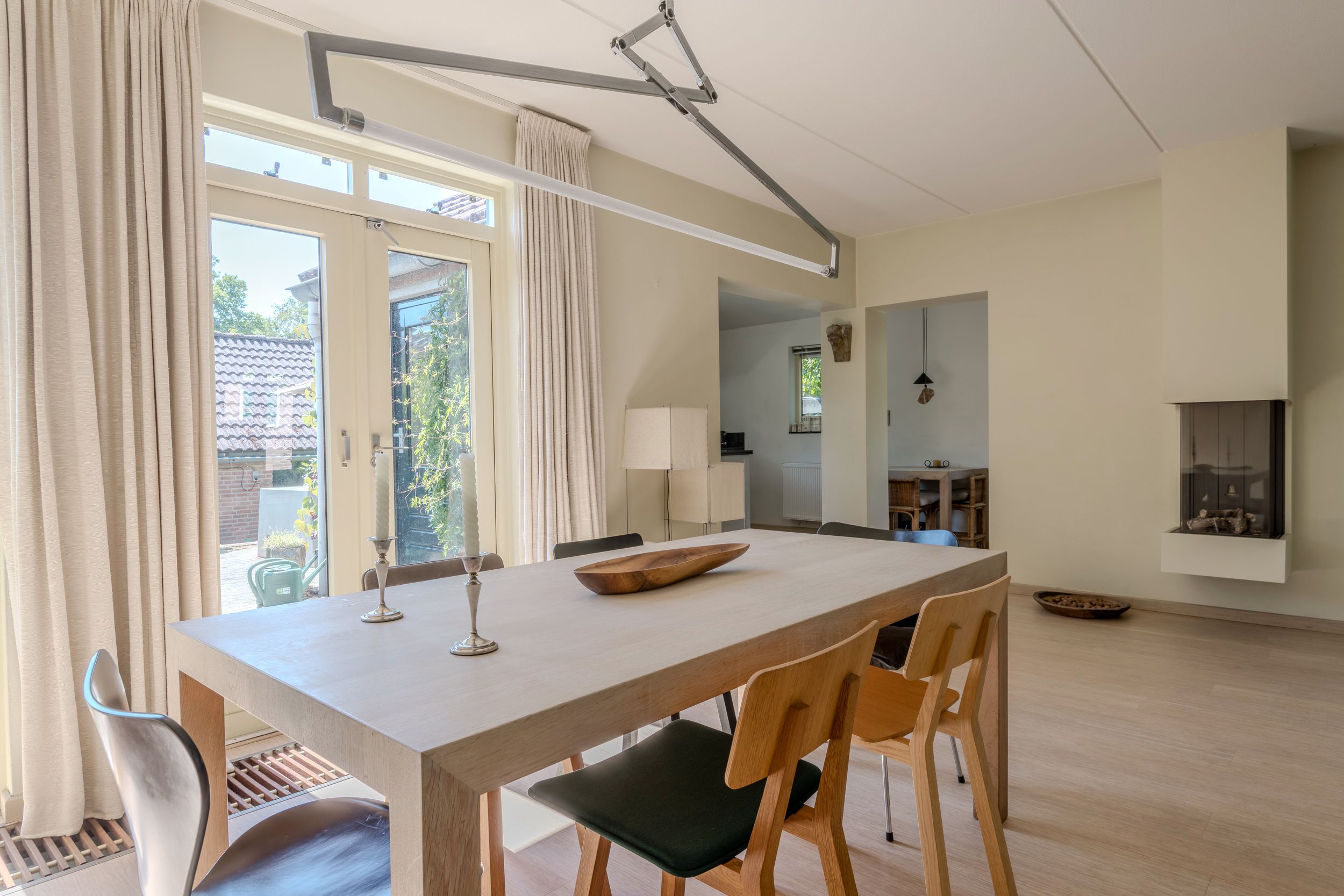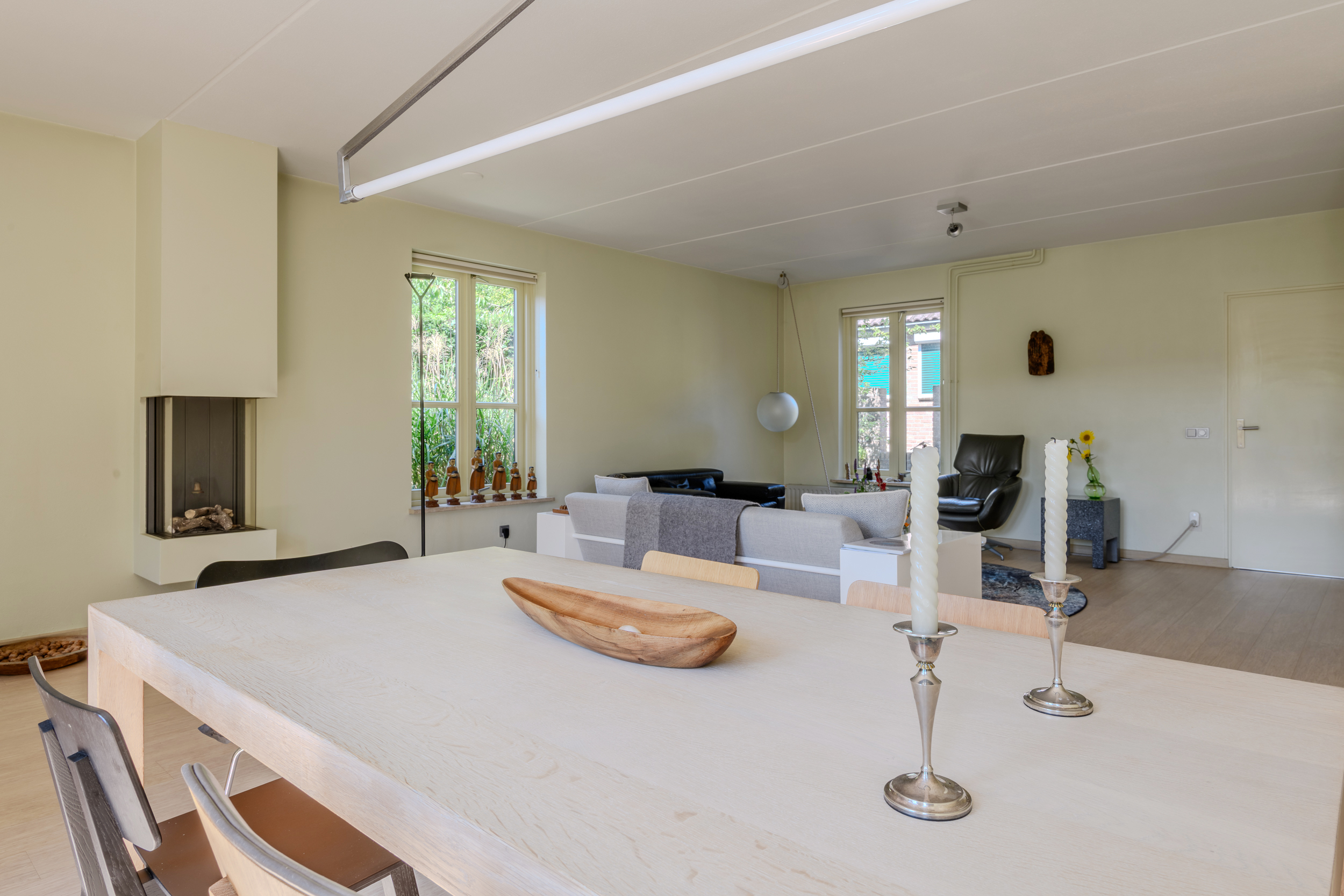 De woonkamer, met sfeervolle gashaard, heeft veel lichtinval door de grote ramen en tuindeuren en een mooie bamboe parketvloer met onder de constructievloer en Tonzon isolatievloer. Ruime bergmogelijkheden in de trapkast.