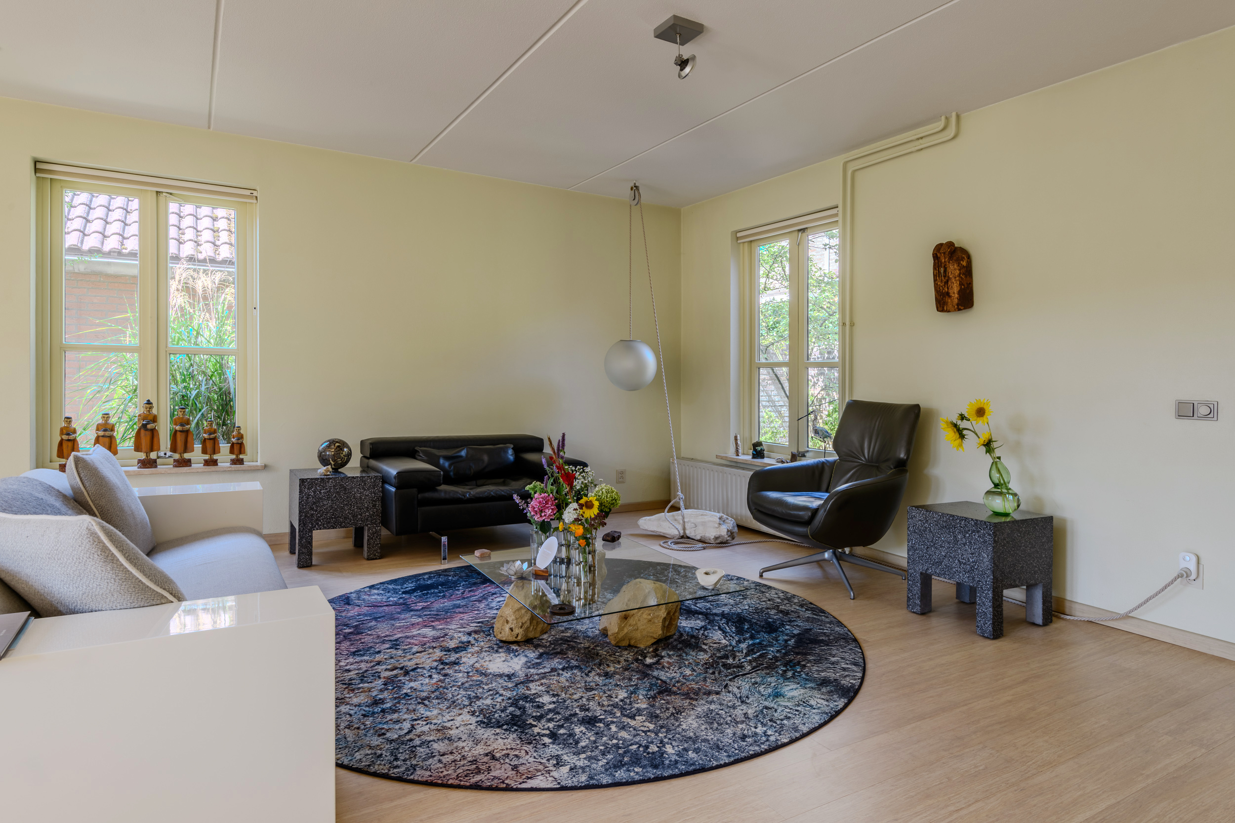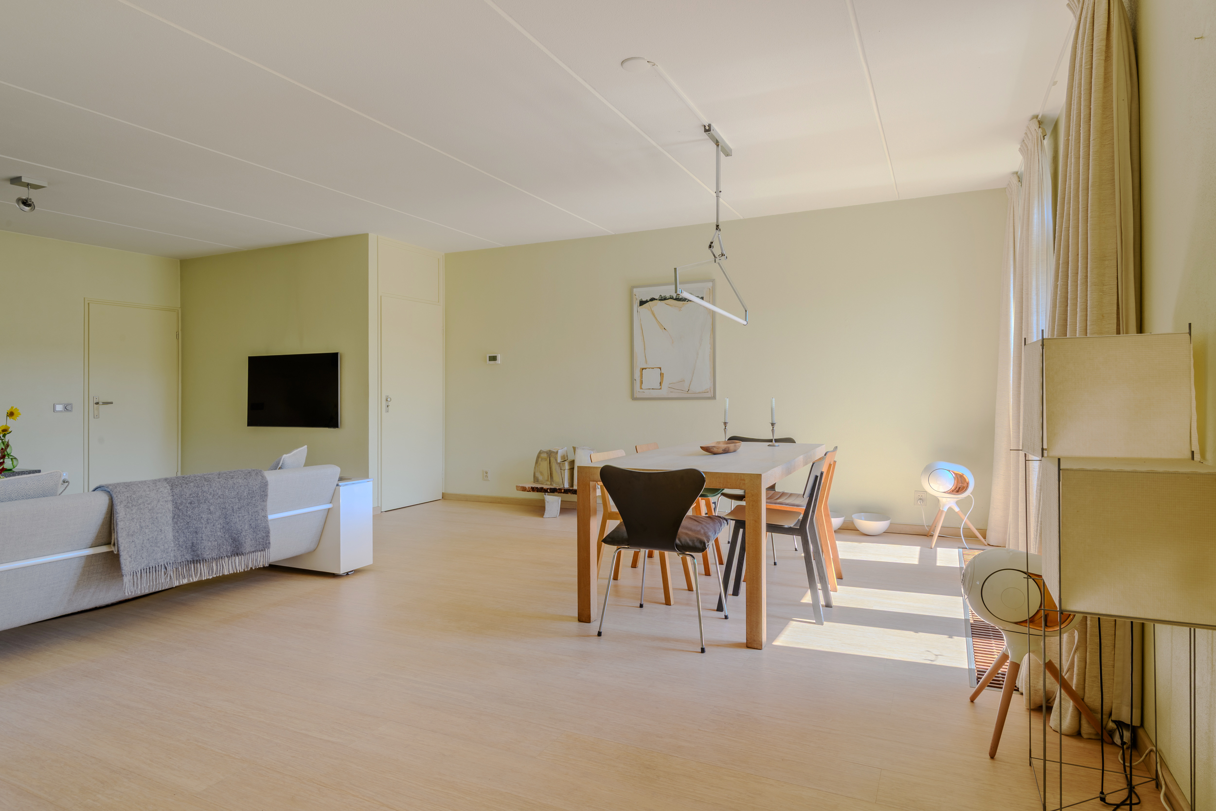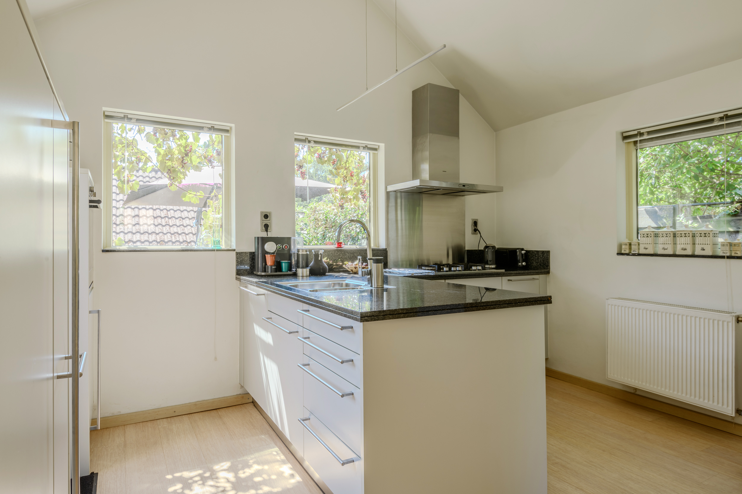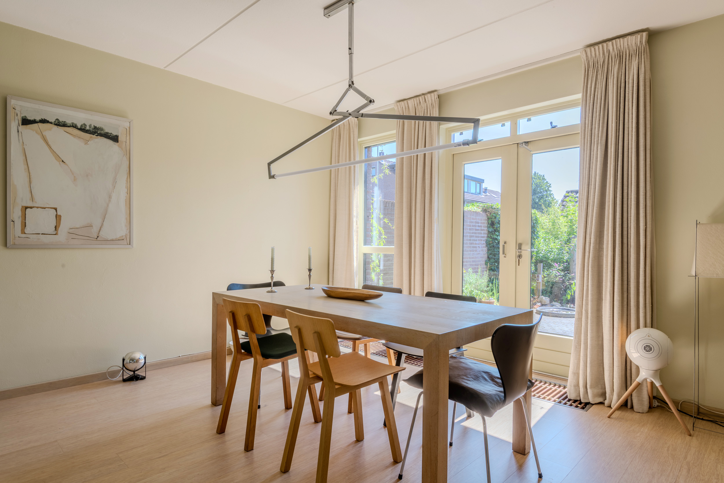 De woonkamer, met sfeervolle gashaard, heeft veel lichtinval door de grote ramen en tuindeuren en een mooie bamboe parketvloer met onder de constructievloer en Tonzon isolatievloer. Ruime bergmogelijkheden in de trapkast.
