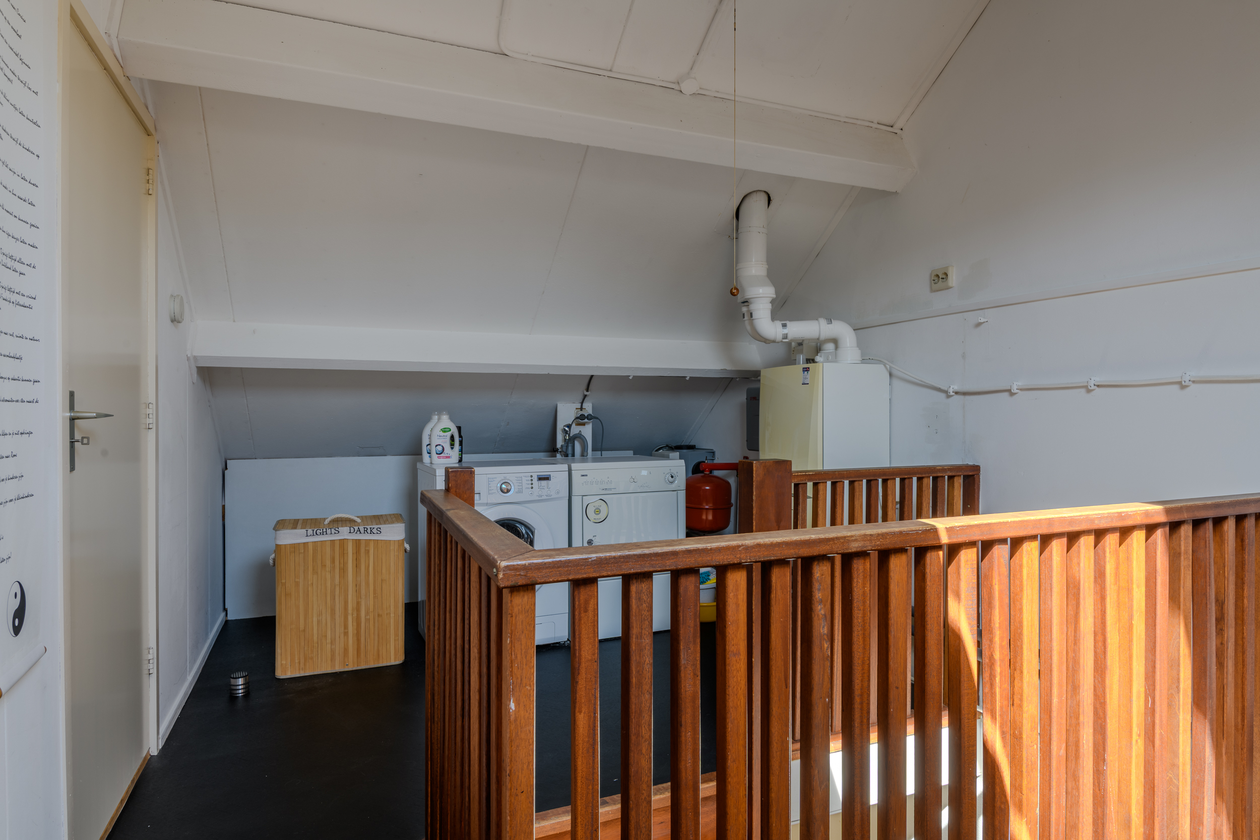 vast trap naar zolderverdieping met een voorzolder met de c.v.-ketel (2011), kasten en wasmachine-drogeropstelling.