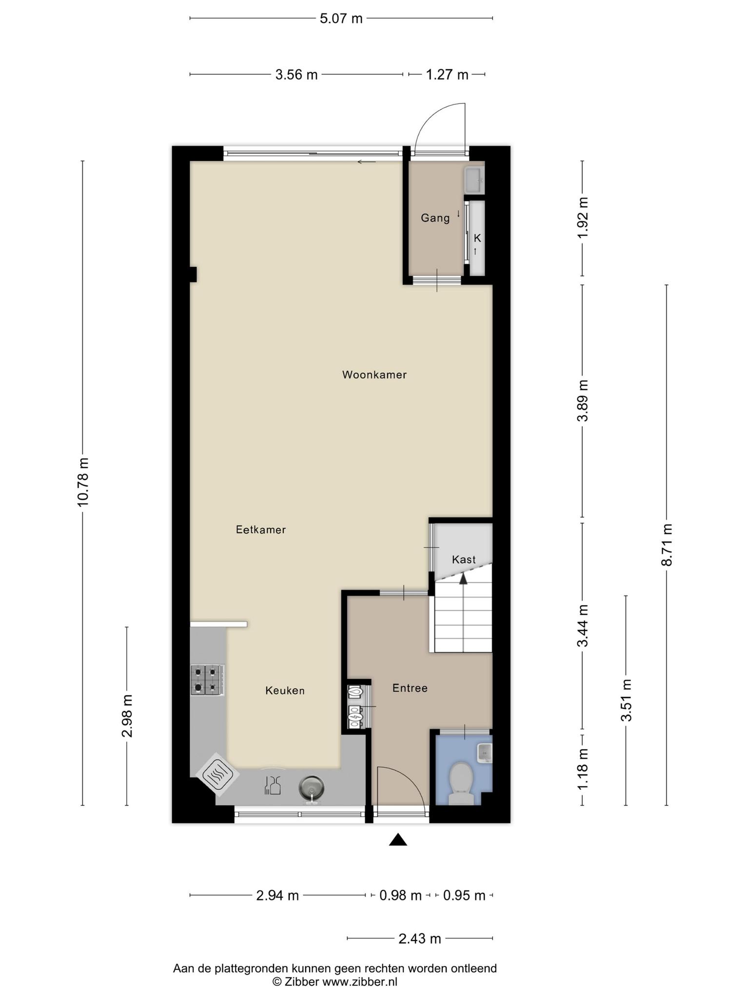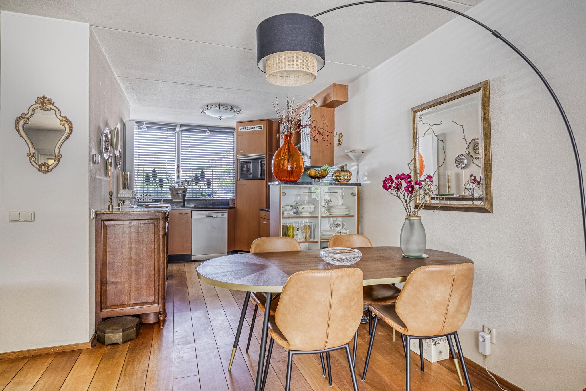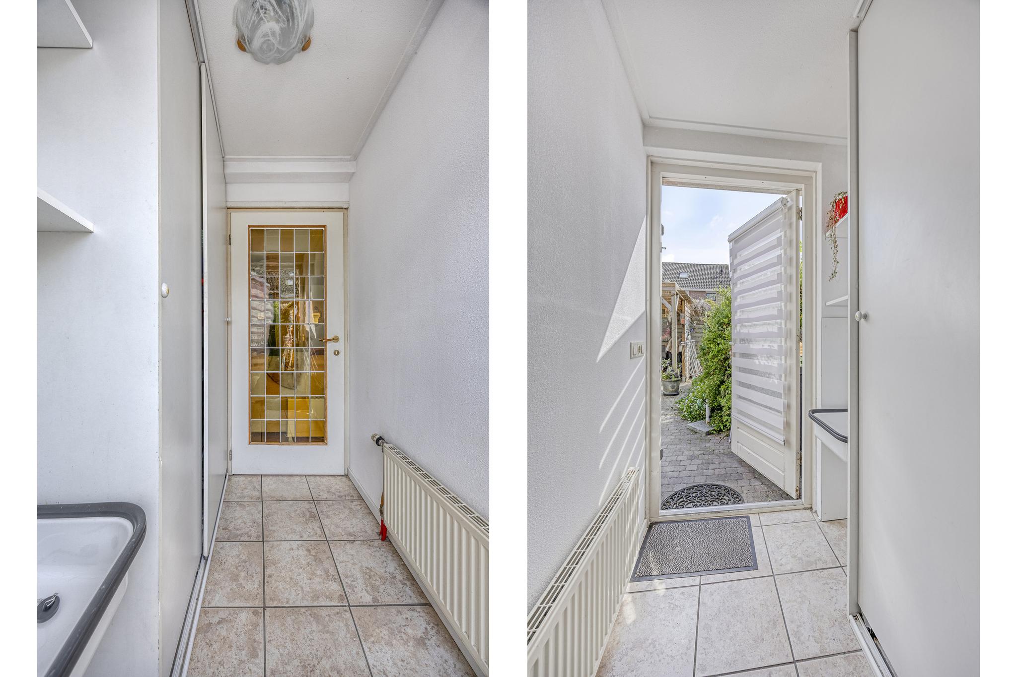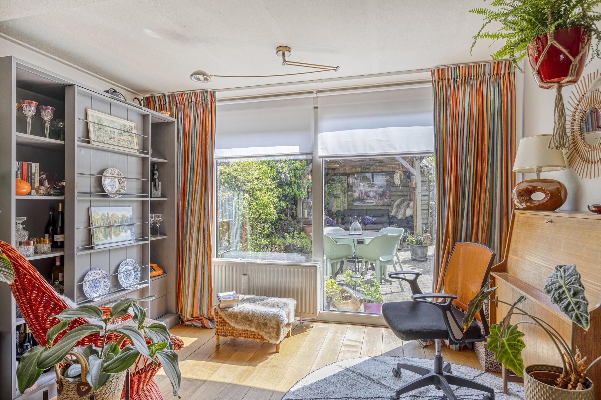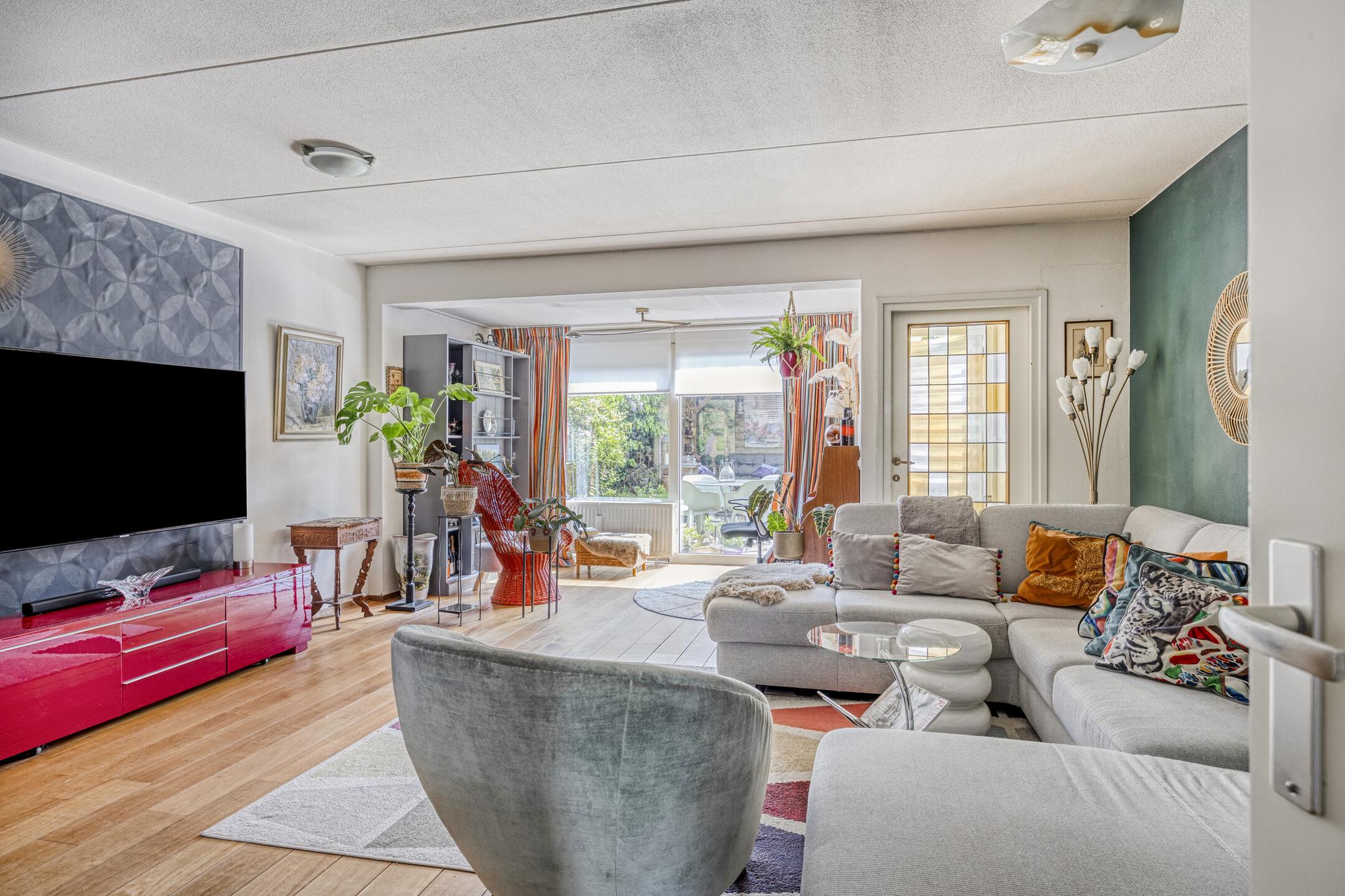 Begane grond: entree met hal, meterkast en toilet. De lichte L-vormige woonkamer heeft een fraaie massief houten parketvloer (Robinia hout) en is aan de achterzijde uitgebouwd en voorzien van een schuifpui naar de achtertuin. De tuin is ook bereikbaar via een achterportaal.