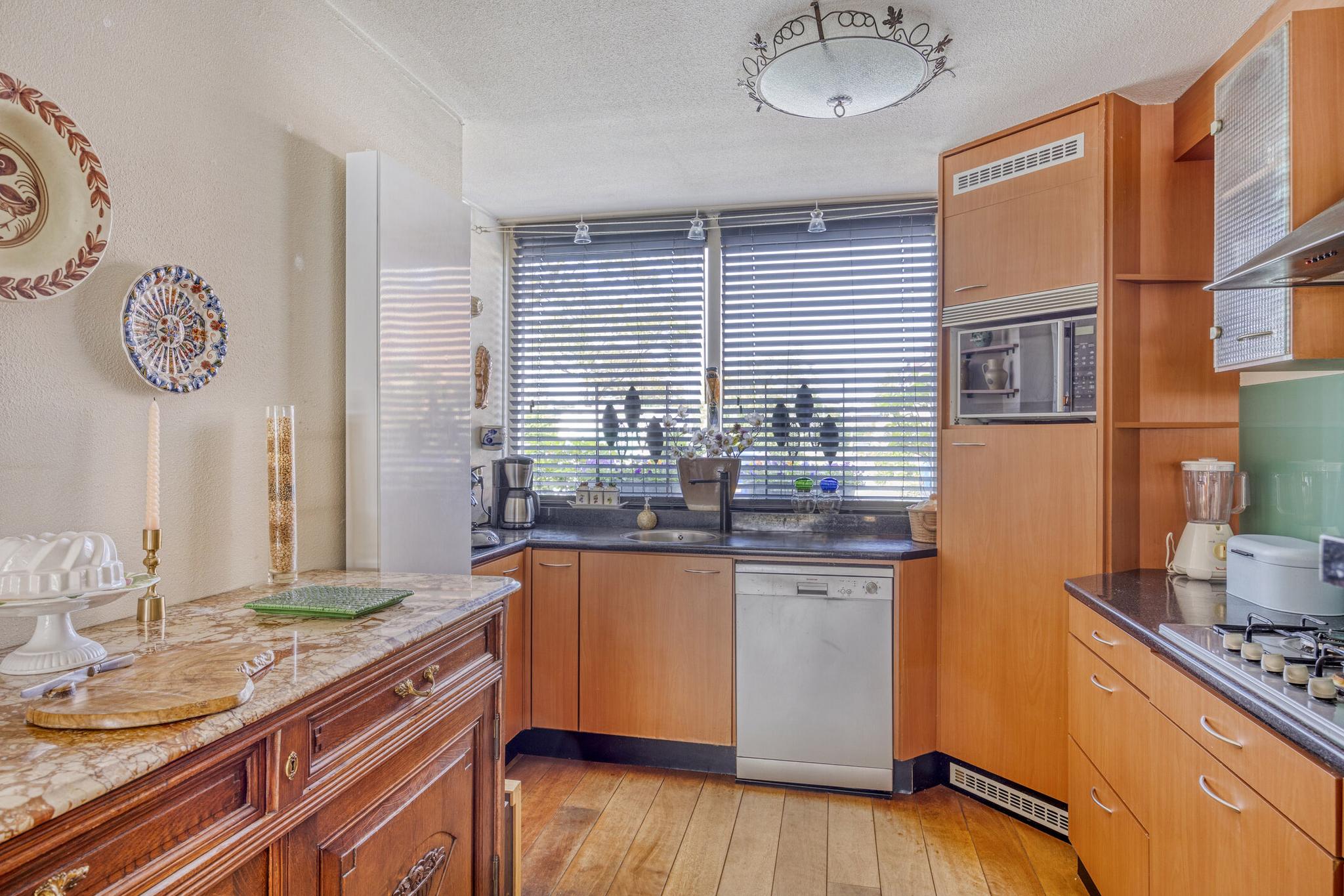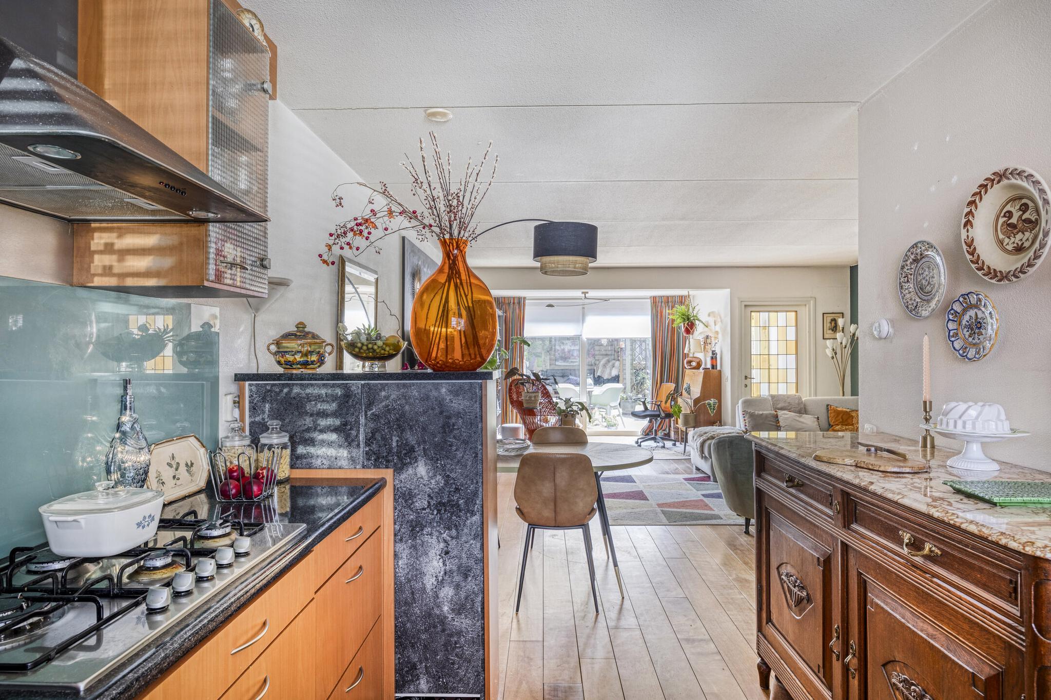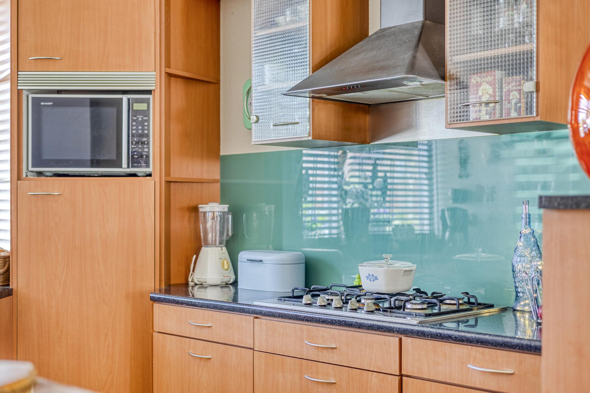 Aan de voorzijde is de open keuken in een L--opstelling gesitueerd. Naast voldoende kastruimte is er ook een vaatwasser, koelkast, gaskookplaat en een afzuigkap.
