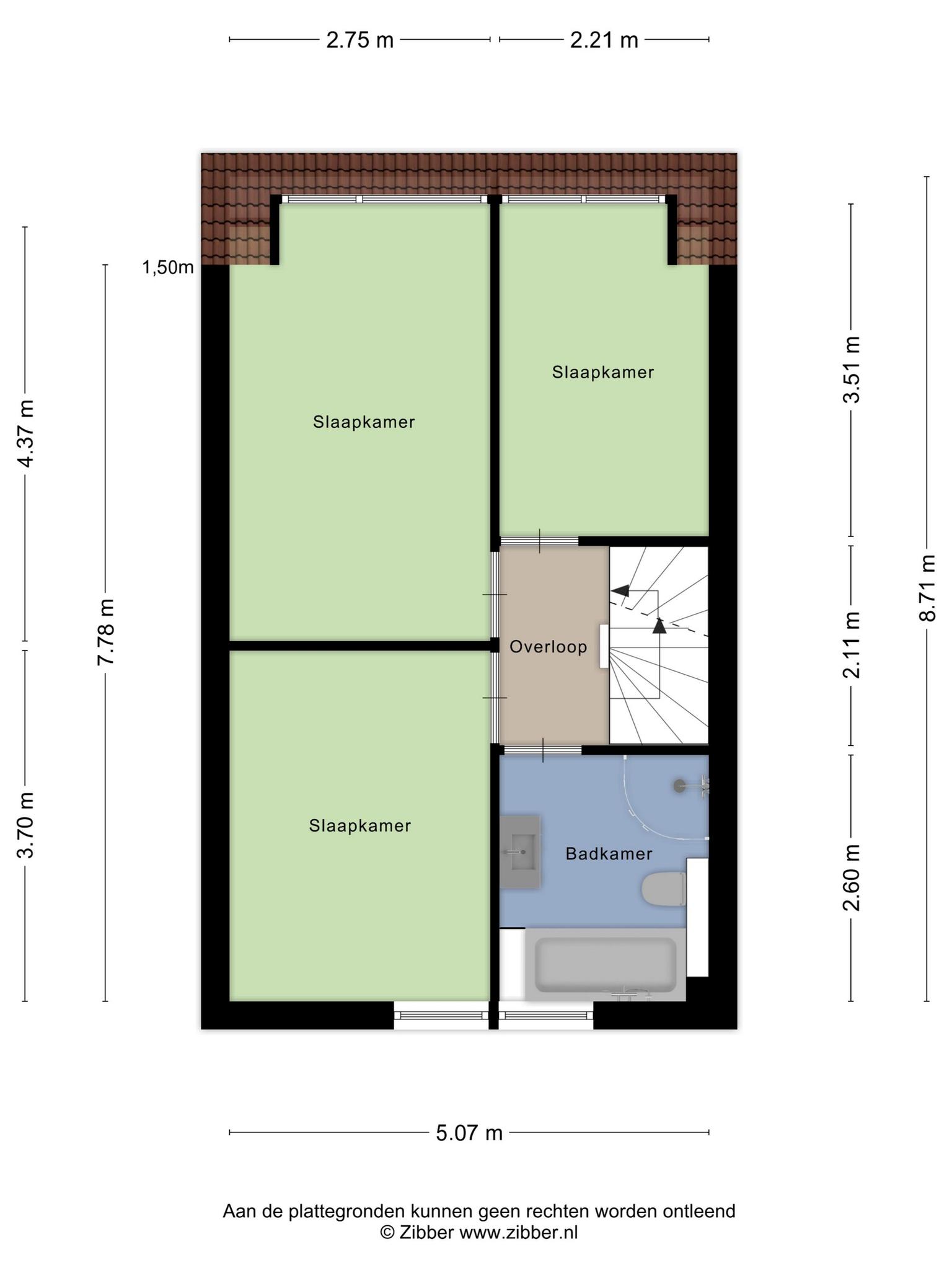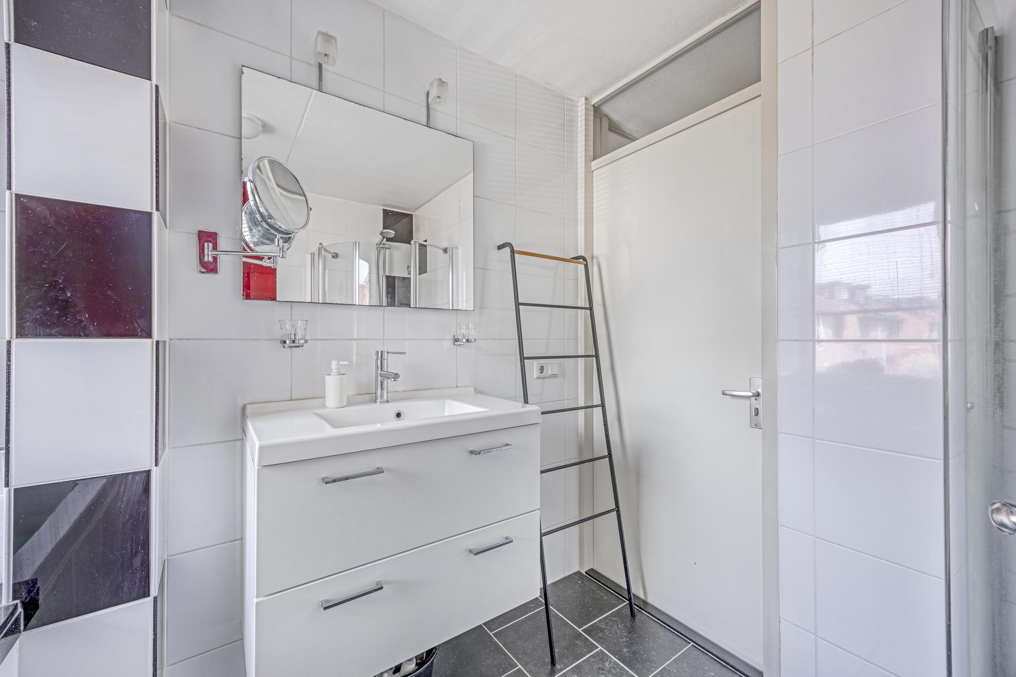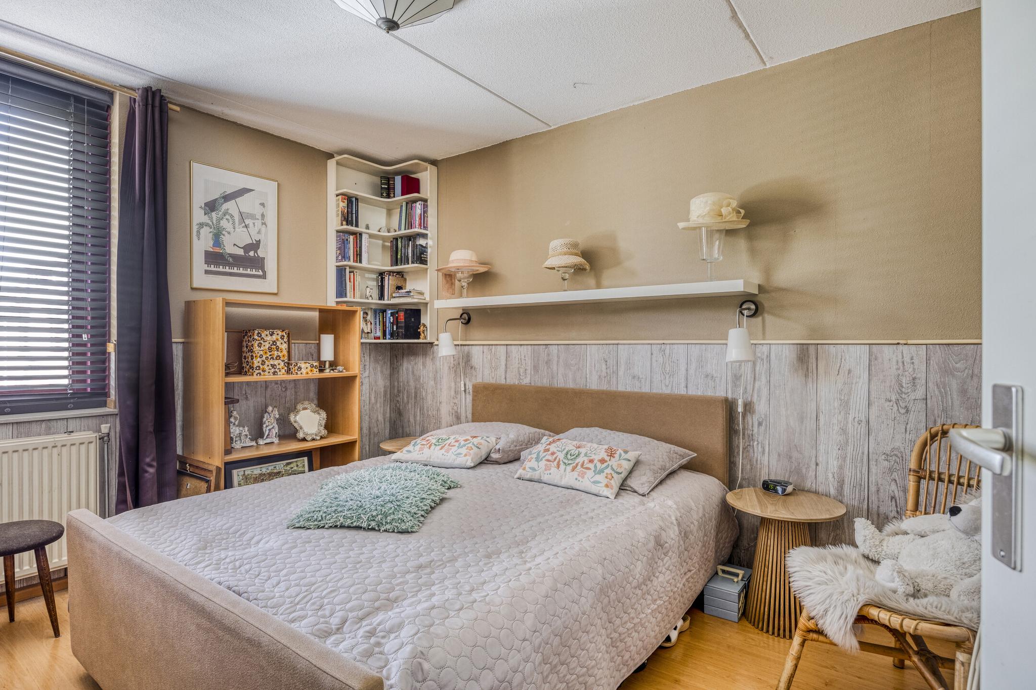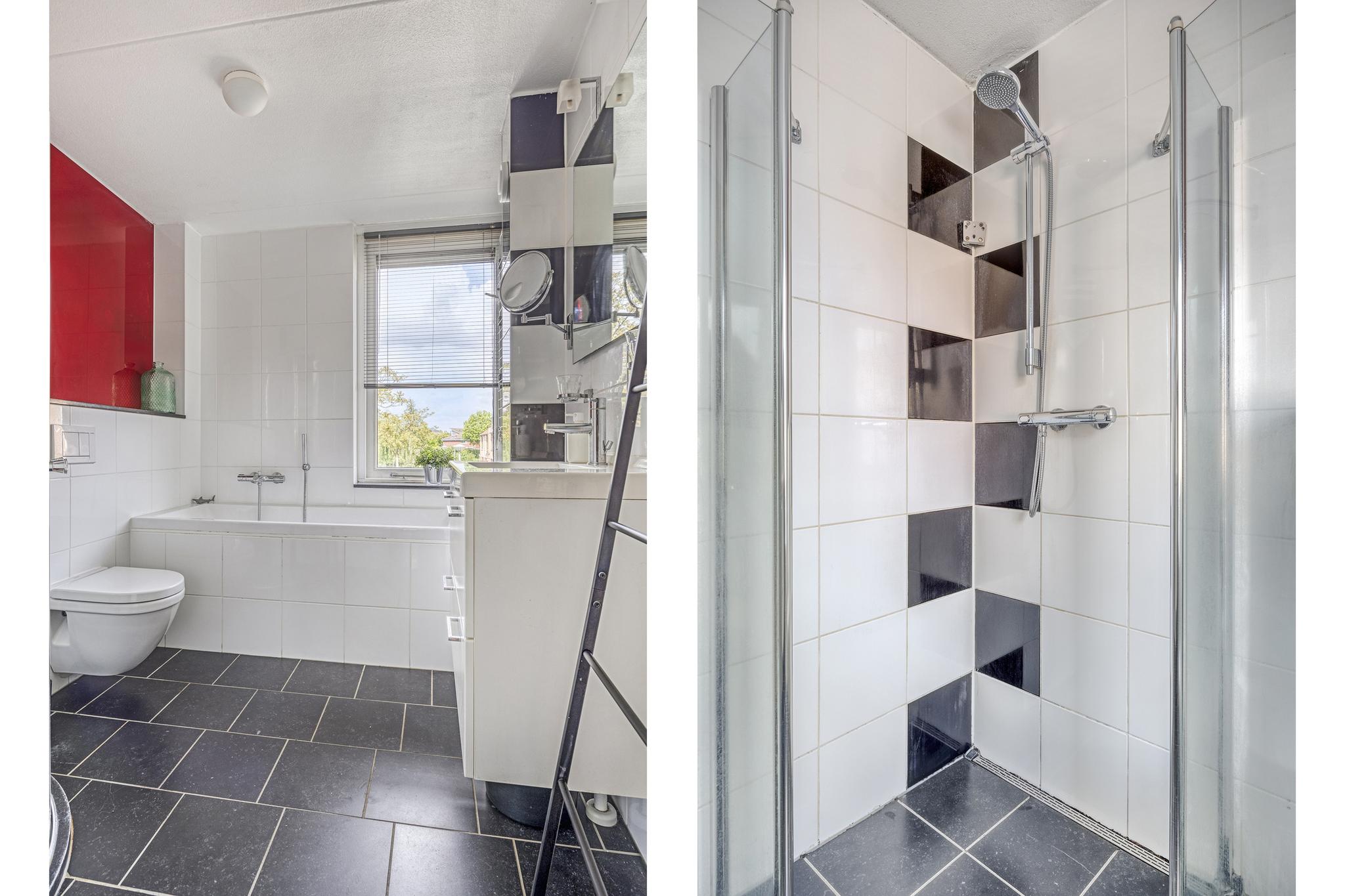 1e verdieping: overloop, lichte badkamer met douche, wastafelmeubel, ligbad en 2e toilet, twee ruime slaapkamers en een kleinere slaapkamer. De 2 slaapkamers aan de achterzijde hebben beiden een hoogwaardige kunststof dakkapel, geplaatst in 2010.