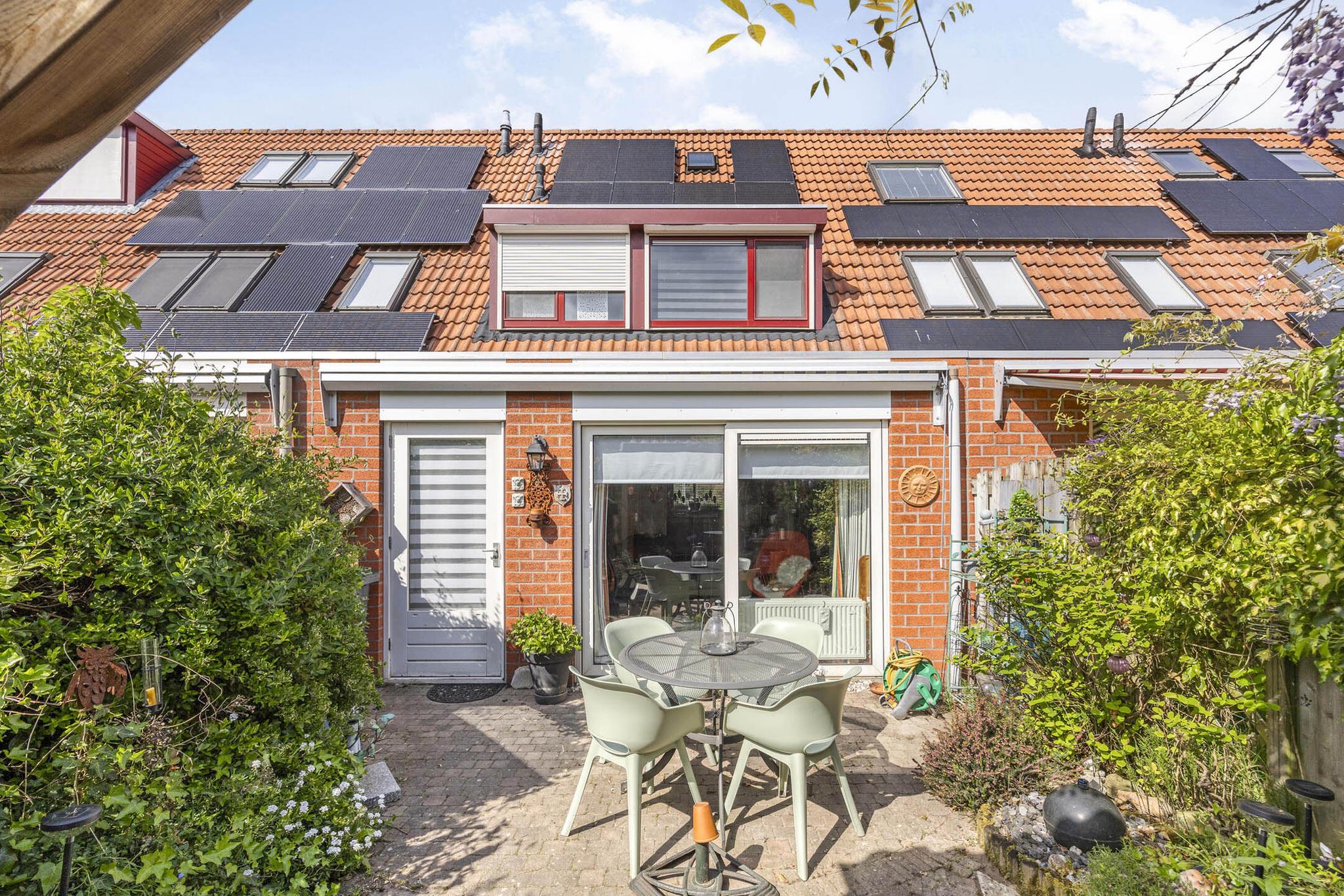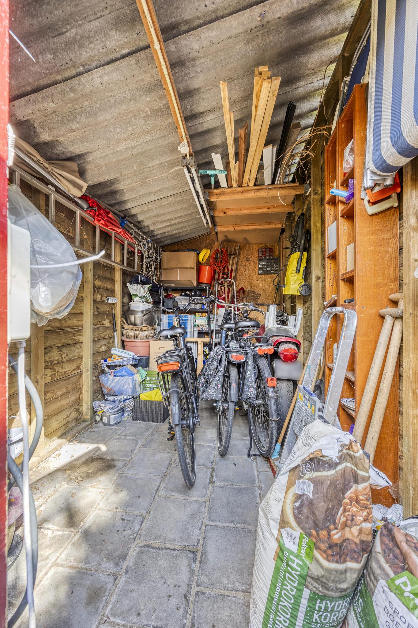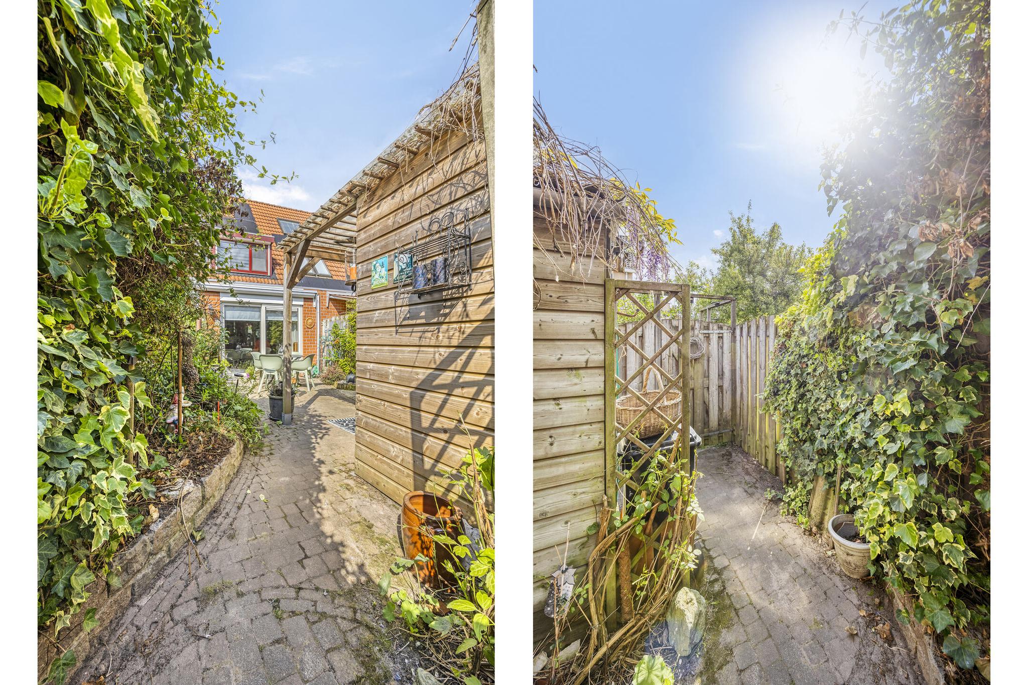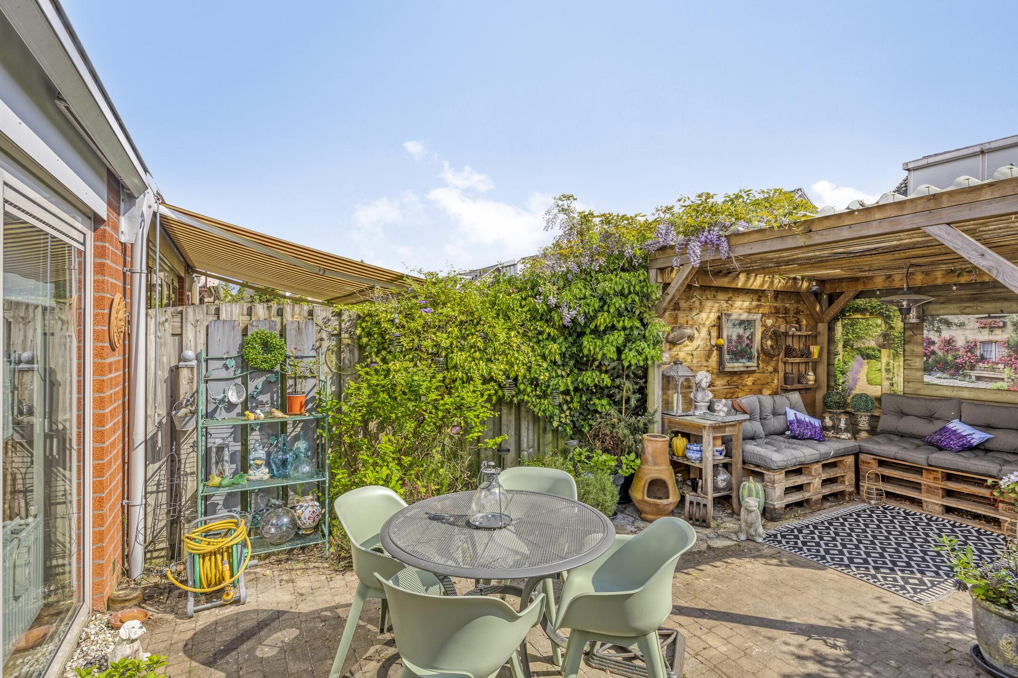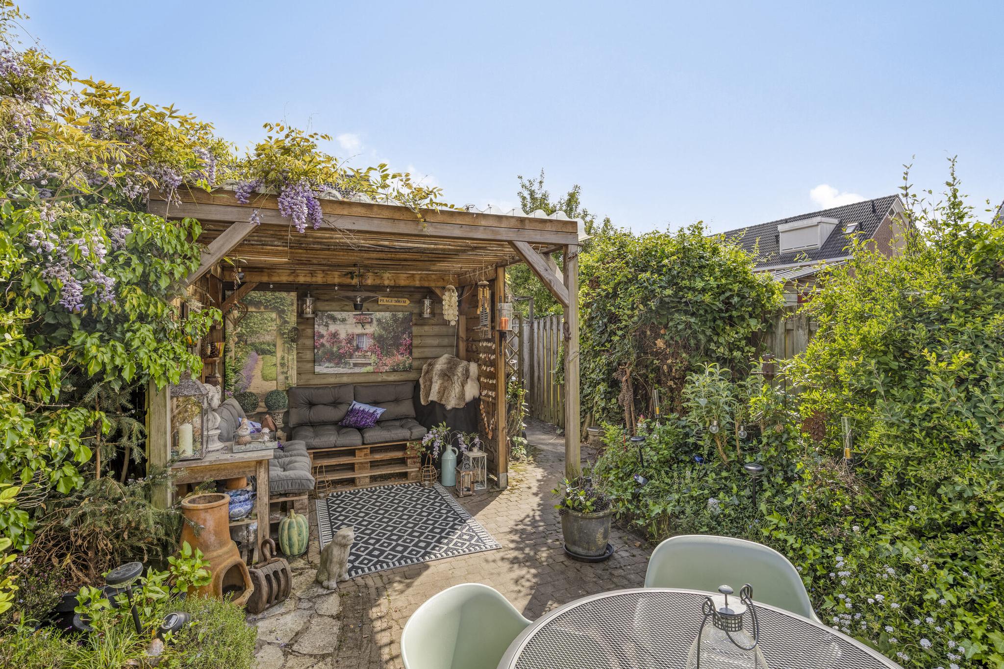 Tuin: zonnige en groene achtertuin van circa 10 bij 5 meter op het zuiden met veel privacy. Er is een houten terrasoverkapping geplaatst en er is een vrijstaande berging met elektra en een achterom.