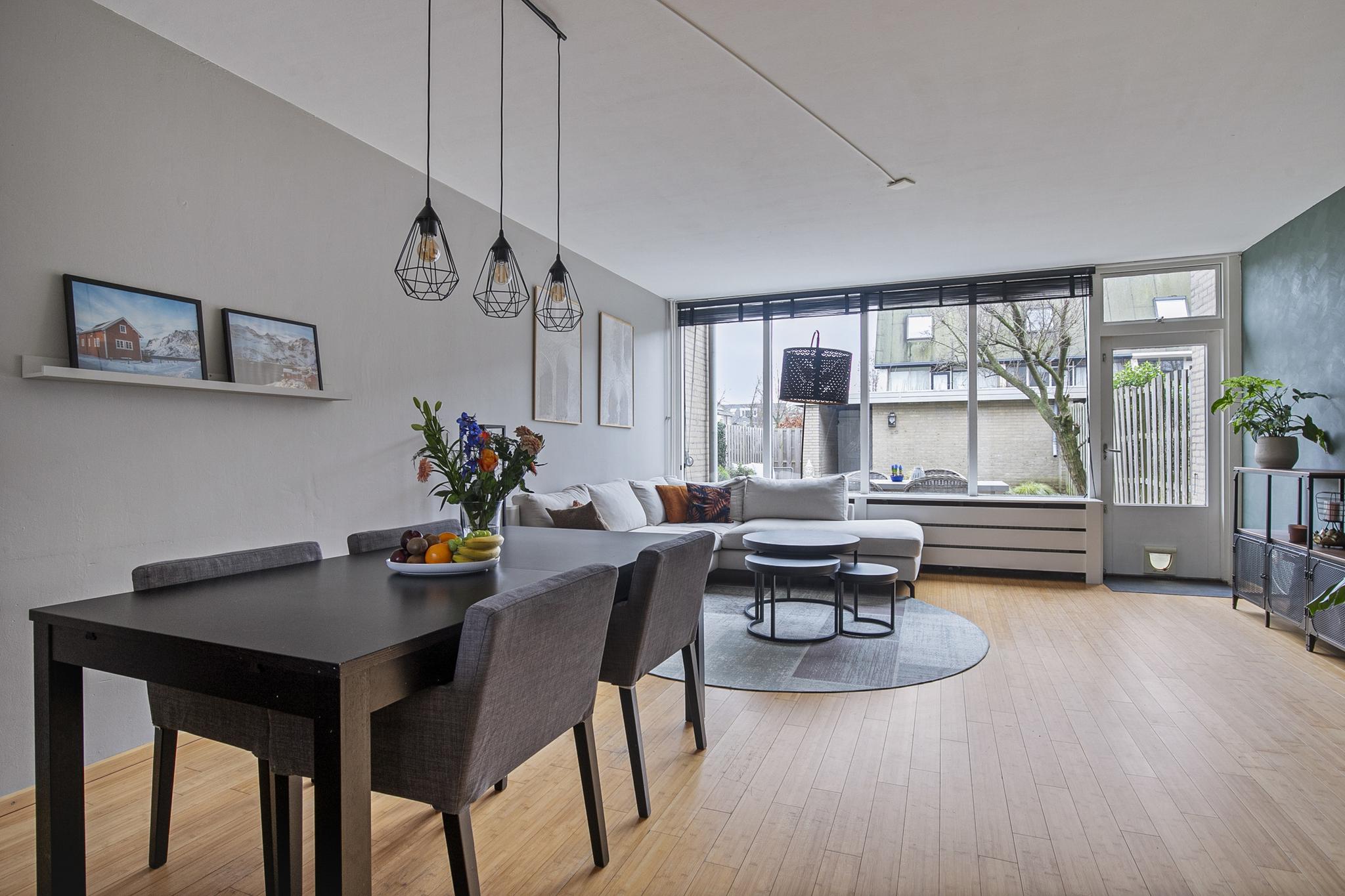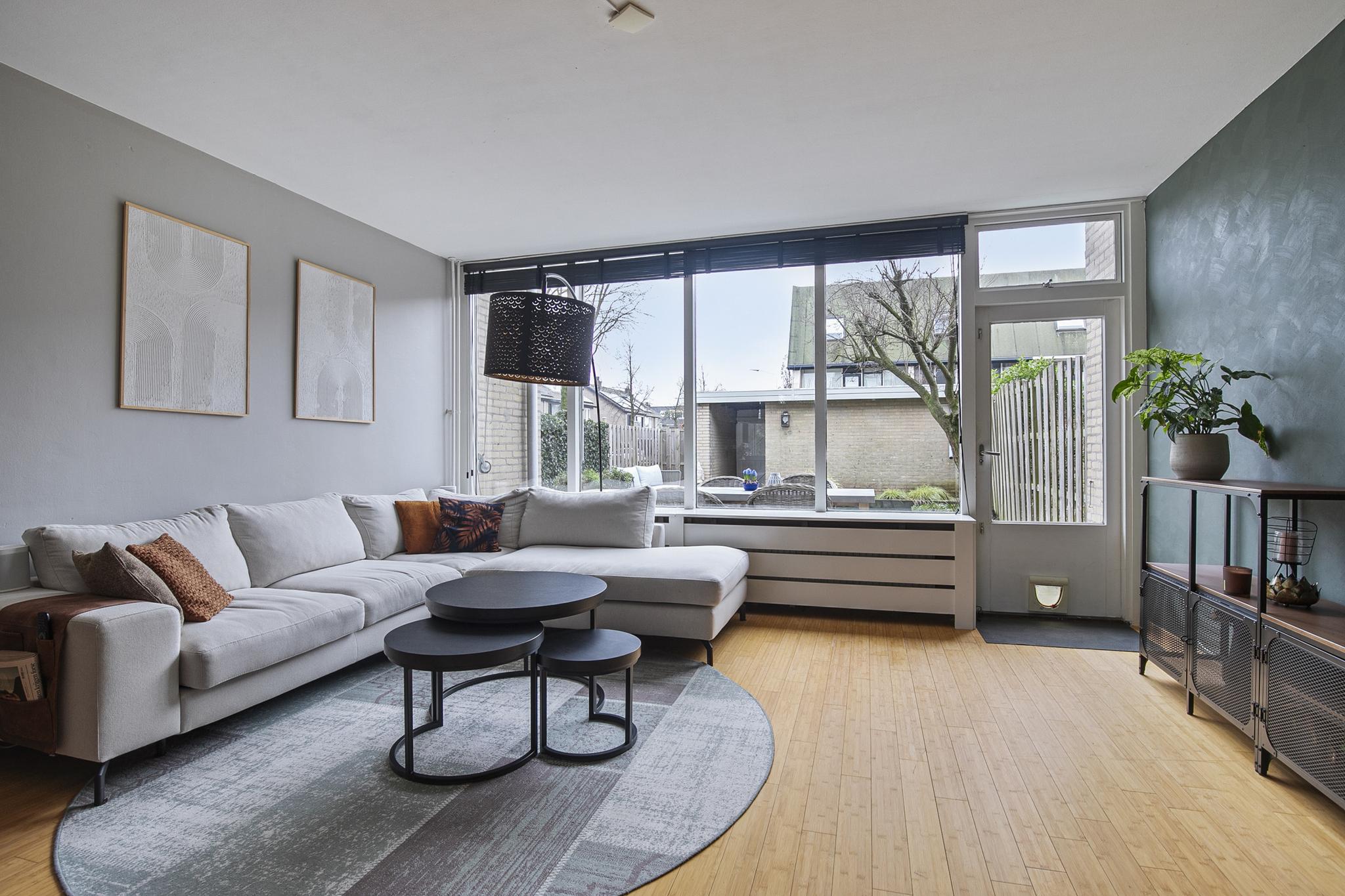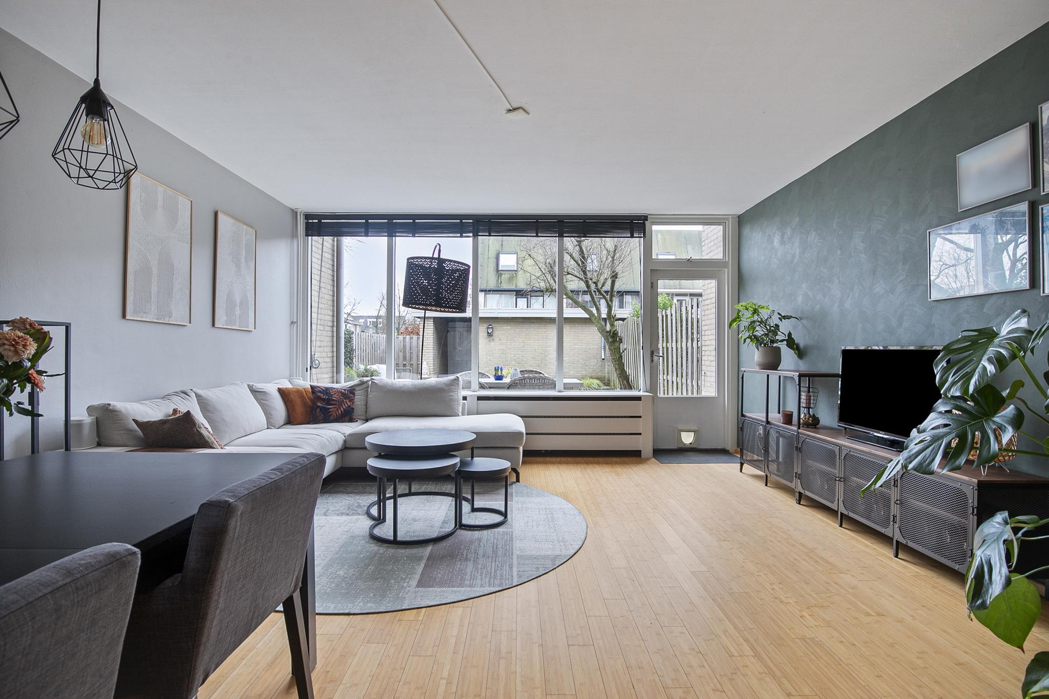 De lichte woonkamer met bamboe vloer, heeft door de grote raampartij en buitendeur veel lichtinval en zicht op de eigen achtertuin.
