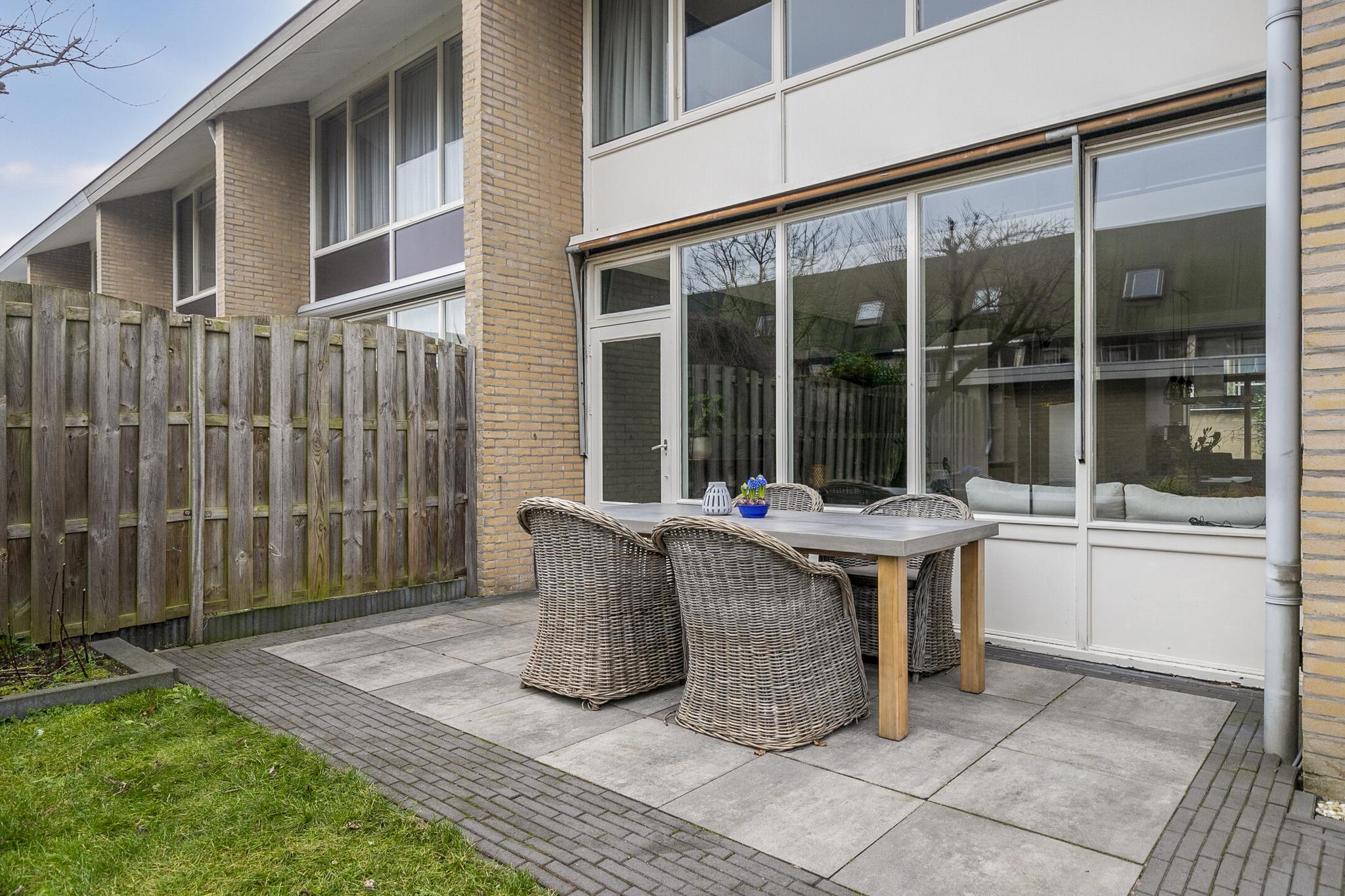 In 2020 mooi aangelegde en vrij gelegen zonnige zij- en achtertuin op het Zuiden. Naast de stenen berging is een poort naar de achterom.