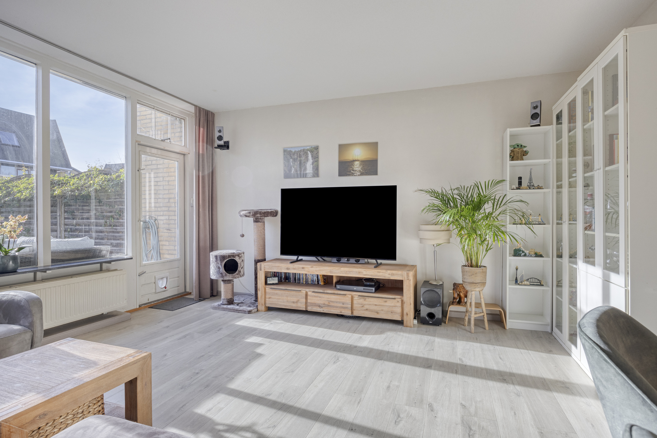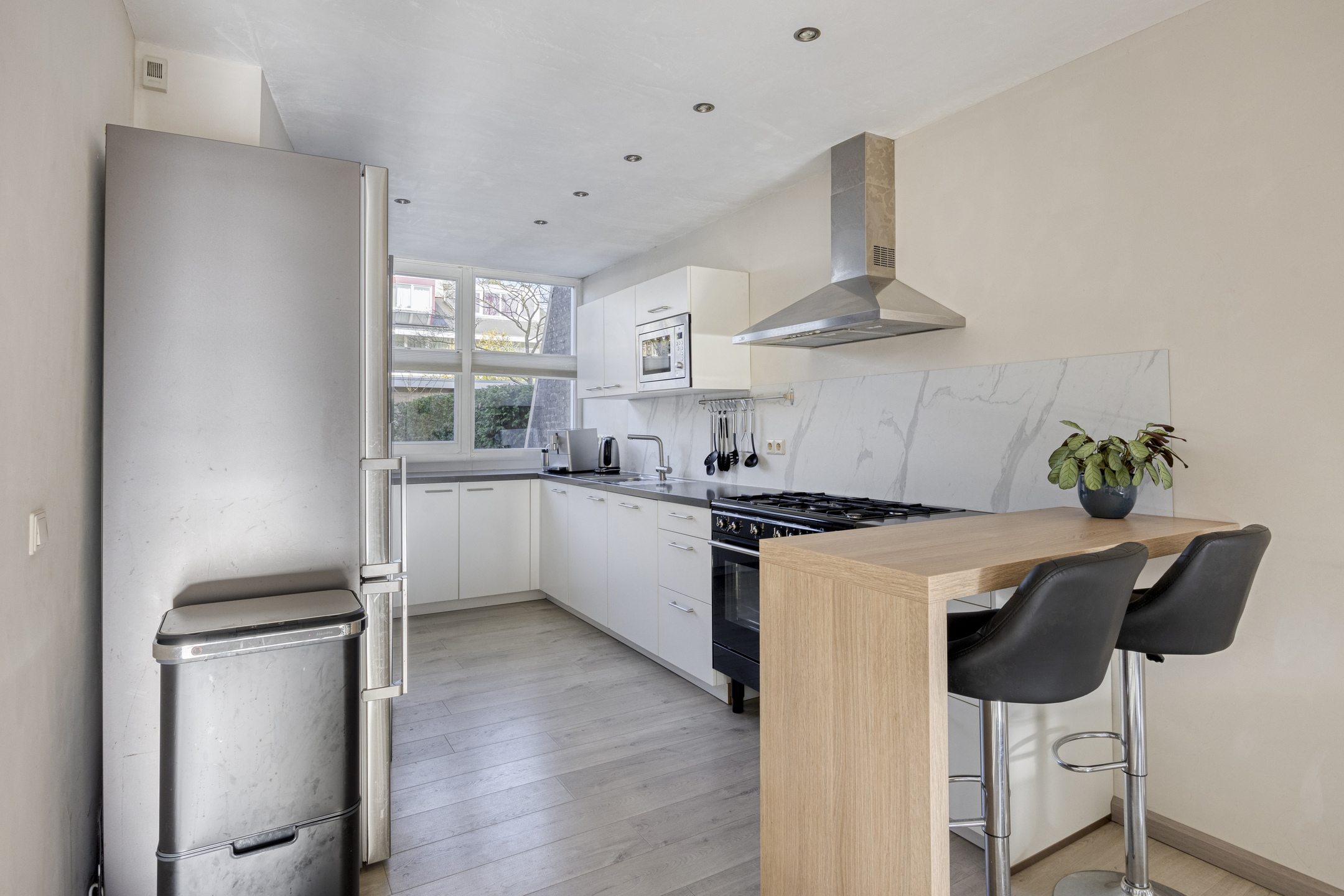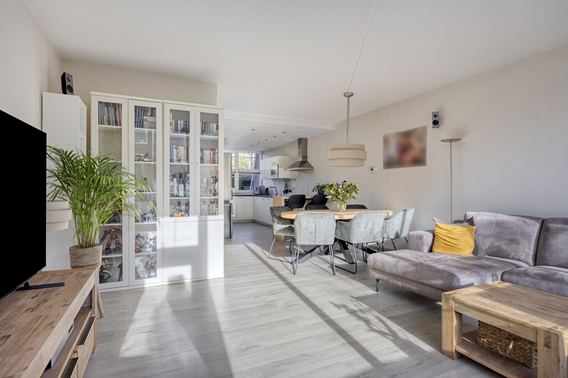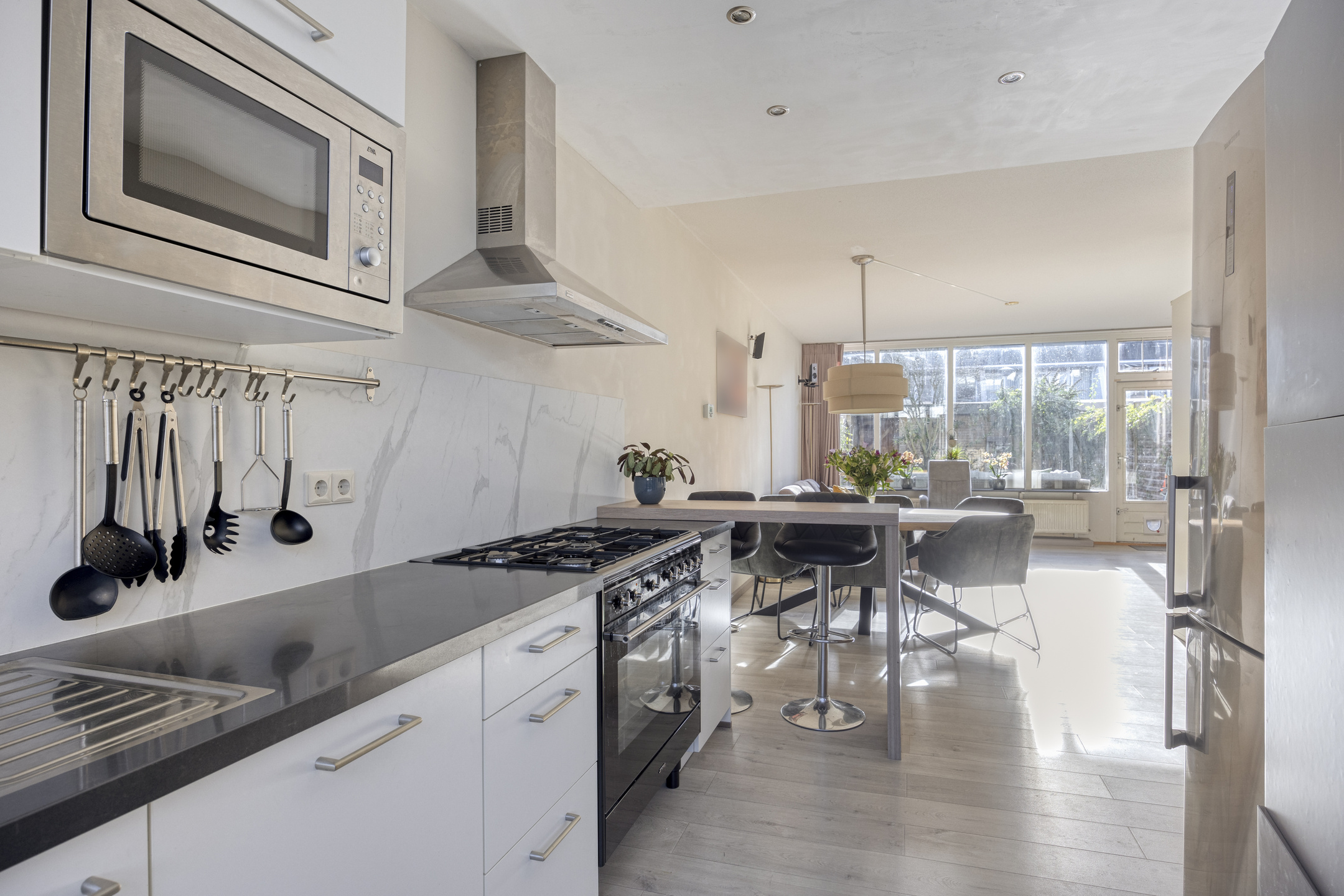 De ruime hal met garderobe, meterkast, toilet en trapopgang leidt naar de lichte woonkamer met nette laminaatvloer en openslaande deur naar de zonnige achtertuin. De open L-vormige keuken (2019) met inbouwapparatuur en gezellige eetbar vormt het hart van het huis – ideaal voor samen koken, huiswerk maken of borrelen met vrienden.