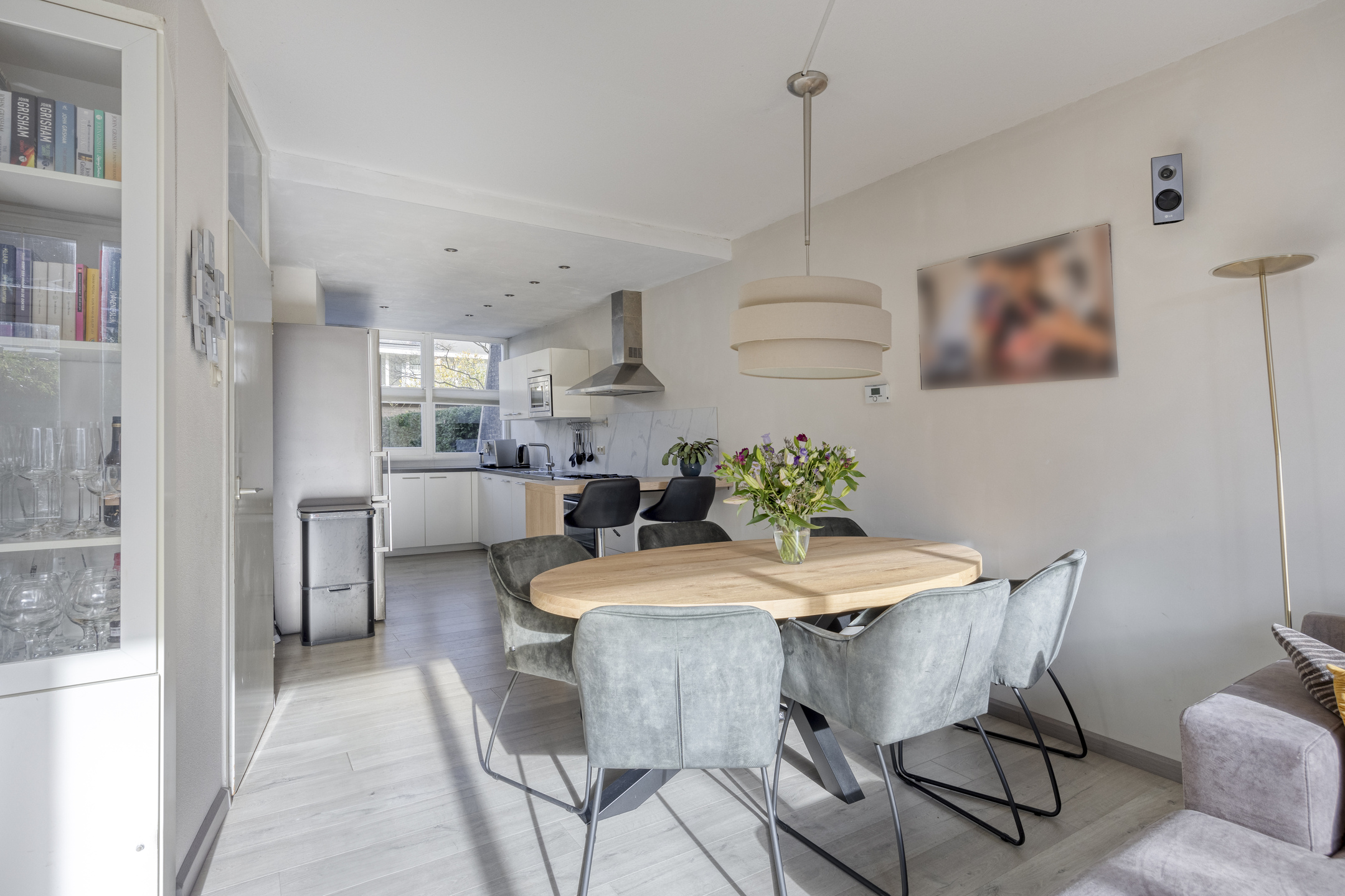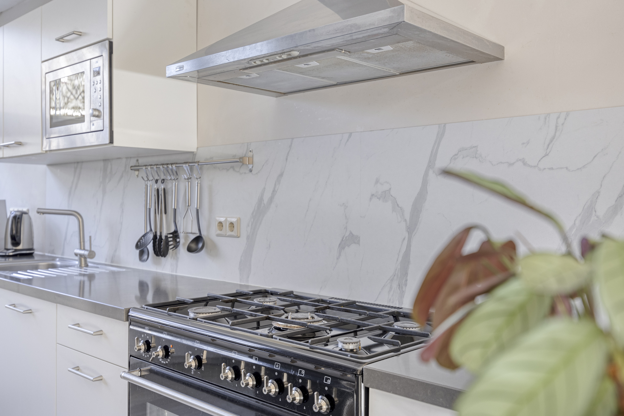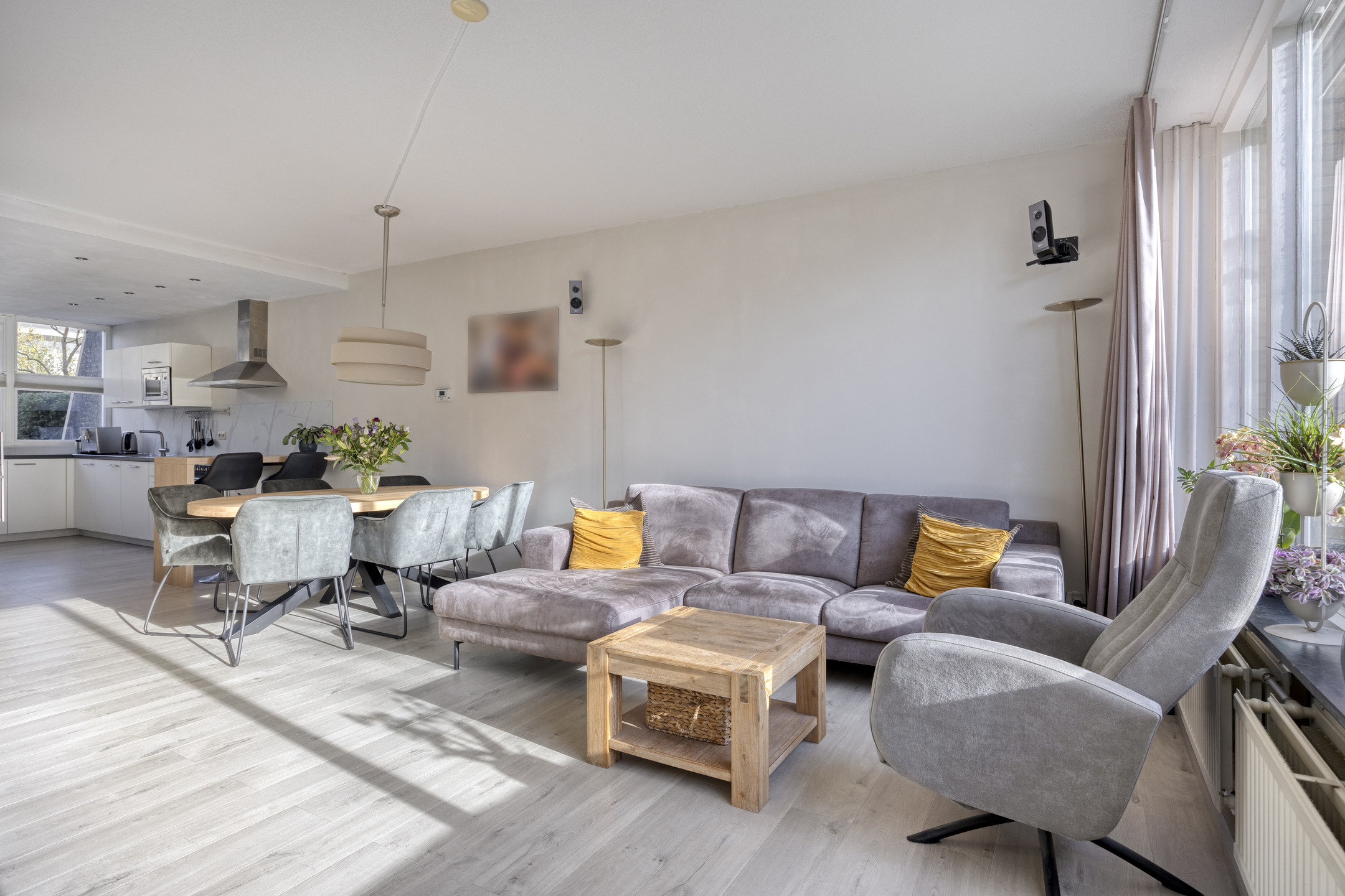 De ruime hal met garderobe, meterkast, toilet en trapopgang leidt naar de lichte woonkamer met nette laminaatvloer en openslaande deur naar de zonnige achtertuin. De open L-vormige keuken (2019) met inbouwapparatuur en gezellige eetbar vormt het hart van het huis – ideaal voor samen koken, huiswerk maken of borrelen met vrienden.