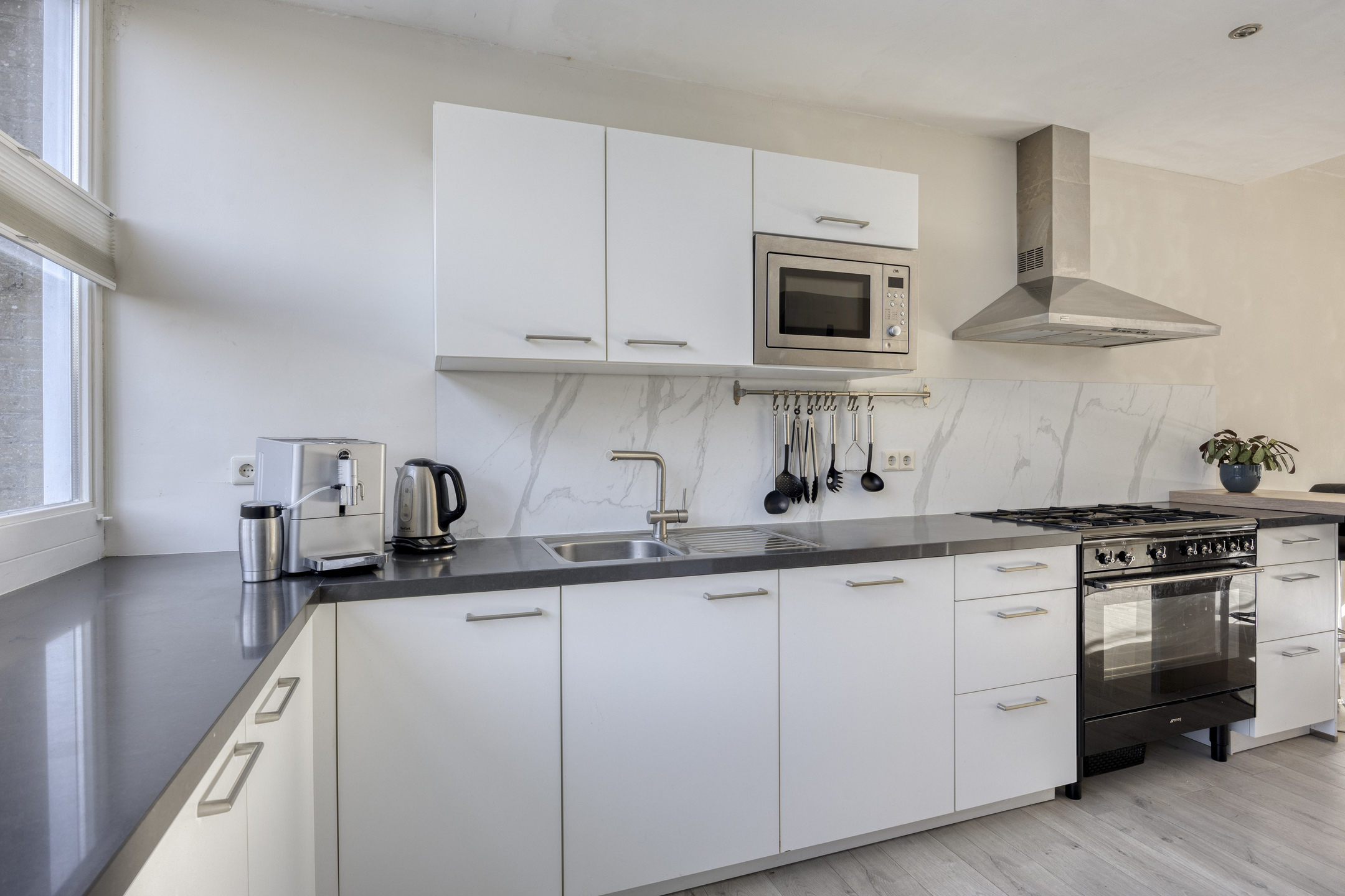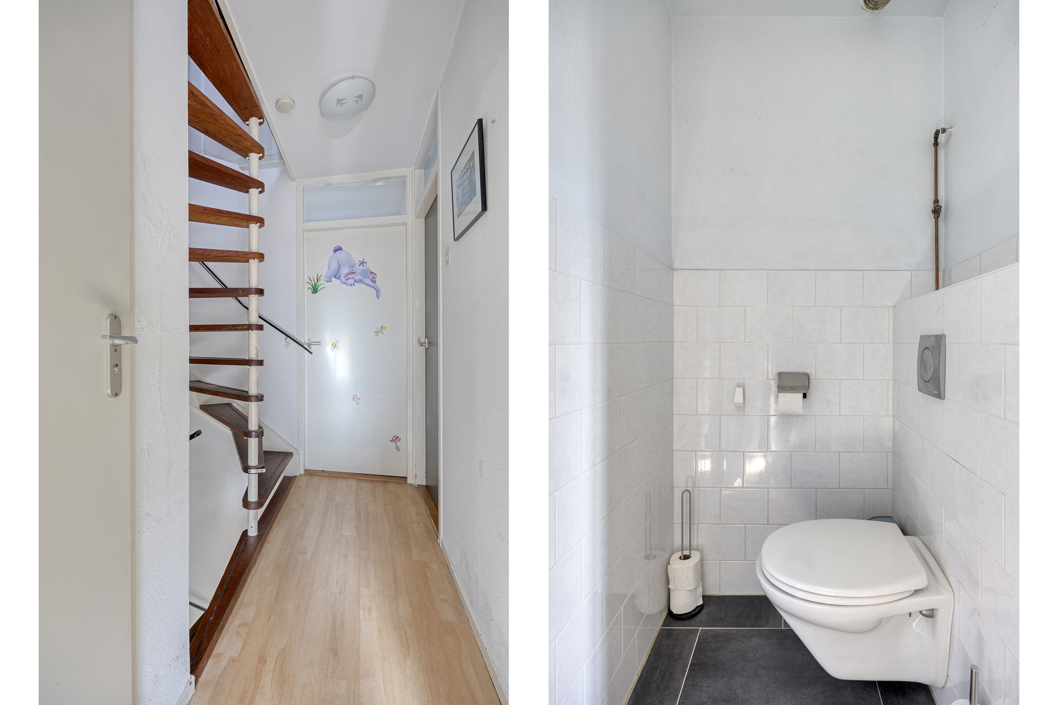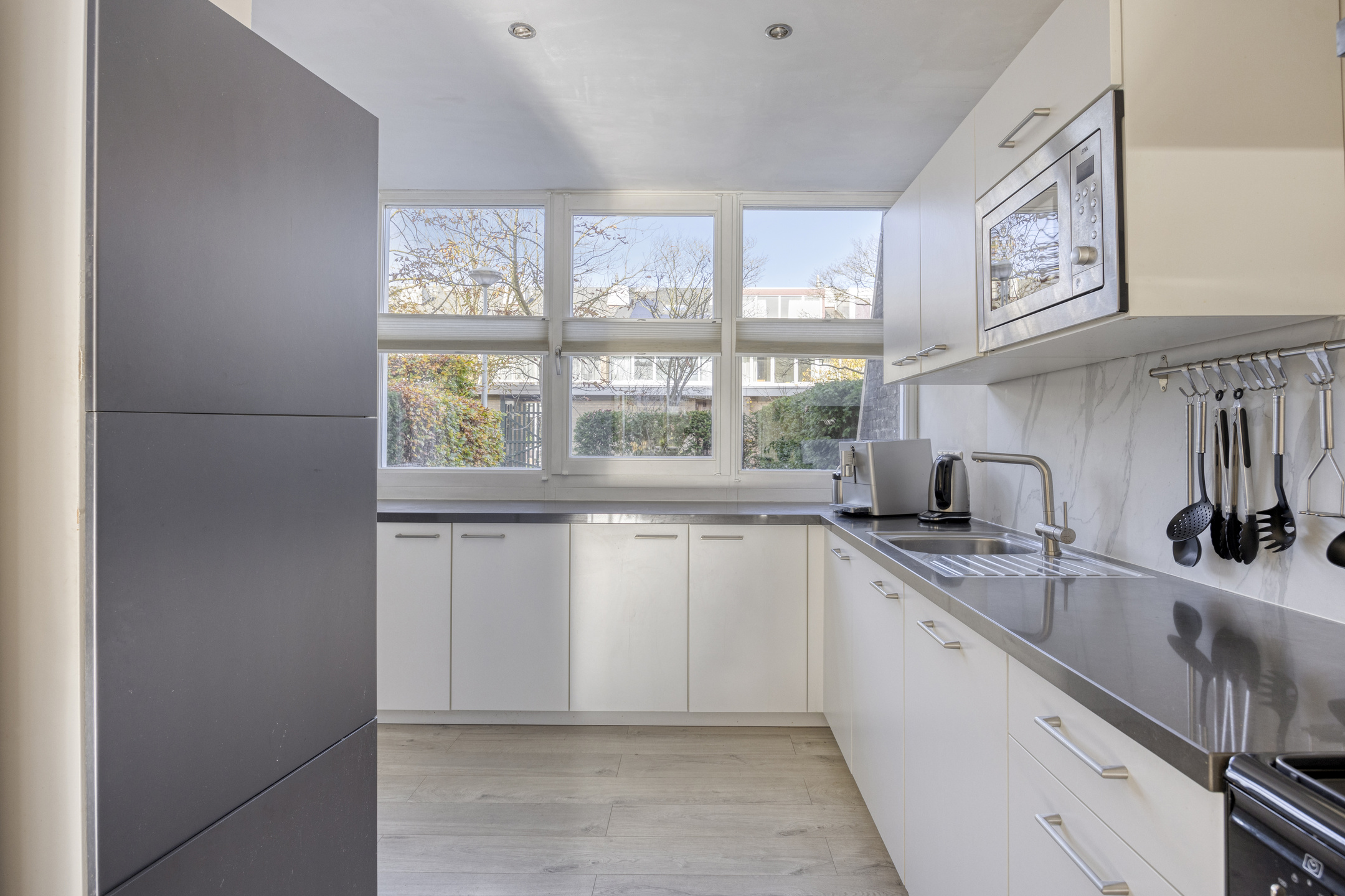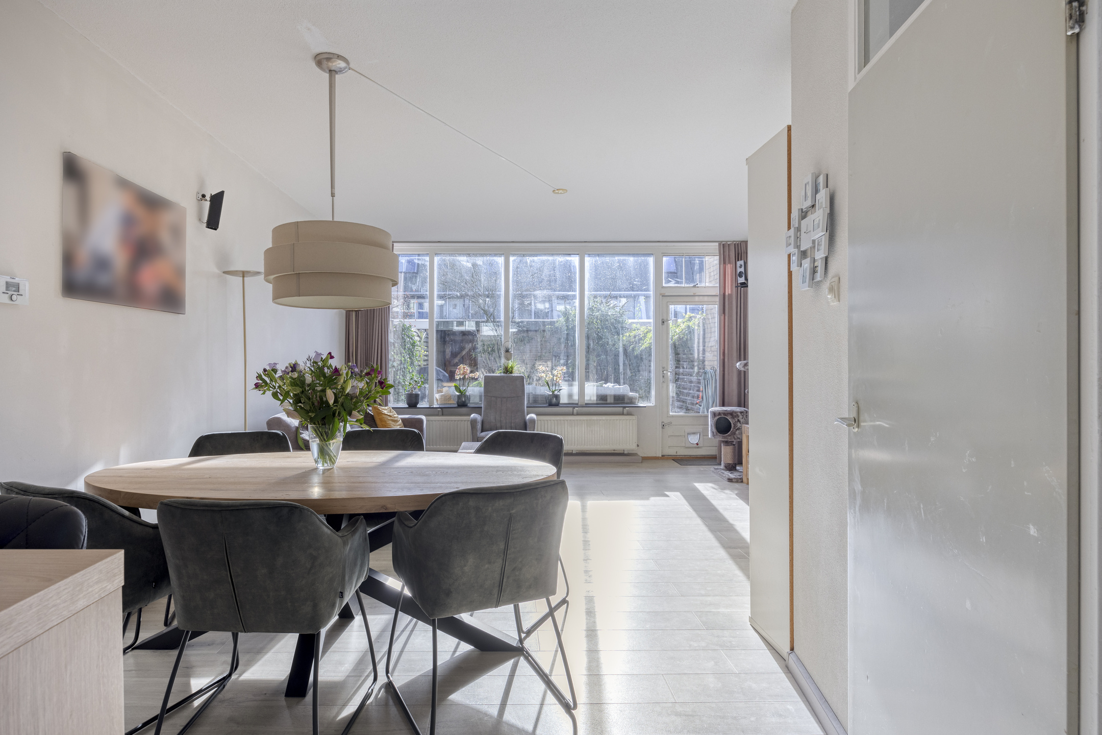De ruime hal met garderobe, meterkast, toilet en trapopgang leidt naar de lichte woonkamer met nette laminaatvloer en openslaande deur naar de zonnige achtertuin. De open L-vormige keuken (2019) met inbouwapparatuur en gezellige eetbar vormt het hart van het huis – ideaal voor samen koken, huiswerk maken of borrelen met vrienden.