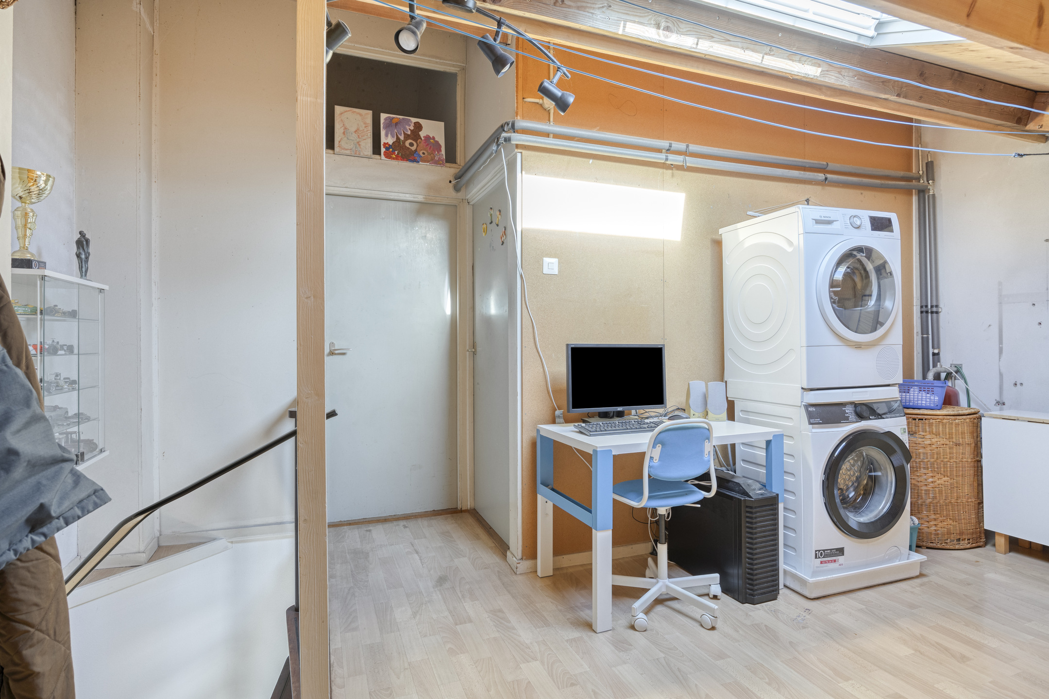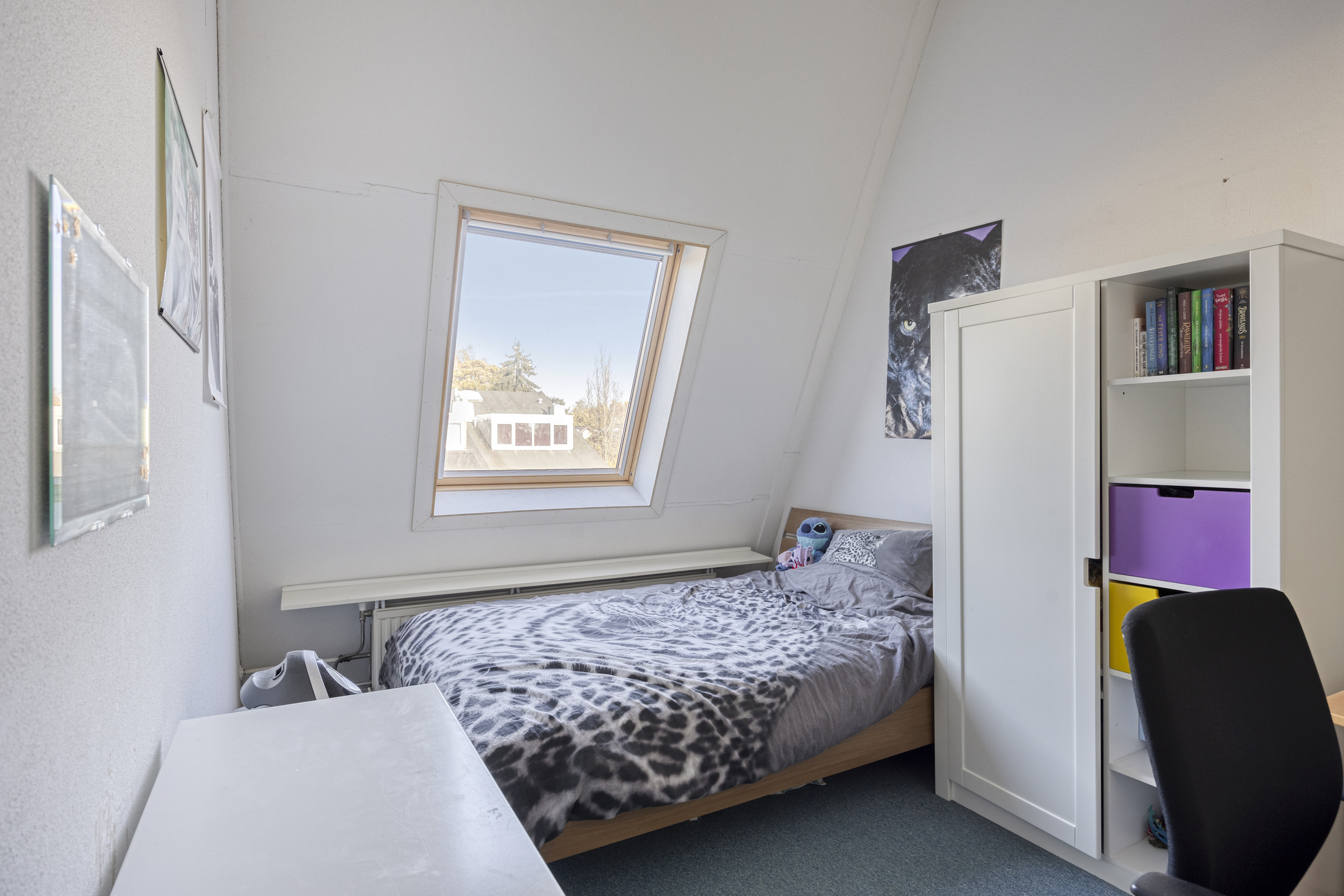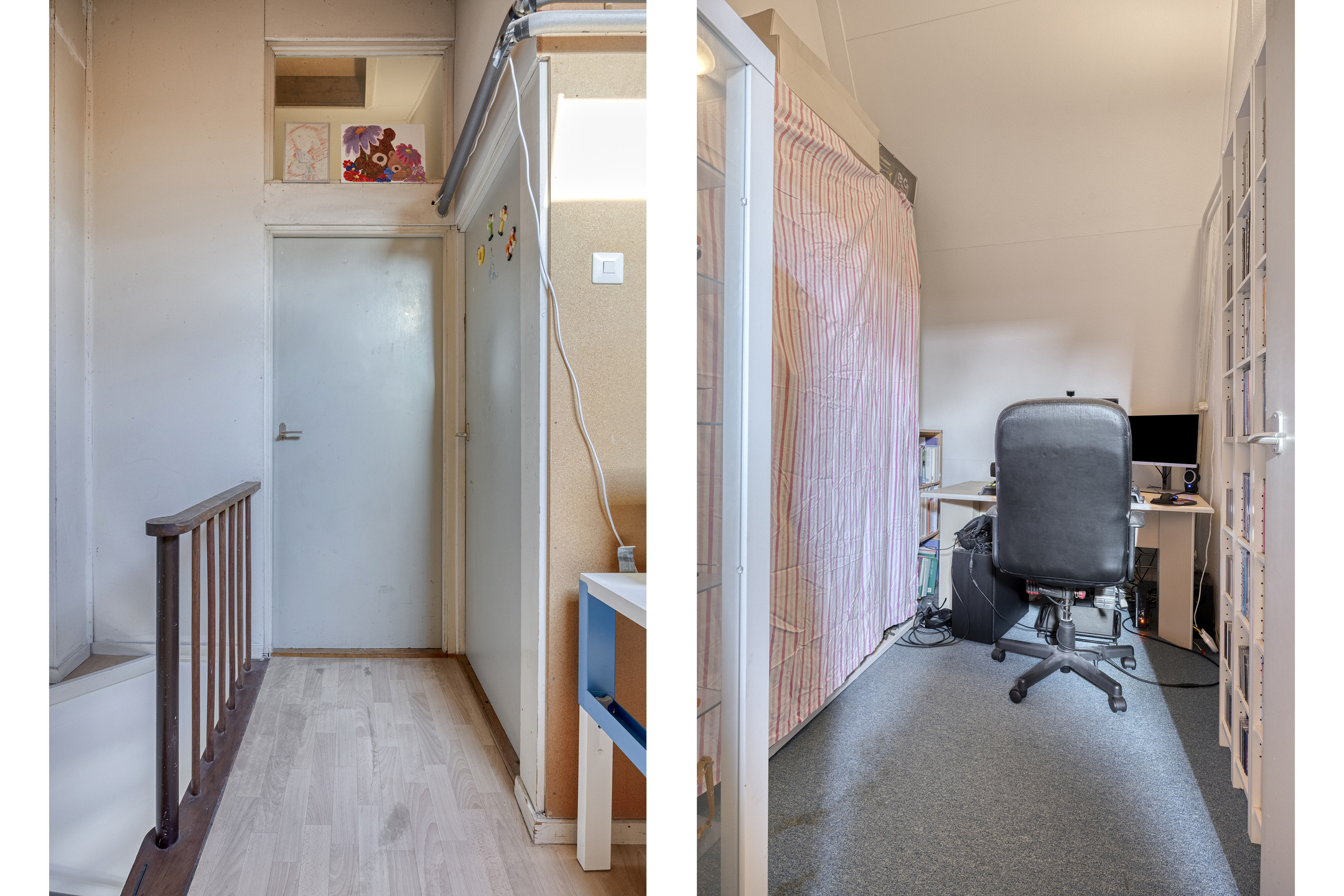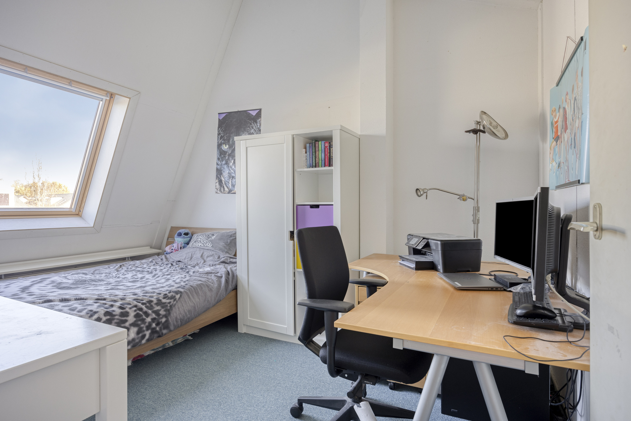 Via een vaste trap bereik je de voorzolder met dakraam, wasruimte, cv-installatie en bergruimte achter de knieschotten. Hier vind je een ruime slaapkamer met groot dakraam, plus een extra kamer die nu als kantoor wordt gebruikt.
