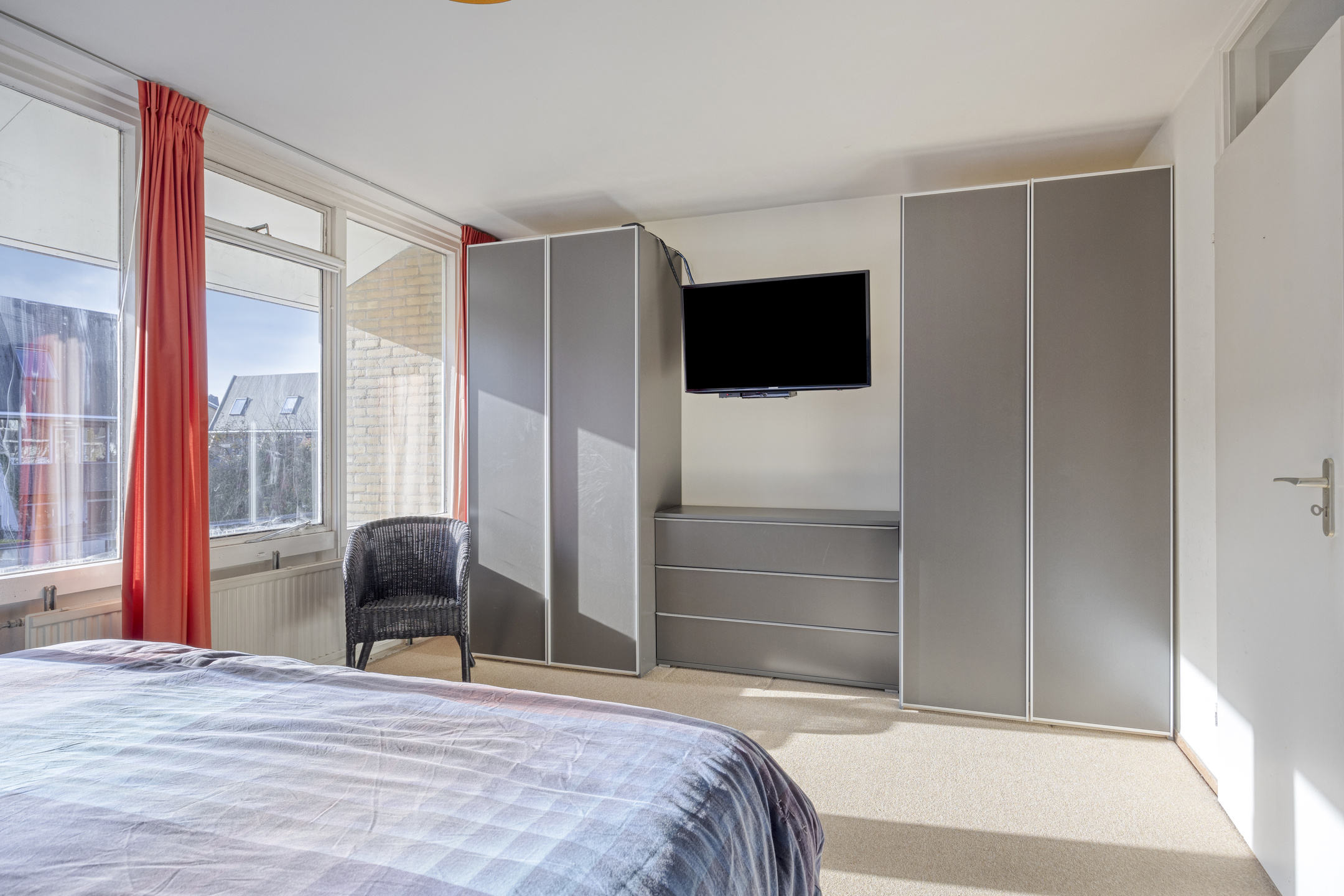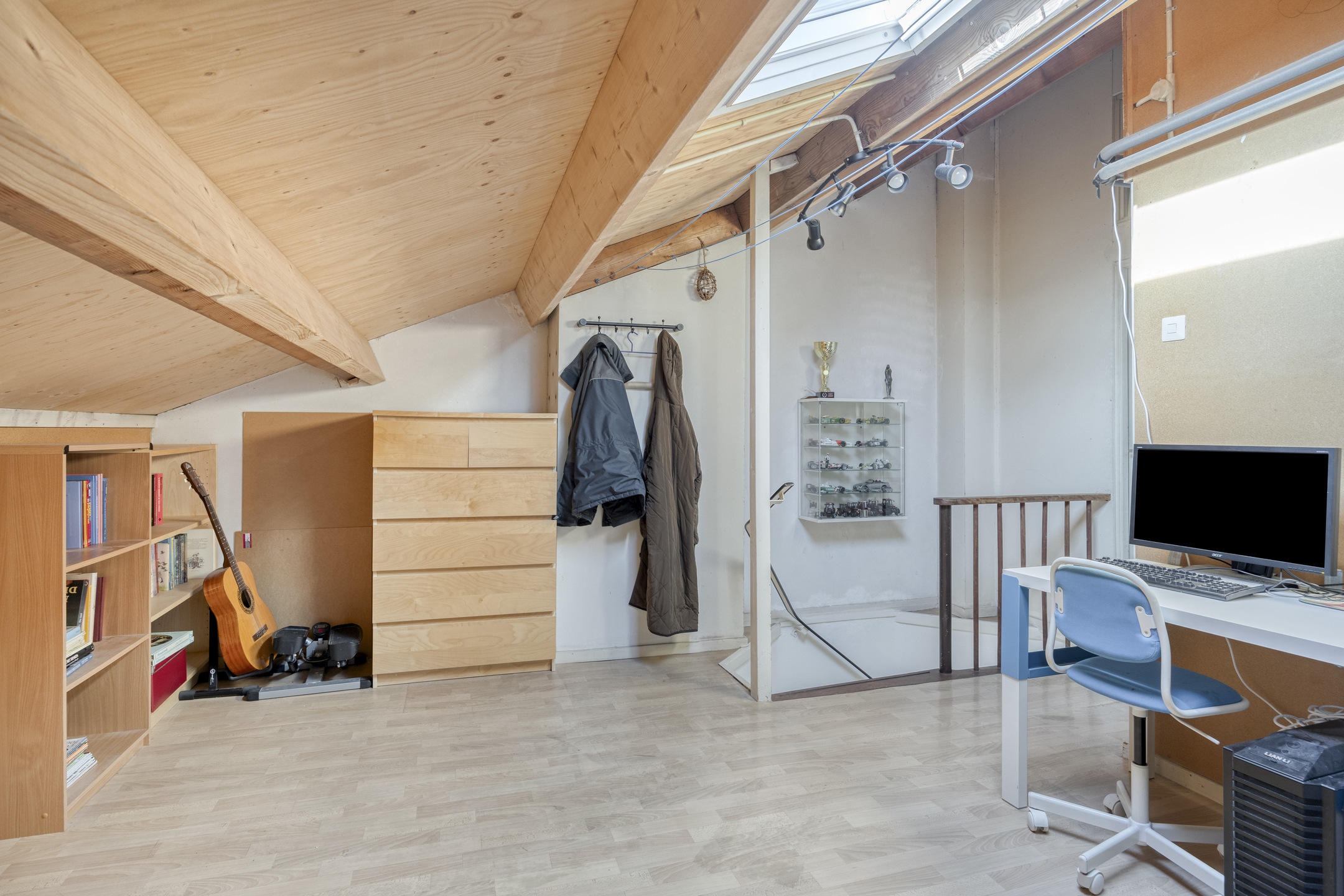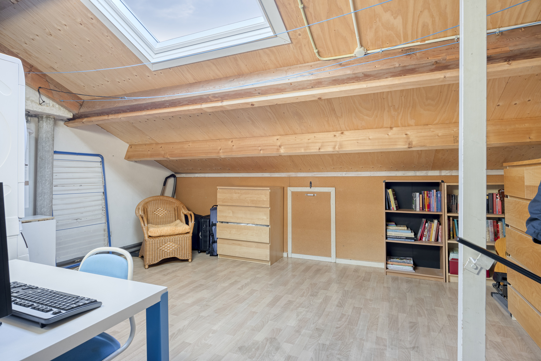 Via een vaste trap bereik je de voorzolder met dakraam, wasruimte, cv-installatie en bergruimte achter de knieschotten. Hier vind je een ruime slaapkamer met groot dakraam, plus een extra kamer die nu als kantoor wordt gebruikt.