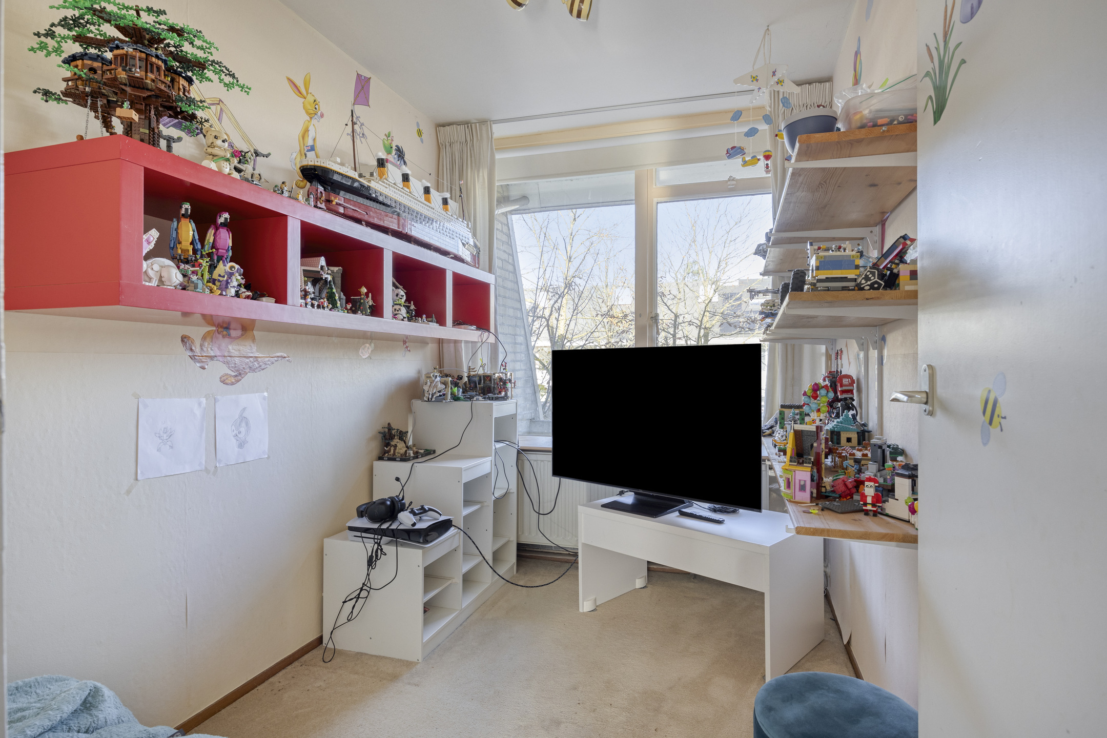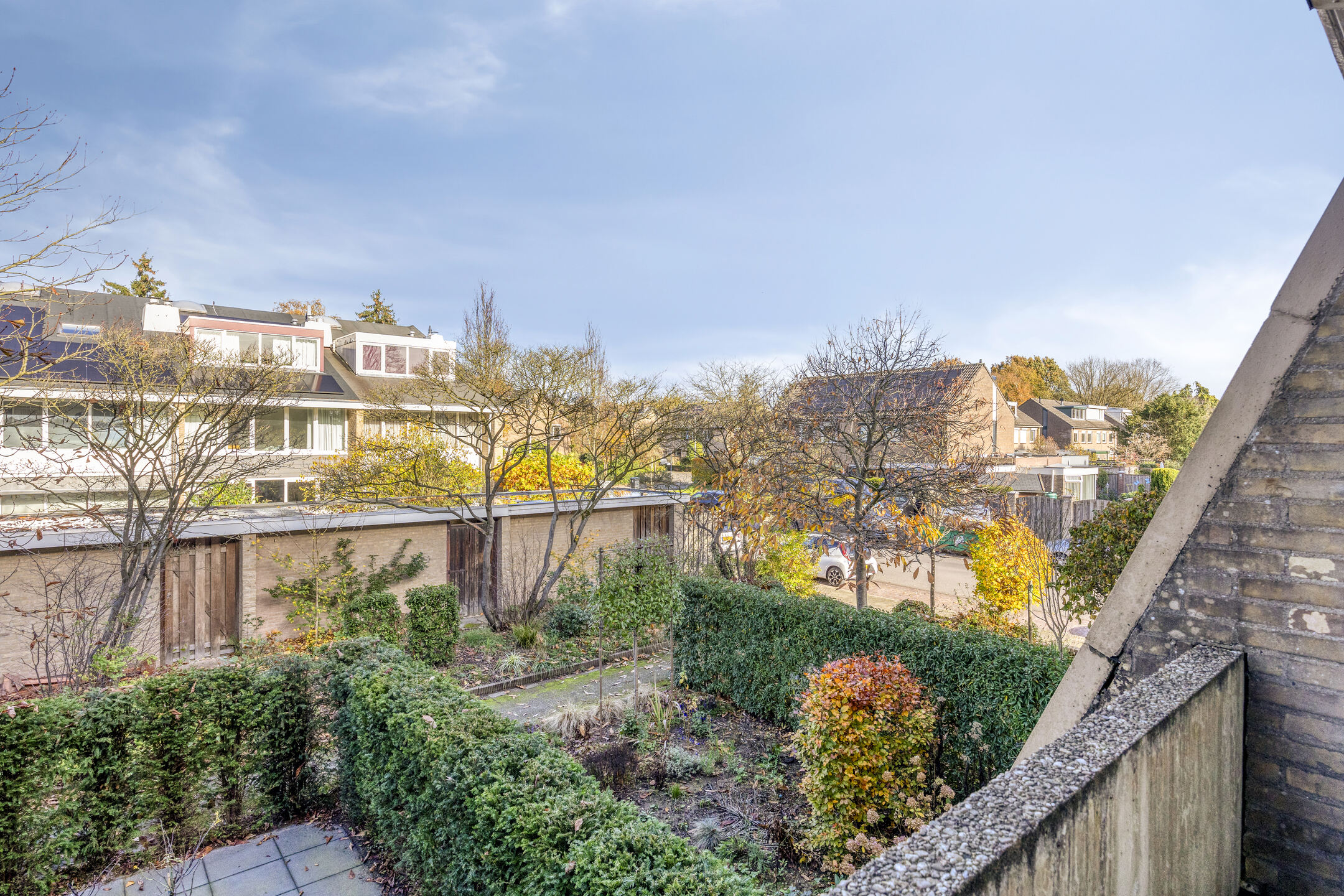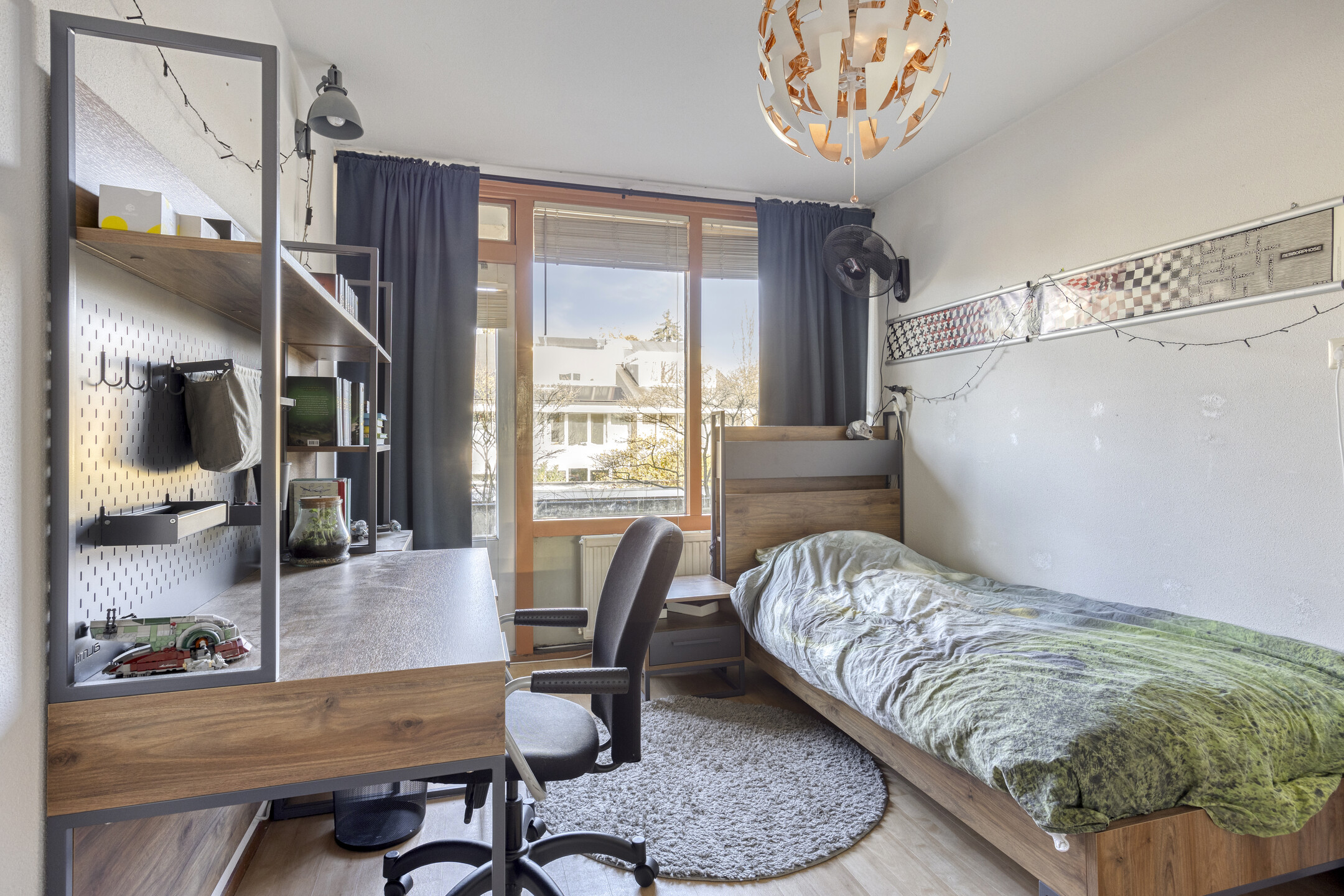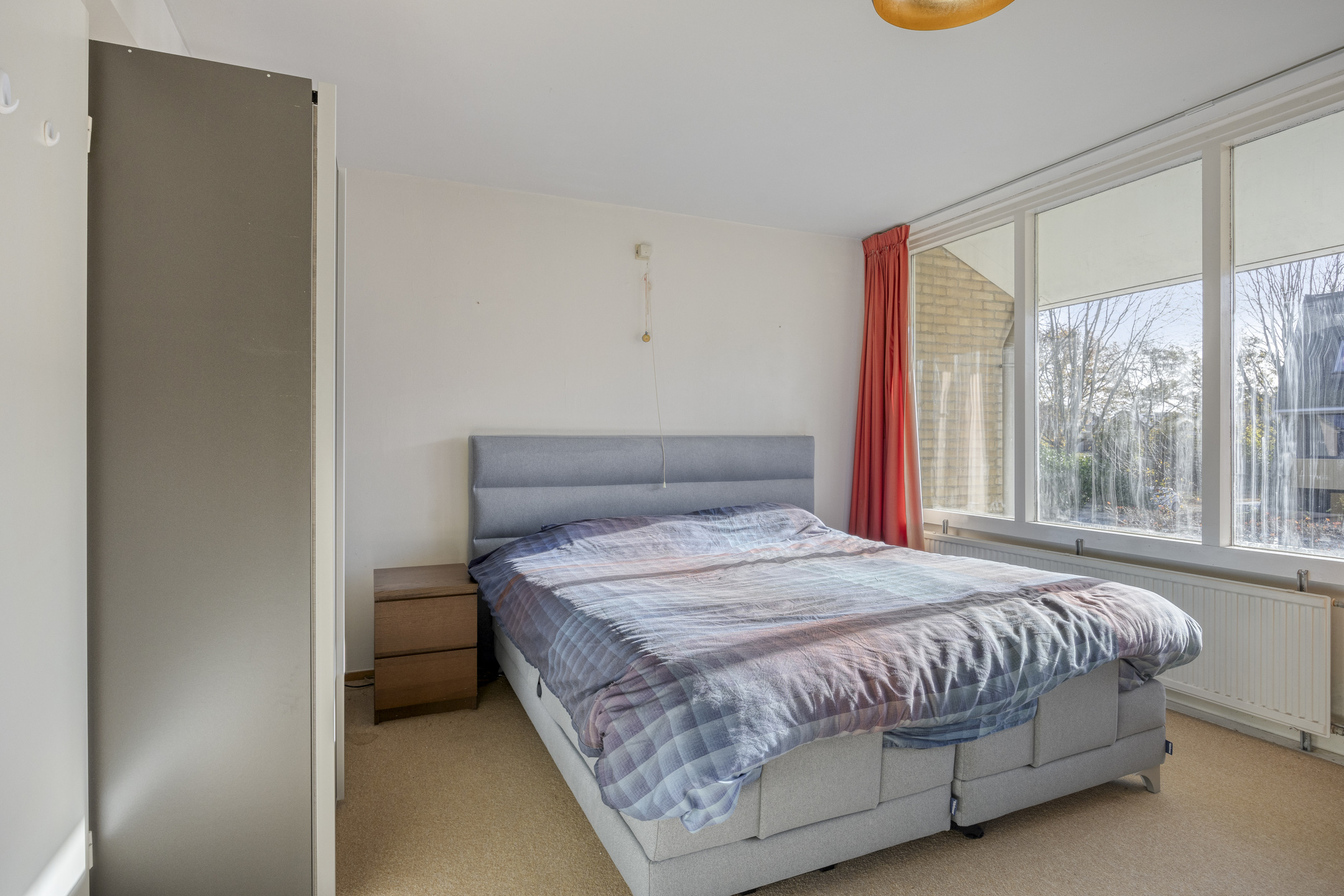 Via een vaste trap bereik je de voorzolder met dakraam, wasruimte, cv-installatie en bergruimte achter de knieschotten. Hier vind je een ruime slaapkamer met groot dakraam, plus een extra kamer die nu als kantoor wordt gebruikt.