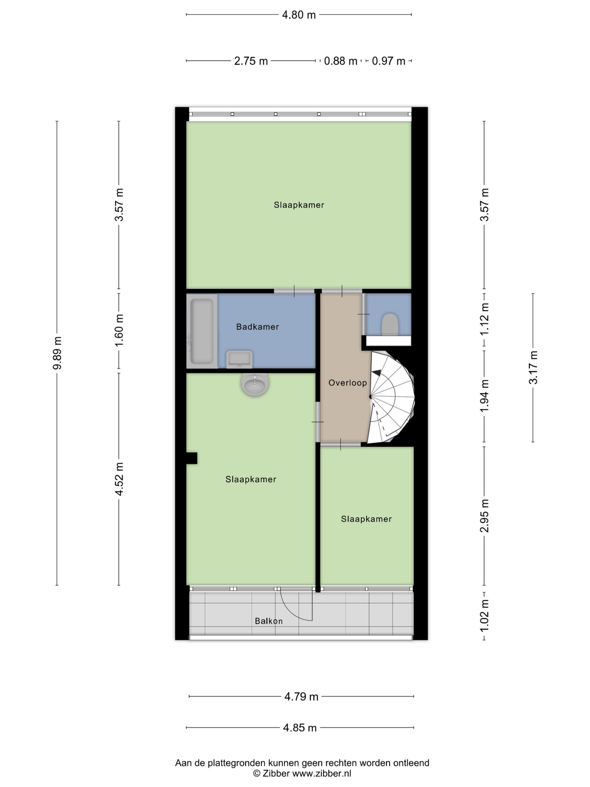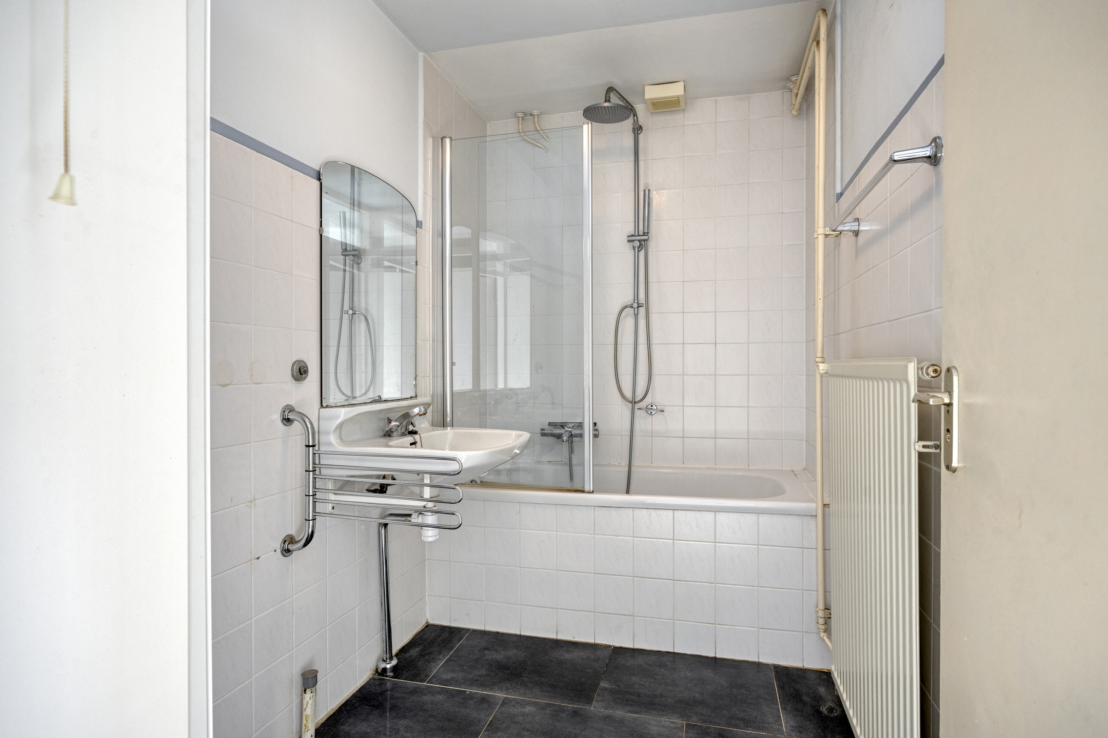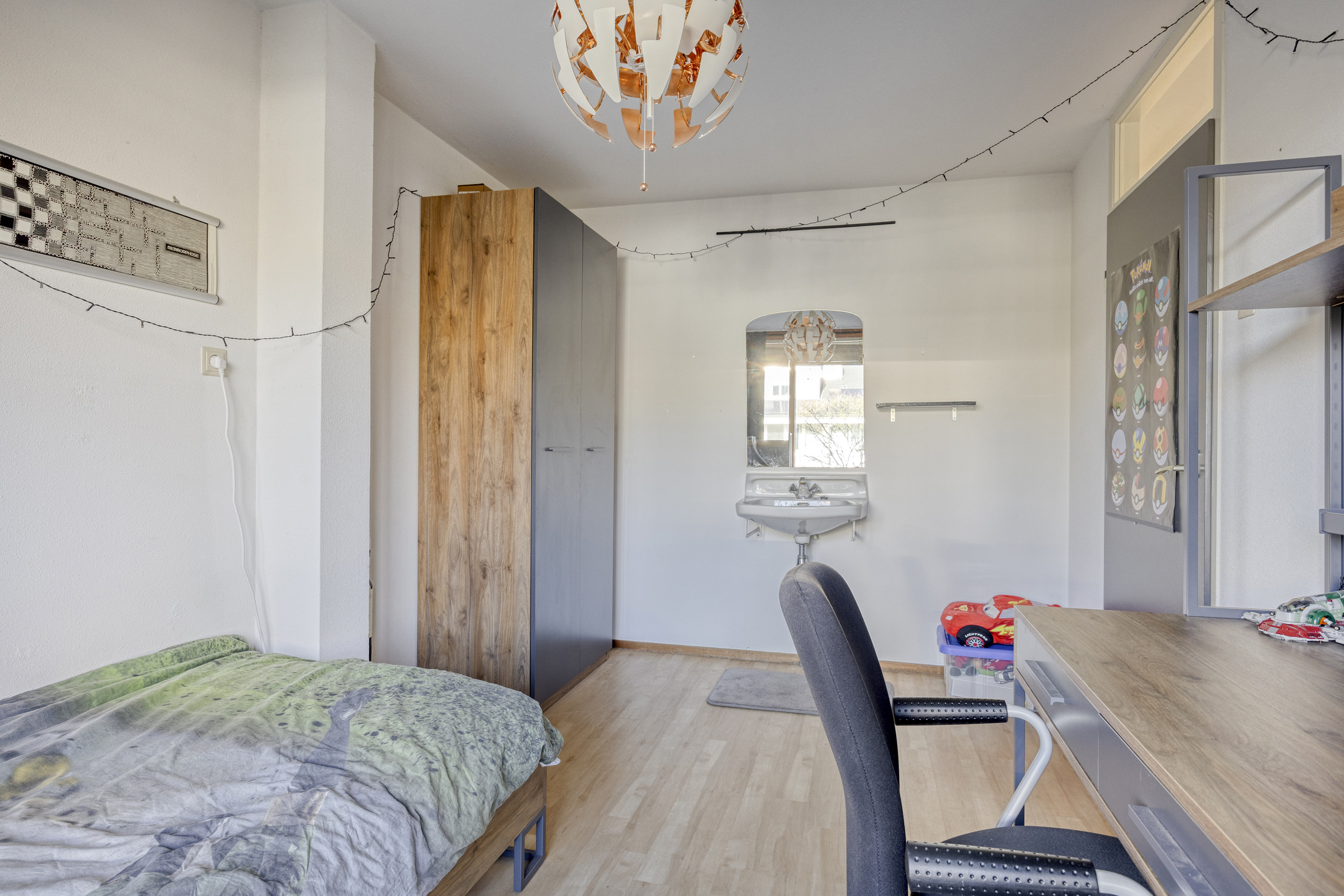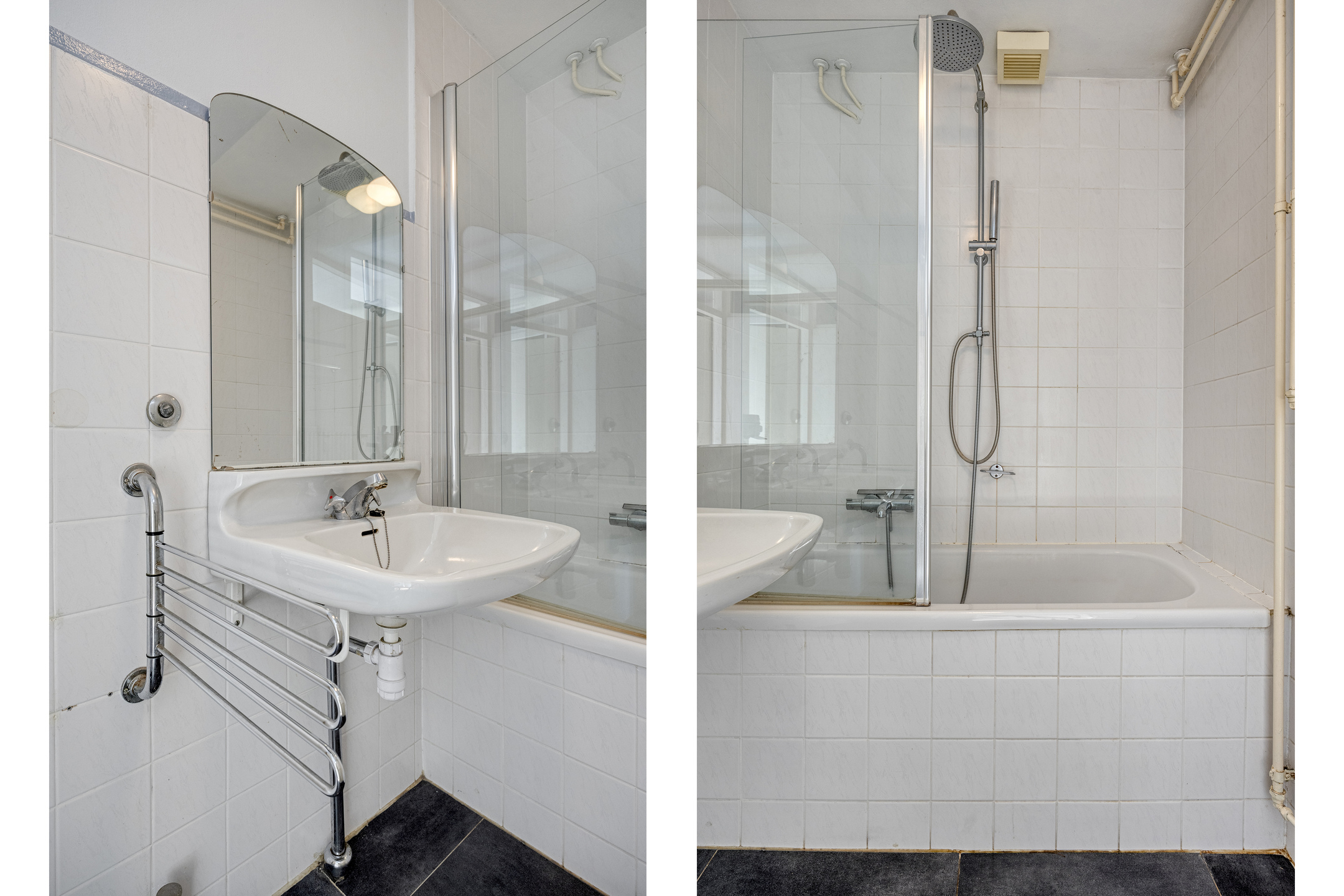 De overloop geeft toegang tot een vernieuwd toilet en een nette, maar gedateerde badkamer met bad en wastafel. De ouderslaapkamer beslaat de volledige breedte van de woning en heeft directe toegang tot de badkamer. De twee slaapkamers aan de voorzijde zijn licht en praktisch ingedeeld; één heeft een vaste wastafel en een deur naar het balkon.