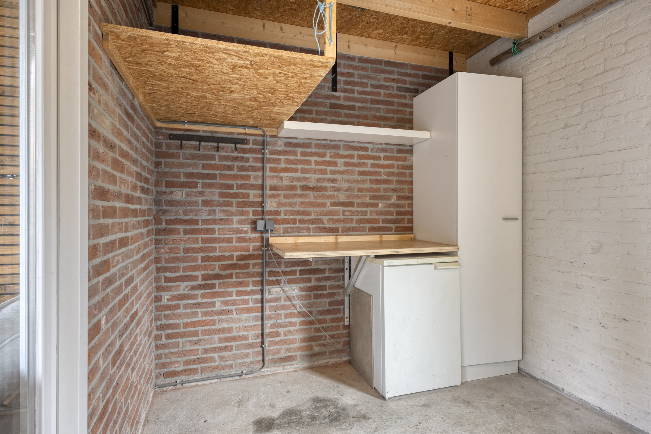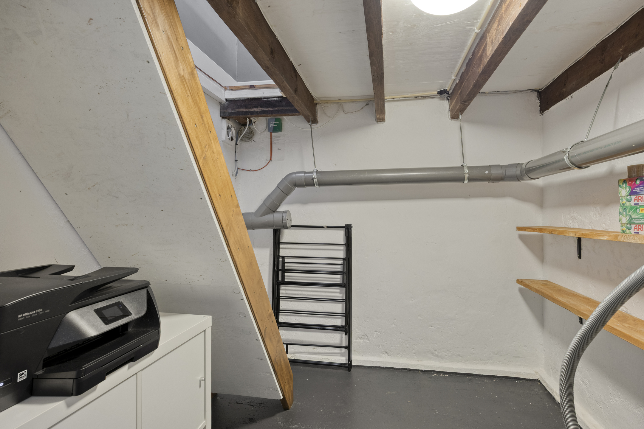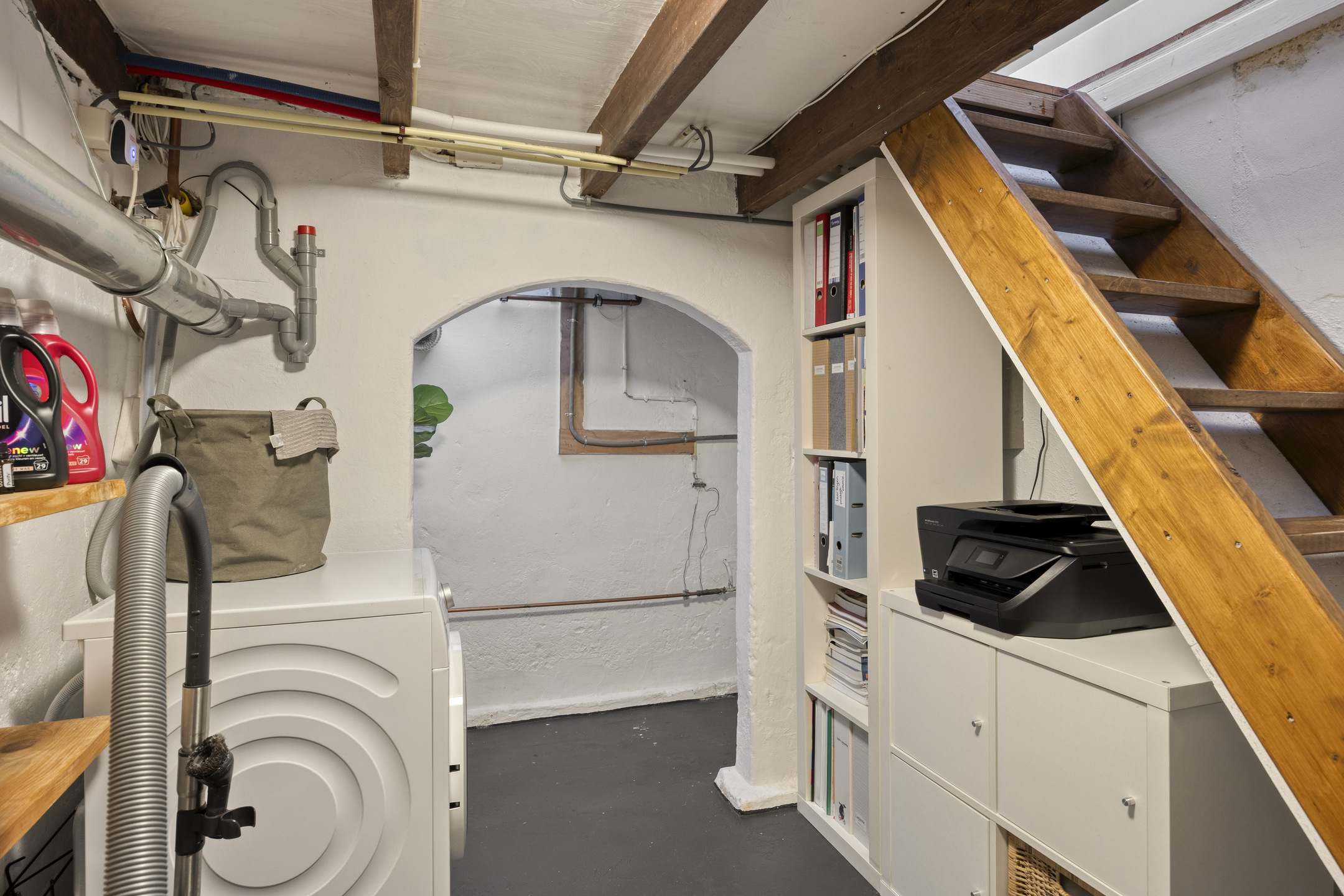 Op ingenieuze wijze is er een nieuwe toegang gemaakt naar de kelder waardoor deze gemakkelijk te bereiken en te gebruiken is. Vandaar dat hier nu de wasmachine- en drogeropstelling staan en opbergruimte is. Waar het oude luik zat is nu een mooie doorkijk gemaakt.