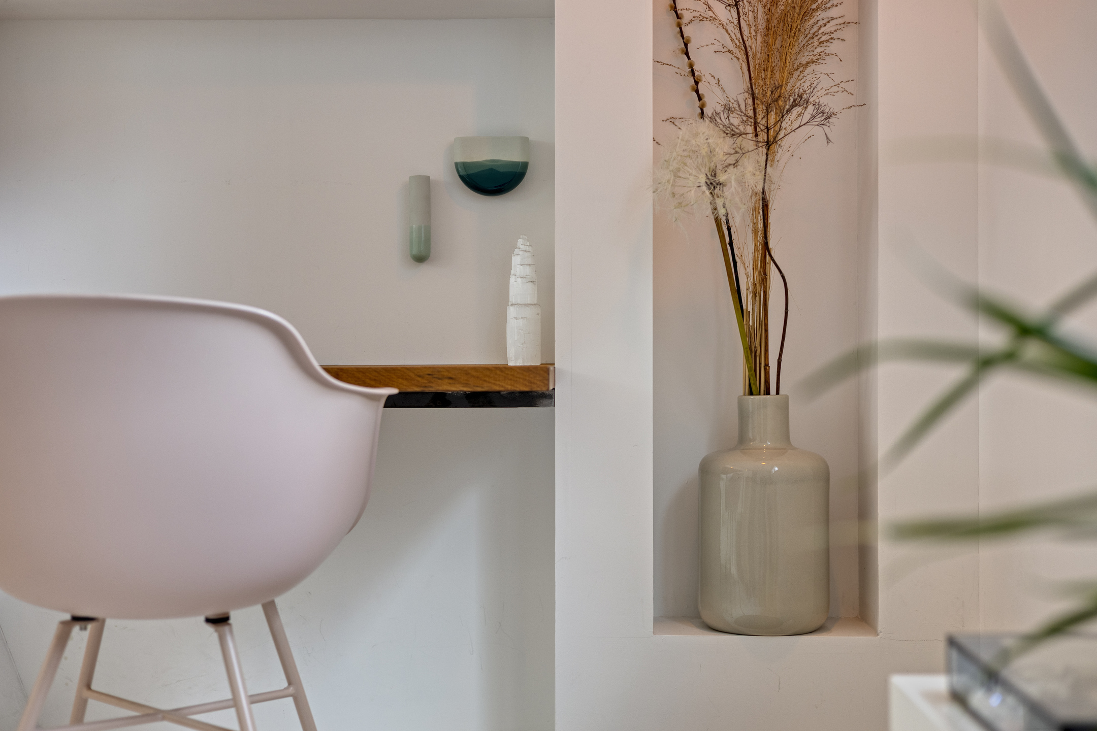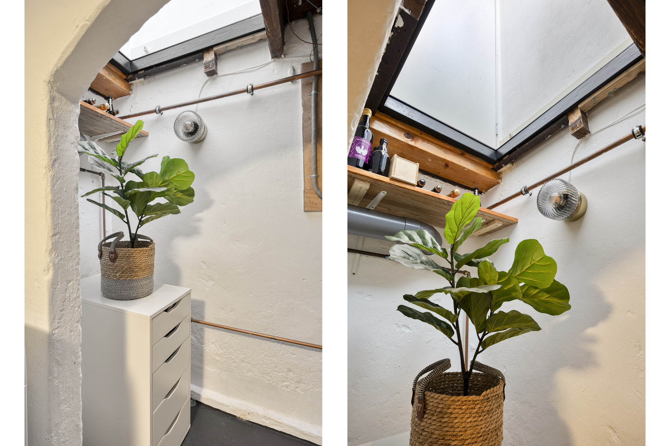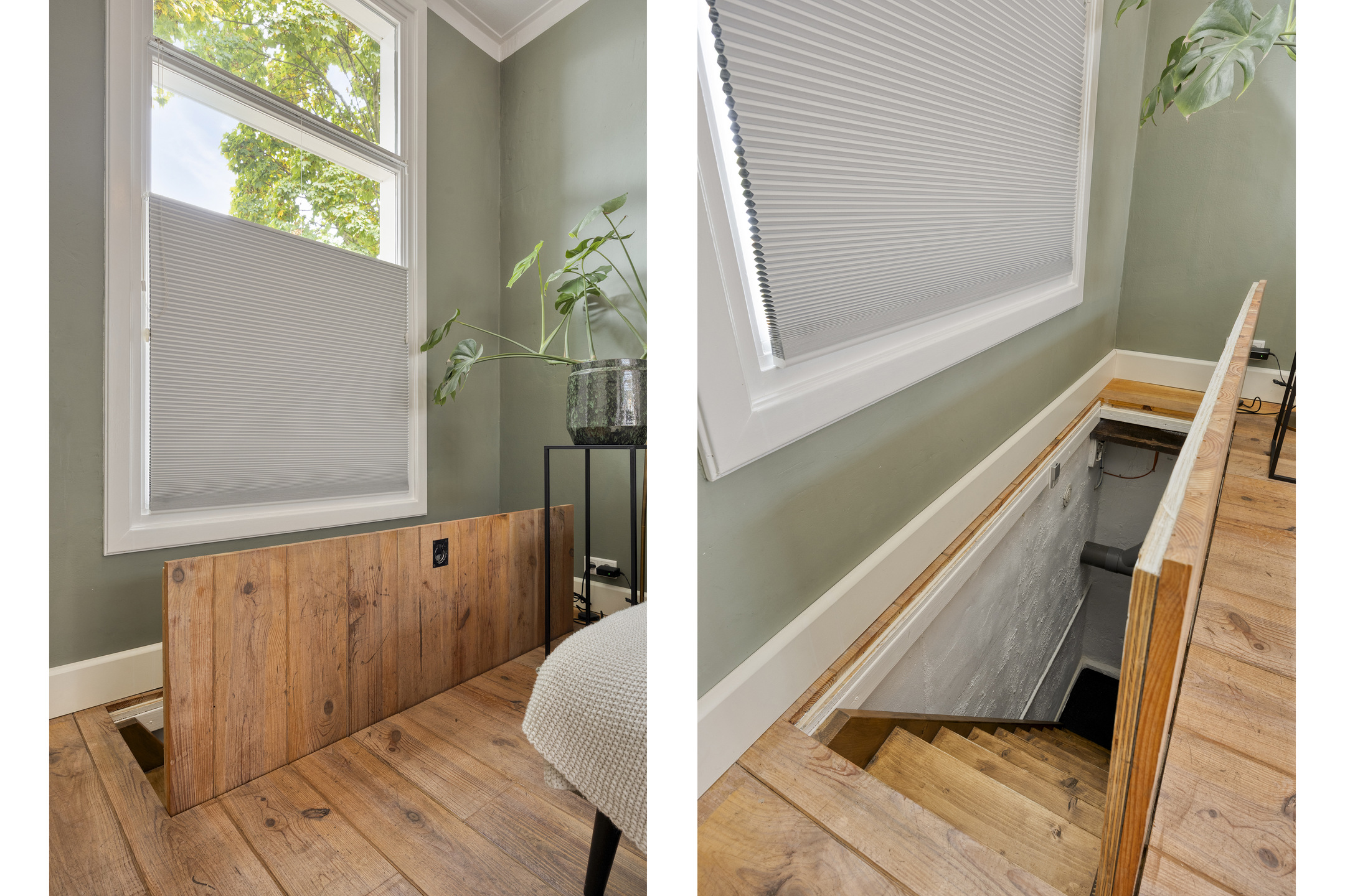 Op ingenieuze wijze is er een nieuwe toegang gemaakt naar de kelder waardoor deze gemakkelijk te bereiken en te gebruiken is. Vandaar dat hier nu de wasmachine- en drogeropstelling staan en opbergruimte is. Waar het oude luik zat is nu een mooie doorkijk gemaakt.