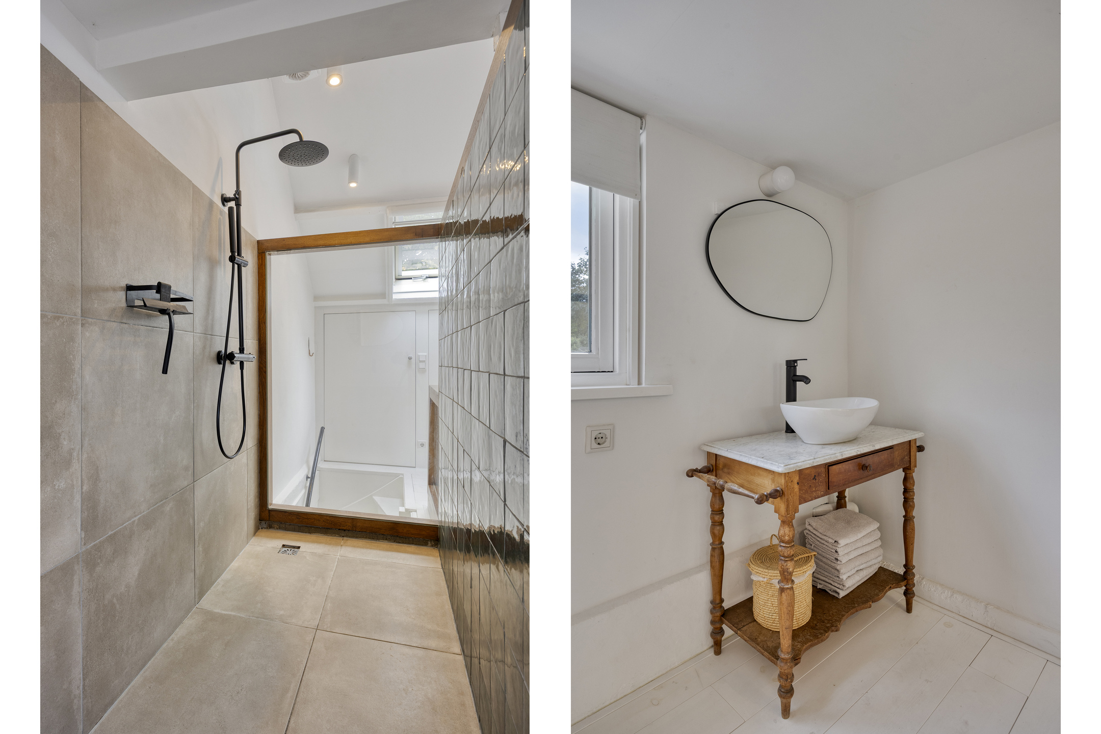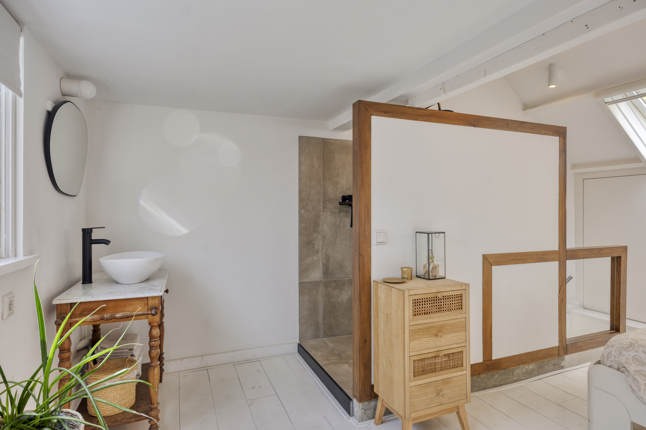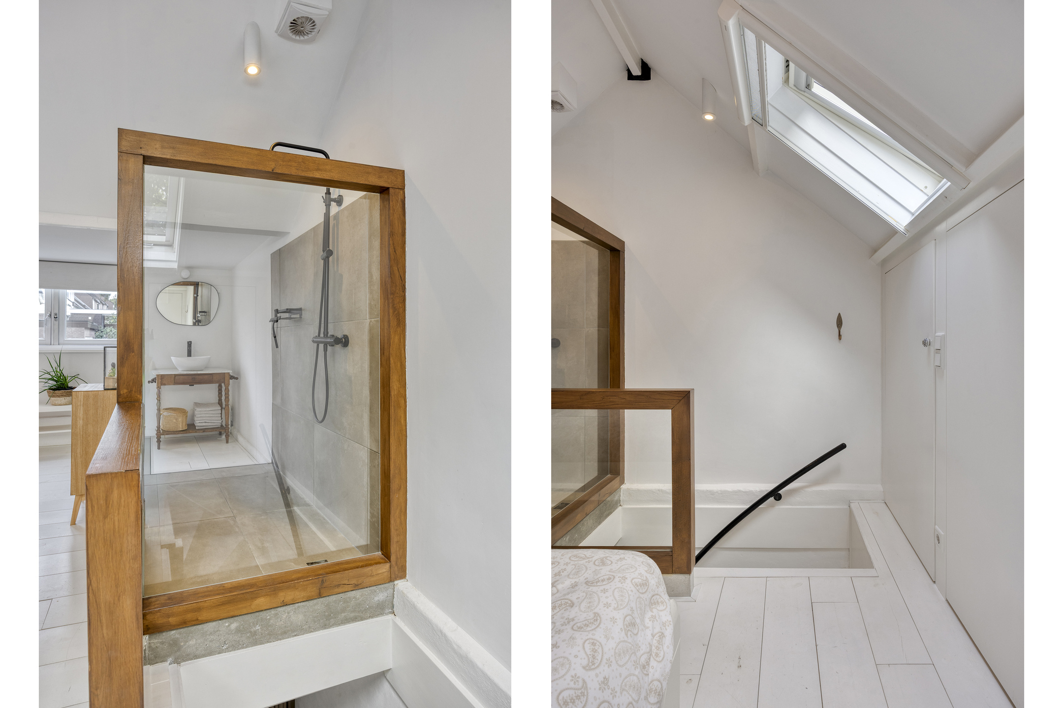 De dakkapel (1,91 hoog) geeft een mooi uitzicht over de tuin en de wijk en geeft toegang naar de open badkamer (2020) met wastafel en douche.