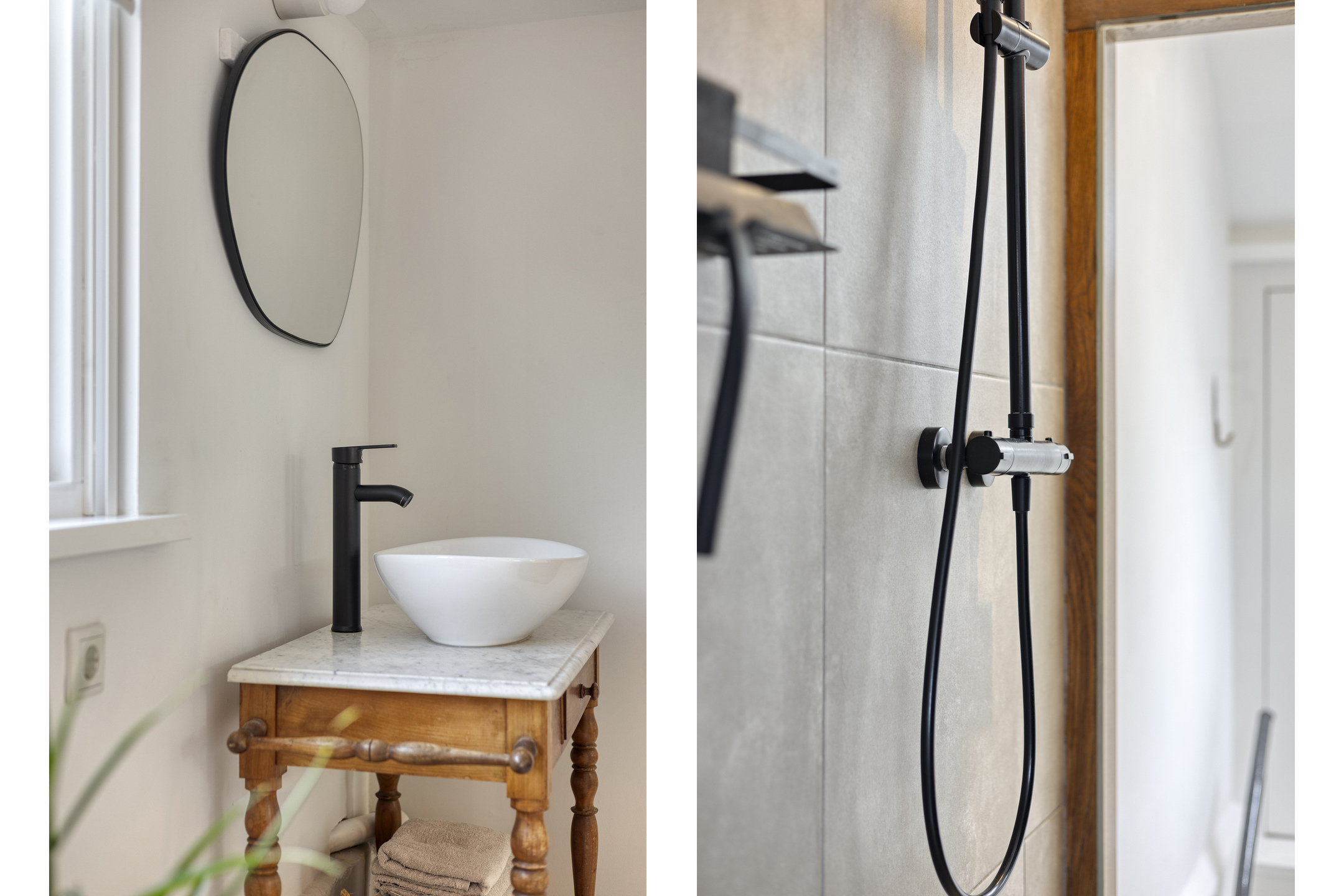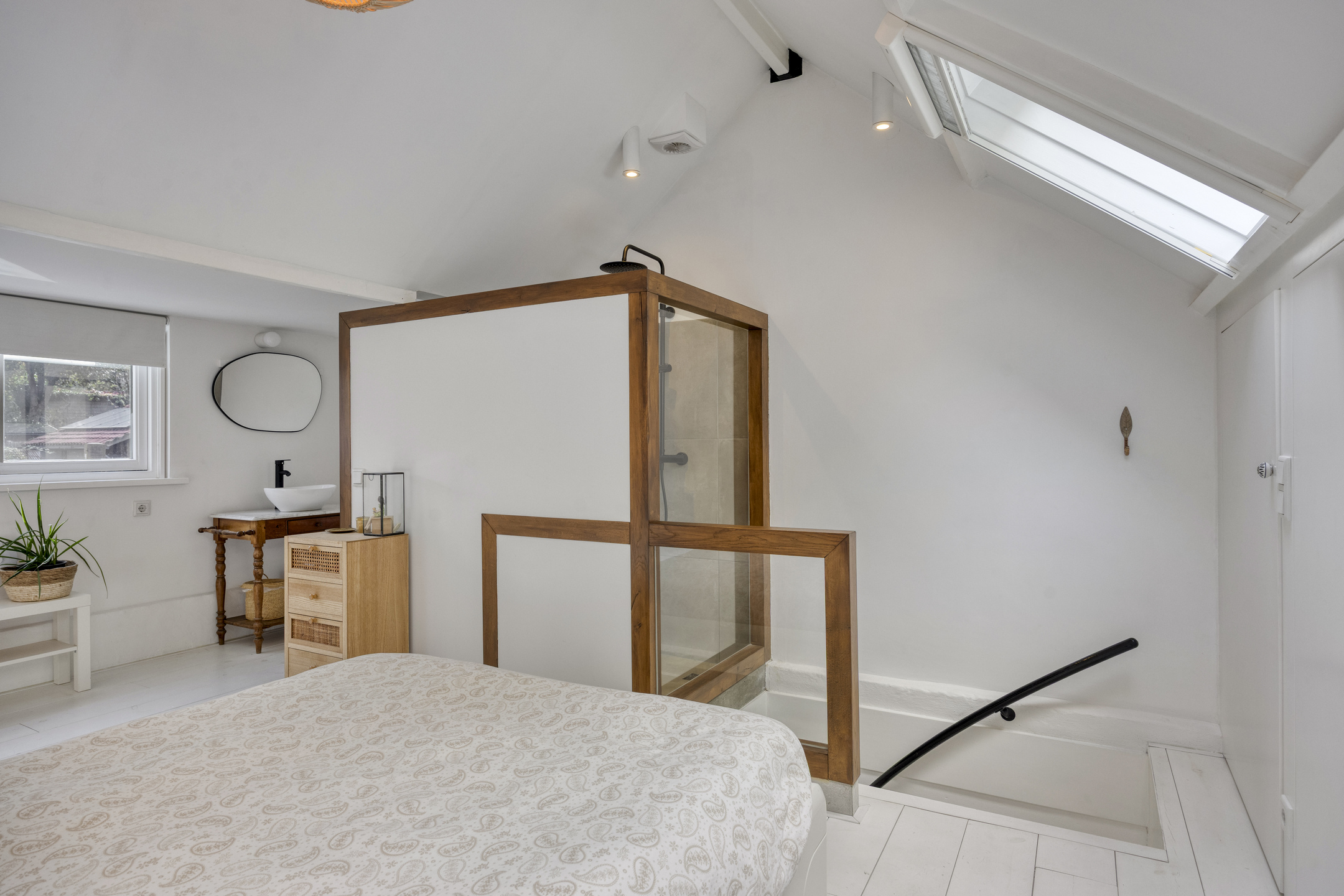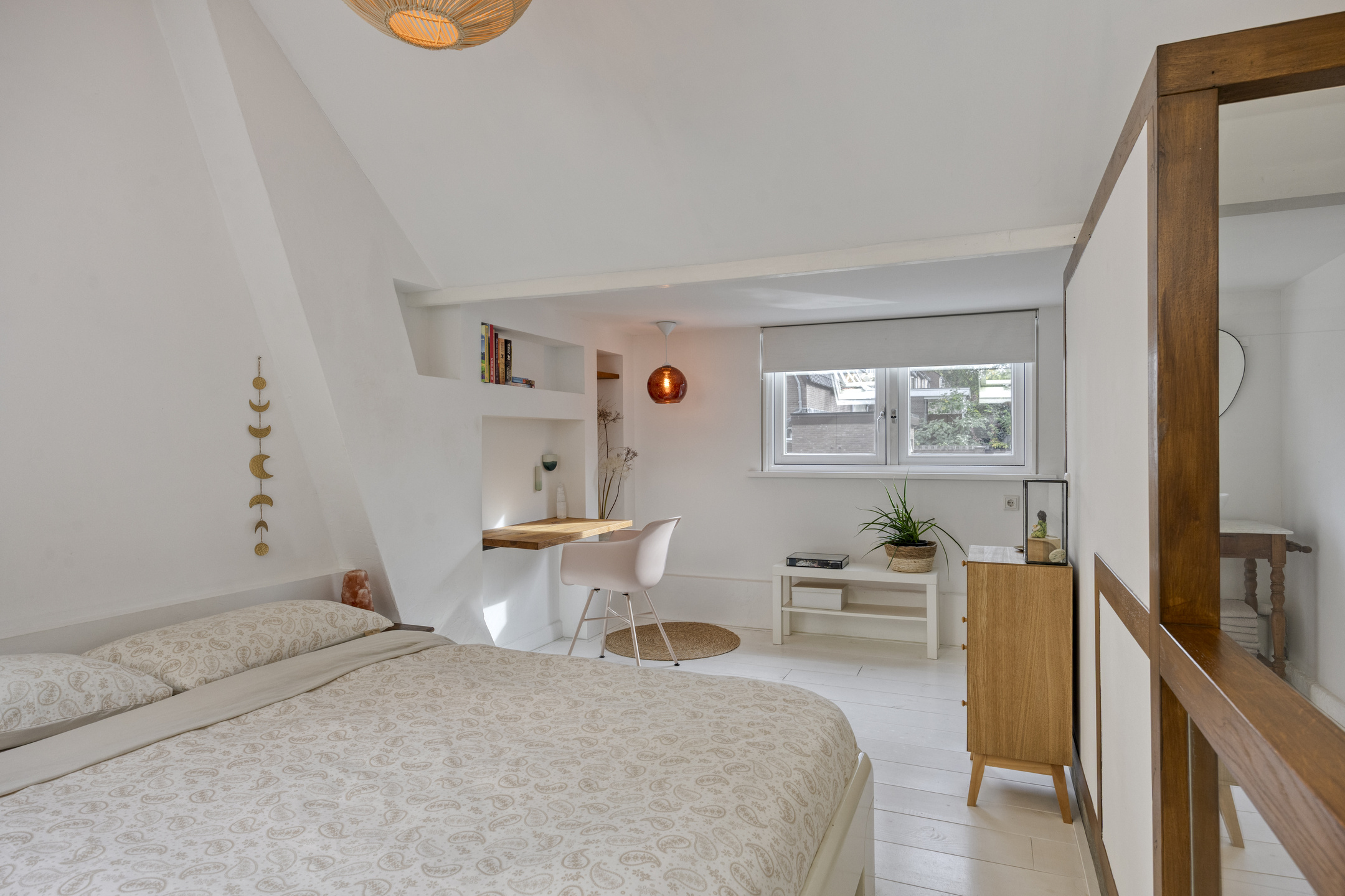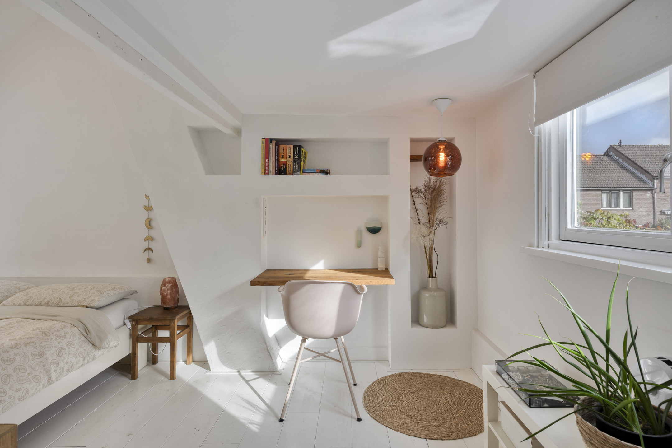 De dakkapel (1,91 hoog) geeft een mooi uitzicht over de tuin en de wijk en geeft toegang naar de open badkamer (2020) met wastafel en douche.