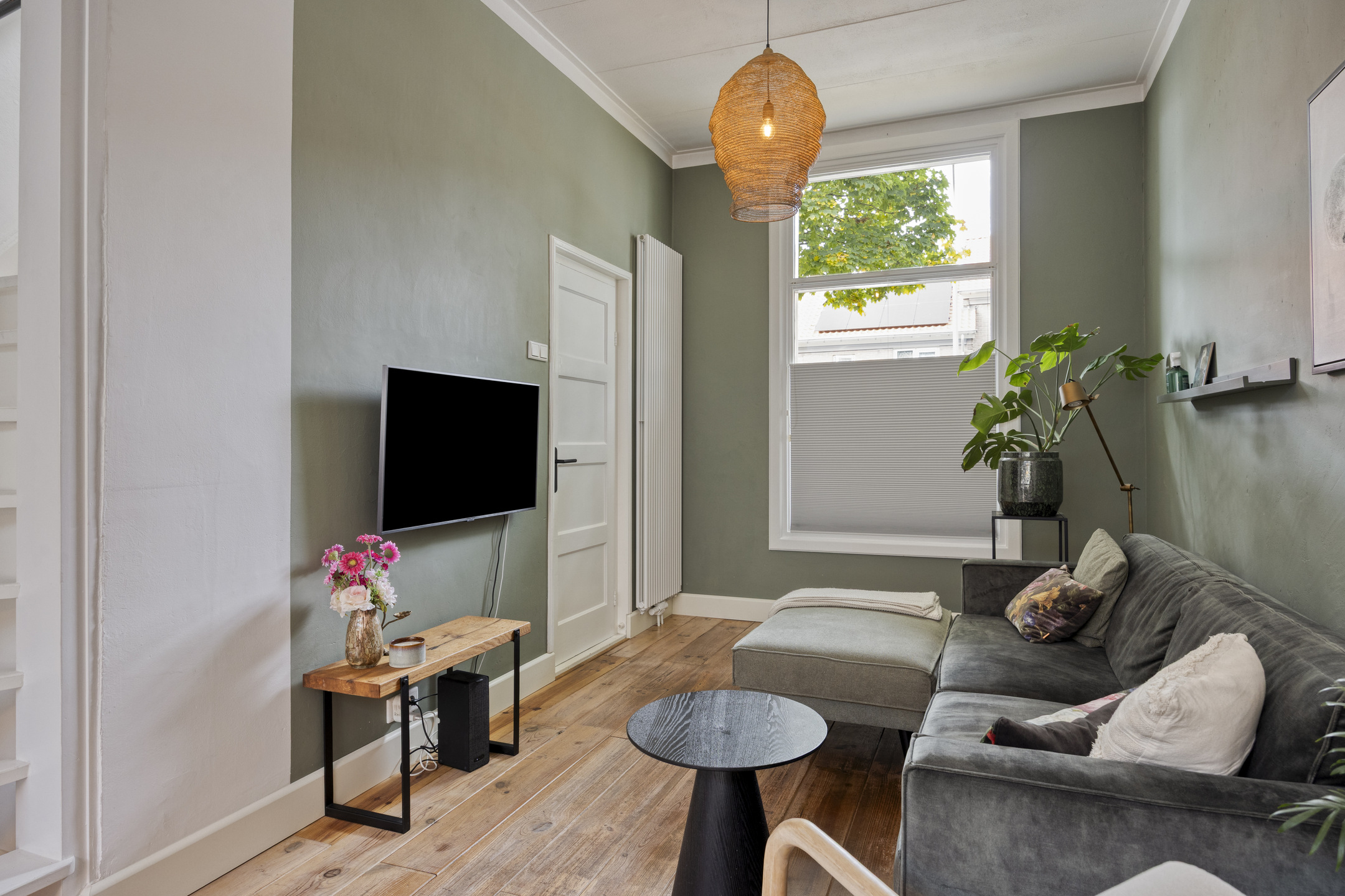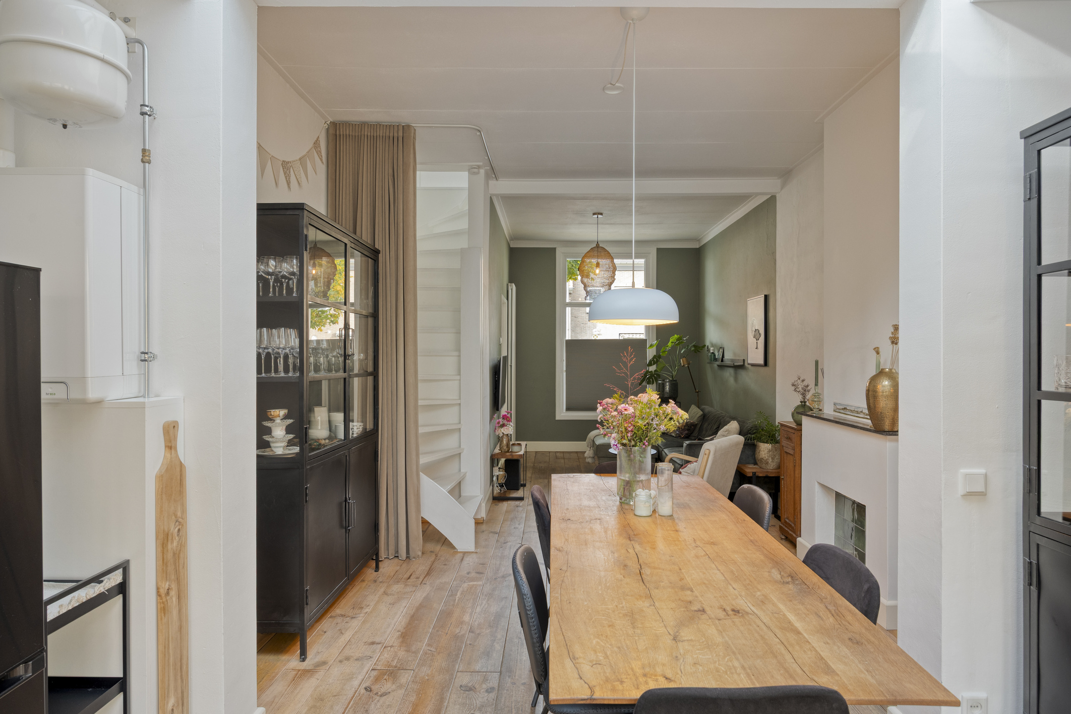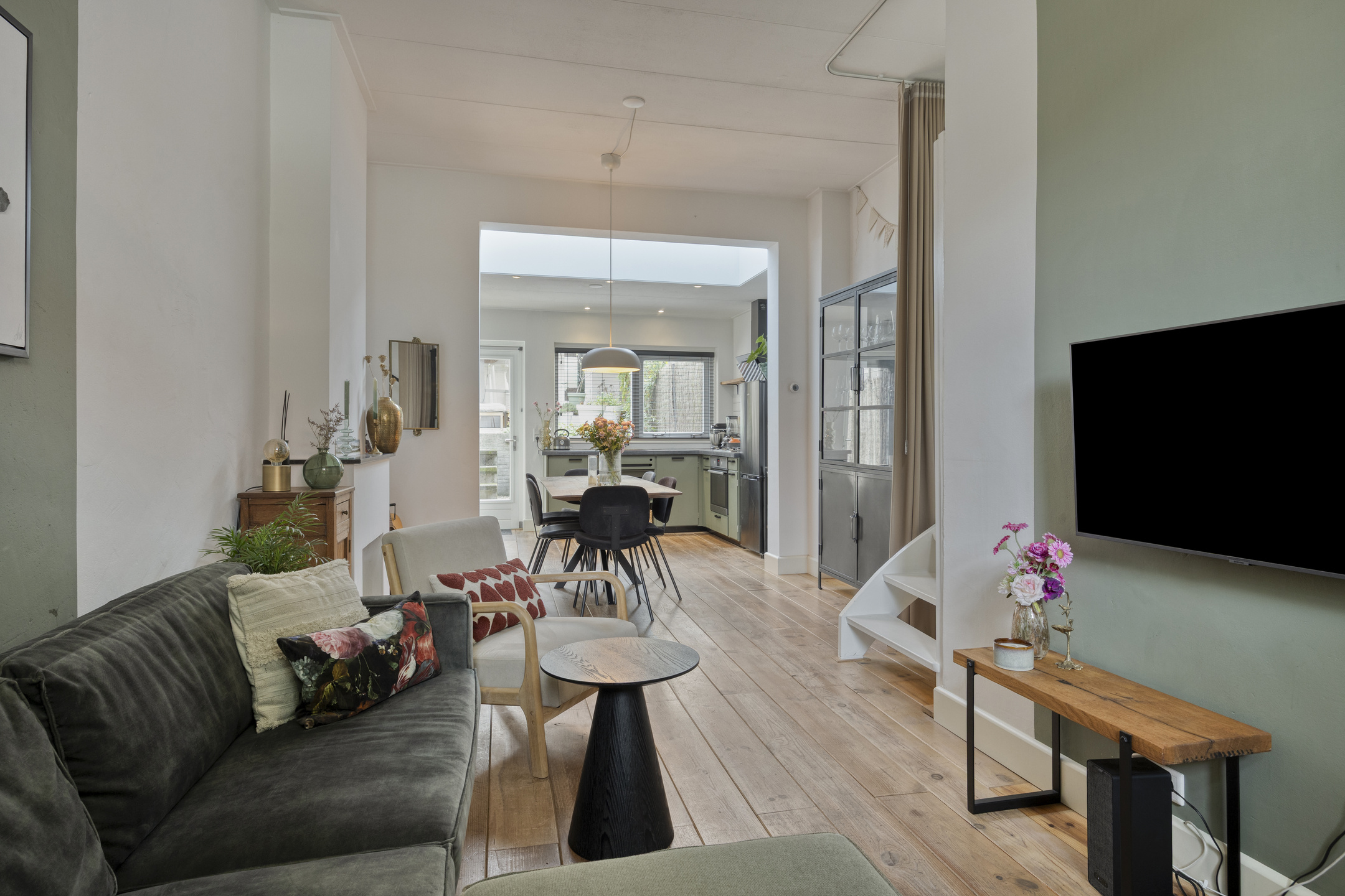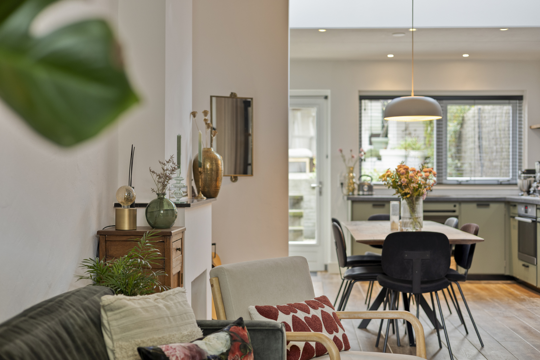 De sfeervolle woonkamer heeft een mooie lichtinval door het originele raam met dubbel glas, een fraaie houten vloer en de authentieke schouw (thans niet meer in gebruik). Wat meteen opvalt is de ruimte die de kamer biedt aan onder andere een bank, tafel en meerdere kasten.