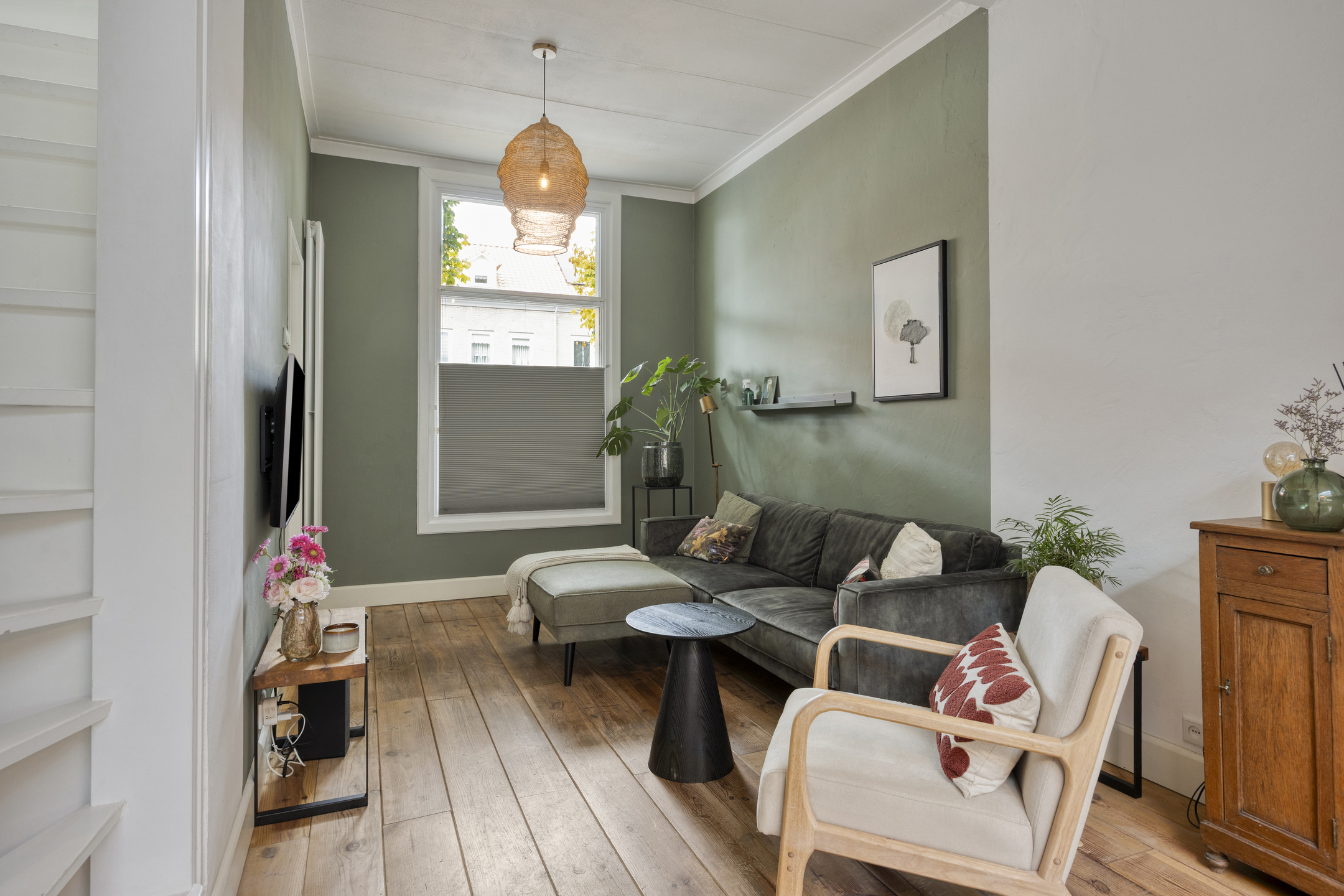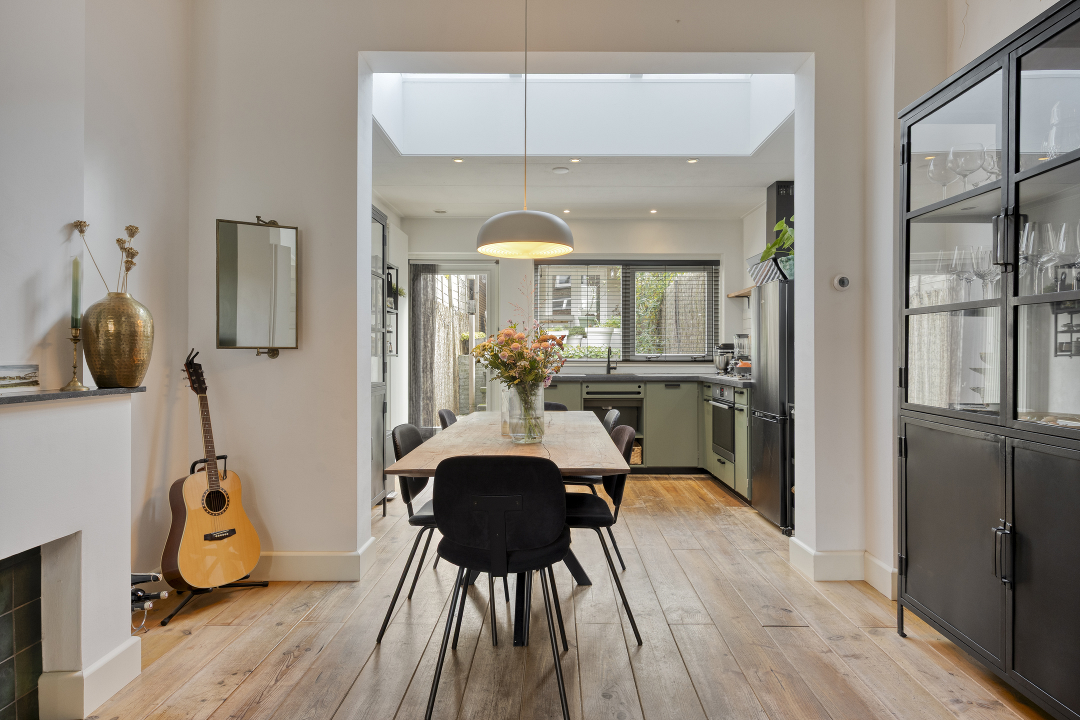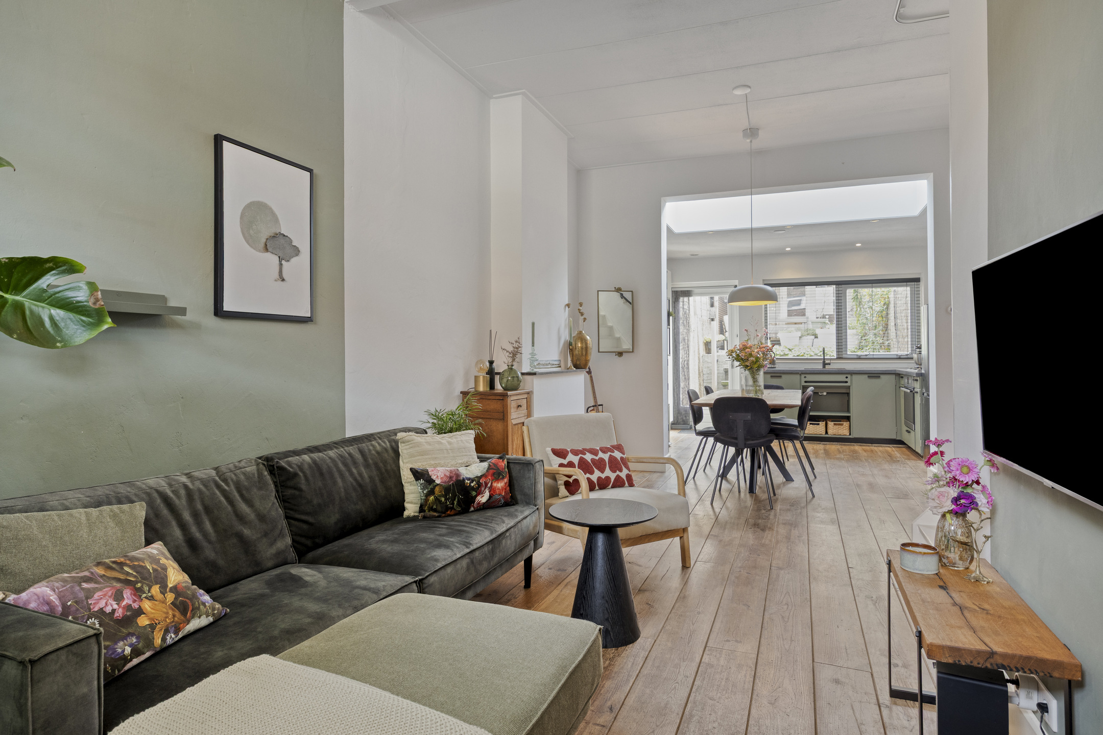 De sfeervolle woonkamer heeft een mooie lichtinval door het originele raam met dubbel glas, een fraaie houten vloer en de authentieke schouw (thans niet meer in gebruik). Wat meteen opvalt is de ruimte die de kamer biedt aan onder andere een bank, tafel en meerdere kasten.