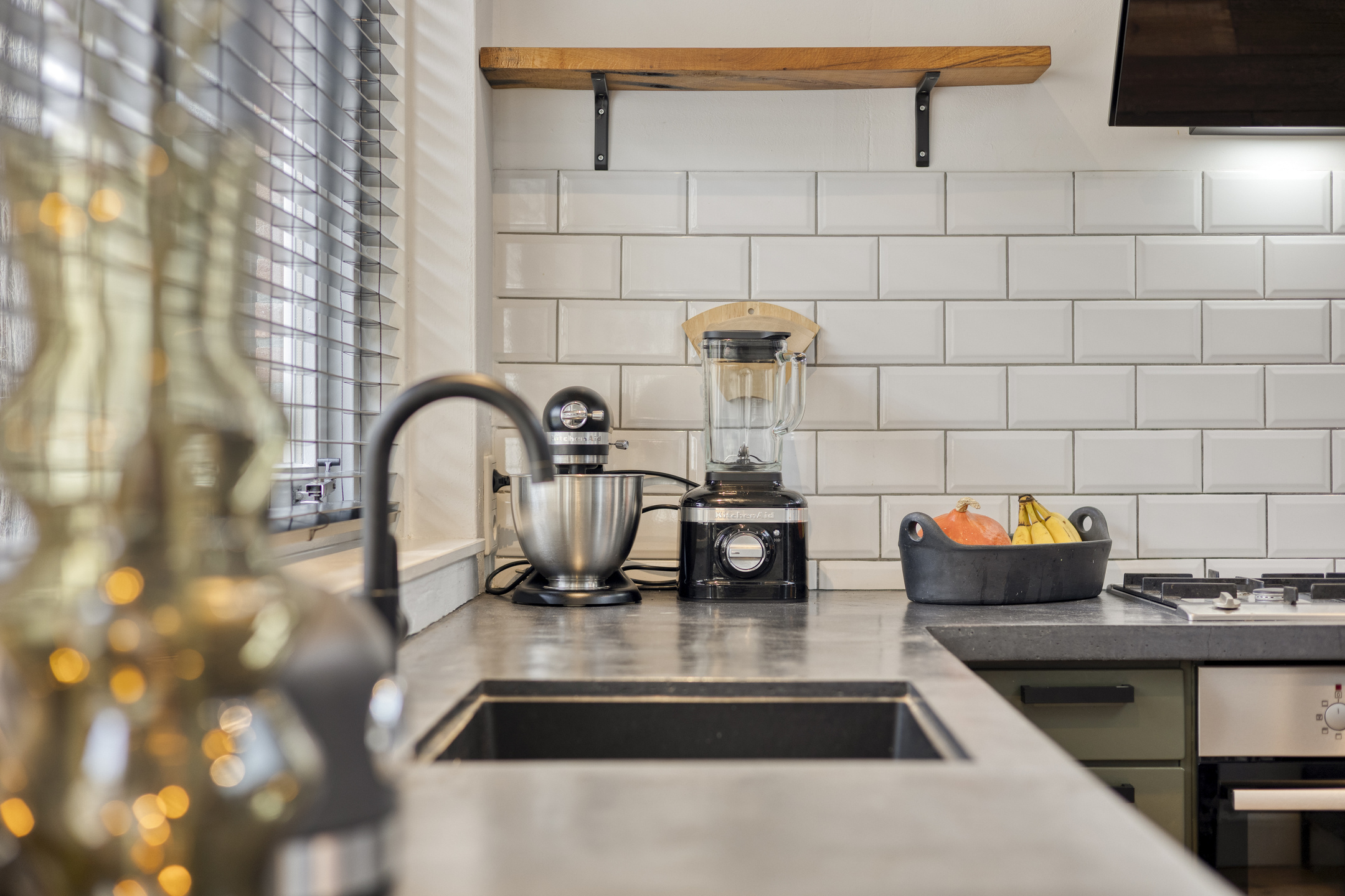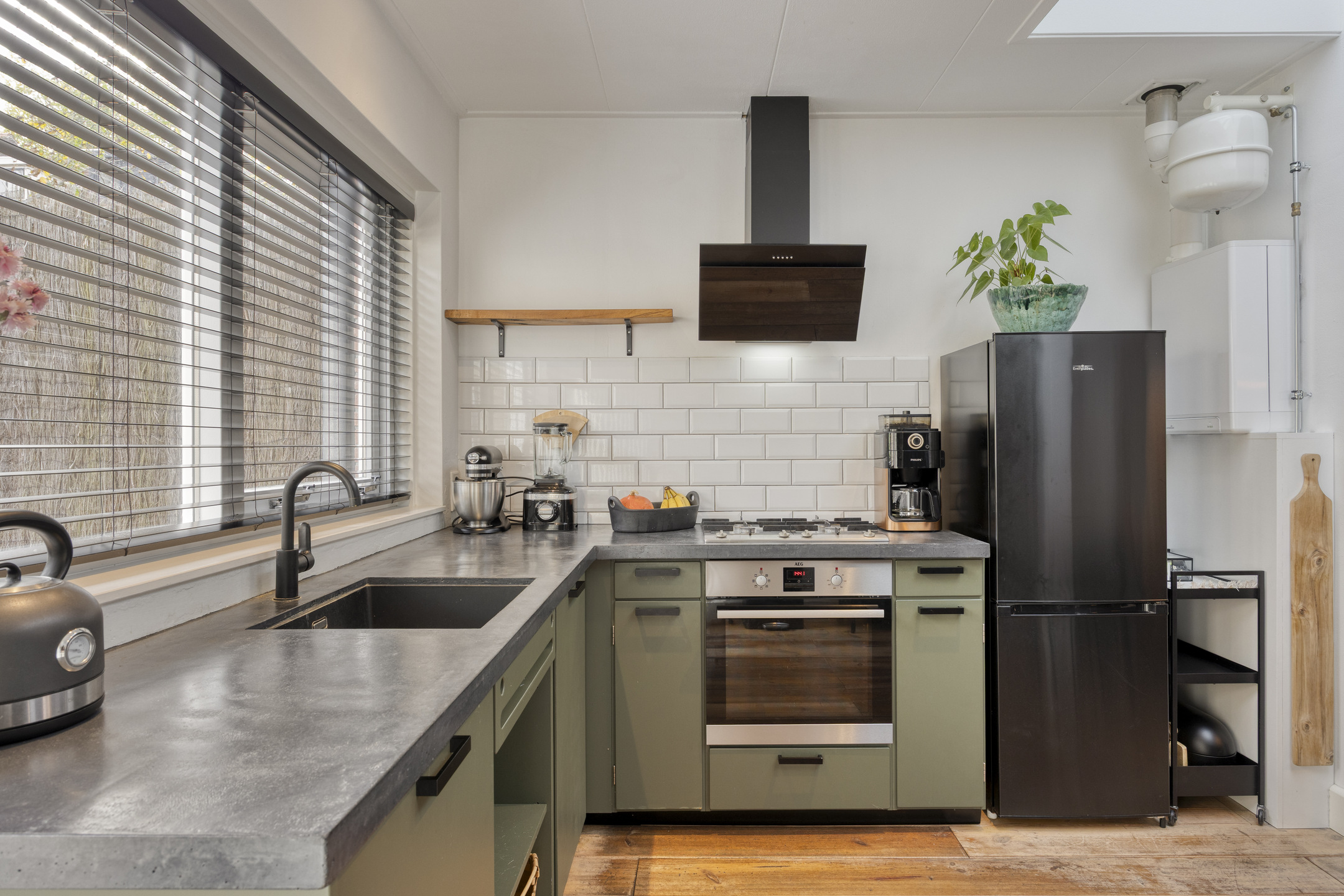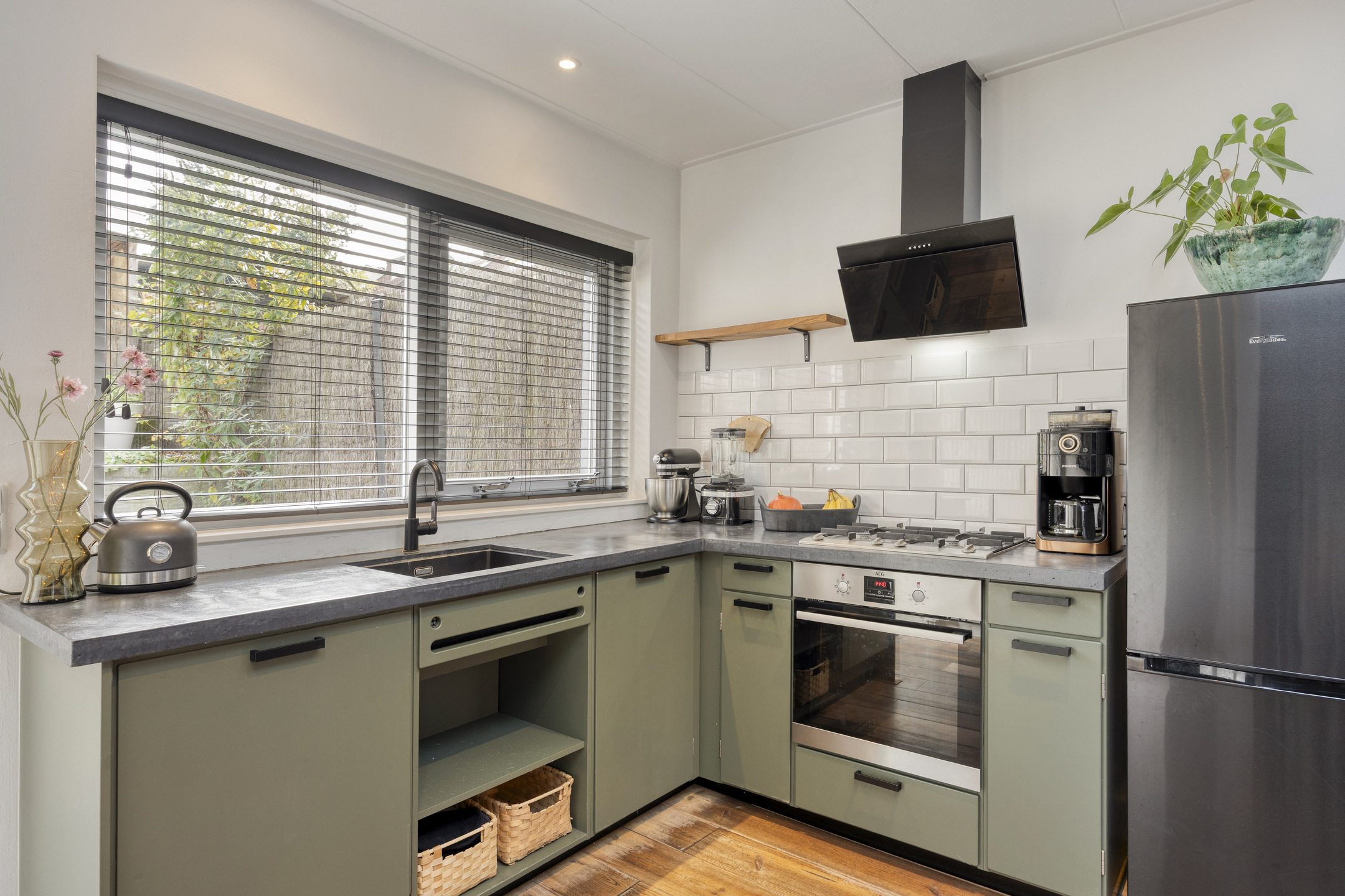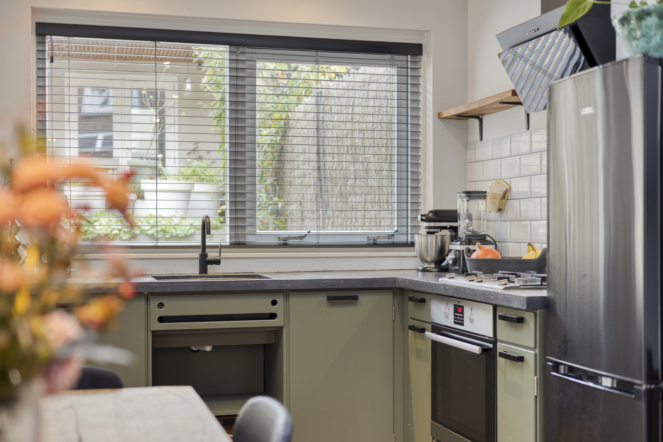 Door een uitbouw (2002) is een riante open keuken gemaakt die met de grote raampartijen en terrasdeur in directe verbinding met de tuin staat. De L-vormige originele Bruynzeel keuken heeft een betonnen werkblad en losse apparatuur. De lichtstraat tussen de keuken en de eetkamer zorgt voor een prettig gevoel in de ruimte.