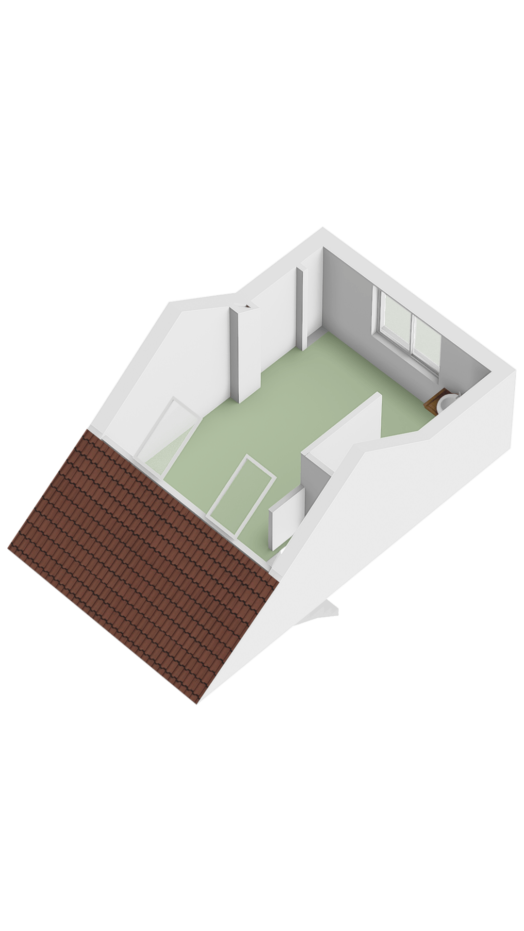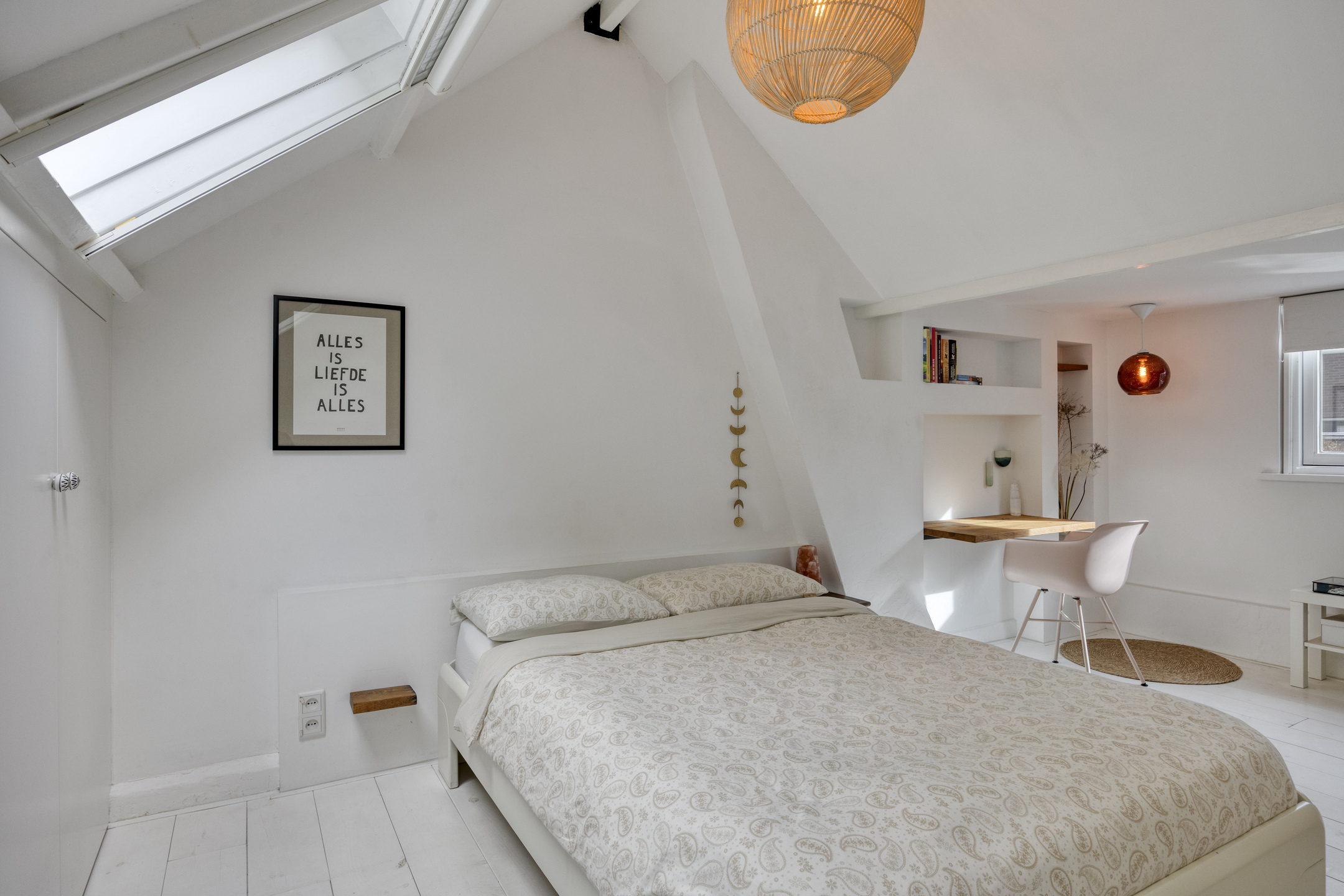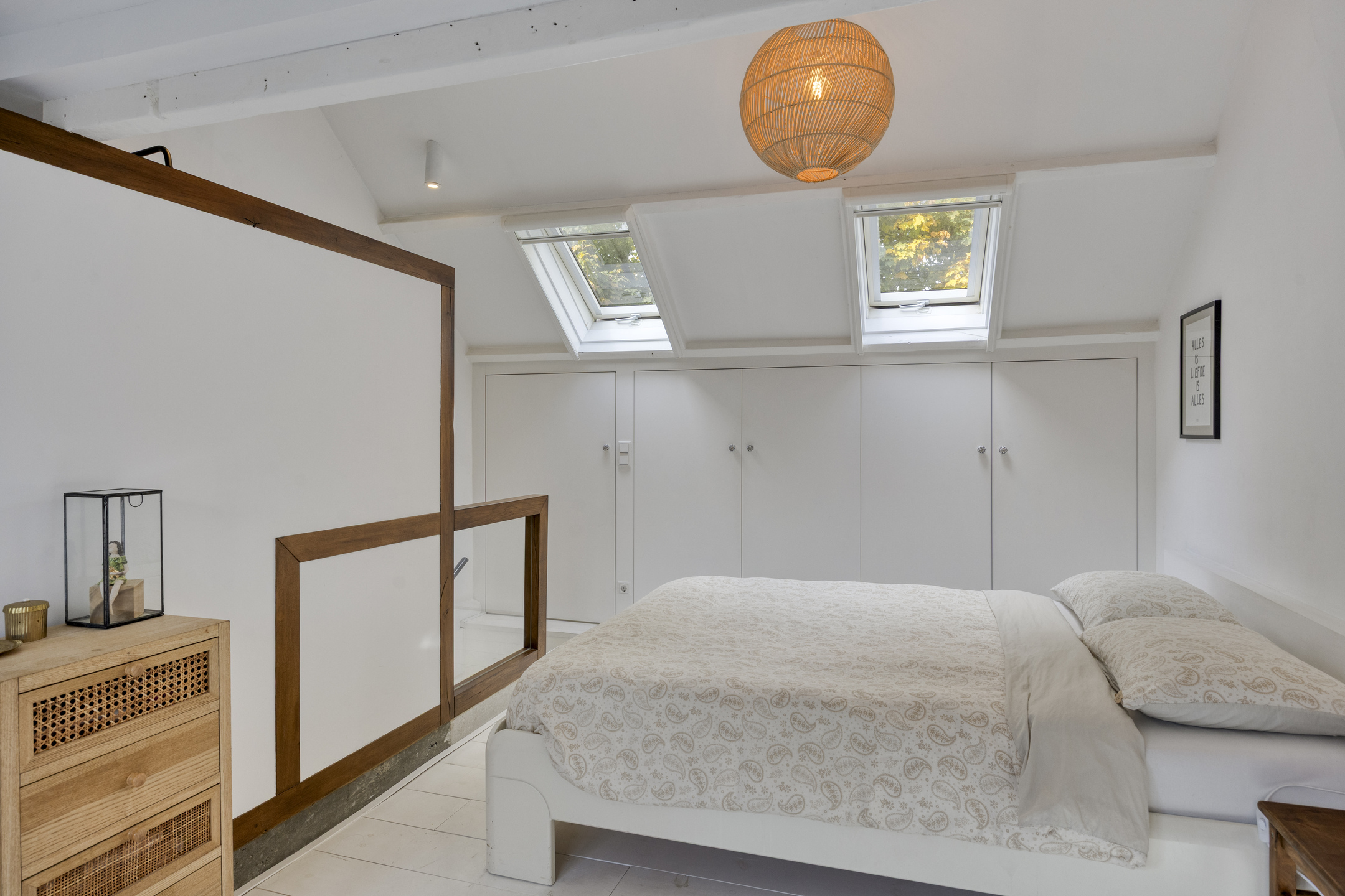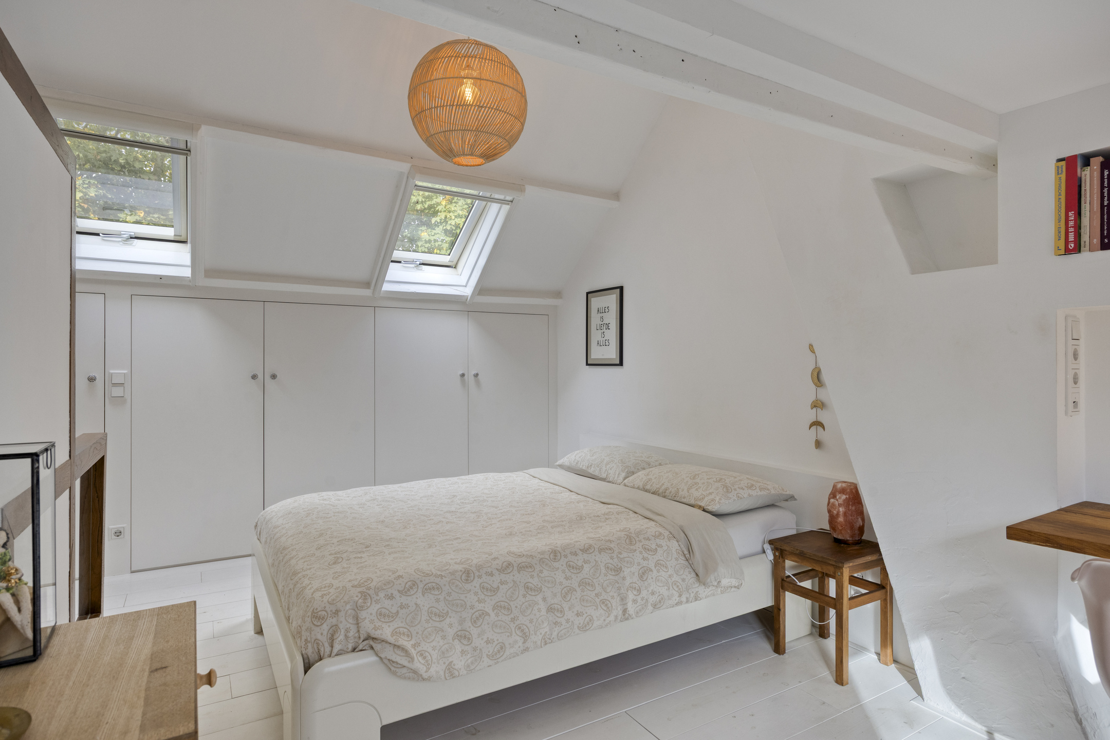 Via een vaste trap (met lage doorgang) kan de eerste verdieping worden bereikt. Onder de schuine wanden zijn strak afgewerkte grote inbouwkasten geplaatst waardoor een eigen garderobe kast overbodig is. De ruimte wordt gebruikt als slaapkamer maar heeft geen op de cv aangesloten radiator.