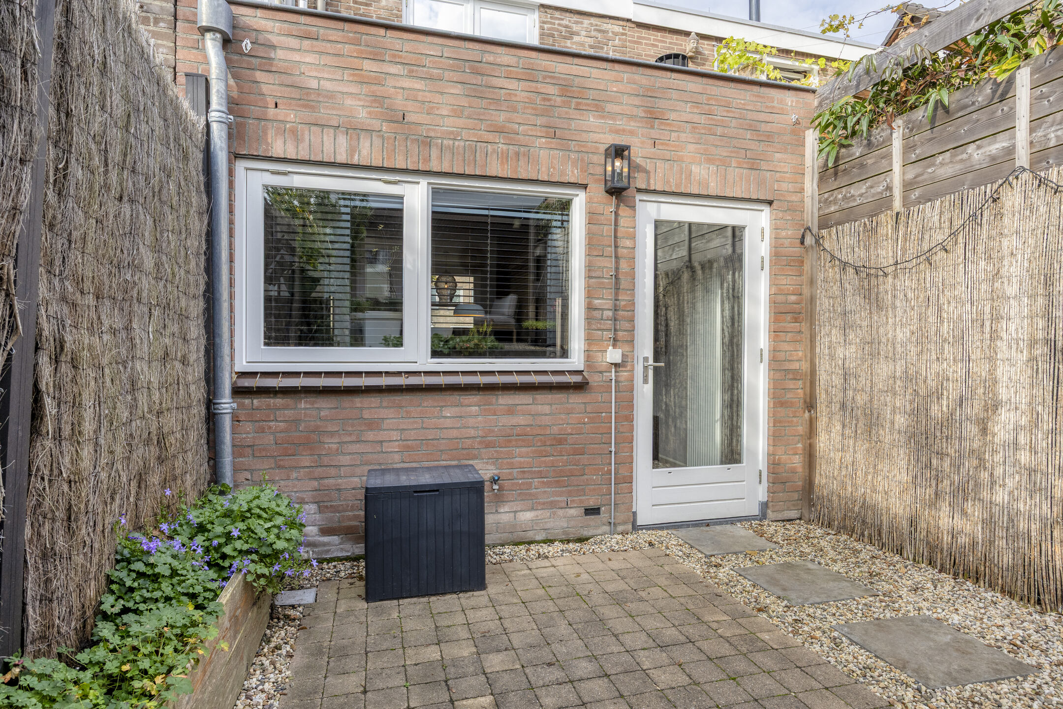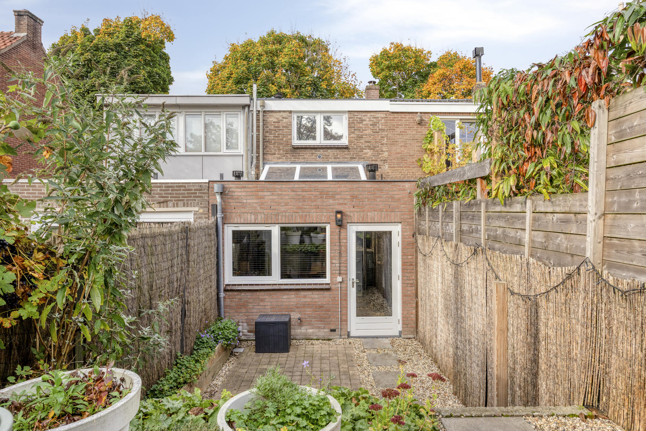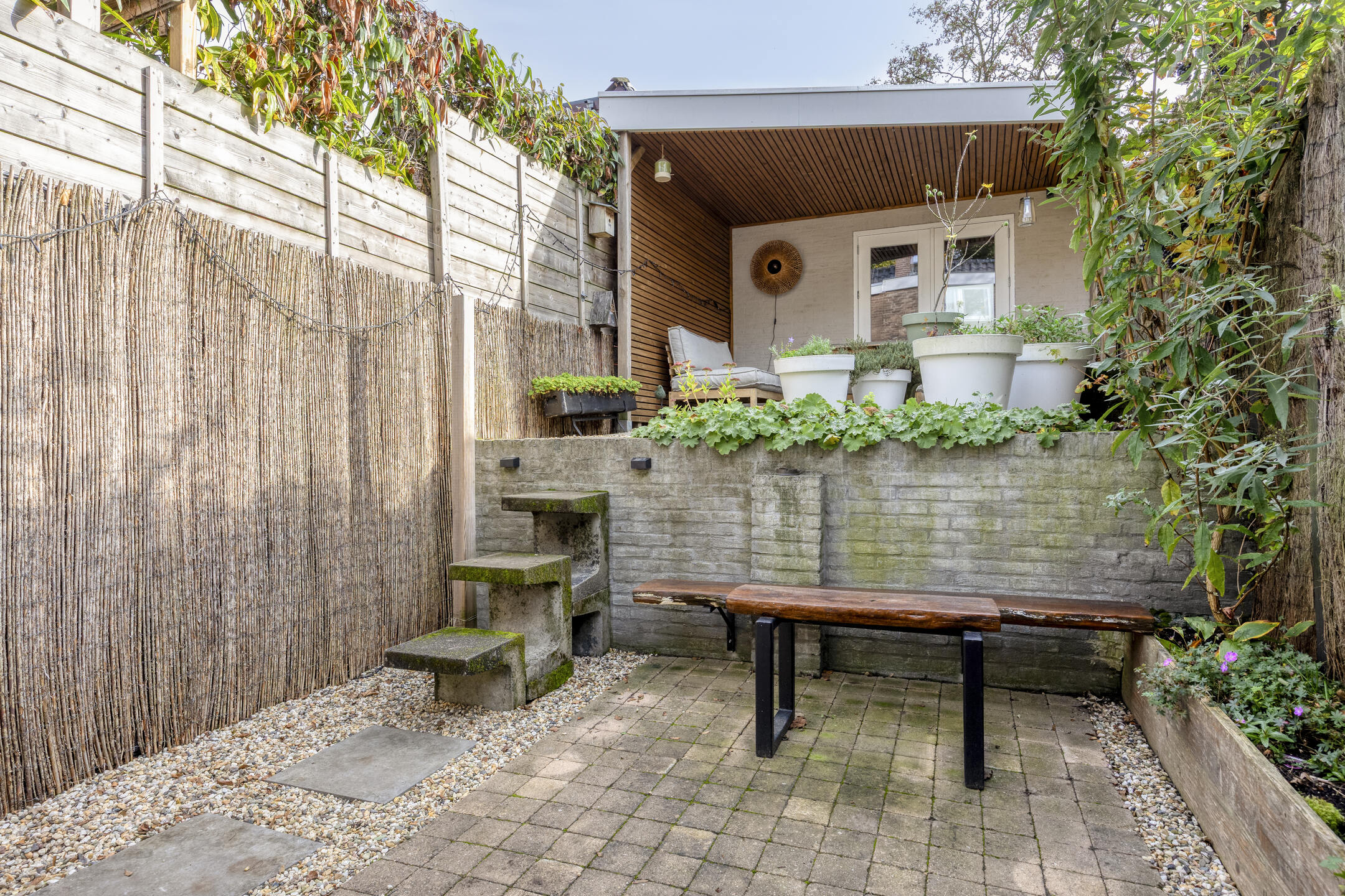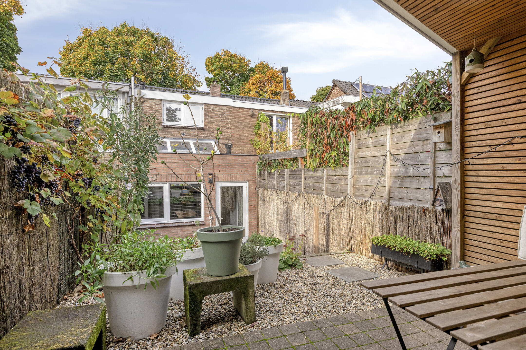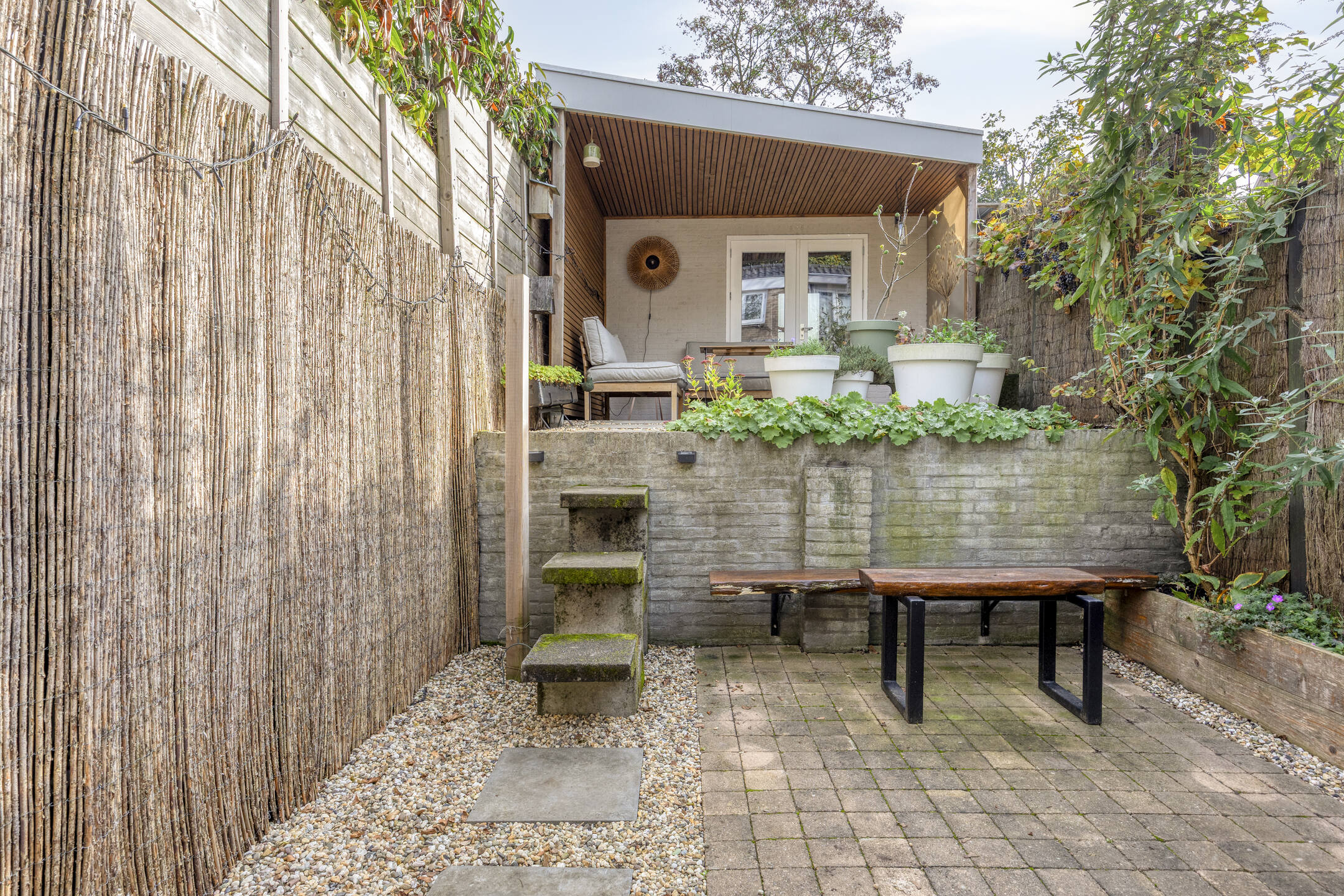 De fijne tuin op het zuidoosten ligt beschut en zonnig en geeft een mooie verre kijk over de daken van de wijk.