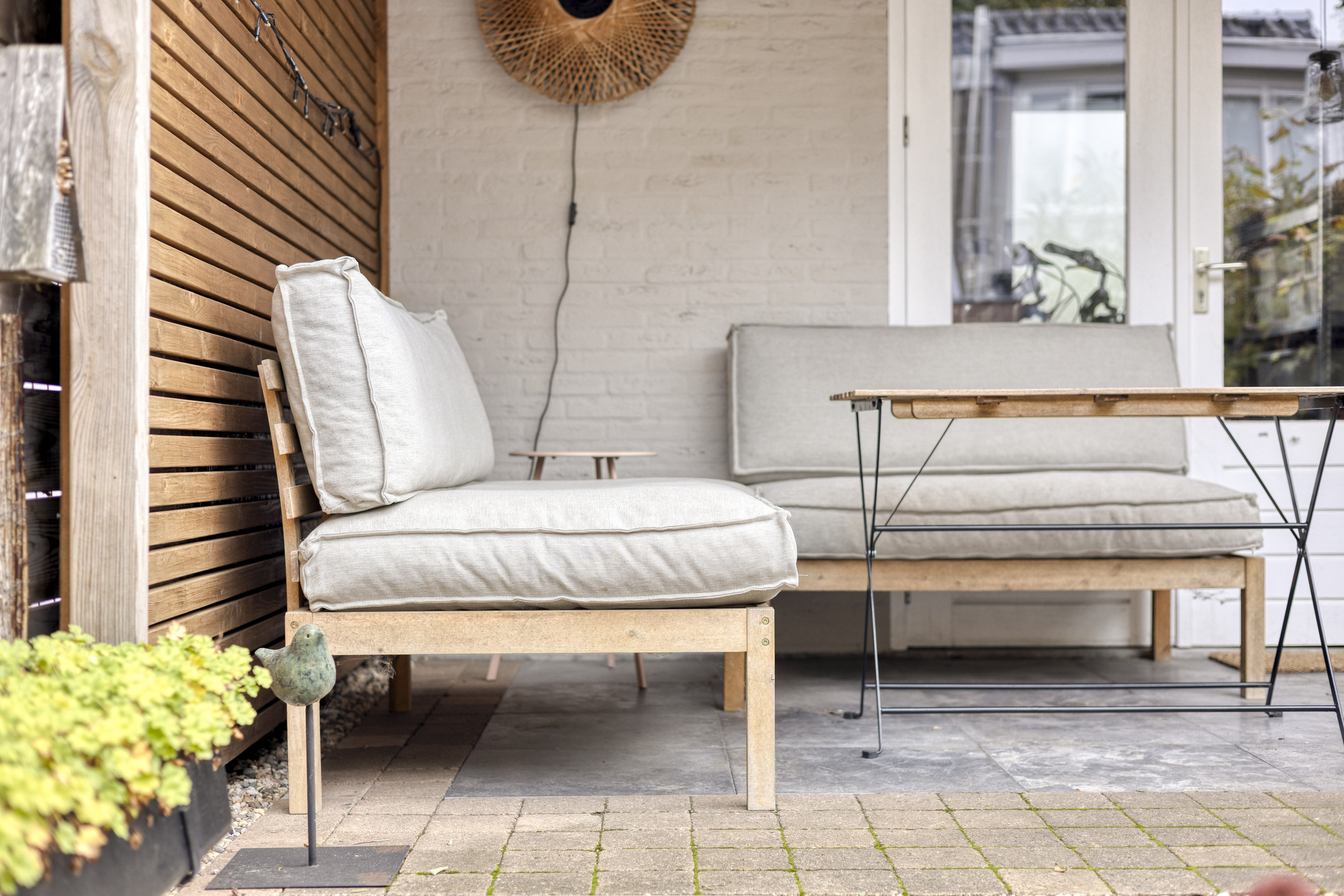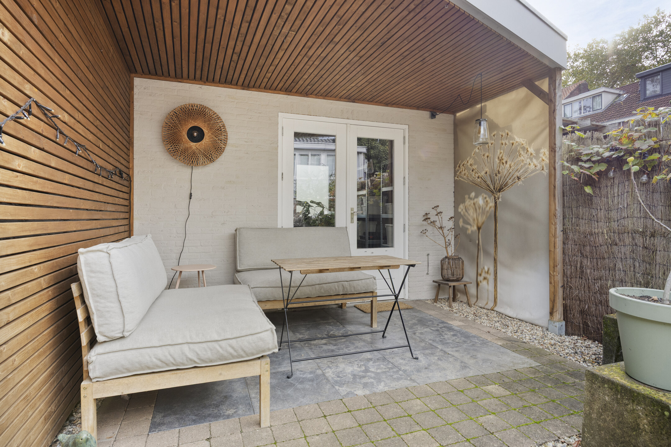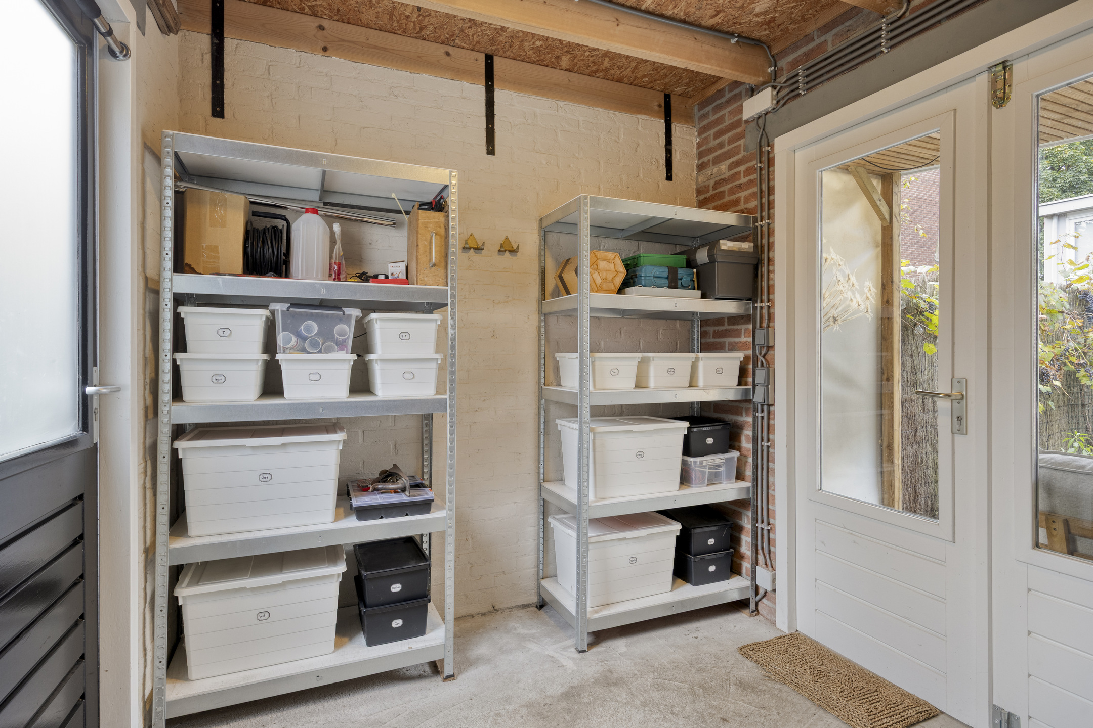 Het niveau verschil is optimaal benut waardoor er een tweede terras is met een overkapping: heerlijk genieten van de avondzon. Het stenen schuurtje (2021) heeft openslaande deuren naar de tuin, een afdak, elektra en een deur naar de achterom.