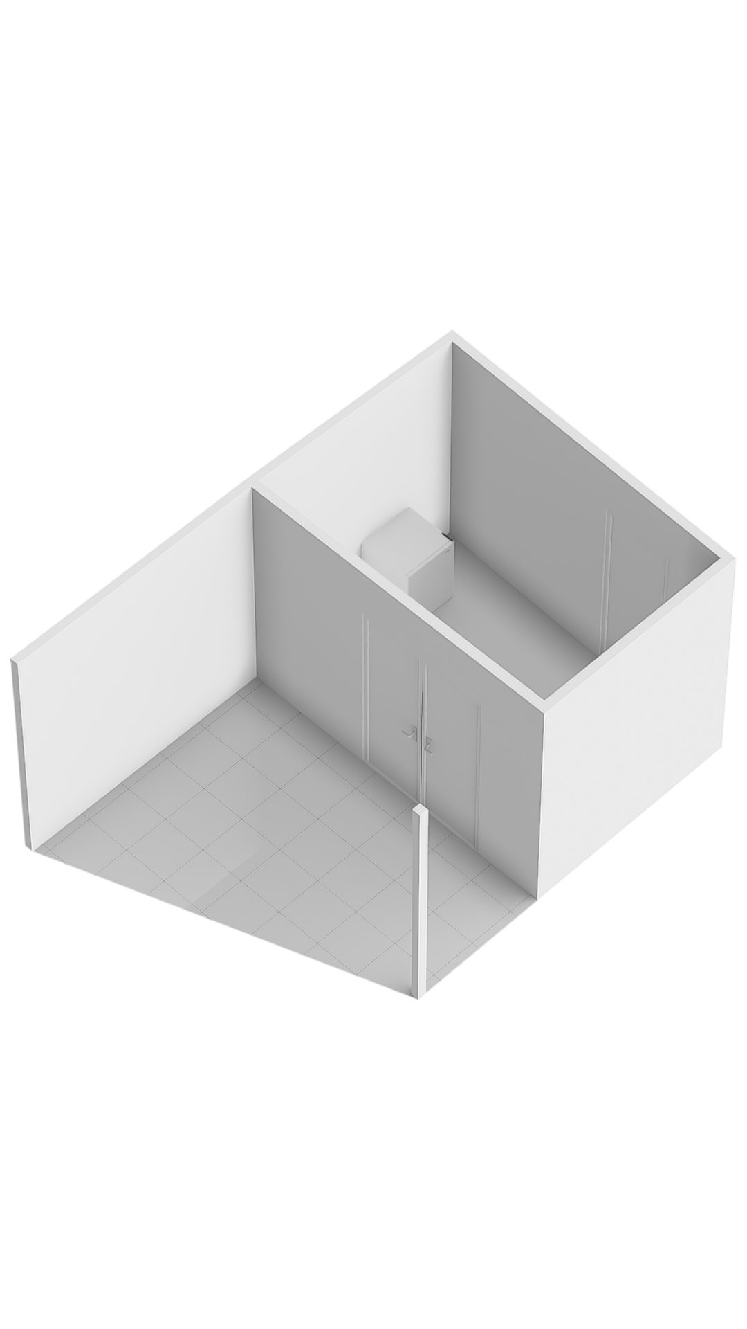 Achter het gordijn is de trap naar boven. Naast de bank is het luik naar de trap naar de kelder.