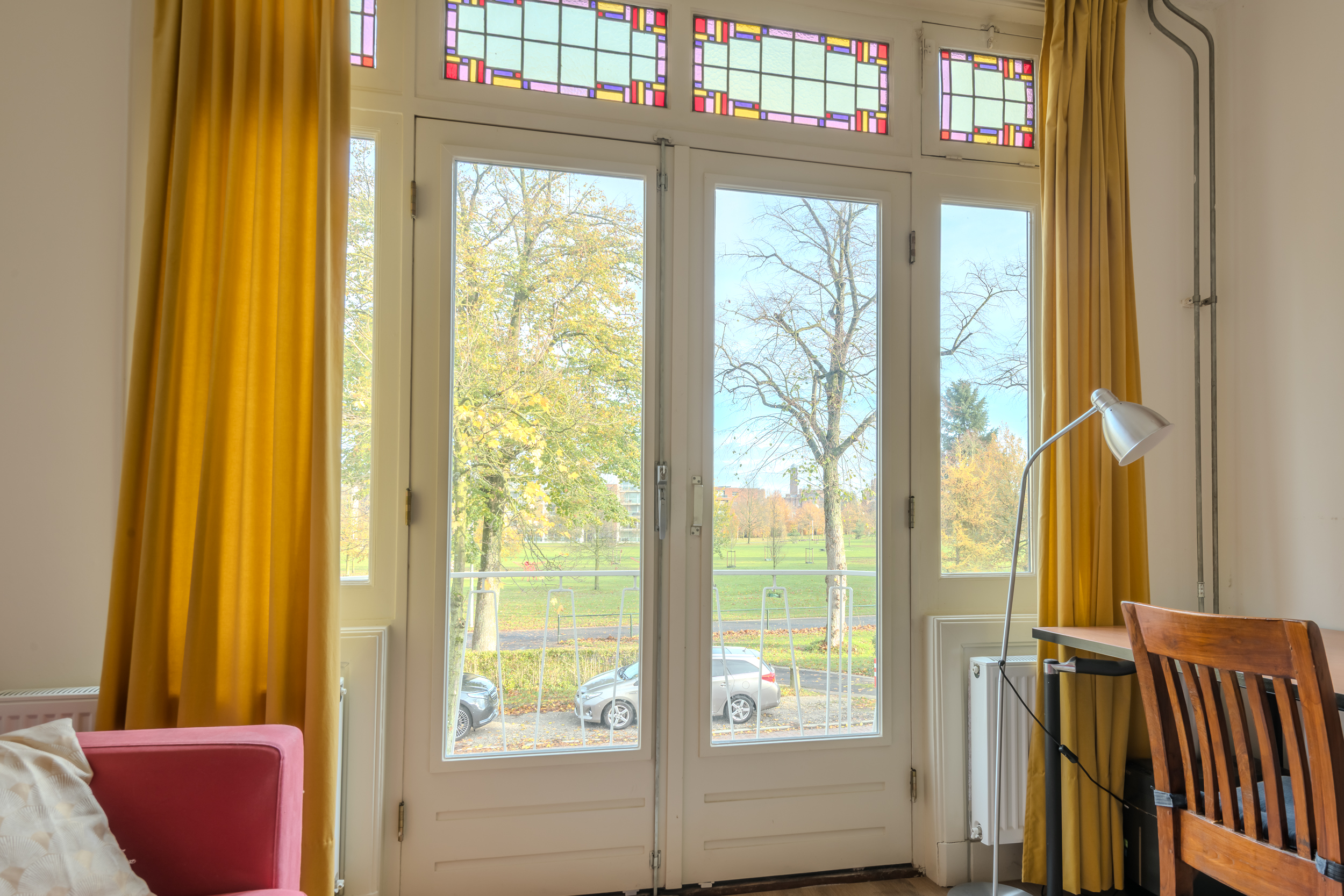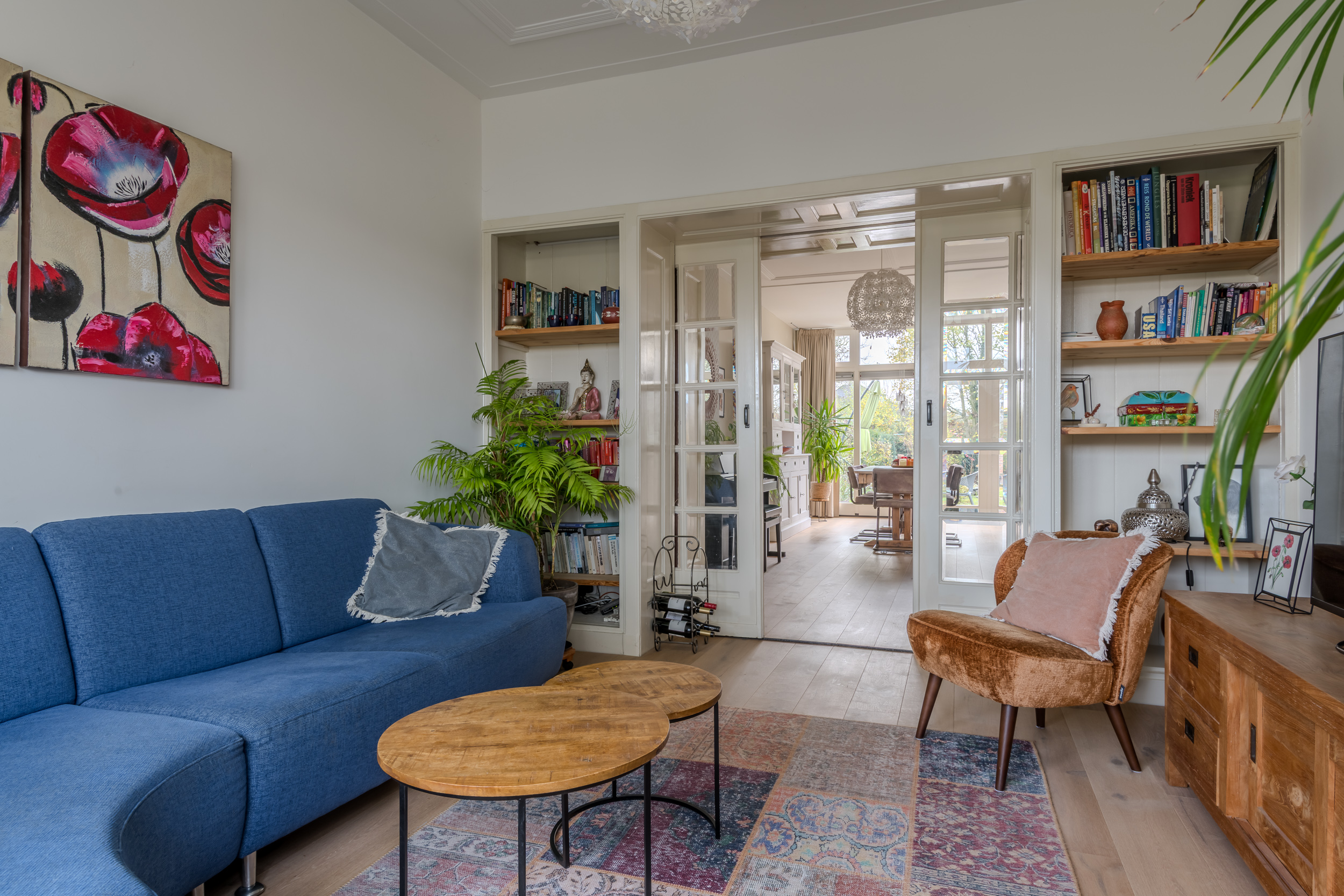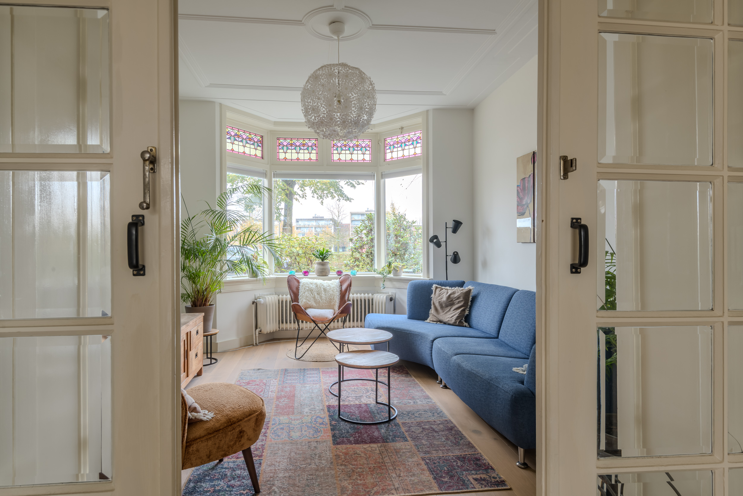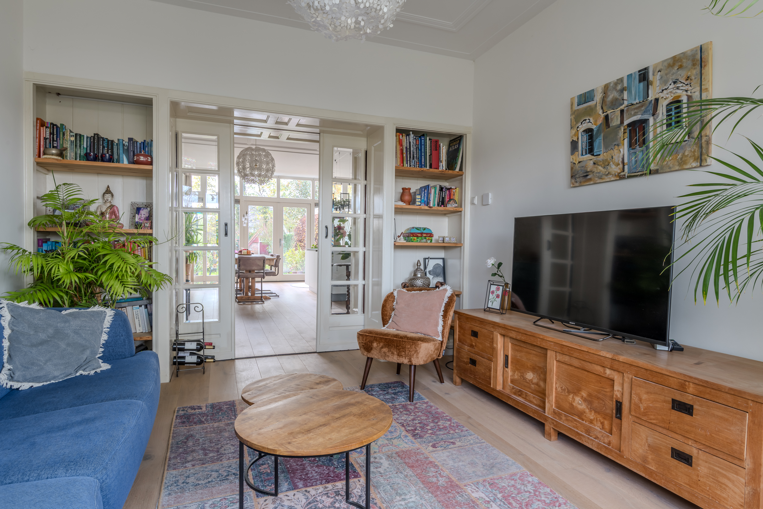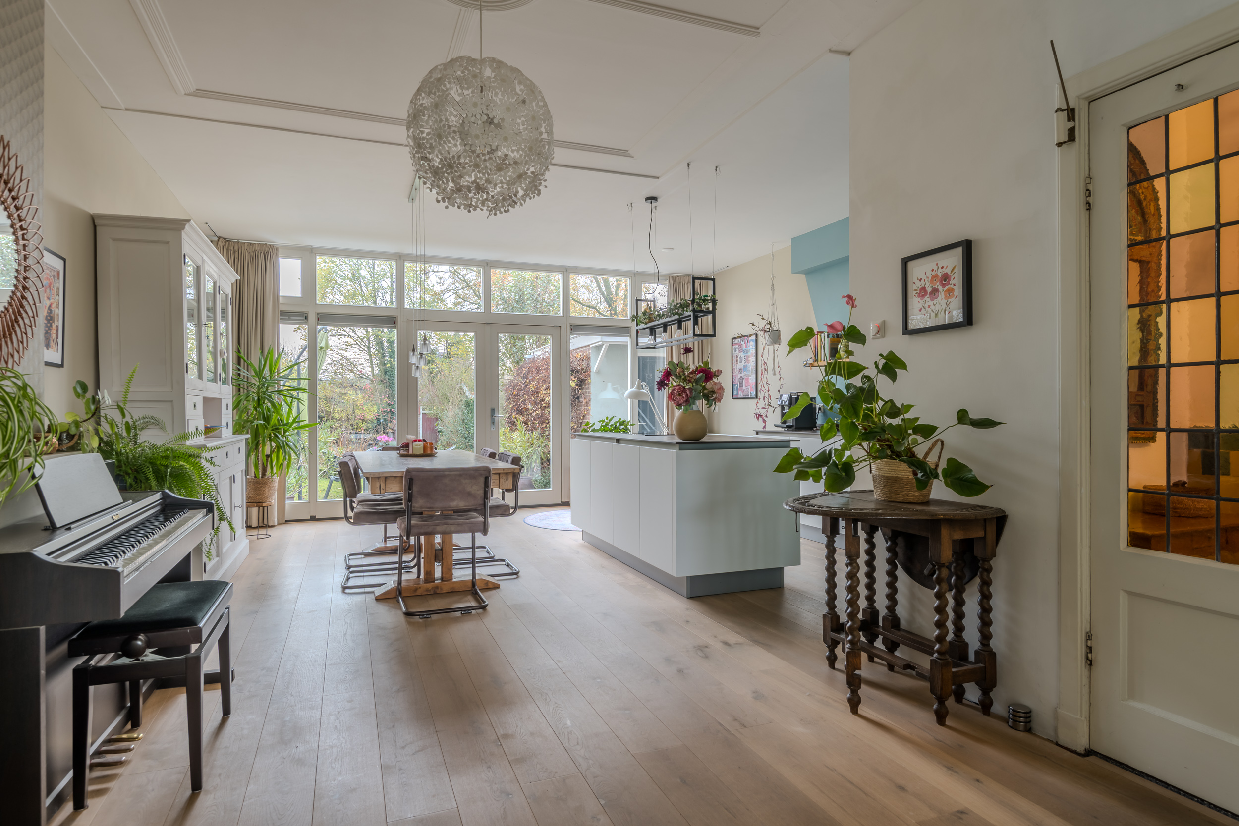 De woonkamer bestaat uit een sfeervolle kamer en suite met schuifdeuren, suitekasten en een lichte erker met glas-in-lood en voorzetramen. Het fraaie, ingewitte lamelparket loopt door naar de eetkamer en keuken en geeft de gehele leefruimte een frisse, moderne uitstraling.