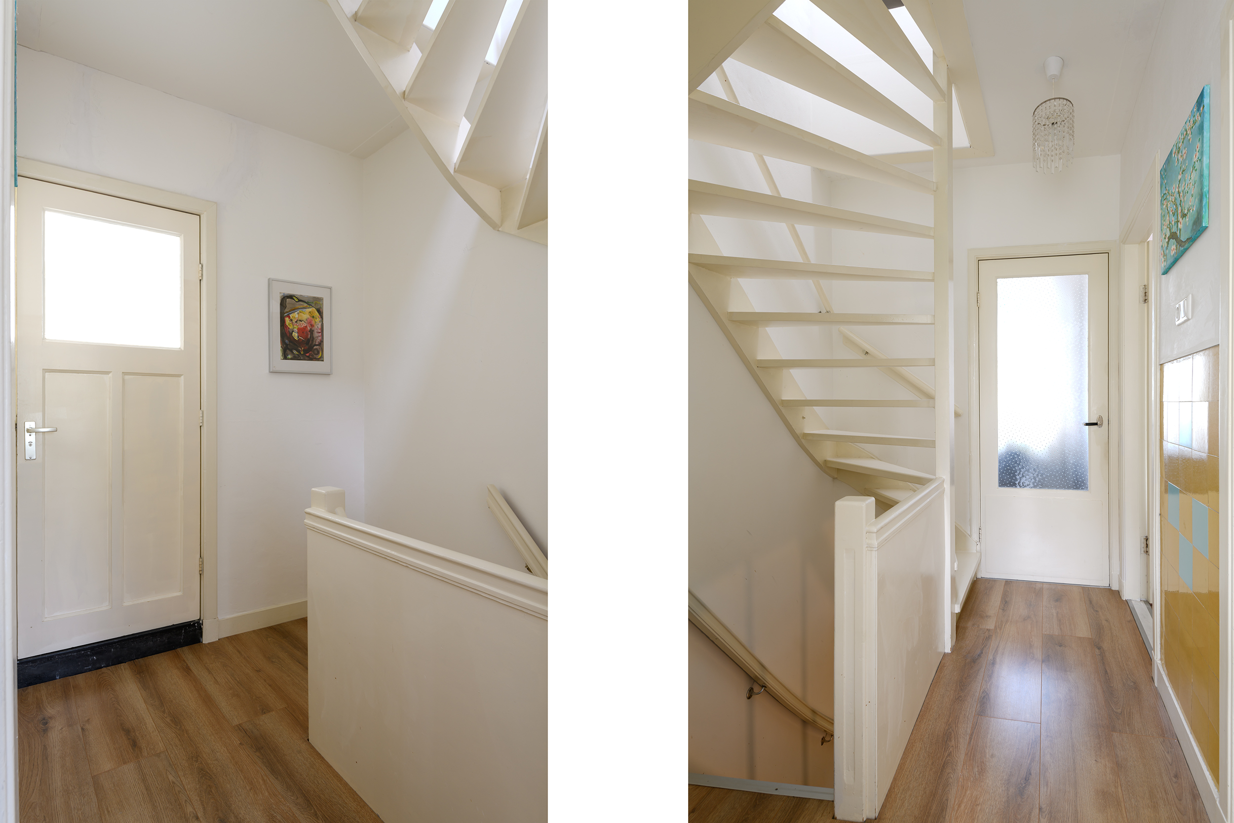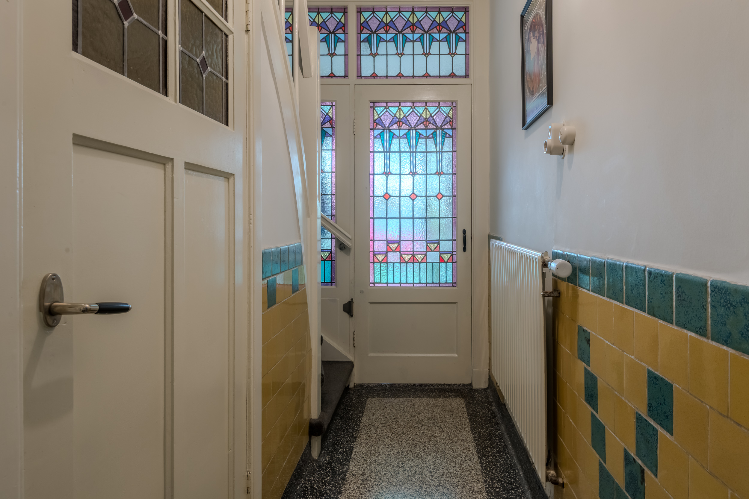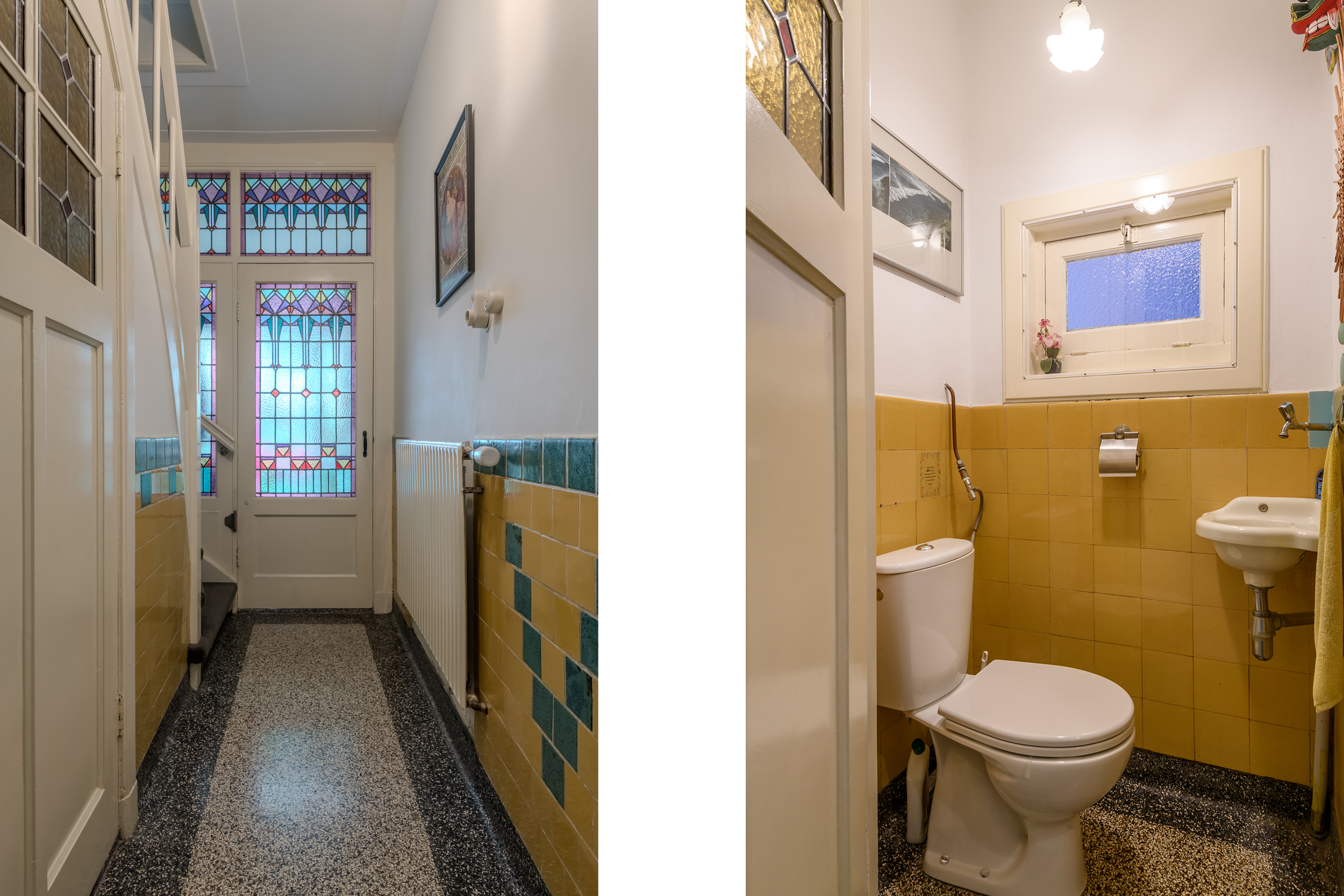 Charmante entree met portaal en hal, rijk aan authentieke details: glas-in-looddeuren, een gepolijste granitovloer, een origineel postvakje en decoratieve wandtegel-lambrisering. De toiletruimte is eenvoudig uitgevoerd en voorzien van een staand toilet met fontein. In de praktische bergkast bevindt zich de meterkast.