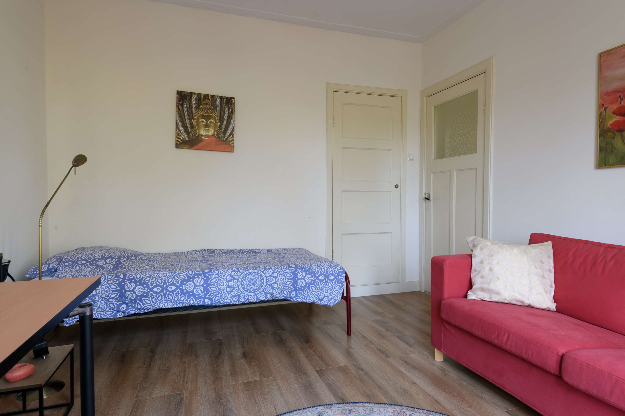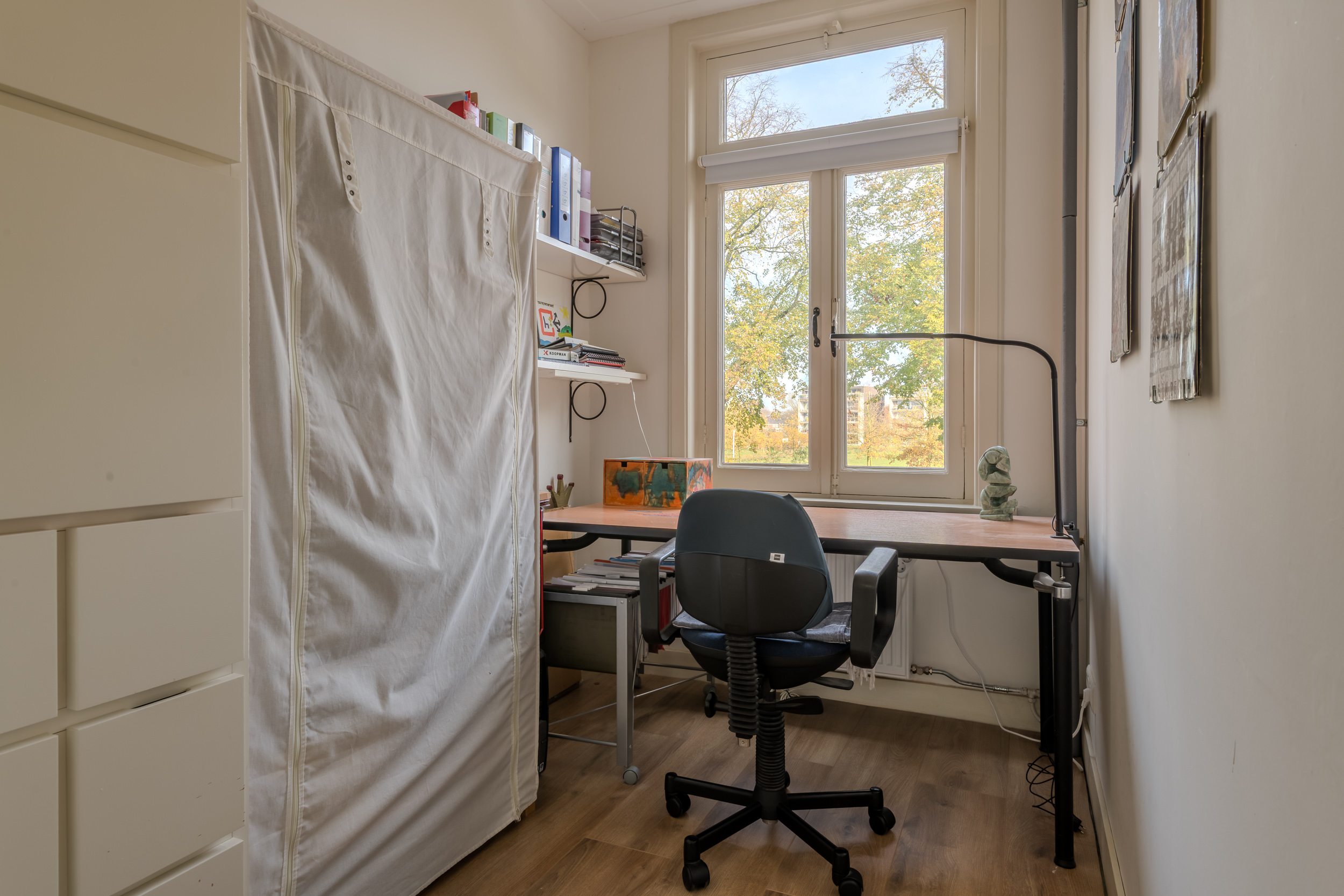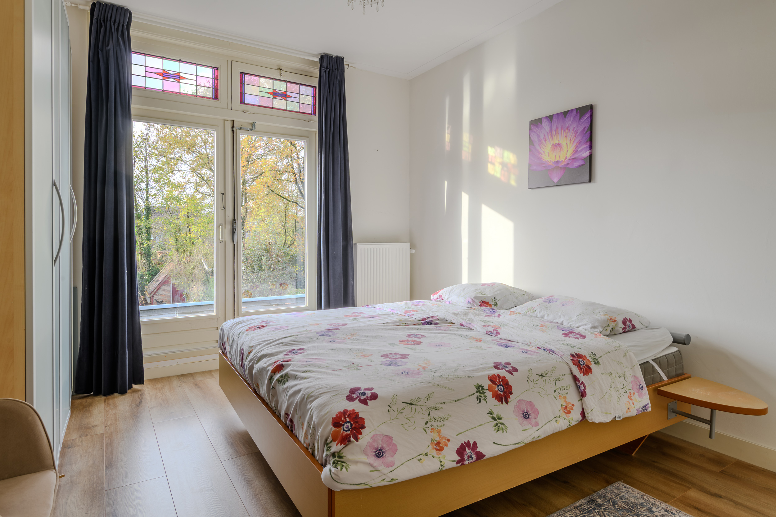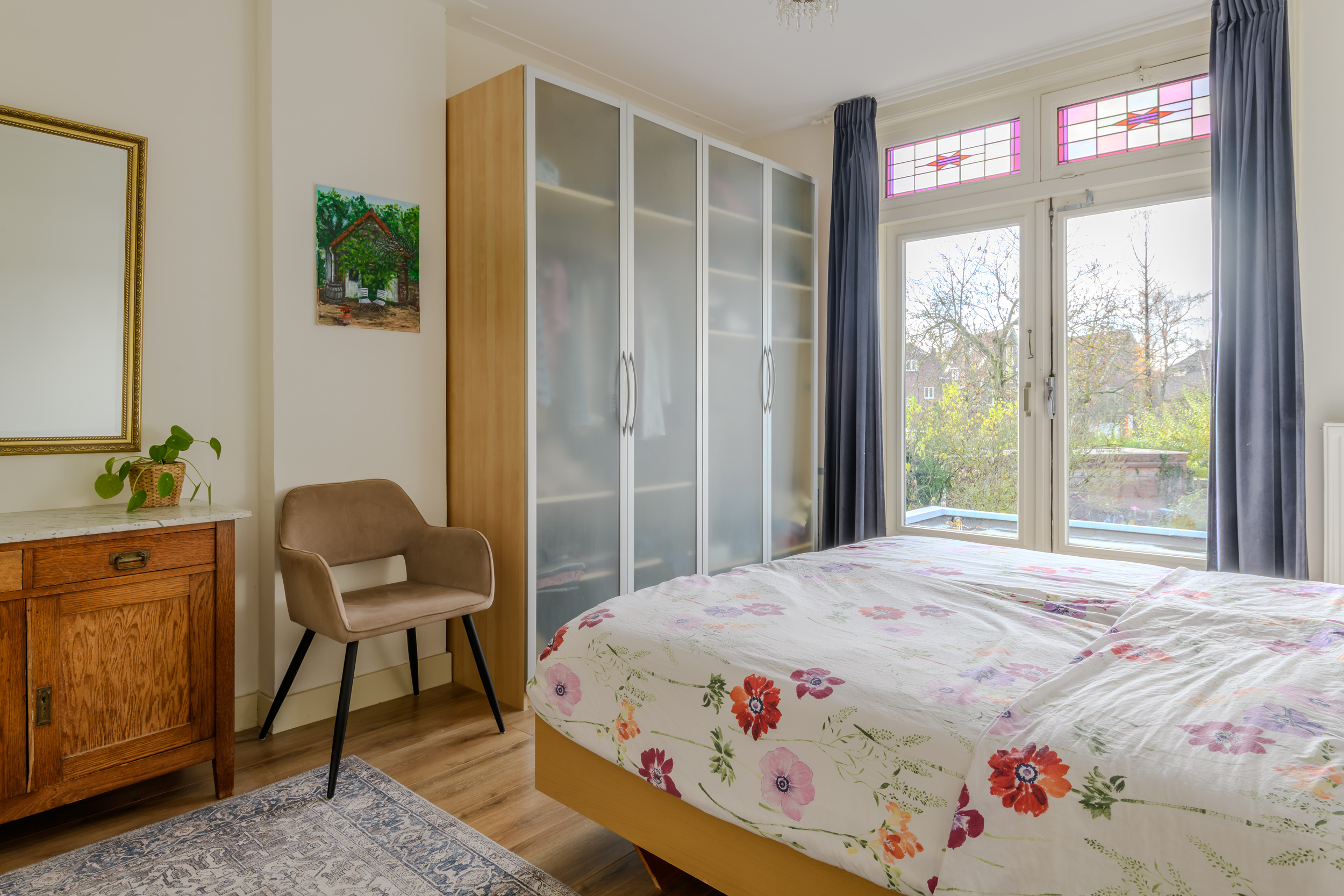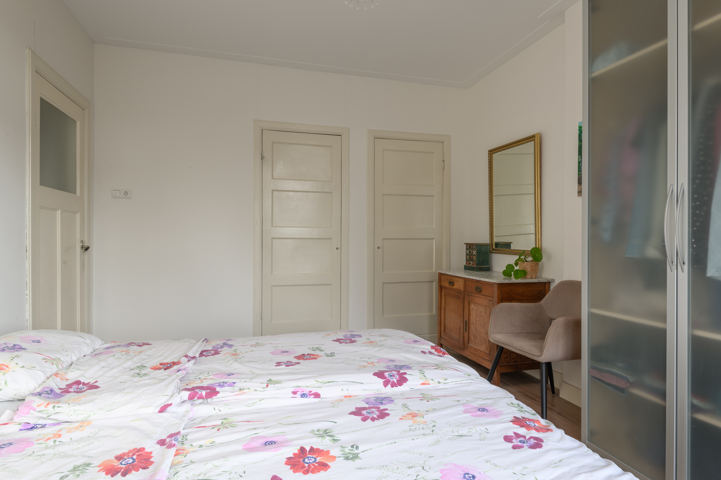 Overloop met opnieuw de authentieke wandtegels en paneeldeuren. Op deze verdieping bevinden zich drie slaapkamers. De grootste slaapkamer ligt aan de achterzijde, heeft twee vaste kasten en openslaande deuren. Het voormalige balkon is opgenomen in de uitbouw; er is al rekening gehouden met de mogelijkheid om op een deel van het platte dak opnieuw een balkon te realiseren.