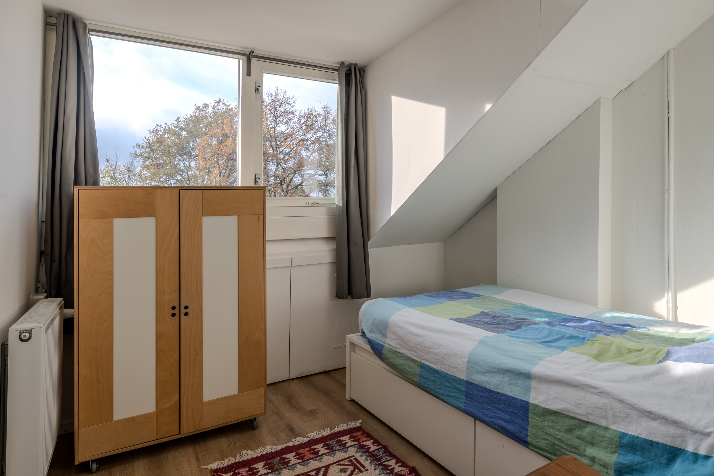 Van de twee slaapkamers aan de voorzijde heeft er één een vaste kast en een klein balkon.