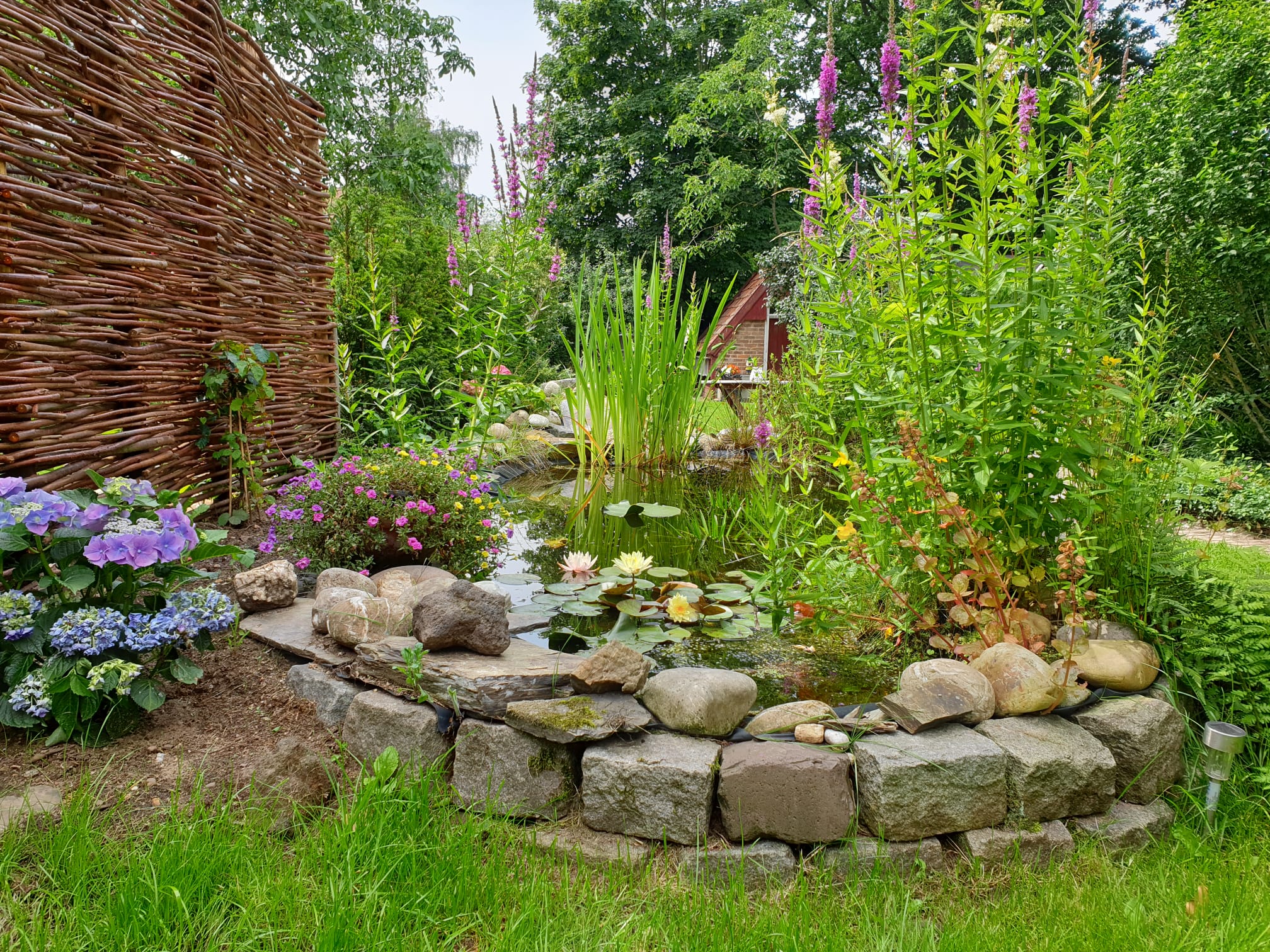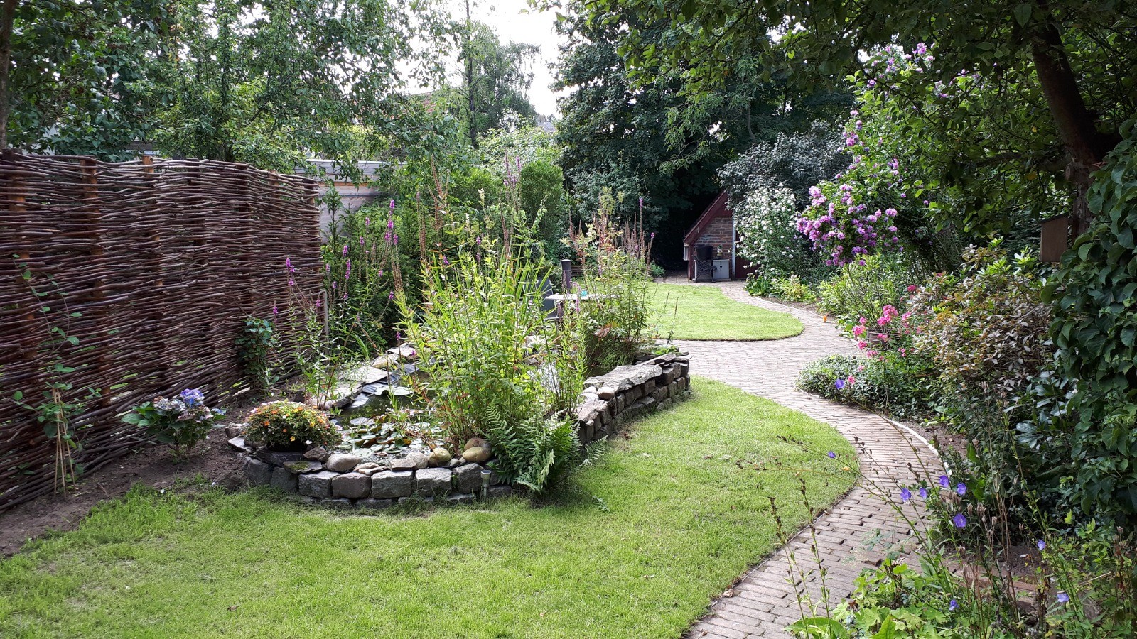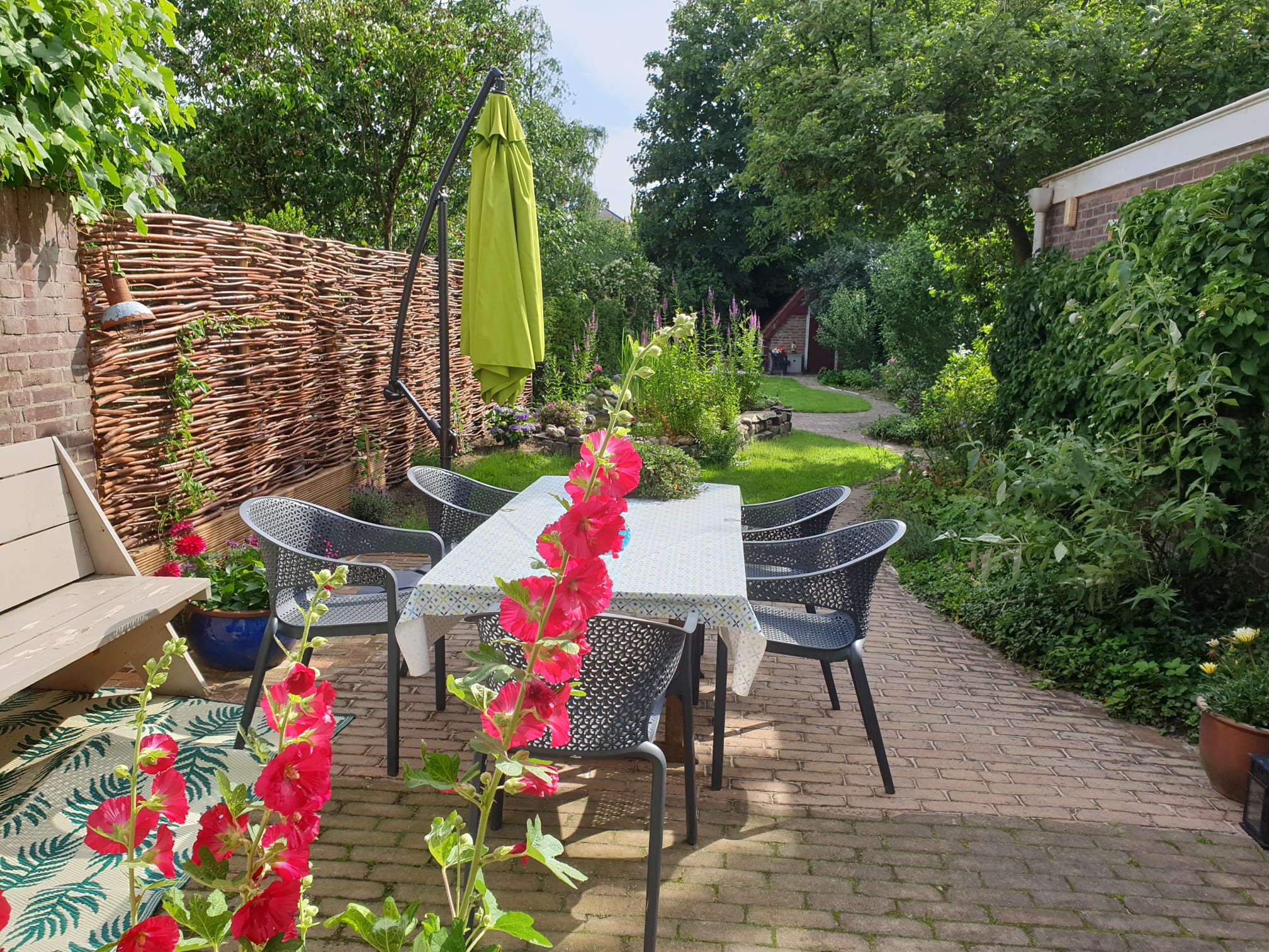 Het schuurtje achter in de tuin is gebouwd met materialen die hergebruikt zijn na het bombardement van de benedenstad
