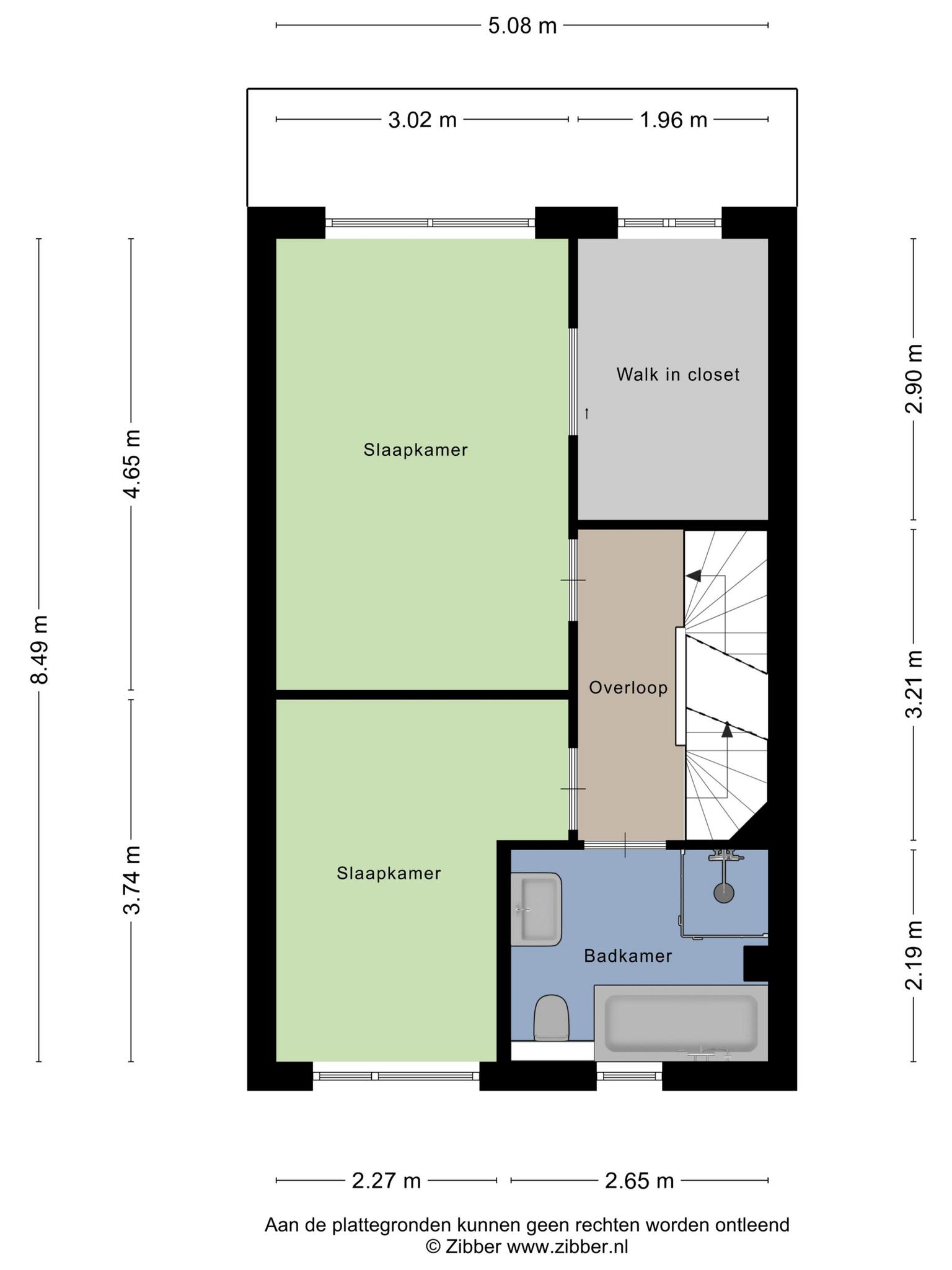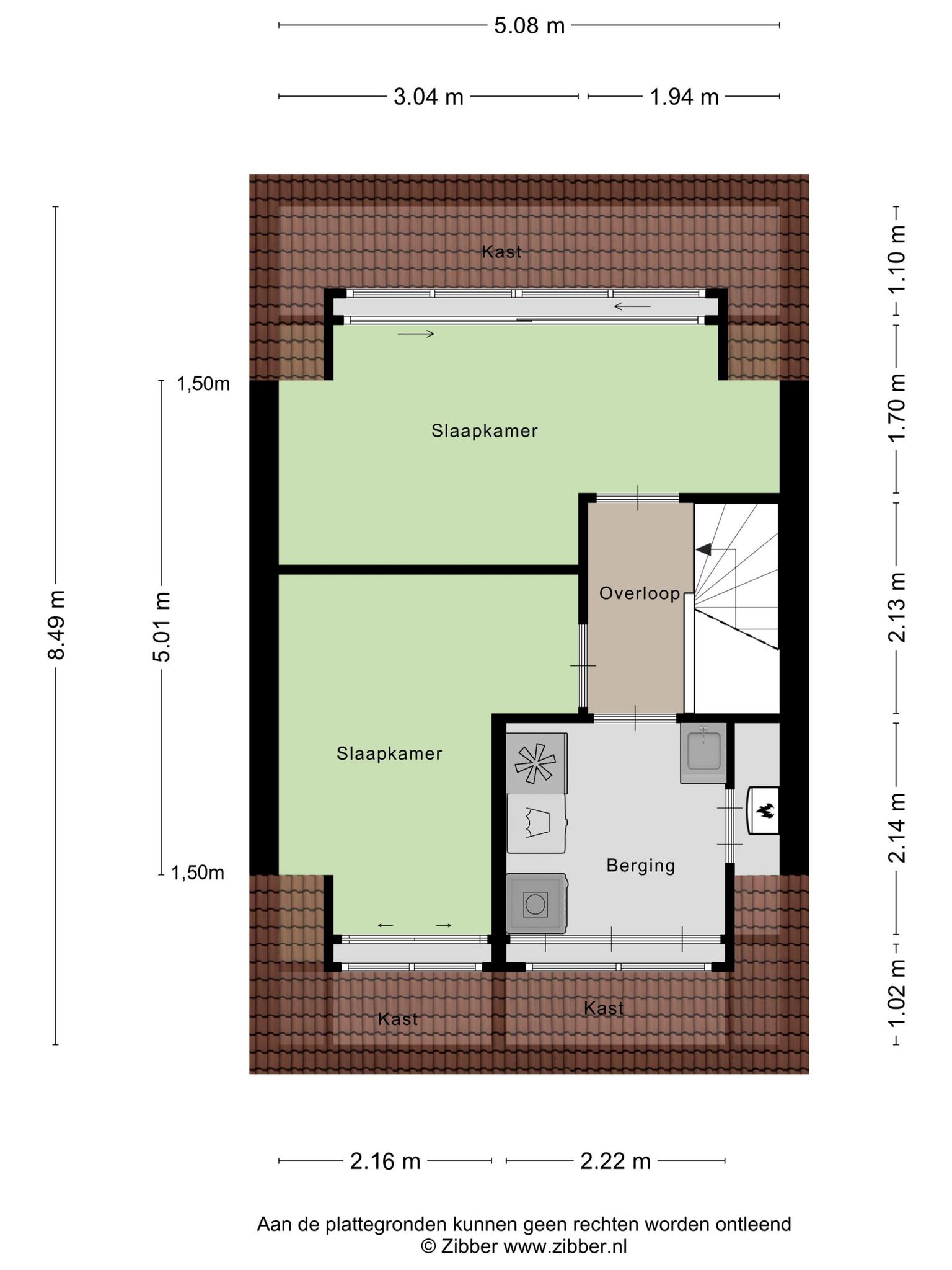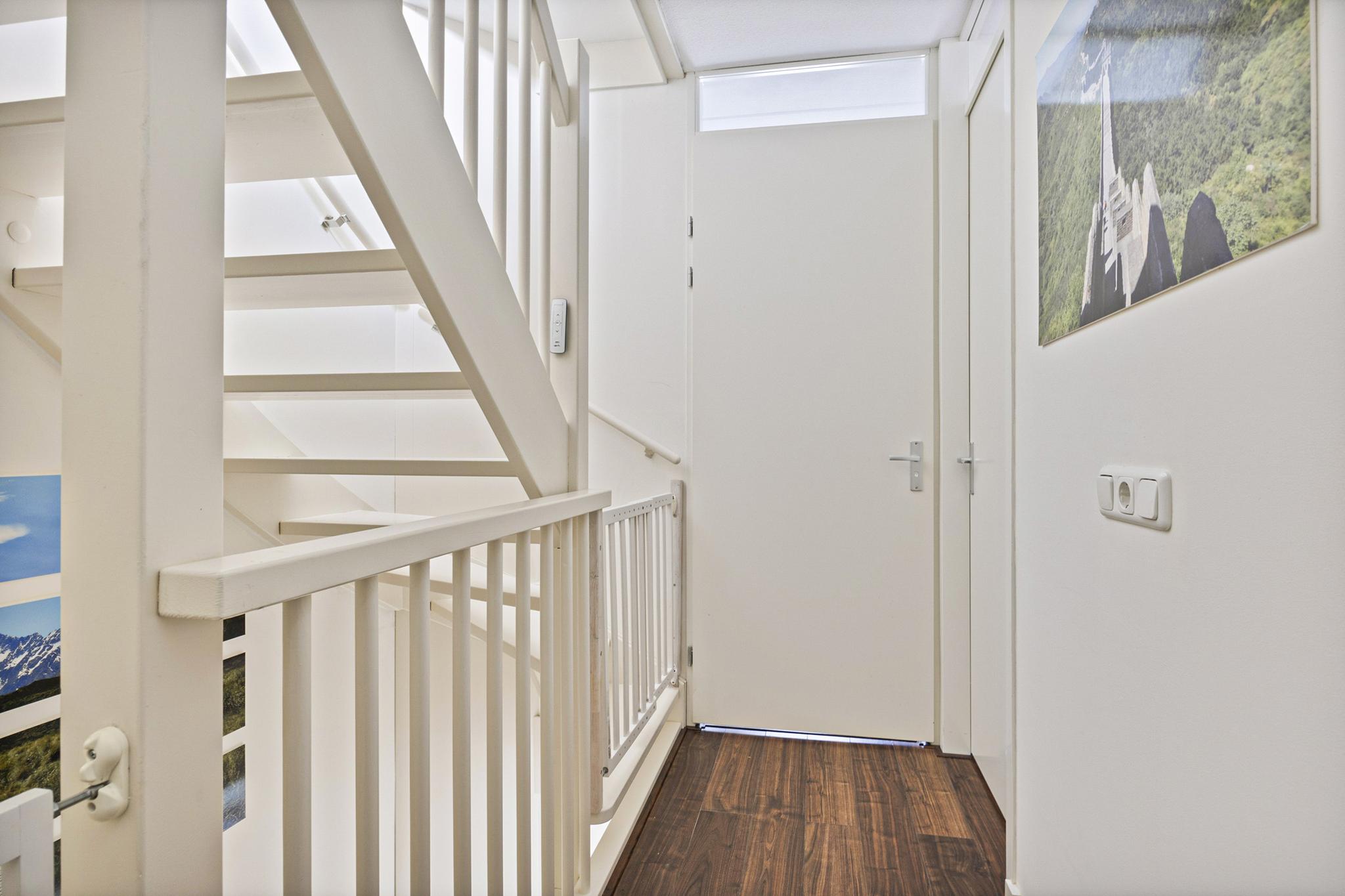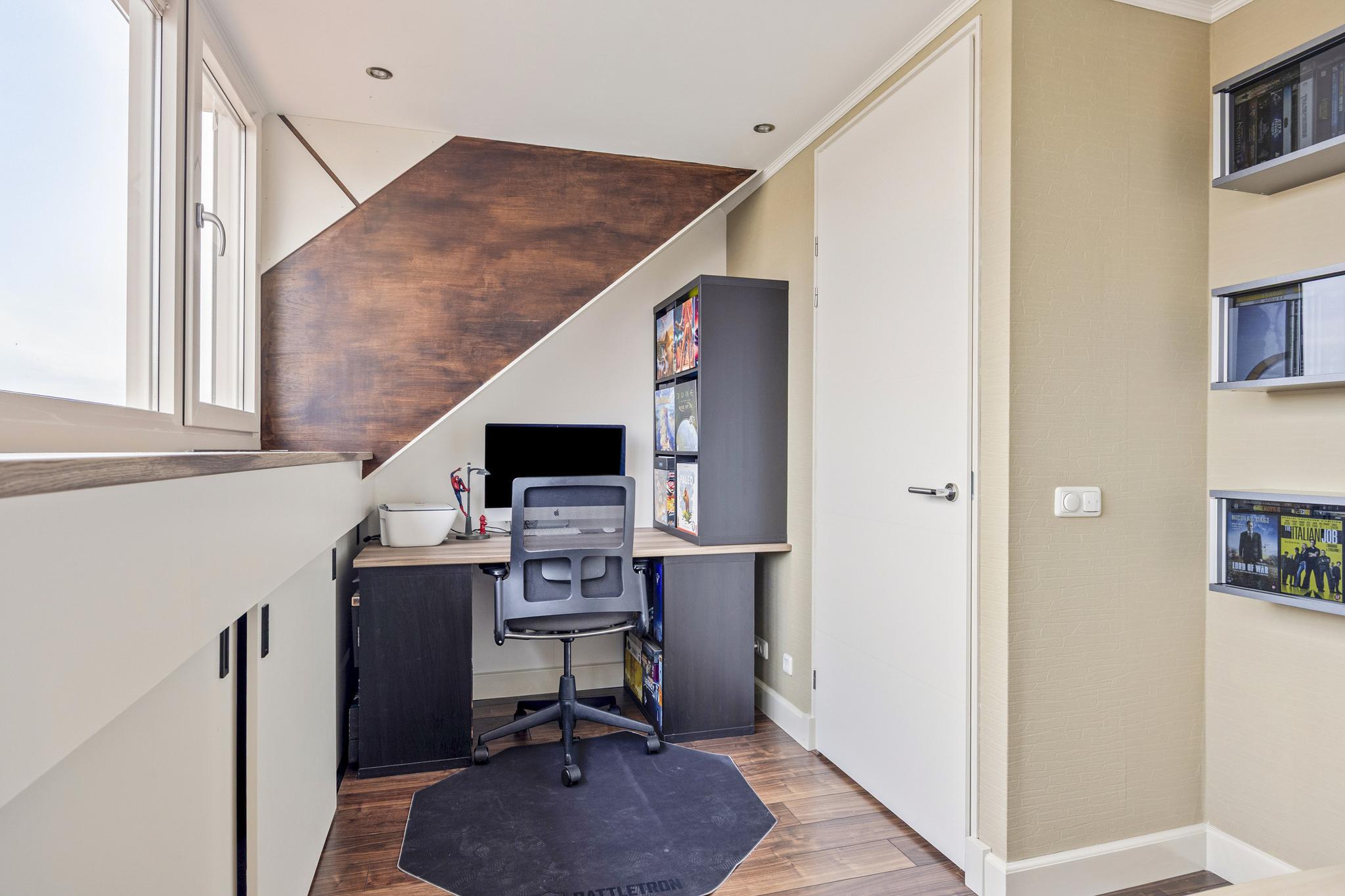 overloop en technische ruimte met vaste wastafel met warm en koud water, een inbouwkast met de c.v.-opstelling en de wasmachine- en droger aansluiting. Met het plaatsen van een dakkapel aan de voorzijde en een dakkapel aan de achterzijde zijn twee mooie slaapkamers gecreëerd. Achter de schotten is extra bergruimte. En middels een vlizotrap is de vliering/berging van ca. 80 cm hoog te bereiken.