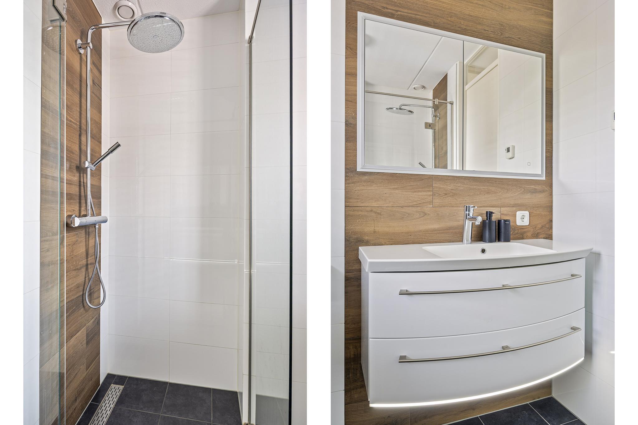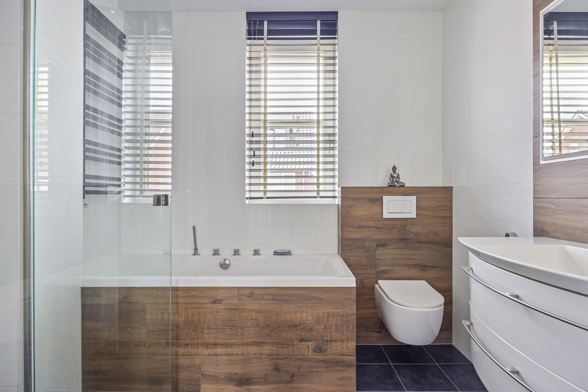 In de vergrote en mooi afgewerkte badkamer zijn in een wit met houtlook uitvoering een bad, douche, toilet en vaste wastafel met spiegelkast geplaatst.