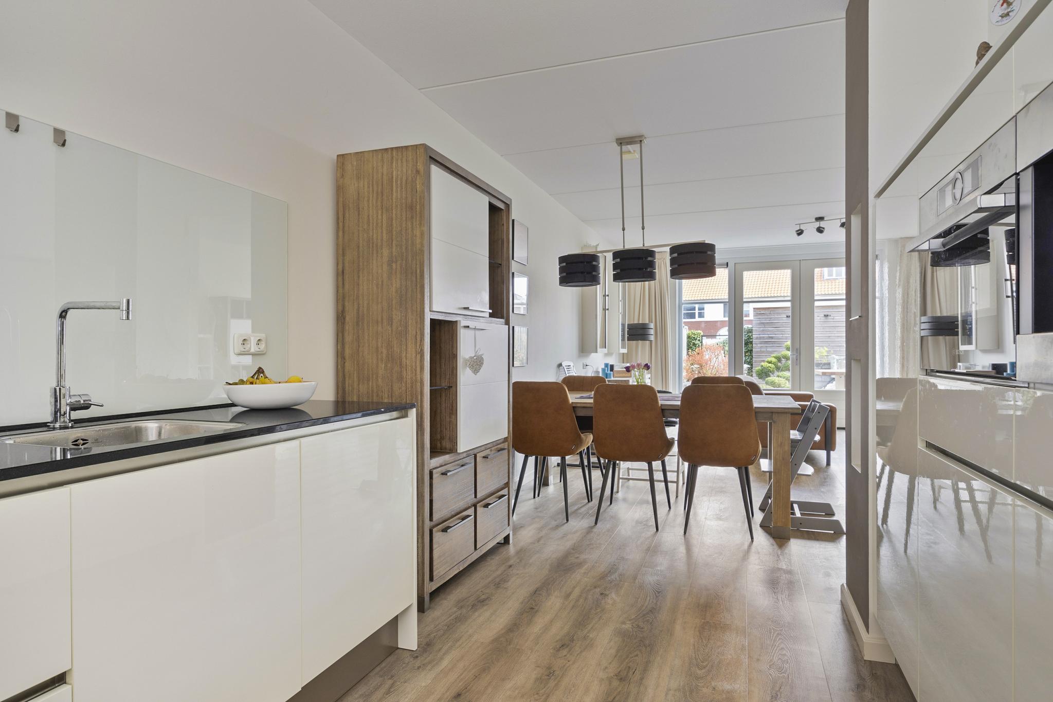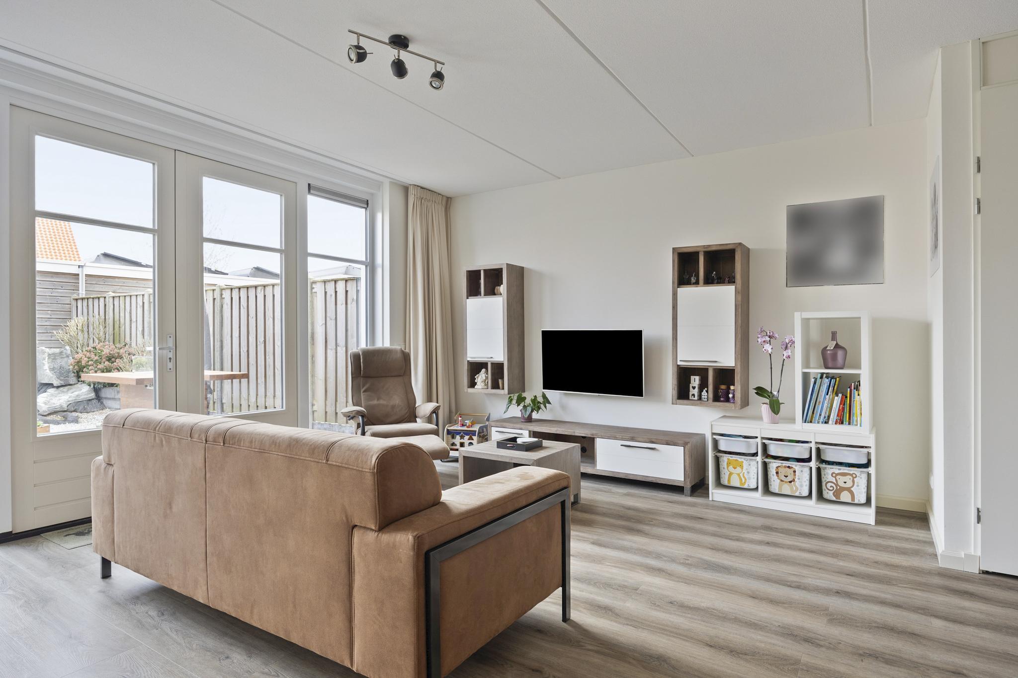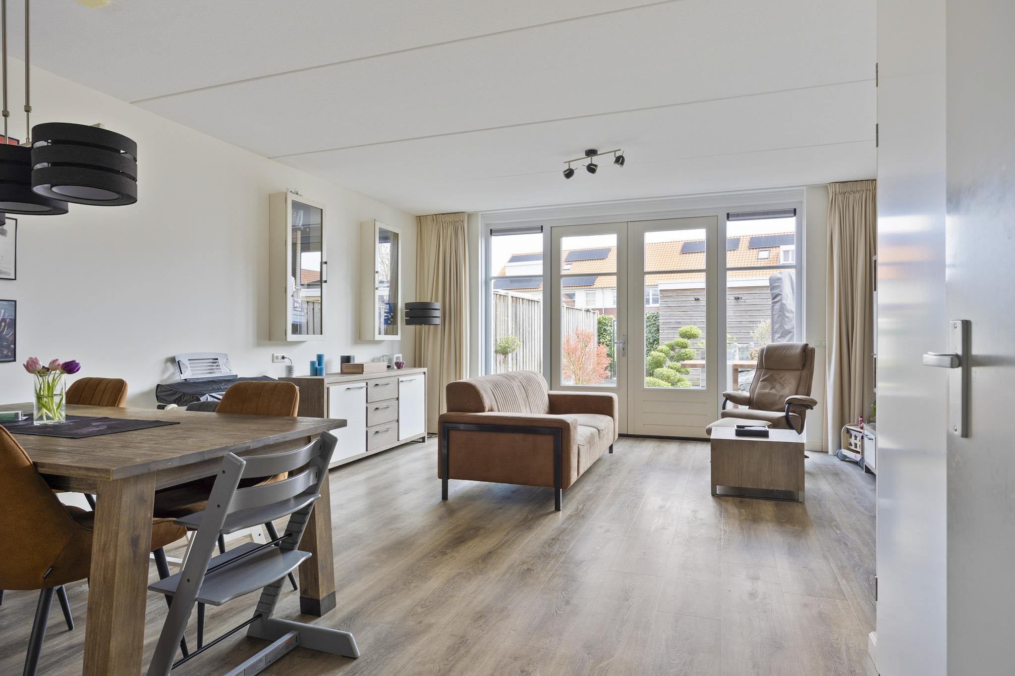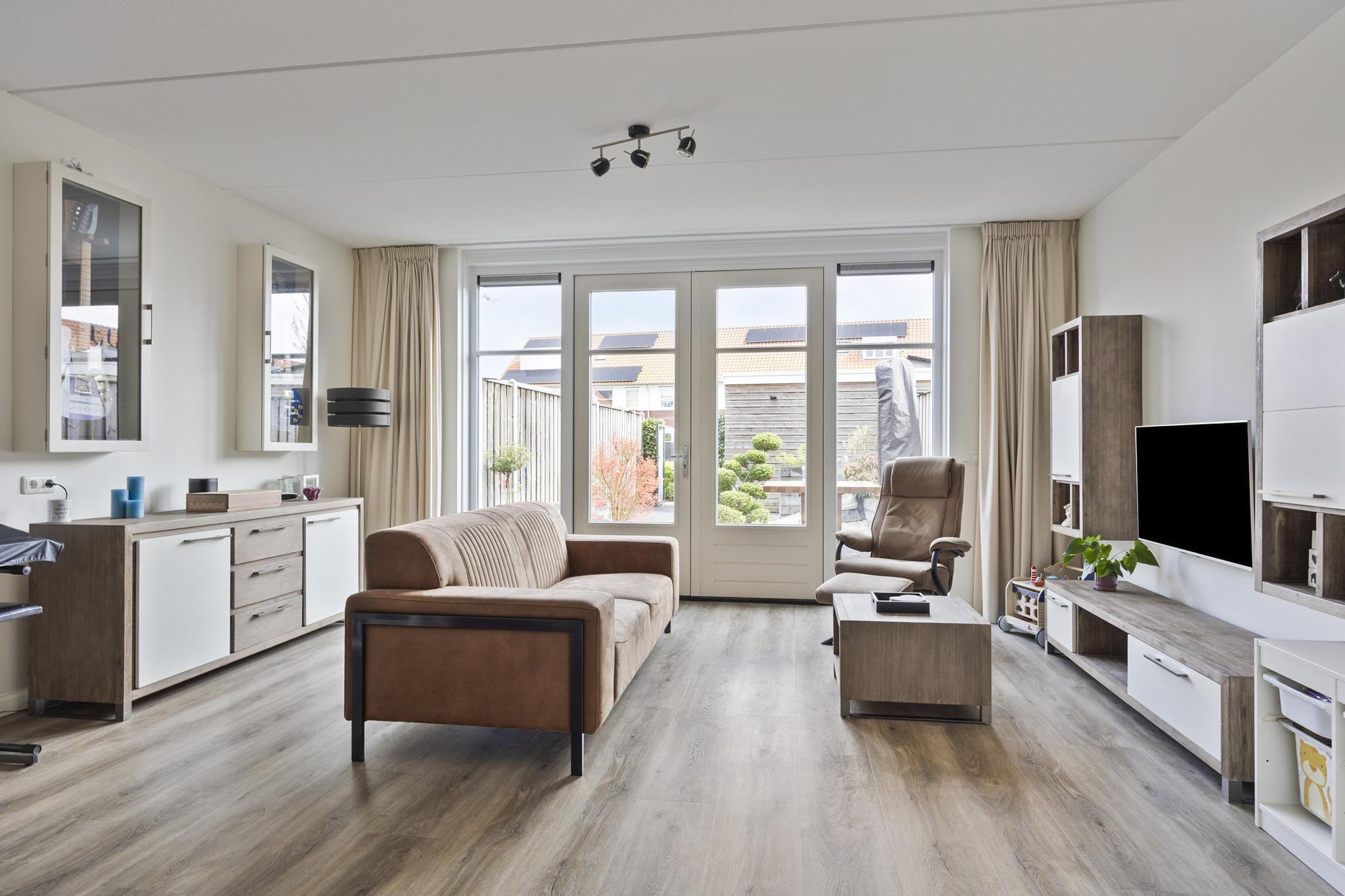 De lichte woonkamer is direct in de bouw met 1,20- meter uitgebouwd en biedt met de grote glazen pui met openslaande deuren zicht op de mooi aangelegde en zonnige achtertuin. De kamer heeft vloerverwarming en een fraaie licht grijze eikenlook pvcvloer.