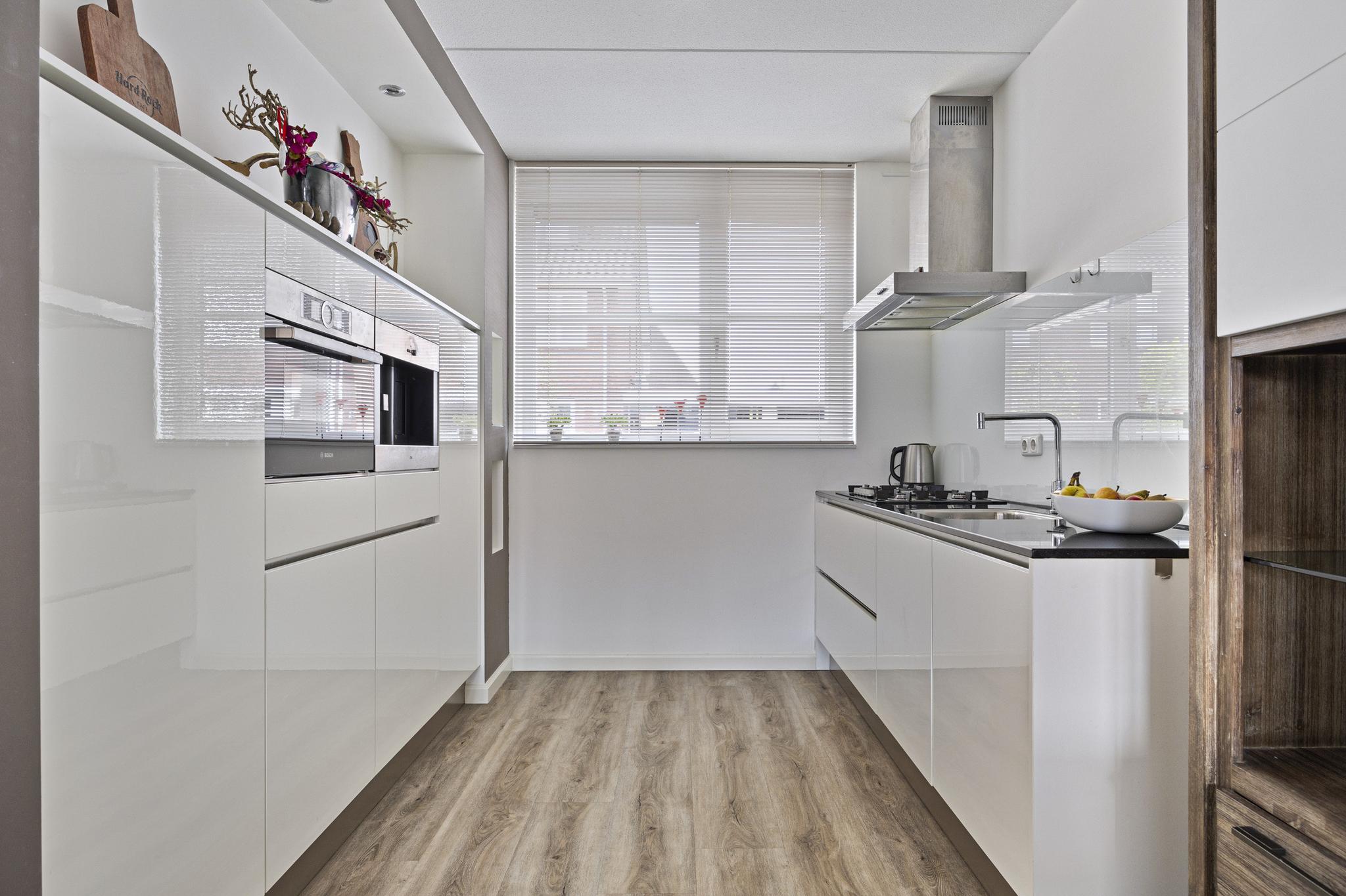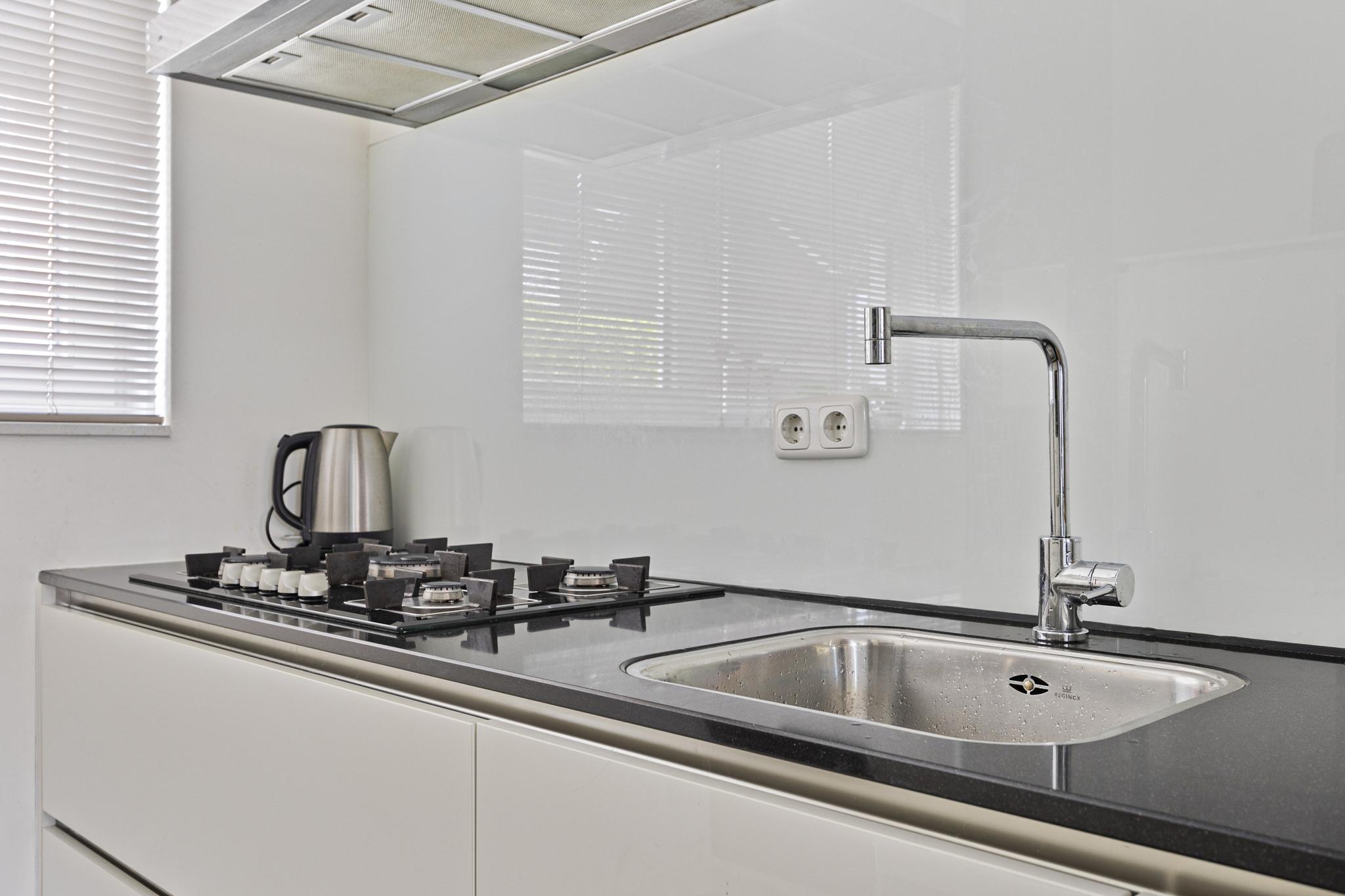 De luxe open keuken is voorzien van inbouwapparatuur en door het verzetten van de wand tussen de keuken en de gang is een hele mooie en praktische kastenwand ontstaan en biedt de keuken zelf meer bewegingsruimte.